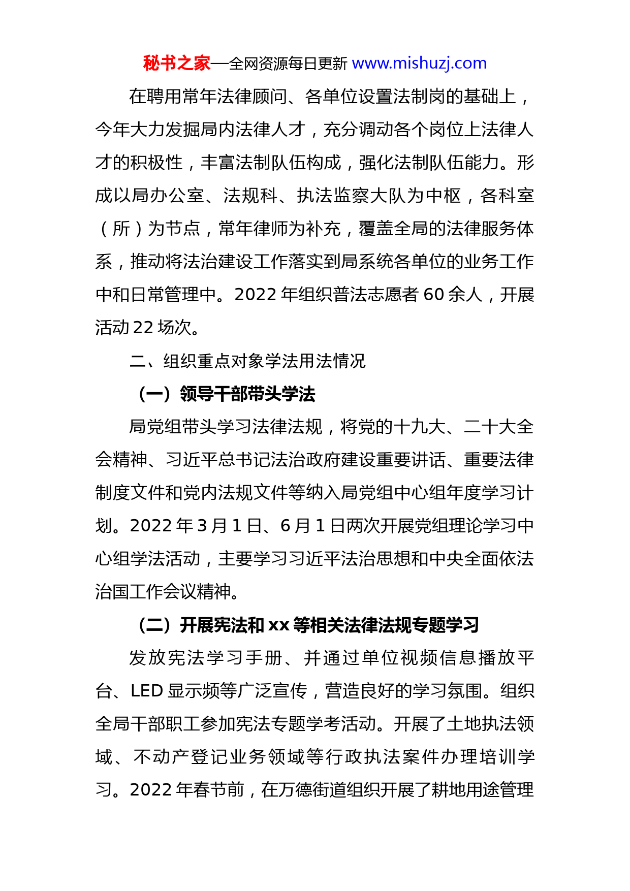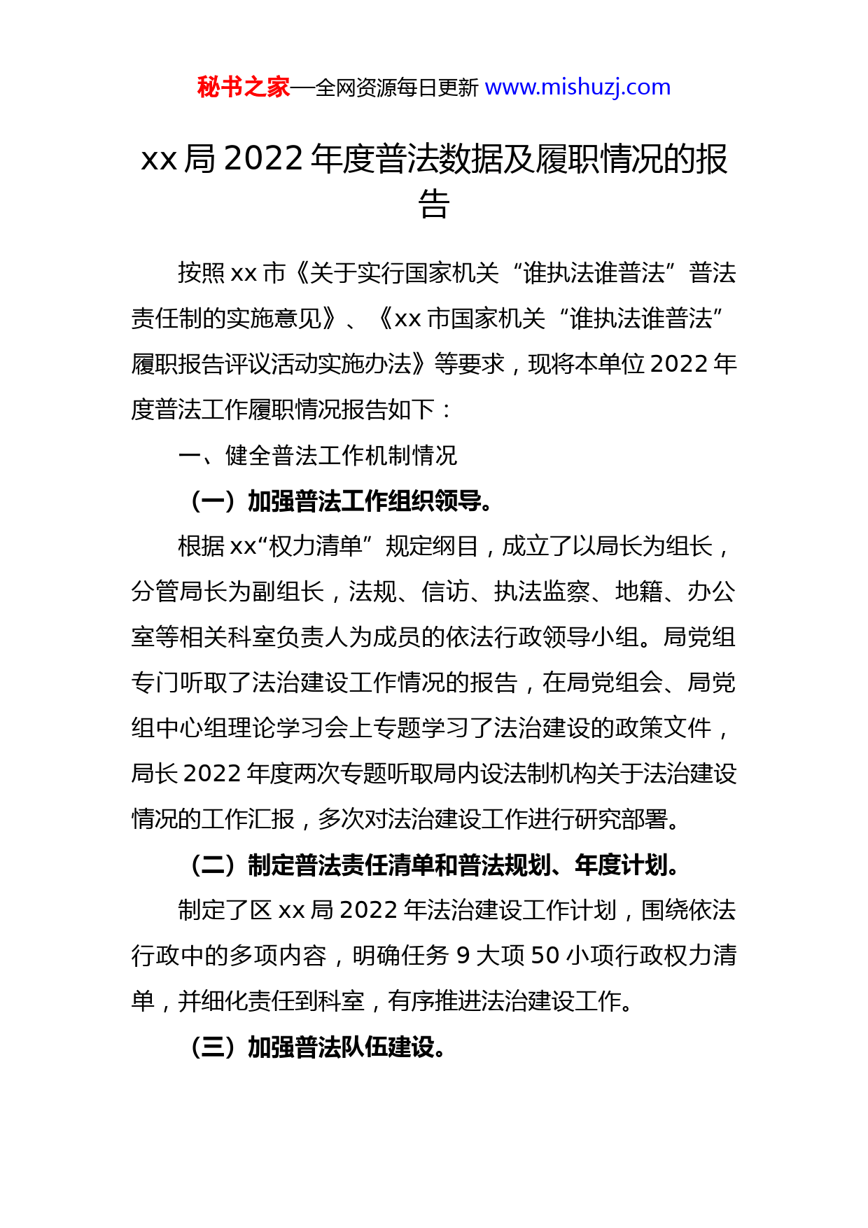 秘书之家—全网资源每日更新www.mishuzj.comxx局2022年度普法数据及履职情况的报告按照xx市《关于实行国家机关“谁执法谁普法”普法责任制的实施意见》、《xx市国家机关“谁执法谁普法”履职报告评议活动实施办法》等要求,现将本单位2022年度普法工作履职情况报告如下:一、健全普法工作机制情况(一)加强普法工作组织领导。根据xx“权力清单”规定纲目,成立了以局长为组长,分管局长为副组长,法规、信访、执法监察、地籍、办公室等相关科室负责人为成员的依法行政领导小组。局党组专门听取了法治建设工作情况的报告,在局党组会、局党组中心组理论学习会上专题学习了法治建设的政策文件,局长2022年度两次专题听取局内设法制机构关于法治建设情况的工作汇报,多次对法治建设工作进行研究部署。(二)制定普法责任清单和普法规划、年度计划。制定了区xx局2022年法治建设工作计划,围绕依法行政中的多项内容,明确任务9大项50小项行政权力清单,并细化责任到科室,有序推进法治建设工作。(三)加强普法队伍建设。秘书之家—全网资源每日更新www.mishuzj.com在聘用常年法律顾问、各单位设置法制岗的基础上,今年大力发掘局内法律人才,充分调动各个岗位上法律人才的积极性,丰富法制队伍构成,强化法制队伍能力。形成以局办公室、法规科、执法监察大队为中枢,各科室(所)为节点,常年律师为补充,覆盖全局的法律服务体系,推动将法治建设工作落实到局系统各单位的业务工作中和日常管理中。2022年组织普法志愿者60余人,开展活动22场次。二、组织重点对象学法用法情况(一)领导干部带头学法局党组带头学习法律法规,将党的十九大、二十大全会精神、习近平总书记法治政府建设重要讲话、重要法律制度文件和党内法规文件等纳入局党组中心组年度学习计划。2022年3月1日、6月1日两次开展党组理论学习中心组学法活动,主要学习习近平法治思想和中央全面依法治国工作会议精神。(二)开展宪法和xx等相关法律法规专题学习发放宪法学习手册、并通过单位视频信息播放平台、LED显示频等广泛宣传,营造良好的学习氛围。组织全局干部职工参加宪法专题学考活动。开展了土地执法领域、不动产登记业务领域等行政执法案件办理培训学习。2022年春节前,在万德街道组织开展了耕地用途管理秘书之家—全网资源每日更新www.mishuzj.com专项培训会。三、开展普法宣传活动情况我局不断加大普法教育宣传力度。一是组织了多种形式的主题宣传活动。结合6.25土地日,12.4法制宣传日等活动,将土地法、矿产资源法等法律法规,制作成展板、明白纸、画册等群众喜闻乐见、寓教于乐的形式,在xx乐园、xx街等群众较为聚集的场所,进行了展板巡展及明白纸的发放。开展活动2场次,受众人数1500余人。二是多方联动、形成合力。设置了咨询监督举报电话及信箱,形成了人人参与、人人监督的局面。同时,将法制教育与道德教育相结合,与社会主义核心价值观相结合,与环保督察、扫黑除恶等专项行动相结合,与党史学习教育相结合,一环扣一环,更加彰显了依法行政在经济社会发展、群众生产生活、以及在维护社会和谐稳定中的重要地位,尤其增强了社会各界特别是农民群众的法律知识和维权意识。积极组织开展“法治进乡村、进社区”宣传活动,给基层干部和群众讲授涉地、涉矿法律知识,同时对新颁布的土地管理法进行解读,现场开展活动20场次,受众人数3000余人。各街镇国土所利用农村大集等节点,发放各类宣传材料5000余份,将xx领域的法律法规送到群众身边,同时现场给群众解疑释惑,打消了群众的顾虑、取得秘书之家—全网资源每日更新www.mishuzj.com了群众对xx工作的理解和支持。四、开展以案释法工作情况落实好以案释法制度,开展多种形式的以案释法活动。2022年深入街镇、项目单位,开展以案释法讲座2场次,受众人数达到1200余人。主要是结合案例,讲解xx领域的法律法规,以及具体的处罚标准,让群众有切身感受,增强了教育的效果。