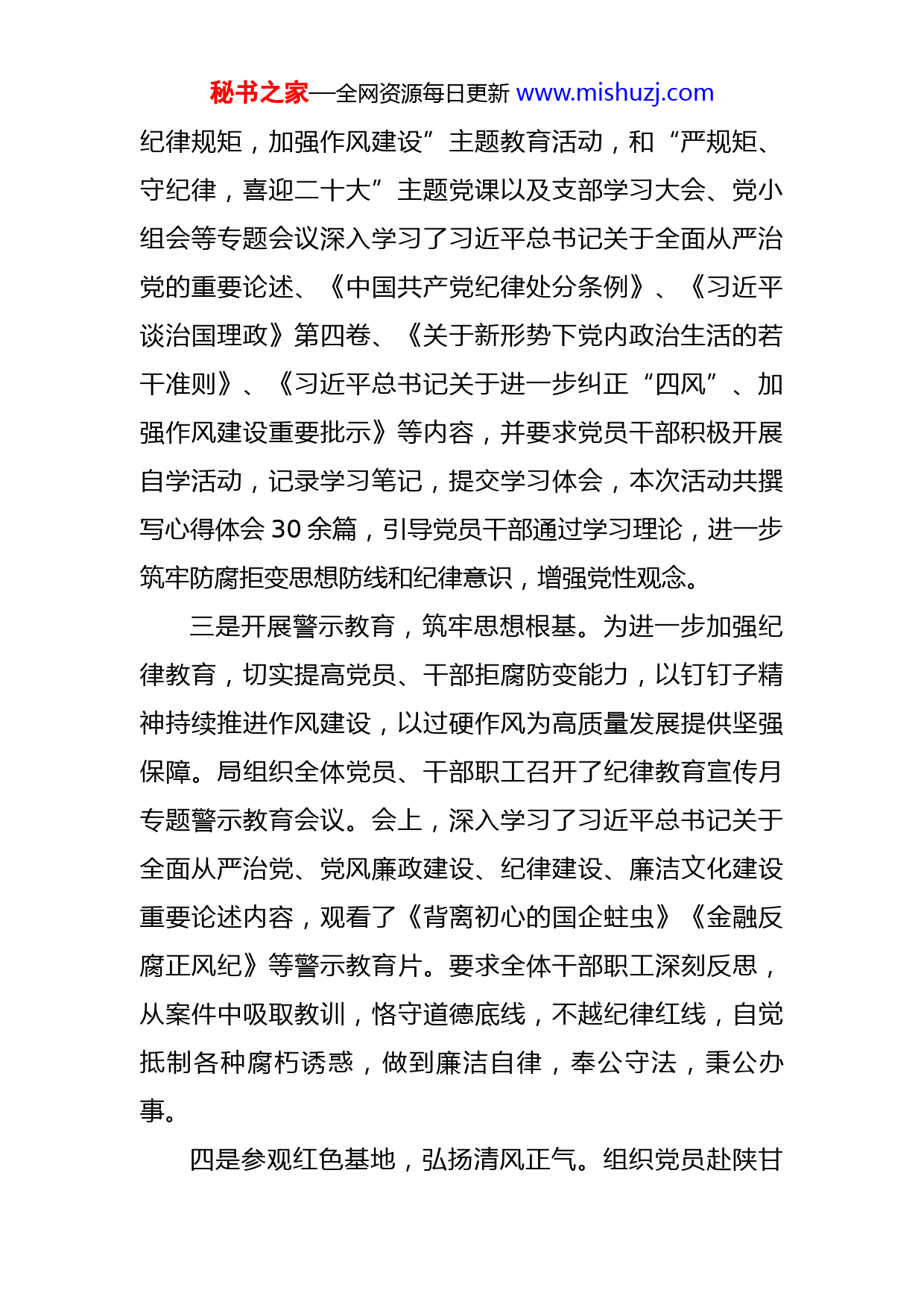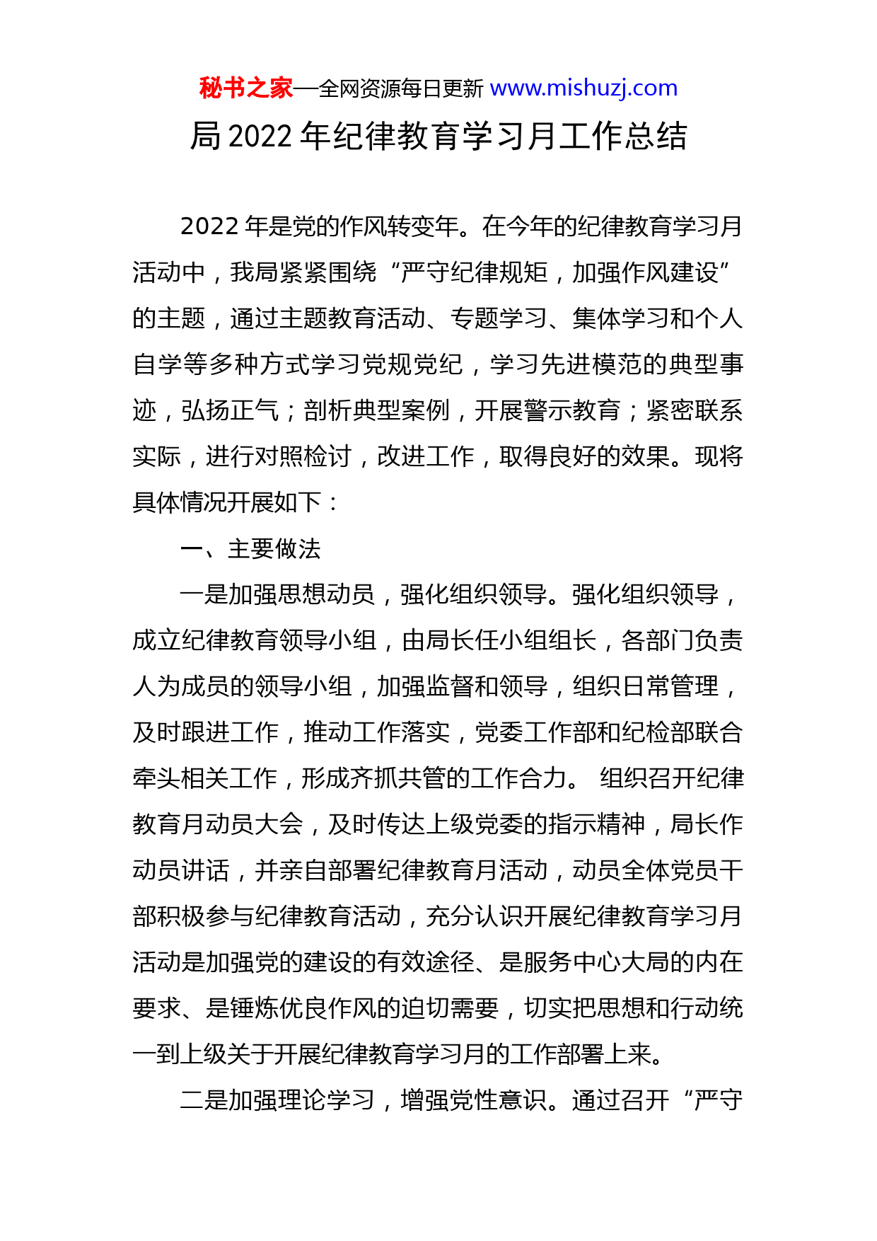 秘书之家—全网资源每日更新www.mishuzj.com局2022年纪律教育学习月工作总结2022年是党的作风转变年。在今年的纪律教育学习月活动中,我局紧紧围绕“严守纪律规矩,加强作风建设”的主题,通过主题教育活动、专题学习、集体学习和个人自学等多种方式学习党规党纪,学习先进模范的典型事迹,弘扬正气;剖析典型案例,开展警示教育;紧密联系实际,进行对照检讨,改进工作,取得良好的效果。现将具体情况开展如下:一、主要做法一是加强思想动员,强化组织领导。强化组织领导,成立纪律教育领导小组,由局长任小组组长,各部门负责人为成员的领导小组,加强监督和领导,组织日常管理,及时跟进工作,推动工作落实,党委工作部和纪检部联合牵头相关工作,形成齐抓共管的工作合力。组织召开纪律教育月动员大会,及时传达上级党委的指示精神,局长作动员讲话,并亲自部署纪律教育月活动,动员全体党员干部积极参与纪律教育活动,充分认识开展纪律教育学习月活动是加强党的建设的有效途径、是服务中心大局的内在要求、是锤炼优良作风的迫切需要,切实把思想和行动统一到上级关于开展纪律教育学习月的工作部署上来。二是加强理论学习,增强党性意识。通过召开“严守秘书之家—全网资源每日更新www.mishuzj.com纪律规矩,加强作风建设”主题教育活动,和“严规矩、守纪律,喜迎二十大”主题党课以及支部学习大会、党小组会等专题会议深入学习了习近平总书记关于全面从严治党的重要论述、《中国共产党纪律处分条例》、《习近平谈治国理政》第四卷、《关于新形势下党内政治生活的若干准则》、《习近平总书记关于进一步纠正“四风”、加强作风建设重要批示》等内容,并要求党员干部积极开展自学活动,记录学习笔记,提交学习体会,本次活动共撰写心得体会30余篇,引导党员干部通过学习理论,进一步筑牢防腐拒变思想防线和纪律意识,增强党性观念。三是开展警示教育,筑牢思想根基。为进一步加强纪律教育,切实提高党员、干部拒腐防变能力,以钉钉子精神持续推进作风建设,以过硬作风为高质量发展提供坚强保障。局组织全体党员、干部职工召开了纪律教育宣传月专题警示教育会议。会上,深入学习了习近平总书记关于全面从严治党、党风廉政建设、纪律建设、廉洁文化建设重要论述内容,观看了《背离初心的国企蛀虫》《金融反腐正风纪》等警示教育片。要求全体干部职工深刻反思,从案件中吸取教训,恪守道德底线,不越纪律红线,自觉抵制各种腐朽诱惑,做到廉洁自律,奉公守法,秉公办事。四是参观红色基地,弘扬清风正气。组织党员赴陕甘秘书之家—全网资源每日更新www.mishuzj.com边照金革命根据地接受革命传统教育,缅怀革命先烈丰功伟绩,重温红色记忆。通过观看图片、革命历史资料和革命先烈留下的实物等,详细了解照金革命根据地创立、发展、壮大的全过程,深刻体会到了革命先烈不屈不挠、英勇奋斗的革命精神。五是强化监督检查,增强风险防控意识。局纪检部门紧盯重点岗位、重要时段从思想、作风、制度和管理等方面紧扣廉政风险易发多发领域、部位和环节,认真开展梳理排查,找准廉政“风险点”。目前共排查出廉政风险点37个。根据排查出来的廉政风险点,要求相关部门有针对性地分析研判其表现形式和风险等级,制定相应精准防控措施53条,织密织牢防控网,做到风险定到位、制度建到岗、责任落到人。二、取得的成效一是党性观念明显增强,为民服务意识提高。在纪律教育学习月活动中,全体党员干部对树立正确的世界观、人生观、价值观有了更为深刻的认识,始终坚持党的政治路线、思想路线和群众路线,在思想观念、工作作风、服务理念等方面都有了明显的转变,全心全意为人民服务的宗旨意识进一步增强,在工作中以实现好、发展好、维护好人民群众的根本利益为出发点,积极投身于为民办实事做好事的热潮中。二是干部作风明显好转,各项工作取得秘书之家—全网资源每日更新www.mishuzj.com实效。通过开展纪律教育学习月活动,全体党员干部的作风明显好转,转变了工作态度,改进了工作方法,积极深入第一线,为群众排忧解难。紧密结合当前工作实际,努力学习,刻苦钻研,提高工作水平,为完成各项指标任务打下坚实基础。三是惩防体系初步完善,反腐倡廉机制落实。在纪律教育学习月活动中,我们不断加强制度建设,以财务管理体系和领导干部监督管理体系为特色的惩防体系已经初步完善,推动了反腐倡廉长效机制的落实,较好地营造了风清气正、干净干事、廉洁高效的氛围。针对案件易发高发的环节进一步强化制度建设。在纪律教育活动中,通过领导班子专题民主生活会自查剖析,针对各自的管理漏洞和薄弱环节,按照构筑惩防体系的要求,建立和完善一系列廉政监督管理制度,从制度建设和制度落实方面卡住腐败。三、存在的问题一是没有把开展纪律教育学习月活动与打好“干部思想作风转变”战役结合起来。各部门主体责任意识不强,总觉得纪律教育是领导干部的事,与普通党员无关,思想意识不牢,学习主动性不够,思想作风转变不明显。二是没有把开展纪律教育学习月活动与贯彻落实中央工作会议精神结合起来。在深入学习贯彻习近平总书记在中央工作会议上的重要讲话精神上还有差距,没有结合纪律学