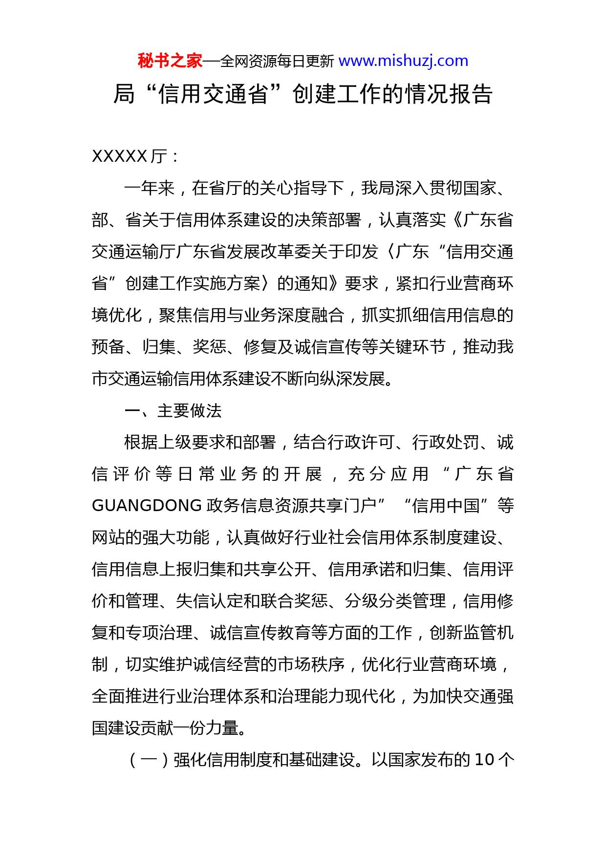 秘书之家—全网资源每日更新www.mishuzj.com局“信用交通省”创建工作的情况报告XXXXX厅:一年来,在省厅的关心指导下,我局深入贯彻国家、部、省关于信用体系建设的决策部署,认真落实《广东省交通运输厅广东省发展改革委关于印发〈广东“信用交通省”创建工作实施方案〉的通知》要求,紧扣行业营商环境优化,聚焦信用与业务深度融合,抓实抓细信用信息的预备、归集、奖惩、修复及诚信宣传等关键环节,推动我市交通运输信用体系建设不断向纵深发展。一、主要做法根据上级要求和部署,结合行政许可、行政处罚、诚信评价等日常业务的开展,充分应用“广东省GUANGDONG政务信息资源共享门户”“信用中国”等网站的强大功能,认真做好行业社会信用体系制度建设、信用信息上报归集和共享公开、信用承诺和归集、信用评价和管理、失信认定和联合奖惩、分级分类管理,信用修复和专项治理、诚信宣传教育等方面的工作,创新监管机制,切实维护诚信经营的市场秩序,优化行业营商环境,全面推进行业治理体系和治理能力现代化,为加快交通强国建设贡献一份力量。(一)强化信用制度和基础建设。以国家发布的10个秘书之家—全网资源每日更新www.mishuzj.com社会信用体系建设顶层设计文件为基础,将各级政府和有关主管部门的社会信用体系建设文件分为10大类,集中汇编成《XXXXX法规体系暨业务工作手册》,方便学习宣传和领会理解,在细化权限、实施主体等方面一目了然,确保贯彻落实及时、查漏补缺到位、应用规范。(二)构建“双公示”岗位责任制。根据行政许可和行政处罚业务的工作特点,统一实施人员账户和责任清单管理,明确行政执法决定承办人员收集“双公示”信息的岗位责任,要求相关承办人员在作出行政执法决定之日起7个工作日内上传至“广东省GUANGDONG政务信息资源共享门户”网站。同时,确定每周四为批量上传时间,在批量上传前按统一标准进行复核复查,确保“双公示”信息准确、公示及时。据统计,自2021年XX月XX日起至2022年XX月XX日止,我局上传“双公示”信息共XXX宗。(三)拓展信用承诺制度的应用。结合我局《转发关于开展信用承诺活动的通知》(XX函〔XX〕XX号)精神和成功实践经验,持续推进《XXXXX领域信用承诺制度实施方案》(XX办〔XX〕XX号)的实施和完善,认真落实《广东省人民政府办公厅关于印发广东省全面推行证明事项告知承诺制工作实施方案的通知》要求,主动与省交通运输厅对应处室联系,按省厅和市政府公布的证明事项清秘书之家—全网资源每日更新www.mishuzj.com单,及时更新调整线上、线下办事指南、文书格式。同时,进一步明确了承诺对象、程序及方式,规范了审批替代型、容缺受理型、行业自律型、主动公示型、信用修复型等类型《信用承诺书》格式。要求各业务科室和岗位及时公示信用承诺信息、切实强化履约践诺情况的监督检查,特别是对未开通“广东省GUANGDONG政务信息资源共享门户”网站账号的个别县区,提供了市局对应科室转公示不具有地方特征的信用承诺信息的渠道。据统计,自2021年XX月XX日起至2022年XX月XX日止,共收集和公示容缺受理型信用承诺书XX份、证明事项告知承诺型信用承诺书XX份、行业自律型信用承诺书XX份、主动公示型信用承诺书XX份、信用修复型信用承诺书XX份,暂未发现违诺行为。(四)持续开展行业诚信评价。通过现场诚信评价打分、违法违规信息线上共享评分,及时在“广东省道路运输诚信评价信息管理系统”上登记道路运输相关企业和从业人员的奖惩和处罚情况,并由该系统按季自动换算道路运输相关企业和从业人员的诚信评价计分分值,为年终市初评、省终评提供依据,并针对评价出来的结果落实相应的奖惩措施。同时,还配合省厅做好交通建设工程设计、施工、监理、试验检测机构诚信评价相关事项的审核工作,及时在“港航管理系统”上传水运企业加减分信用信秘书之家—全网资源每日更新www.mishuzj.com息。据统计,2022年上半年,全市交通运输行业累计对XX家道路客运企业现场诚信评价达标项目XX项、对XX家驾驶员培训机构现场诚信评价达标项目XX项、对XX家机动车维修企业违法违规扣分XX分,对XX名从业人员违法违规扣分XX分;完成2021年年终市初评驾驶员培训机构XX家、机动车维修企业XX家,出租汽车企业XX家,道路运输从业人员XX人。(五)落实联合奖惩工作。充分应用《XXXXX局联合奖惩应用清单》,营造公平诚信的市场环境。一是在评先评优活动中的诚信激励。2021年底成功应用诚信评价结果评选了客运、危运、公交等交通运输领域的最美司机。二是在政府投资工程建设项目招标活动中的失信惩戒。对报备审查的交通建设工程招标文件引入信用报告审查机制,依法限制相关失信主体参与政府投资工程建设项目的投标活动。三是在政府采购活动中的失信惩戒。对本局实施的政府采购公开招标文件和磋商性文件,均明确要求供应商未被“信用中国”网站列入“失信被执行人、重大税收违法案件当事人名单、政府采购严重违法失信名单”,未被“国家企业信用信息公示系统”网站列入“严重违法失信企业名单”,在“中国政府采购网”中没有处在因“政府采购严重违法失信行为信息记录”而禁止参加政府采购活动的期间。四是在行政处罚工作的失信惩戒。作出行政处秘书之