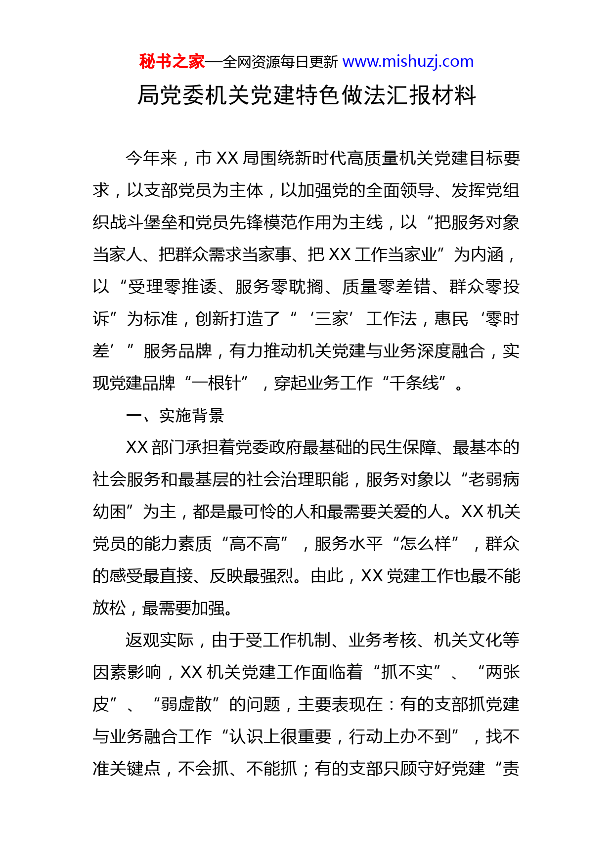 秘书之家—全网资源每日更新www.mishuzj.com局党委机关党建特色做法汇报材料今年来,市XX局围绕新时代高质量机关党建目标要求,以支部党员为主体,以加强党的全面领导、发挥党组织战斗堡垒和党员先锋模范作用为主线,以“把服务对象当家人、把群众需求当家事、把XX工作当家业”为内涵,以“受理零推诿、服务零耽搁、质量零差错、群众零投诉”为标准,创新打造了“‘三家’工作法,惠民‘零时差’”服务品牌,有力推动机关党建与业务深度融合,实现党建品牌“一根针”,穿起业务工作“千条线”。一、实施背景XX部门承担着党委政府最基础的民生保障、最基本的社会服务和最基层的社会治理职能,服务对象以“老弱病幼困”为主,都是最可怜的人和最需要关爱的人。XX机关党员的能力素质“高不高”,服务水平“怎么样”,群众的感受最直接、反映最强烈。由此,XX党建工作也最不能放松,最需要加强。返观实际,由于受工作机制、业务考核、机关文化等因素影响,XX机关党建工作面临着“抓不实”、“两张皮”、“弱虚散”的问题,主要表现在:有的支部抓党建与业务融合工作“认识上很重要,行动上办不到”,找不准关键点,不会抓、不能抓;有的支部只顾守好党建“责秘书之家—全网资源每日更新www.mishuzj.com任田”,对业务工作不想抓、不愿抓;有的支部开展活动“闭门敲锣打鼓,开门偃旗息鼓”,不跟踪、没下文;有的支部对服务能力不佳的党员不敢管、不善管,认为那是业务处室的责任;有的少数党员认为“党建归党建,业务归业务”,存在“一条腿走路”的现象,等等。究其原因,最根本的是责任不清、路径不明、标准不严、问效不力,缺乏有效的融合载体和工作机制。基于解决上述问题,推动机关党建与业务“两融合、两深入”,更好服务中心大局,通过支部落实“‘三家’工作法”党建品牌创建,实现融合有抓手、有标准、有认定、有考评,有效落实了习近平总书记强调的“抓好党建就是最大的政绩”。二、主要做法局党委牵头领导实施,班子成员按照“抓业务必抓党建、管行业必管党建”一岗双责予以推进,全局发挥党支部作为党组织的主力军和党员作为党支部的主力军“两个主力军”作用,以党建品牌创建破解五大问题,推动机关党建“一根针”穿起业务工作“千条线”。一是抓实“三套方案”,破解融合“到底怎么干”的问题。通过征集党员意见、支部学习讨论、局党委研究决策,明确了“三家”和“零时差”的内涵,每一点都对应党员、对应本职业务。聚焦融合路径,量身打造了《品牌秘书之家—全网资源每日更新www.mishuzj.com创建活动实施方案》《品牌服务监督体系工作方案》《品牌服务制度和管理方案》“三套方案”,分理念融合(解放思想干)、规划融合(同研究同部署)、目标融合(问题导向抓)、项目融合(多办实事)“四步走”,明确了实施、服务、监管、评定“四项规则”,实行“班子包支部、支部+处室”创建法,并印制了XX份以阐释和方案为主要内容的彩色折页,全系统人手一册,统一思想、统一路径,确保党委有抓手、支部好操作、党员能践行。二是搭建“五大平台”,破解融合“应该干什么”的问题。机关党建与中心工作的深度融合,最根本的是要落到为民办实事上。“三家”工作法在变服务对象为“家人”,拉近干群距离、平等干群地位的同时,为机关党员搭建起“社会救助”平台、“养老服务”平台、“社区治理”平台、“社会组织”平台、“公共服务”平台X大民生平台。严格明确了“一支部一实事”,由于每个支部至少涉及X个平台,使得支部中的党员人人与平台挂钩、与民生实事关联,推动“党员学业务、支部抓业务”和“业务处室抓党建、业务人员抓党建”双向深入互动,同心同向促融合。三是明确“六项制度”,破解融合“交给谁来干”的问题。为确保融合的实操性,局党委对惠民“零时差”提出了时、度、效的要求,并以党委名义出台文件,建立起秘书之家—全网资源每日更新www.mishuzj.com首问负责制、全程协办制、一次告知制、限时办结制、效能投诉制、追究问责制X项制度,每一项制度都细化了流程、标准和约束措施,明确规定了“党委班子带头、党支部跟进、党员全员参与”的制度落实模式。在效能投诉制度中,向社会公布了驻局纪检监察组的电话,接受社会投诉,形成了强有力的提党性、优服务推进机制,X个党支部全部签定了《服务创建承诺书》,打出了具有实操性的促进机关党建与业务融合的“组合拳”,打破了党员“只管自留地”的鸵鸟心态,提升了党建意识和服务能力。四是开展“三大行动”,破解融合“能不能干好”的问题。局党委组织在全局党员中实行:“定标赶超行动”,分条线树立追赶目标,建立了《追赶计划表》,列出先进做法、主要差距和追赶举措,激发了党员的主观能动性,形成了“定期有党课、每月一讲堂、周周有活动、天天学典型”的工作路径。“党建先锋行动”,编发了《党支部工作规范》,开展了“双强”标兵和“红旗支部”评选,树立了规范,树起了典型,并在机关支部试行书记轮值和跨支部交流,许多党员在相互对比中,自发提高党性修养和业务能力,收效显著。“正风肃纪行动”,重点整治了“表态多、落实少,推脱多、担当少,检查多、指导少,应付多、钻研少”四种情形,为“三家”工