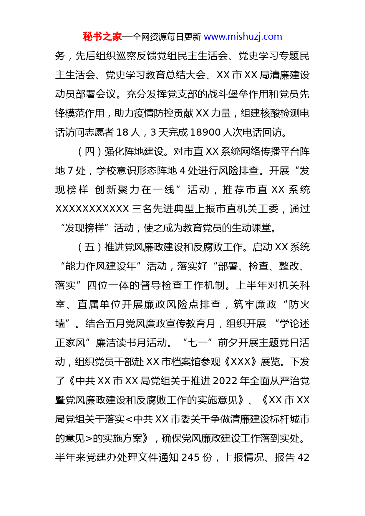秘书之家—全网资源每日更新www.mishuzj.com局党建办2022年半年工作总结上半年以来,党建办在局党组的领导下,坚持以习近平新时代中国特色社会主义思想为指导,认真贯彻落实新时代党的建设总要求和党的组织路线,以党的政治建设为统领,以党支部标准化规范化建设为抓手,以深化党风廉政建设为保证,按照年度党建工作计划,认真抓好各项工作落实。现就上半年党建工作汇报如下。一、党建主要工作(一)深化理论学习。制定印发《中共XX市XX局党组理论学习中心组2022年度学习安排》,严格落实“第一议题”制度,上半年党组中心组集中学习7次、每周夜校学习20次;掀起学习宣传省第XX次党代会代表、市第XX次党代会精神热潮,做到学习研讨宣传全覆盖。(二)健全工作制度。拟制《XX市XX局党建制度汇编》,制定了《市直XX系统2022年度党建工作任务落实具体时间节点表》,规范党支部、党小组及党课等各项活动的开展。建立巡察整改情况进度台账,认真起草巡查整改方案、整改落实情况报告、关于履行第一责任人责任抓好市委巡察组反馈意见整改落实情况报告、巡察整改情况通报等,做实做细巡察整改“后半篇文章”。(三)加强组织建设。结合工作实际和阶段性工作任秘书之家—全网资源每日更新www.mishuzj.com务,先后组织巡察反馈党组民主生活会、党史学习专题民主生活会、党史学习教育总结大会、XX市XX局清廉建设动员部署会议。充分发挥党支部的战斗堡垒作用和党员先锋模范作用,助力疫情防控贡献XX力量,组建核酸检测电话访问志愿者18人,3天完成18900人次电话回访。(四)强化阵地建设。对市直XX系统网络传播平台阵地7处,学校意识形态阵地4处进行风险排查。开展“发现榜样创新聚力在一线”活动,推荐市直XX系统XXXXXXXXXXX三名先进典型上报市直机关工委,通过“发现榜样”活动,使之成为教育党员的生动课堂。(五)推进党风廉政建设和反腐败工作。启动XX系统“能力作风建设年”活动,落实好“部署、检查、整改、落实”四位一体的督导检查工作机制。上半年对机关科室、直属单位开展廉政风险点排查,筑牢廉政“防火墙”。结合五月党风廉政宣传教育月,组织开展“学论述正家风”廉洁读书月活动。“七一”前夕开展主题党日活动,组织党员干部赴XX市档案馆参观《XXX》展览。下发了《中共XX市XX局党组关于推进2022年全面从严治党暨党风廉政建设和反腐败工作的实施意见》、《XX市XX局党组关于落实<中共XX市委关于争做清廉建设标杆城市的意见>的实施方案》,确保党风廉政建设工作落到实处。半年来党建办处理文件通知245份,上报情况、报告42秘书之家—全网资源每日更新www.mishuzj.com份,起草讲话8篇,拟制通知19份,拟制方案11份。二、存在问题(一)机关党建标准化建设有待进一步加强。组织生活不够规范。机关党支部下属的3个党小组,由于各科室的业务工作进度和节点不统一,很难经常性开展组织生活。党建计划落实力度不够。年初制定了党建工作计划,有时工作流于形式。党务人员综合素质不全。党建工作疲于应付,党务人员政治素质、理解能力还不能满足XX强市发展要求。(二)对基层党建工作指导水平有待提高。对当前工作业务繁重和领导要求越来越高的双重压力,党建工作的时间和精力更多在机关各种文件落实上,指导各支部开展党建工作缺乏经常性和持续性,没有形成抓细、抓常、抓强的局面。(三)监督管理力度有待加强。工作中存在一定程度的“老好人”思想,导致部分党员党内生活不经常、不认真、不严肃,部分党内组织生活走过场,“三会一课”缺乏实效等情况。在廉政谈话方面,表现在重关键节点,不重全过程;重工作层面,不重作风层面。在日常管理方面,对分管领域干部工作上提要求多,思想上交流少,对存在的苗头性问题也不愿说破和及时处置,习惯于交给主要领导处置,存在监管不到位的现象。秘书之家—全网资源每日更新www.mishuzj.com三、下步工作打算(一)强化规范提高标准。在XX系统党员干部中大力倡树“严真细实快”工作作风,掀起大培训、大练兵、大竞赛热潮,充分运用好“夜校学习”平台,同时强化自身八小时以外自身学习,向“精党务、懂业务”的党务干部标准努力。(二)聚焦主责打造特色。深入推进支部标准化建设,不断提高基层党建工作水平。以“组织设置到位、重点任务落实、工作机制顺畅、组织生活严肃、支委建设有力”为标准,进一步提高了XX系统党组织的凝聚力、向心力,打造了一支政治立场坚定、敢于拼搏、敢于战斗的党员干部队伍,为XX强市发展提供坚强政治保障。(三)同频共振搞好融合。进一步巩固党组织在疫情防控期间展现出的战斗力、凝聚力、向心力,发挥党员先锋模范作用,在第XXX届省运会备战参赛中,发挥临时党支部作用,主动问需,周到服务,给予运动员无私关爱和帮助,激发党员责任感、荣誉感和使命感,充分展现XX系统党员的先锋模范作用。(4)反腐倡廉守住底线。以“廉洁XX”建设为抓手,统筹推进“XX工程”。锤炼政治担当,卡实清廉建设“三项责任”,聚焦运动员食堂、枪械库、等级运动员裁判员认定等重点岗位和关键环节,构建全覆盖的责任体系;筑牢惩秘书之家—全网资源每日更新www.mishuzj.com防体系,持续深化“三不”一体推进,规范XX器材采购、工程建设、赛事活动承办招投标等工作流