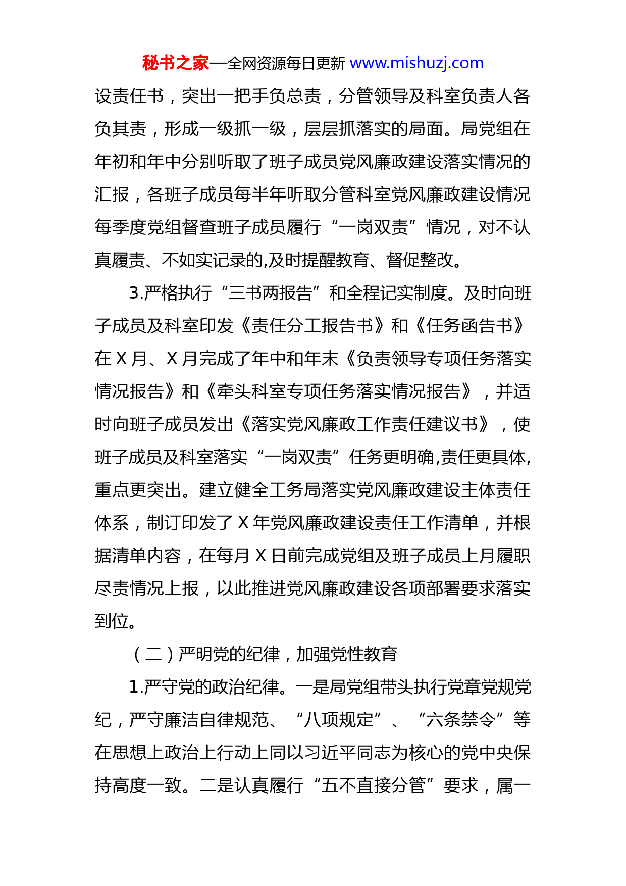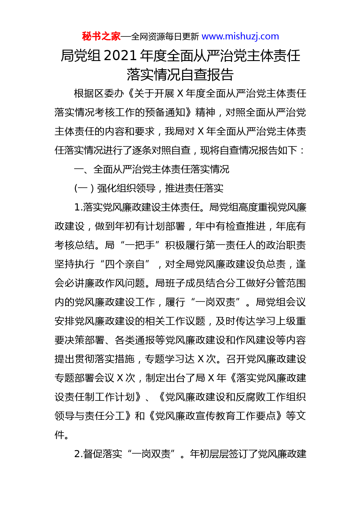 秘书之家—全网资源每日更新www.mishuzj.com局党组2021年度全面从严治党主体责任落实情况自查报告根据区委办《关于开展X年度全面从严治党主体责任落实情况考核工作的预备通知》精神,对照全面从严治党主体责任的内容和要求,我局对X年全面从严治党主体责任落实情况进行了逐条对照自查,现将自查情况报告如下:一、全面从严治党主体责任落实情况(一)强化组织领导,推进责任落实1.落实党风廉政建设主体责任。局党组高度重视党风廉政建设,做到年初有计划部署,年中有检查推进,年底有考核总结。局“一把手”积极履行第一责任人的政治职责坚持执行“四个亲自”,对全局党风廉政建设负总责,逢会必讲廉政作风问题。局班子成员结合分工做好分管范围内的党风廉政建设工作,履行“一岗双责”。局党组会议安排党风廉政建设的相关工作议题,及时传达学习上级重要决策部署、各类通报等党风廉政建设和作风建设等内容提出贯彻落实措施,专题学习达X次。召开党风廉政建设专题部署会议X次,制定出台了局X年《落实党风廉政建设责任制工作计划》、《党风廉政建设和反腐败工作组织领导与责任分工》和《党风廉政宣传教育工作要点》等文件。2.督促落实“一岗双责”。年初层层签订了党风廉政建秘书之家—全网资源每日更新www.mishuzj.com设责任书,突出一把手负总责,分管领导及科室负责人各负其责,形成一级抓一级,层层抓落实的局面。局党组在年初和年中分别听取了班子成员党风廉政建设落实情况的汇报,各班子成员每半年听取分管科室党风廉政建设情况每季度党组督查班子成员履行“一岗双责”情况,对不认真履责、不如实记录的,及时提醒教育、督促整改。3.严格执行“三书两报告”和全程记实制度。及时向班子成员及科室印发《责任分工报告书》和《任务函告书》在X月、X月完成了年中和年末《负责领导专项任务落实情况报告》和《牵头科室专项任务落实情况报告》,并适时向班子成员发出《落实党风廉政工作责任建议书》,使班子成员及科室落实“一岗双责”任务更明确,责任更具体,重点更突出。建立健全工务局落实党风廉政建设主体责任体系,制订印发了X年党风廉政建设责任工作清单,并根据清单内容,在每月X日前完成党组及班子成员上月履职尽责情况上报,以此推进党风廉政建设各项部署要求落实到位。(二)严明党的纪律,加强党性教育1.严守党的政治纪律。一是局党组带头执行党章党规党纪,严守廉洁自律规范、“八项规定”、“六条禁令”等在思想上政治上行动上同以习近平同志为核心的党中央保持高度一致。二是认真履行“五不直接分管”要求,属一秘书之家—全网资源每日更新www.mishuzj.com般工作的由分管副职负责执行落实;涉及重大决策、重要干部任免、重大项目安排和大额度资金的使用事项,经集体研究决定后执行落实。三是贯彻落实“大拆大整”、“五水共治”、“花园村庄”建设等区委区政府重大决策部署,对由我局承担的事项全部进行了分解细化,明确了推进时序、完成时限,形成了计划安排。目前,X个重大建设项目、X个一般建设项目和X个重大前期项目整体进展顺利,截止X月份完成有效投资X万元,完成年度计划的X%。2.全面提升党性修养。把习近平新时代中国特色社会主义思想作为党性教育的必修课、常修课,引导干部职工学深悟透,融会贯通。在定期组织集体学、小组交流讨论学专题党课辅导学等规定动作基础上,还创新性开展了“道德讲堂”和“工程讲坛”活动。今年以来,已开展专题学习X次,微信群学习X次,开展……专题讨论等X次,观看……等电教片X部,开展“道德讲堂”X期和“工程讲坛”X期,邀请各类专家进局培训X次,进行专业技术研讨会X次。还综合运用宣传栏、led屏幕、短信、微信和QQ工作群等平台,定期发布廉政文件、警言警语等,大力营造反腐倡廉的良好氛围,每周编发一条廉政短信共计X条,每日在LED大屏幕上循环播放廉政警句等内容。(三)推进作风建设,厉行勤俭节约秘书之家—全网资源每日更新www.mishuzj.com1.高度重视作风建设活动。研究出台了……,确保活动落实到位。一是创新宣传方式。每月编发一期《工程简报》,灵活设立了政务动态、项目进展、问题建议、微言堂、知识窗等栏目,以纸质和电子双版本及时报道局中心工作及作风建设动态,营造出改作风、抓落实的良好氛围目前编发《工程简报》X期。同时,开展作风建设进工地活动,在有条件的X余个建筑工地设置宣传窗和展板,张贴我局作风建设新制度、新举措,公布作风问题举报电话、邮箱,真正打造成“廉政工地”、“文明工地”。二是开展“五查五看五比”。通过自查、座谈会互查、向X余个单位发放征求意见表的外界帮查及领导针对性点评,查找出单位、科室和个人存在的问题X余条,列出整治清单,明确整改措施和时限,并将X份整改清单在宣传栏进行公示。每季度召开作风建设讲评会,关于业务不精、学习不主动等前期整改不到位的问题被指名道姓、一针见血的一一列出,分管领导和科室负责人对季度整改情况进行打分评级。根据全年工作情况,开展“攻坚克难”先进科室和个人评选,以标杆示范引领干部职工讲担当、能担当、敢担当。三是深化效能革命。开展“优服务、塑形象”行动提炼出“工者匠心·务本求精”机关核