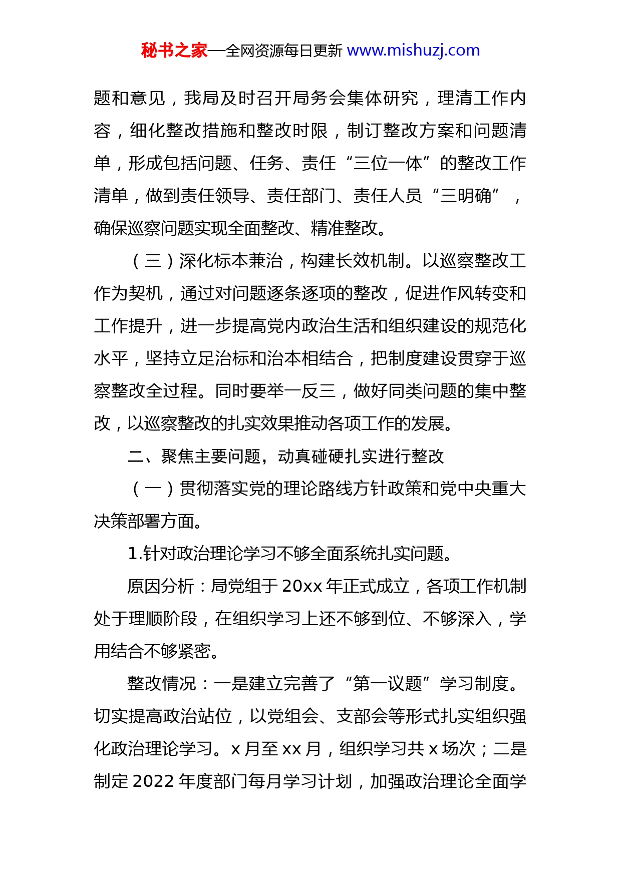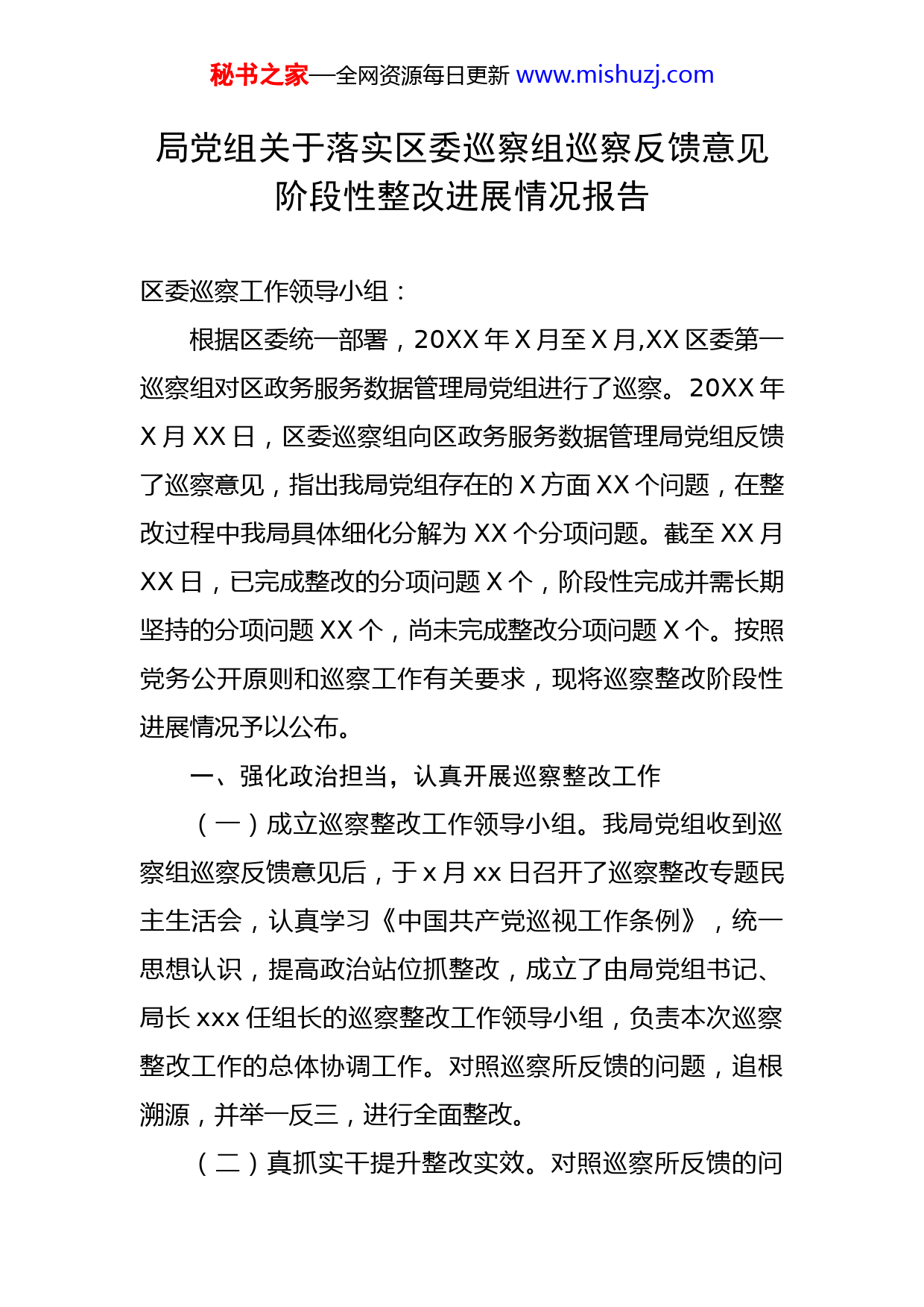 秘书之家—全网资源每日更新www.mishuzj.com局党组关于落实区委巡察组巡察反馈意见阶段性整改进展情况报告区委巡察工作领导小组:根据区委统一部署,20XX年X月至X月,XX区委第一巡察组对区政务服务数据管理局党组进行了巡察。20XX年X月XX日,区委巡察组向区政务服务数据管理局党组反馈了巡察意见,指出我局党组存在的X方面XX个问题,在整改过程中我局具体细化分解为XX个分项问题。截至XX月XX日,已完成整改的分项问题X个,阶段性完成并需长期坚持的分项问题XX个,尚未完成整改分项问题X个。按照党务公开原则和巡察工作有关要求,现将巡察整改阶段性进展情况予以公布。一、强化政治担当,认真开展巡察整改工作(一)成立巡察整改工作领导小组。我局党组收到巡察组巡察反馈意见后,于x月xx日召开了巡察整改专题民主生活会,认真学习《中国共产党巡视工作条例》,统一思想认识,提高政治站位抓整改,成立了由局党组书记、局长xxx任组长的巡察整改工作领导小组,负责本次巡察整改工作的总体协调工作。对照巡察所反馈的问题,追根溯源,并举一反三,进行全面整改。(二)真抓实干提升整改实效。对照巡察所反馈的问秘书之家—全网资源每日更新www.mishuzj.com题和意见,我局及时召开局务会集体研究,理清工作内容,细化整改措施和整改时限,制订整改方案和问题清单,形成包括问题、任务、责任“三位一体”的整改工作清单,做到责任领导、责任部门、责任人员“三明确”,确保巡察问题实现全面整改、精准整改。(三)深化标本兼治,构建长效机制。以巡察整改工作为契机,通过对问题逐条逐项的整改,促进作风转变和工作提升,进一步提高党内政治生活和组织建设的规范化水平,坚持立足治标和治本相结合,把制度建设贯穿于巡察整改全过程。同时要举一反三,做好同类问题的集中整改,以巡察整改的扎实效果推动各项工作的发展。二、聚焦主要问题,动真碰硬扎实进行整改(一)贯彻落实党的理论路线方针政策和党中央重大决策部署方面。1.针对政治理论学习不够全面系统扎实问题。原因分析:局党组于20xx年正式成立,各项工作机制处于理顺阶段,在组织学习上还不够到位、不够深入,学用结合不够紧密。整改情况:一是建立完善了“第一议题”学习制度。切实提高政治站位,以党组会、支部会等形式扎实组织强化政治理论学习。x月至xx月,组织学习共x场次;二是制定2022年度部门每月学习计划,加强政治理论全面学秘书之家—全网资源每日更新www.mishuzj.com习,将理论与实际工作结合,结合本职工作情况谈心得体会,带领机关全体党员干部学深悟透,不断加深对政治理论的系统理解和把握;三是严格按照《党支部工作手册》工作要求,每季度开展一次党课。x月xx日,局党组书记为党员干部上《党章党规党纪》专题党课,切实加强党性修养,认真检查自己的工作和作风。目前该问题整改完成,并长期坚持。2.针对意识形态工作责任制未能落细落实问题。原因分析:一是局党组成立不久,且单位在编在岗人员只有x名,党组工作偏重于业务开展,弱化了意识形态工作,疏于学习;二是党组只有两名班子成员,重心都偏向对自身业务的熟悉和开展,导致意识形态工作责任制未能落细落实。整改情况:一是定期召开党组会学习研究部署意识形态相关工作,将意识形态结合“数字政府”改革建设的工作实际扎实推进;二是将意识形态工作纳入2022年工作计划,把意识形态工作与业务同部署、同研究,规范完善相关工作台账。目前该问题整改完成,并长期坚持。3.针对推动政务信息化建设能力不足,政务资源共享工作进度将慢问题。原因分析:数据共享支撑不足,跨部门协同应用受限制;干部队伍对“数字政府”的认知不深,专业化水平参秘书之家—全网资源每日更新www.mishuzj.com差不齐,导致各单位对政务信息化建设认识不足,推动政务资源共享有压力、有阻力。整改情况:一是落实专人加强“xxx”使用监管,督促各单位将涉及政务的工作群全部迁移到“xxx”等政务服务平台,提高“xxx”日活跃率;二是进行不定时通报,我局分别于x月xx日、xx月xx日、xx月x日对我区各单位“xxx”应用情况进行通报,要求各单位要高度重视,不折不扣落实好《关于进一步推广应用“xxx”的通知》要求,提升“xxx”使用率,保证政务信息传输安全;三是组织开展政务信息化能力和公共数据资源普查工作,积极梳理“三张清单”,编制数据资源目录和进行数据挂接,打破数据政务孤岛。目前,通过省数据普查系统梳理发布政务信息系统x个,已发布数据资源目录xx类,在“开放xx”平台上对外开放数据集xxx个,推进数据有序共享,实现“数据”替人多跑路。目前该问题整改完成,并长期坚持。4.针对XX平台作用发挥不足问题。原因分析:对于工单内容的分析研判仍不够全面,加上镇街体制改革执法权限下放的问题,一个工单往往涉及多个职能部门,造成处理效率较低。整改情况:一是完善组织领导机构,印发《关于调整局领导班子成员和机关同志分工的通知》,明确XXX平秘书之家—全网资源每日更新www.mishuzj.com台、机关效能分管领导;二是对XXX平台疑难工单加强集体研判,召开局务会进行讨论,并对我区x-xx月工单数量进行数据分析,通过数据看本质,针对退单原因举一反三,减少退单的情况发生;三是组织各部门重新报送分管领导和联络员名单,印发《