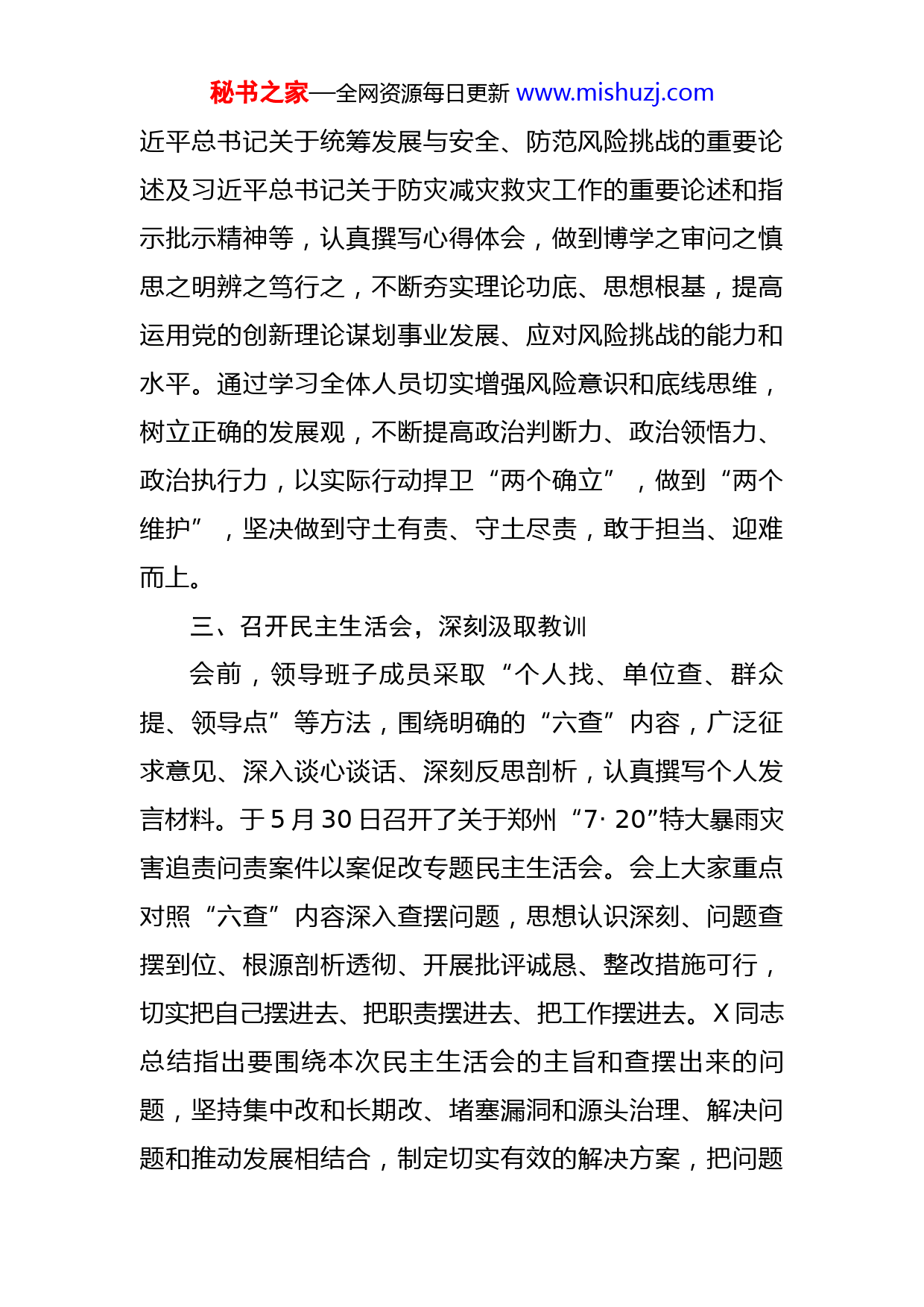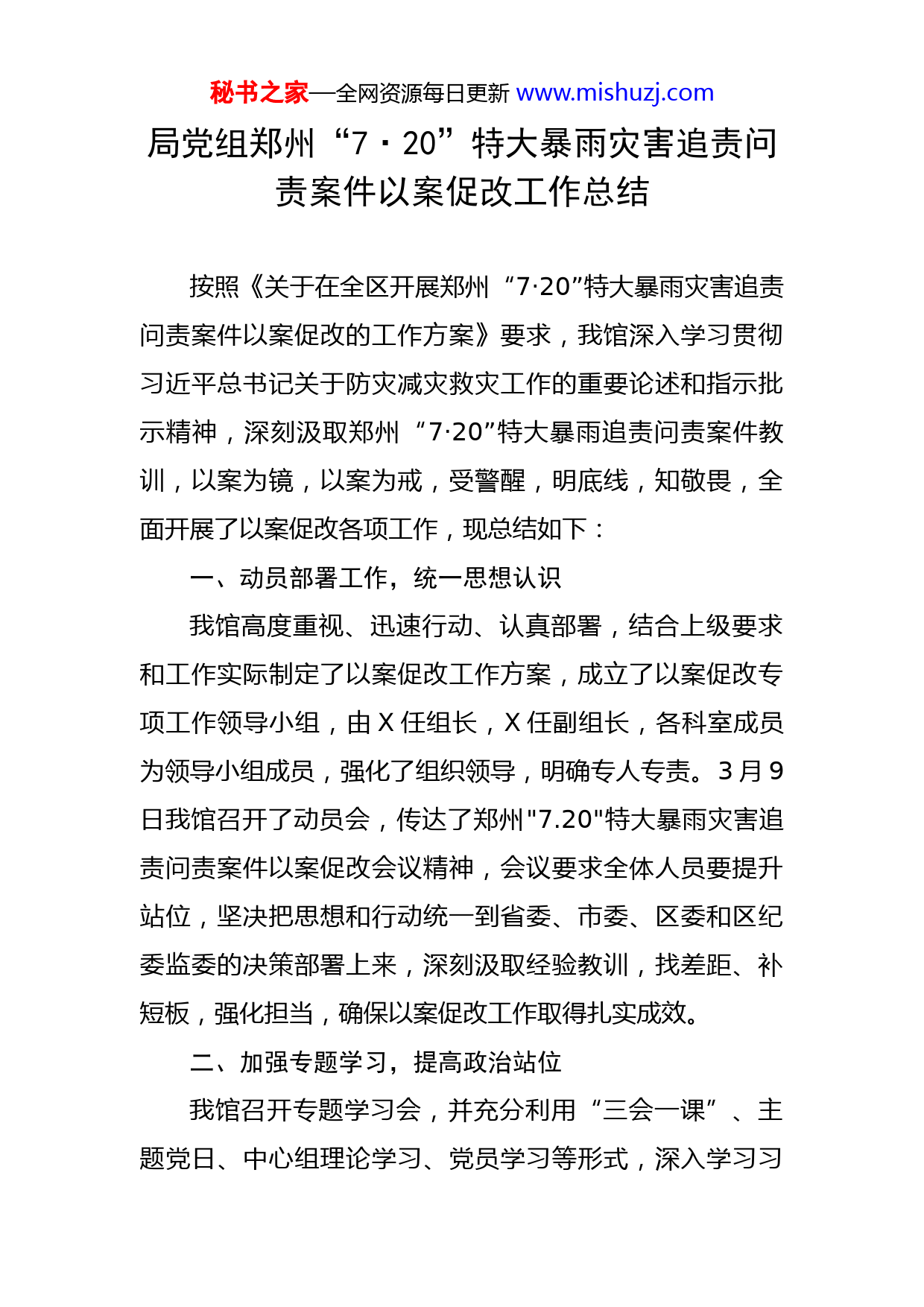 秘书之家—全网资源每日更新www.mishuzj.com局党组郑州“7·20”特大暴雨灾害追责问责案件以案促改工作总结按照《关于在全区开展郑州“7·20”特大暴雨灾害追责问责案件以案促改的工作方案》要求,我馆深入学习贯彻习近平总书记关于防灾减灾救灾工作的重要论述和指示批示精神,深刻汲取郑州“7·20”特大暴雨追责问责案件教训,以案为镜,以案为戒,受警醒,明底线,知敬畏,全面开展了以案促改各项工作,现总结如下:一、动员部署工作,统一思想认识我馆高度重视、迅速行动、认真部署,结合上级要求和工作实际制定了以案促改工作方案,成立了以案促改专项工作领导小组,由X任组长,X任副组长,各科室成员为领导小组成员,强化了组织领导,明确专人专责。3月9日我馆召开了动员会,传达了郑州"7.20"特大暴雨灾害追责问责案件以案促改会议精神,会议要求全体人员要提升站位,坚决把思想和行动统一到省委、市委、区委和区纪委监委的决策部署上来,深刻汲取经验教训,找差距、补短板,强化担当,确保以案促改工作取得扎实成效。二、加强专题学习,提高政治站位我馆召开专题学习会,并充分利用“三会一课”、主题党日、中心组理论学习、党员学习等形式,深入学习习秘书之家—全网资源每日更新www.mishuzj.com近平总书记关于统筹发展与安全、防范风险挑战的重要论述及习近平总书记关于防灾减灾救灾工作的重要论述和指示批示精神等,认真撰写心得体会,做到博学之审问之慎思之明辨之笃行之,不断夯实理论功底、思想根基,提高运用党的创新理论谋划事业发展、应对风险挑战的能力和水平。通过学习全体人员切实增强风险意识和底线思维,树立正确的发展观,不断提高政治判断力、政治领悟力、政治执行力,以实际行动捍卫“两个确立”,做到“两个维护”,坚决做到守土有责、守土尽责,敢于担当、迎难而上。三、召开民主生活会,深刻汲取教训会前,领导班子成员采取“个人找、单位查、群众提、领导点”等方法,围绕明确的“六查”内容,广泛征求意见、深入谈心谈话、深刻反思剖析,认真撰写个人发言材料。于5月30日召开了关于郑州“7·20”特大暴雨灾害追责问责案件以案促改专题民主生活会。会上大家重点对照“六查”内容深入查摆问题,思想认识深刻、问题查摆到位、根源剖析透彻、开展批评诚恳、整改措施可行,切实把自己摆进去、把职责摆进去、把工作摆进去。X同志总结指出要围绕本次民主生活会的主旨和查摆出来的问题,坚持集中改和长期改、堵塞漏洞和源头治理、解决问题和推动发展相结合,制定切实有效的解决方案,把问题秘书之家—全网资源每日更新www.mishuzj.com整改成效转化为制度机制,做到真查真改,确保以案促改、以案促治扎实有效。四、抓好整改落实,提升能力作风我馆将以案促改工作与“能力作风建设年”活动为相结合,以“三标”活动和“两大一争”为抓手,认真落实“六查”要求,聚焦问题,明确责任分工,细化整改举措,抓好整改落实。一是完善规章制度。建立健全了《金水区档案馆应急管理预案》《金水区档案馆防范重大风险工作机制》等制度,有效防范各种潜在风险,下好先行棋,打好主动仗,更好地应对工作中各种可以预见和难以预见的风险挑战,不断提高综合治理能力。二是强化责任担当。班子成员压紧压实主体责任,始终把责任记在心上、扛在肩上,始终保持昂扬向上、奋发有为的精神状态,坚持说实话、谋实事、出实招、求实效。同时,在矛盾和问题面前做到敢抓敢管、敢于碰硬,面对急难险重任务豁得出来、顶得上去。领导班子研究制定应急工作预案,组织队伍进行防汛救灾培训演练,购买应急物资,为充分发挥本馆在应对抢险救灾、疫情防控等突发事故或重大社会事件时的感知响应、统一指挥、综合协调能力做准备。三是改进工作作风。全体人员强化责任意识和担当精神,在创新工作方式上下功夫。从思想上克服畏难情绪、扎实做好本职工作,敢于知难而进,敢于碰硬,以高度负秘书之家—全网资源每日更新www.mishuzj.com责的态度,正确、高效地完成工作任务,提高自己的执行力,不断增强工作的主动性、超前性,充分发挥主观能动性,在创新中发展,努力提高工作能力和服务水平。四是强化组织监督。我馆督促党员尤其是党员领导干部强化防灾减灾救灾主体责任意识,并将应急管理能力纳入干部日常考核,真正管在平常、严在日常、抓在经常,切实提升监督实效。