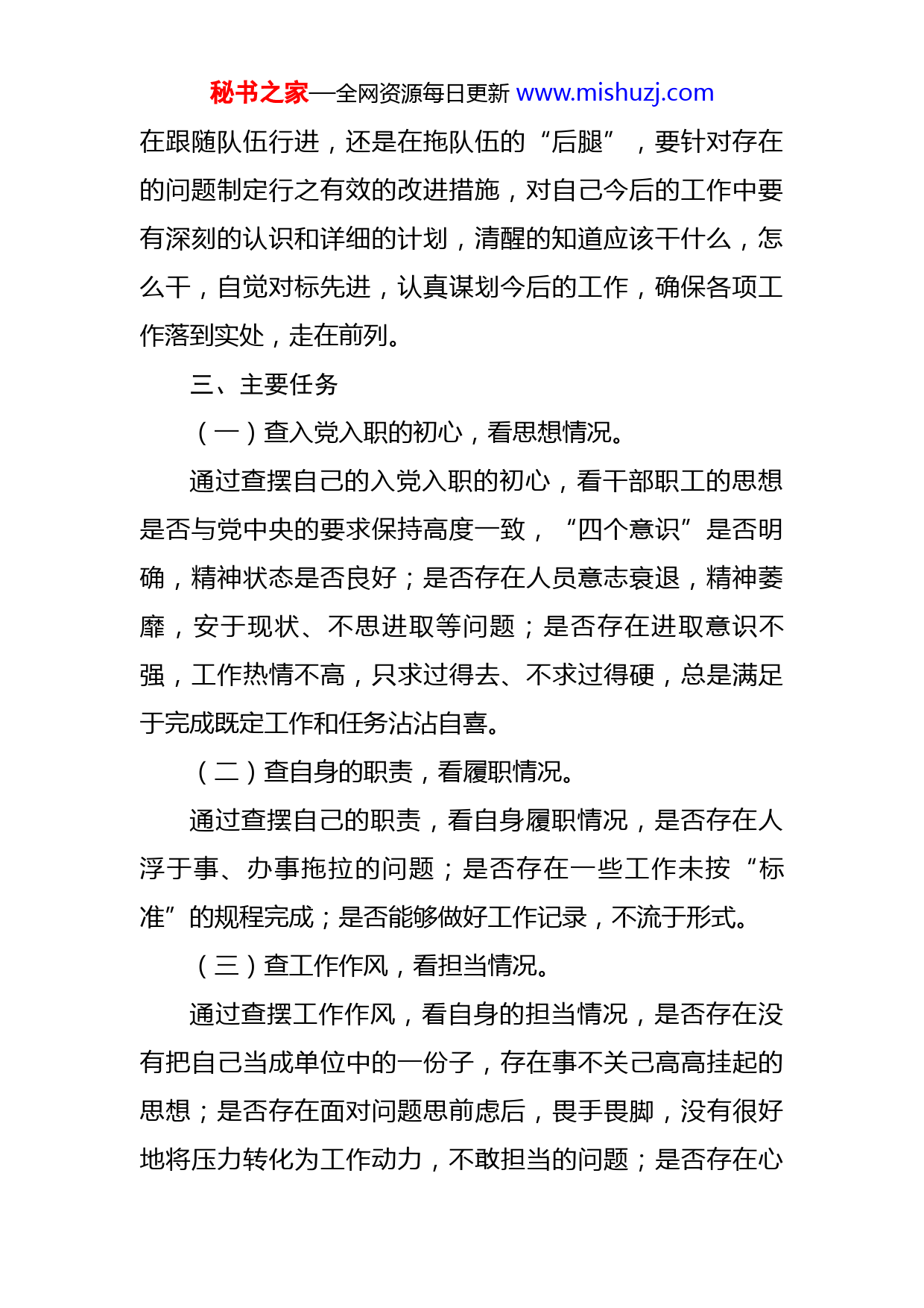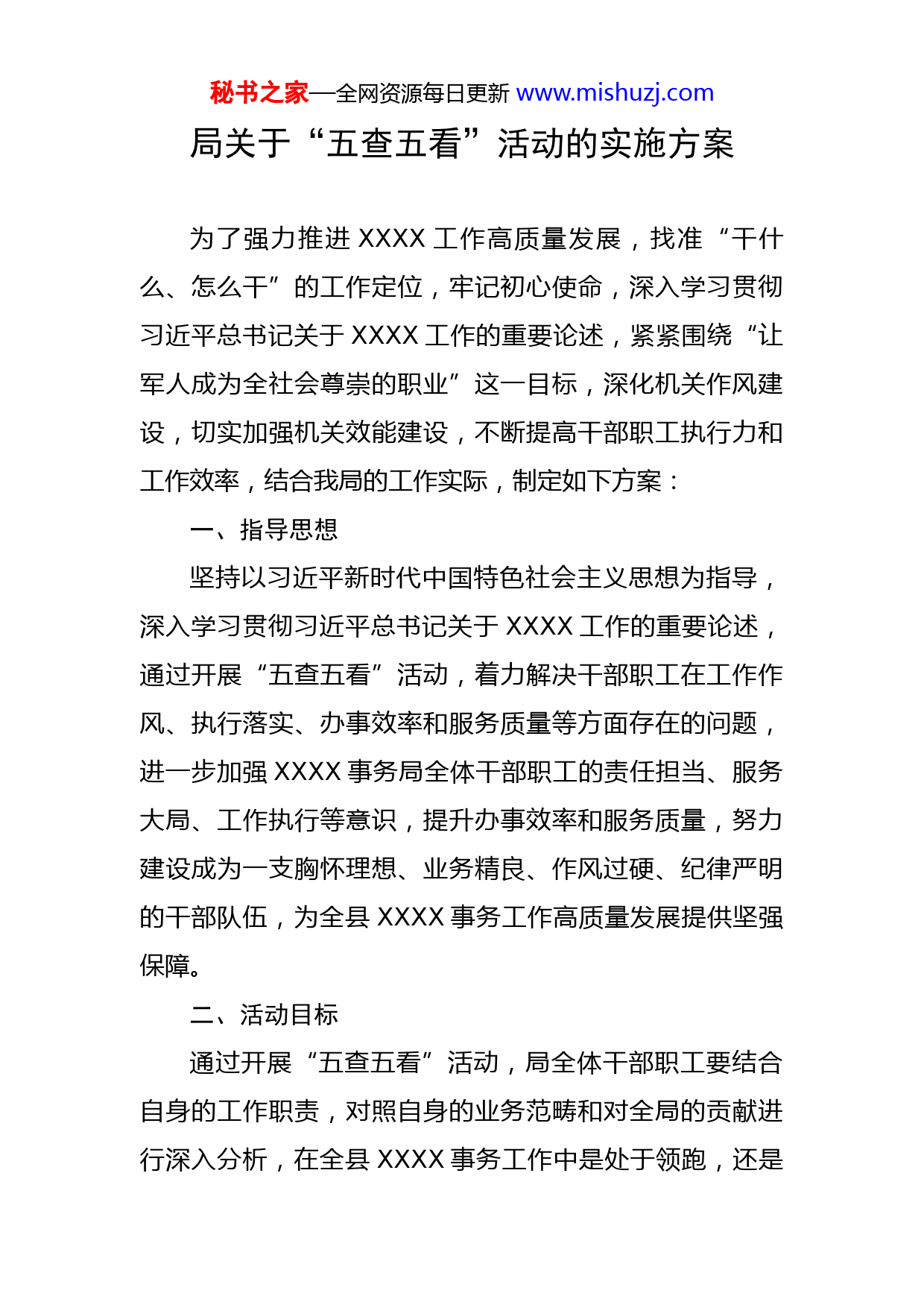 秘书之家—全网资源每日更新www.mishuzj.com局关于“五查五看”活动的实施方案为了强力推进XXXX工作高质量发展,找准“干什么、怎么干”的工作定位,牢记初心使命,深入学习贯彻习近平总书记关于XXXX工作的重要论述,紧紧围绕“让军人成为全社会尊崇的职业”这一目标,深化机关作风建设,切实加强机关效能建设,不断提高干部职工执行力和工作效率,结合我局的工作实际,制定如下方案:一、指导思想坚持以习近平新时代中国特色社会主义思想为指导,深入学习贯彻习近平总书记关于XXXX工作的重要论述,通过开展“五查五看”活动,着力解决干部职工在工作作风、执行落实、办事效率和服务质量等方面存在的问题,进一步加强XXXX事务局全体干部职工的责任担当、服务大局、工作执行等意识,提升办事效率和服务质量,努力建设成为一支胸怀理想、业务精良、作风过硬、纪律严明的干部队伍,为全县XXXX事务工作高质量发展提供坚强保障。二、活动目标通过开展“五查五看”活动,局全体干部职工要结合自身的工作职责,对照自身的业务范畴和对全局的贡献进行深入分析,在全县XXXX事务工作中是处于领跑,还是秘书之家—全网资源每日更新www.mishuzj.com在跟随队伍行进,还是在拖队伍的“后腿”,要针对存在的问题制定行之有效的改进措施,对自己今后的工作中要有深刻的认识和详细的计划,清醒的知道应该干什么,怎么干,自觉对标先进,认真谋划今后的工作,确保各项工作落到实处,走在前列。三、主要任务(一)查入党入职的初心,看思想情况。通过查摆自己的入党入职的初心,看干部职工的思想是否与党中央的要求保持高度一致,“四个意识”是否明确,精神状态是否良好;是否存在人员意志衰退,精神萎靡,安于现状、不思进取等问题;是否存在进取意识不强,工作热情不高,只求过得去、不求过得硬,总是满足于完成既定工作和任务沾沾自喜。(二)查自身的职责,看履职情况。通过查摆自己的职责,看自身履职情况,是否存在人浮于事、办事拖拉的问题;是否存在一些工作未按“标准”的规程完成;是否能够做好工作记录,不流于形式。(三)查工作作风,看担当情况。通过查摆工作作风,看自身的担当情况,是否存在没有把自己当成单位中的一份子,存在事不关己高高挂起的思想;是否存在面对问题思前虑后,畏手畏脚,没有很好地将压力转化为工作动力,不敢担当的问题;是否存在心秘书之家—全网资源每日更新www.mishuzj.com浮气躁、工作方法简单,导致人为造成的信访隐患给全局整体工作带来负面影响。(四)查工作纪律,看遵守情况。通过查摆工作纪律,看自身的遵守情况,是否存在上班迟到早退、串岗脱岗、无故旷工、工作时间做与工作无关的事情等问题;是否存在办事不公、推诿扯皮、效能低下等问题;是否存在无视局机关各项工作制度,工作日擅离职守、作风漂浮、纪律松散等问题。(五)查工作标准,看争先情况。通过查摆工作标准,看争先情况,是否存在工作只停留在做表面文章上,没有赶超、争先创优意识;是否存在对业务知识掌握不够,履职能力不足,缺乏钻研业务动力。四、活动要求(一)高度重视,加强领导。XXXX事务局成立“五查五看”活动领导小组,党组书记、局长XXXX任组长,副局长XXXX、XXXX级主任科员XXXX任副组长,各股室长XXXX、XXXX、XXXX、XXXX、XXXX为成员,在局办公室下设“五查五看”活动领导小组办公室,主任由XXXX担任。把开展“五查五看”作为推动工作的重要抓手,切实加强组织领导,局全体干部职工要高度重视和认知此次秘书之家—全网资源每日更新www.mishuzj.com活动的重要意义。(二)狠抓落实,务求实效。局全体干部职工要认真查找和解决在“五查五看”过程中存在的责任感不强,有令不行、有禁不止,工作上缺乏主动性、积极性,政策执行不得力,工作落实不到位等一系列问题。努力实现XXXX工作有新突破,整体工作有新成效,自身建设有新进展。