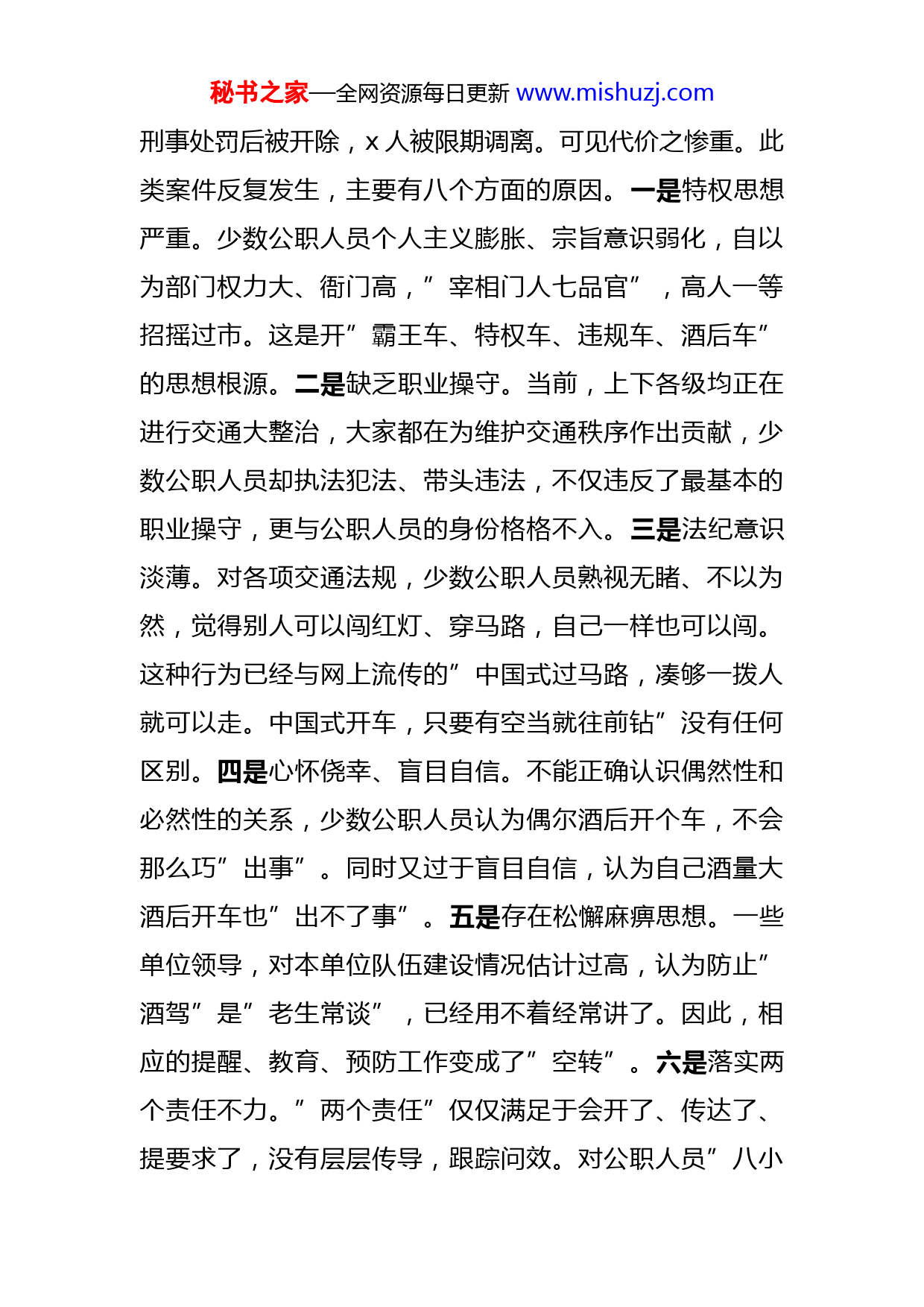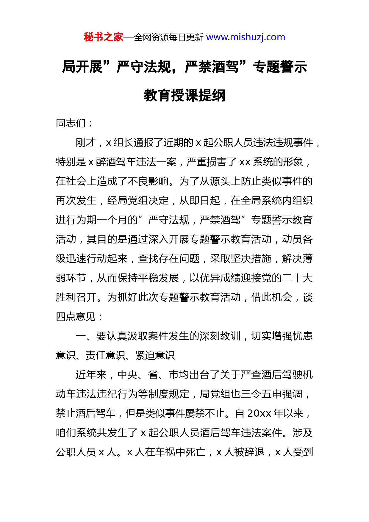 秘书之家—全网资源每日更新www.mishuzj.com局开展”严守法规,严禁酒驾”专题警示教育授课提纲同志们:刚才,x组长通报了近期的x起公职人员违法违规事件,特别是x醉酒驾车违法一案,严重损害了xx系统的形象,在社会上造成了不良影响。为了从源头上防止类似事件的再次发生,经局党组决定,从即日起,在全局系统内组织进行为期一个月的”严守法规,严禁酒驾”专题警示教育活动,其目的是通过深入开展专题警示教育活动,动员各级迅速行动起来,查找存在问题,采取坚决措施,解决薄弱环节,从而保持平稳发展,以优异成绩迎接党的二十大胜利召开。为抓好此次专题警示教育活动,借此机会,谈四点意见:一、要认真汲取案件发生的深刻教训,切实增强忧患意识、责任意识、紧迫意识近年来,中央、省、市均出台了关于严查酒后驾驶机动车违法违纪行为等制度规定,局党组也三令五申强调,禁止酒后驾车,但是类似事件屡禁不止。自20xx年以来,咱们系统共发生了x起公职人员酒后驾车违法案件。涉及公职人员x人。x人在车祸中死亡,x人被辞退,x人受到秘书之家—全网资源每日更新www.mishuzj.com刑事处罚后被开除,x人被限期调离。可见代价之惨重。此类案件反复发生,主要有八个方面的原因。一是特权思想严重。少数公职人员个人主义膨胀、宗旨意识弱化,自以为部门权力大、衙门高,”宰相门人七品官”,高人一等招摇过市。这是开”霸王车、特权车、违规车、酒后车”的思想根源。二是缺乏职业操守。当前,上下各级均正在进行交通大整治,大家都在为维护交通秩序作出贡献,少数公职人员却执法犯法、带头违法,不仅违反了最基本的职业操守,更与公职人员的身份格格不入。三是法纪意识淡薄。对各项交通法规,少数公职人员熟视无睹、不以为然,觉得别人可以闯红灯、穿马路,自己一样也可以闯。这种行为已经与网上流传的”中国式过马路,凑够一拨人就可以走。中国式开车,只要有空当就往前钻”没有任何区别。四是心怀侥幸、盲目自信。不能正确认识偶然性和必然性的关系,少数公职人员认为偶尔酒后开个车,不会那么巧”出事”。同时又过于盲目自信,认为自己酒量大酒后开车也”出不了事”。五是存在松懈麻痹思想。一些单位领导,对本单位队伍建设情况估计过高,认为防止”酒驾”是”老生常谈”,已经用不着经常讲了。因此,相应的提醒、教育、预防工作变成了”空转”。六是落实两个责任不力。”两个责任”仅仅满足于会开了、传达了、提要求了,没有层层传导,跟踪问效。对公职人员”八小秘书之家—全网资源每日更新www.mishuzj.com时以外”的关心和管理,本来是职能部门、业务部门齐抓共管的”结合点”,结果成了”薄弱点”。七是内部管理失之于宽、失之于软。一些部门领导习惯于当”三匠干部”。党内生活中是”泥水匠”,喜欢”和稀泥”,你好我好大家好。做思想政治工作是”棉花匠”,习惯了”自弹自唱”“照本宣科”。监督问责上是”小木匠”,”睁只眼闭只眼”,看到问题却视而不见、绕着道走。八是指导思想存在偏差。即对公职人员的要求,除了工作是”硬指标”、其他会变成”软指标”,上下班迟到早退、闯个交通红绿灯、”八小时以外”社会交往过多,都只是公职人员”个人问题”“小节问题”,导致了一些本该发现的苗头没有发现、本该解决的问题没有解决,本该处理的事情没有处理,等到发生违规违法违纪事件时,又感到”大吃一惊”。以上八个方面的深刻教训,各级都要警钟长鸣引以为戒,防止类似的违法案(事)件在本单位重演。当前百年变局及世纪疫情交织深刻影响,这个时候,公务系统每发生一起违纪违法案件,就是一个刺耳的”音符”,一个不和谐的”音调”。希望各级党组一定要强化忧患意识,”先天下之忧而忧,后天下之乐而乐”;一定要强化责任意识,”跨前一步、自觉担当”;一定要强化紧迫意识,”时不我待、只争朝夕”,以对历史和未来负责的态度,用舍我其谁的勇气、居安思危的清醒,全力抓秘书之家—全网资源每日更新www.mishuzj.com好队伍建设,稳中有进、稳中求新,把上级交给我们的任务完成好。二、要牢记公务系统人员职业特质,提高思想认识,全面抓实专题警示教育活动“公职人员在业外之一言一行,不仅关乎其个人形象,更与整个公务系统公信力乃至社会公众对政府的信任息息相关。”在群众眼里,公职人员应当是社会伦理的坚守者和公序良俗的示范者。因此,个别公职人员的一次交通违法,一次吃请,一次违纪甚至是与公职人员身份不相符的一句话,都有可能毁掉广大公务人员通过无数次努力付出才树立起来的良好形象,都有可能毁掉群众对党和政府的信任和信心。这绝不是危言耸听,我们已经有过这方面的深刻教训。”风起于青萍之末”。实践也已经证明,一些公职人员发生违纪违法案件,就是从违反交通法规、接受吃请、热衷参与社交等”个人小节”开始的。小节不守,必然大节不保。我们要教育公职人员时刻牢记,作为一名公职人员,必须自觉守法,敬畏法律。不仅要敬畏法律,遵守法律,还要维护法律,捍卫法律,更加自觉地争当遵章守纪的模范,更加自觉地遵守道路交通法规。《公务员法》对公职人员加强自身修养和约束业外活动进行了明确的规定。明确指出在日常生活中,应当严格自律,行为检点,培养高