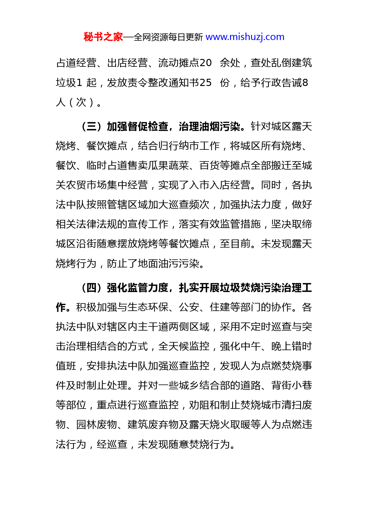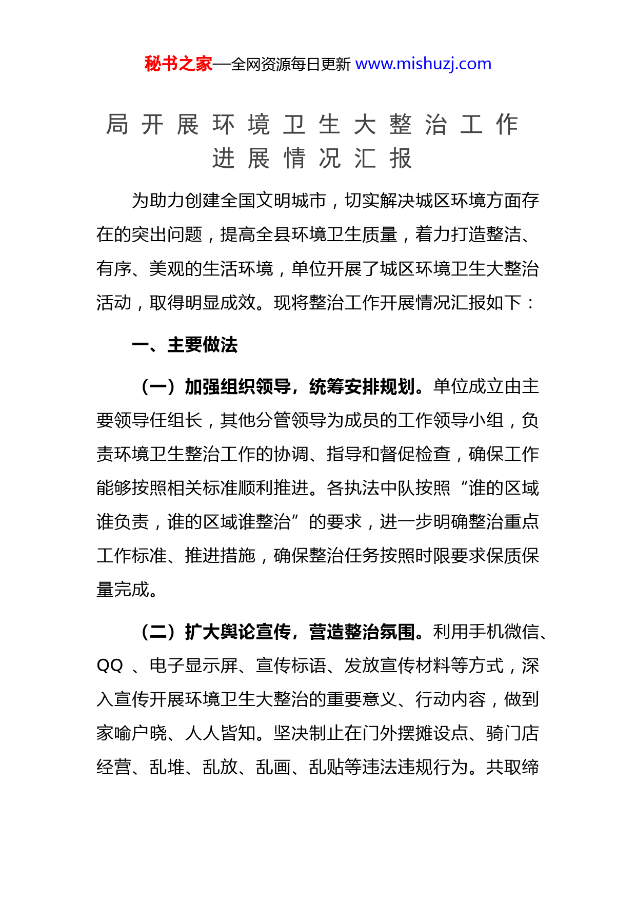 秘书之家—全网资源每日更新www.mishuzj.com局开展环境卫生大整治工作进展情况汇报为助力创建全国文明城市,切实解决城区环境方面存在的突出问题,提高全县环境卫生质量,着力打造整洁、有序、美观的生活环境,单位开展了城区环境卫生大整治活动,取得明显成效。现将整治工作开展情况汇报如下:一、主要做法(一)加强组织领导,统筹安排规划。单位成立由主要领导任组长,其他分管领导为成员的工作领导小组,负责环境卫生整治工作的协调、指导和督促检查,确保工作能够按照相关标准顺利推进。各执法中队按照“谁的区域谁负责,谁的区域谁整治”的要求,进一步明确整治重点工作标准、推进措施,确保整治任务按照时限要求保质保量完成。(二)扩大舆论宣传,营造整治氛围。利用手机微信、QQ、电子显示屏、宣传标语、发放宣传材料等方式,深入宣传开展环境卫生大整治的重要意义、行动内容,做到家喻户晓、人人皆知。坚决制止在门外摆摊设点、骑门店经营、乱堆、乱放、乱画、乱贴等违法违规行为。共取缔秘书之家—全网资源每日更新www.mishuzj.com占道经营、出店经营、流动摊点20余处,查处乱倒建筑垃圾1起,发放责令整改通知书25份,给予行政告诫8人(次)。(三)加强督促检查,治理油烟污染。针对城区露天烧烤、餐饮摊点,结合归行纳市工作,将城区所有烧烤、餐饮、临时占道售卖瓜果蔬菜、百货等摊点全部搬迁至城关农贸市场集中经营,实现了入市入店经营。同时,各执法中队按照管辖区域加大巡查频次,加强执法力度,做好相关法律法规的宣传工作,落实有效监管措施,坚决取缔城区沿街随意摆放烧烤等餐饮摊点,至目前。未发现露天烧烤行为,防止了地面油污污染。(四)强化监管力度,扎实开展垃圾焚烧污染治理工作。积极加强与生态环保、公安、住建等部门的协作。各执法中队对辖区内主干道两侧区域,采用不定时巡查与突击治理相结合的方式,全天候监控,强化中午、晚上错时值班,安排执法中队加强巡查监控,发现人为点燃焚烧事件及时制止处理。并对一些城乡结合部的道路、背街小巷等部位,重点进行巡查监控,劝阻和制止焚烧城市清扫废物、园林废物、建筑废弃物及露天烧火取暖等人为点燃违法行为,经巡查,未发现随意焚烧行为。秘书之家—全网资源每日更新www.mishuzj.com(五)加强巡查,严格规范烟花爆竹燃放。配合公安部门严格落实《县城区烟花爆竹燃放安全管理规定》及安全生产管理的有关规定,切实落实烟花爆竹燃放管理措施,保障公共安全和公民人身、财产安全,减少环境污染对烟花爆竹规定定时定点集中燃放,一小时内清除纸屑垃圾。签订烟花爆竹燃放自律协议,督促婚礼、庆典、集会举办单位集中时间、集中地点,在空旷地带集中燃放烟花爆竹,并及时清理收集废弃物,保证环境卫生干净整洁。(六)加强协作配合,不间断开展噪声污染防治工作。对噪声污染源采取强力整治,从源头上减少、防止噪声污染问题的发生。加强与环保、公安、住建等部门的协作,各中队对辖区内主干道两侧区域,采用不定时巡查与突击治理相结合的方式,全天候监控,自城市治理能力提升行动开展以来,本单位强化错时上下班,安排各执法中队加强巡查监控,发现噪声扰民事件及时制止。对商业宣传广播喇叭扰民的,要求其在店内播放,彻底杜绝出店播放,以减少噪声的扩散。共制止噪声扰民现象3件。(七)严格监管,整治露天加工、乱倒污水行为。各执法中队采取定期与不定期方式对露天加工点、装潢部以及占道装修门店、门外乱倒污水行为开展巡查。依法取缔秘书之家—全网资源每日更新www.mishuzj.com露天加工、喷涂作业行为,所有户外装修必须实行围挡施工,共规范装修门店围挡施工2家。(八)分工协作,净化市容环境。开展了“门前三包”集中整治行动,对沿街门店店外经营、店外乱摆乱放店前脏乱差等行为进行了集中整治。同时加大宣传力度,采取口头宣传、发放材料等方式,督促门店业主严格落实“门前三包”责任,对现场发现12处问题立行立改。积极与住建局、自然资源局、环卫大队协同配合,各执法中队在日常市容巡查中对发现的背街小巷、公园、绿地、城乡结合部环境卫生脏乱差和市政设施破损等问题,及时督促相关部门进行整改,做到即知即改,切实将市容环境卫生整治到位,形成齐抓共管的良好局面,提高城市品质。(九)严格落实周末、月末卫生清扫工作。为保持辖区内环境卫生整洁优美,本单位严格执行周五、月末卫生清扫制度,全体干部职工每周五、月末全面清洁责任区域内路面垃圾,清除积存垃圾、杂物等,切实保证城区环境卫生干净。二、存在的主要问题一是查处有疏漏,重教育轻处罚,处罚的力度不够;秘书之家—全网资源每日更新www.mishuzj.com二是个别区域监管次数少,反复性大,常态化监管机制还不到位;三是城市精细化管理水平有待提高,相关职能部门监管不到位,如绕城水系还存在随意洗车乱倒污水、广场舞噪音扰民等现象;四是市民素质参差不齐,乱丢、乱吐、乱挂、乱倒等现象依旧存在,个别经营者环境保护意识欠缺。三、下一步工作计划一是健全机制,持续开展。针对工作中存在的问题和薄弱环节,采取切实可行有效的措施,建立长效管理机制细化措施,狠抓落实;加强与环保、住建等管理部门的协作,形成整治工作合力,确保圆满