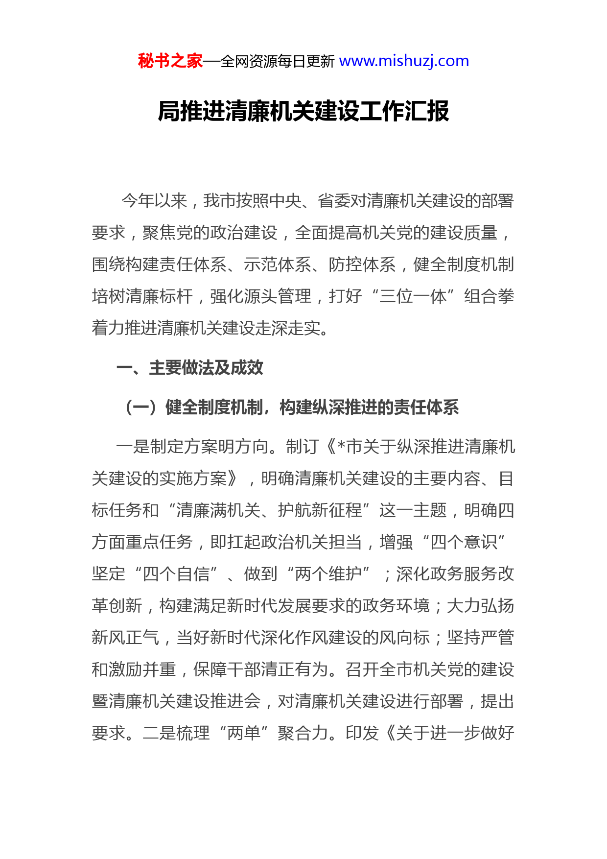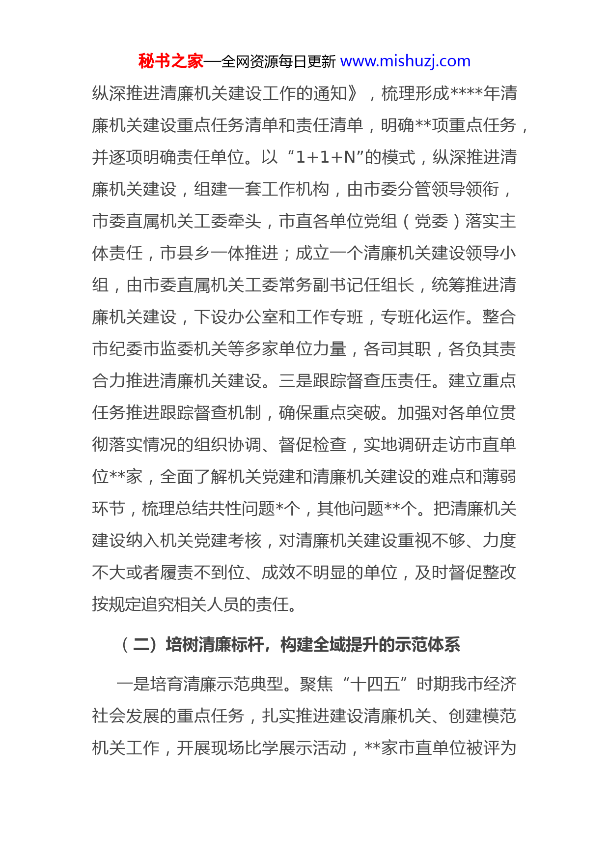 秘书之家—全网资源每日更新www.mishuzj.com局推进清廉机关建设工作汇报今年以来,我市按照中央、省委对清廉机关建设的部署要求,聚焦党的政治建设,全面提高机关党的建设质量,围绕构建责任体系、示范体系、防控体系,健全制度机制培树清廉标杆,强化源头管理,打好“三位一体”组合拳着力推进清廉机关建设走深走实。一、主要做法及成效(一)健全制度机制,构建纵深推进的责任体系一是制定方案明方向。制订《市关于纵深推进清廉机关建设的实施方案》,明确清廉机关建设的主要内容、目标任务和“清廉满机关、护航新征程”这一主题,明确四方面重点任务,即扛起政治机关担当,增强“四个意识”坚定“四个自信”、做到“两个维护”;深化政务服务改革创新,构建满足新时代发展要求的政务环境;大力弘扬新风正气,当好新时代深化作风建设的风向标;坚持严管和激励并重,保障干部清正有为。召开全市机关党的建设暨清廉机关建设推进会,对清廉机关建设进行部署,提出要求。二是梳理“两单”聚合力。印发《关于进一步做好秘书之家—全网资源每日更新www.mishuzj.com纵深推进清廉机关建设工作的通知》,梳理形成年清廉机关建设重点任务清单和责任清单,明确项重点任务,并逐项明确责任单位。以“1+1+N”的模式,纵深推进清廉机关建设,组建一套工作机构,由市委分管领导领衔,市委直属机关工委牵头,市直各单位党组(党委)落实主体责任,市县乡一体推进;成立一个清廉机关建设领导小组,由市委直属机关工委常务副书记任组长,统筹推进清廉机关建设,下设办公室和工作专班,专班化运作。整合市纪委市监委机关等多家单位力量,各司其职,各负其责合力推进清廉机关建设。三是跟踪督查压责任。建立重点任务推进跟踪督查机制,确保重点突破。加强对各单位贯彻落实情况的组织协调、督促检查,实地调研走访市直单位家,全面了解机关党建和清廉机关建设的难点和薄弱环节,梳理总结共性问题个,其他问题个。把清廉机关建设纳入机关党建考核,对清廉机关建设重视不够、力度不大或者履责不到位、成效不明显的单位,及时督促整改按规定追究相关人员的责任。(二)培树清廉标杆,构建全域提升的示范体系一是培育清廉示范典型。聚焦“十四五”时期我市经济社会发展的重点任务,扎实推进建设清廉机关、创建模范机关工作,开展现场比学展示活动,家市直单位被评为秘书之家—全网资源每日更新www.mishuzj.com创建模范机关先进单位,在服务中心大局中争先进、当先锋。研究制定市清廉机关示范点标准体系,及时总结清廉机关建设的好载体、好做法和好经验,在“机关工委”微信公众号、“市机关党建网”开设“清廉机关建设”宣传专栏供市直单位学习借鉴,进一步浓厚清廉机关建设氛围在市直单位机关党组织中受到好评。二是丰富清廉文化载体。加强机关党员干部廉洁思想建设和清廉文化塑造,深入推进清廉文化进机关活动,坚持正面引导和反面教育相结合,依托市直机关党务讲师团,通过举办主题歌咏朗诵汇报演出、知识竞赛、征文、“党课我来讲”、党史系列讲座等活动,对党员干部开展教育万余人次。坚持以案释法明纪,汇编市直机关党员干部违纪违法个典型案例,开展警示教育。通过正反两方面的教育,不断提升广大党员干部廉洁从政意识。三是厚植机关务实之风。以党史学习教育为契机,持续开展“我为群众办实事”“我帮企业解难题”“我为基层减负担”活动,通过组织多名机关党员志愿者为近万名群众提供义诊、理发、法律咨询等便民服务、扎实开展在职党员社区双报到和“学党史、践初心、办实事”集中服务月等活动,领办破难项目个,破解难题个,期间召开民情座谈会场,开展宣讲场,走访村(社)、企业次,在服务群众、践行宗旨中转变作风、树立形象,形成务实为民促发展的新风气。秘书之家—全网资源每日更新www.mishuzj.com(三)强化源头管理,构建清廉机关的防控体系一是深化廉政风险排查。探索完善廉政风险排查常态化、防控措施动态化的制度机制,实施精准施策、有效防控,制定下发《年市廉政风险排查防控工作要点》,建立完善压紧夯实防控责任、召开会议专题分析、动态检视“两张清单”、突出抓好防控重点等十项举措,指导市直各单位扎实推进廉政风险排查工作,及时排查推进清廉机关建设中存在的薄弱环节和突出问题,指导推进构建具有部门特点、行业特色的廉政风险防控体系,切实夯实清廉机关建设工作基础。市直单位累计排查廉政风险点多个,制定防控措施多项,制定完善各类制度多项。二是强化数智改革牵引。打造“数智机关党建”,集中攻坚个应用场景,从个维度对全市机关党组织精准画像,创建模范机关、清廉机关评价应用场景,设立“机关纪检”子栏目,构建以“基础云、联系云、交流云、学习云”为主题内容的“联系服务云”,建立完善机关纪委日常监督教育执纪工作情况比学平台和工作质效综合评价体系,为清廉机关建设提供数字支撑。三是推进规范用权监管。按照“谁授权谁负责、谁任命谁监管”原则,完善机关党组织对下级领导班子特别是“一把手”的监督制度,健全市直机关单位党组(党委)、分管领导、机关党委、秘书之家—全网资源每日更新www.mishuzj.com机关纪委、部门负责人、党支部的监督责任