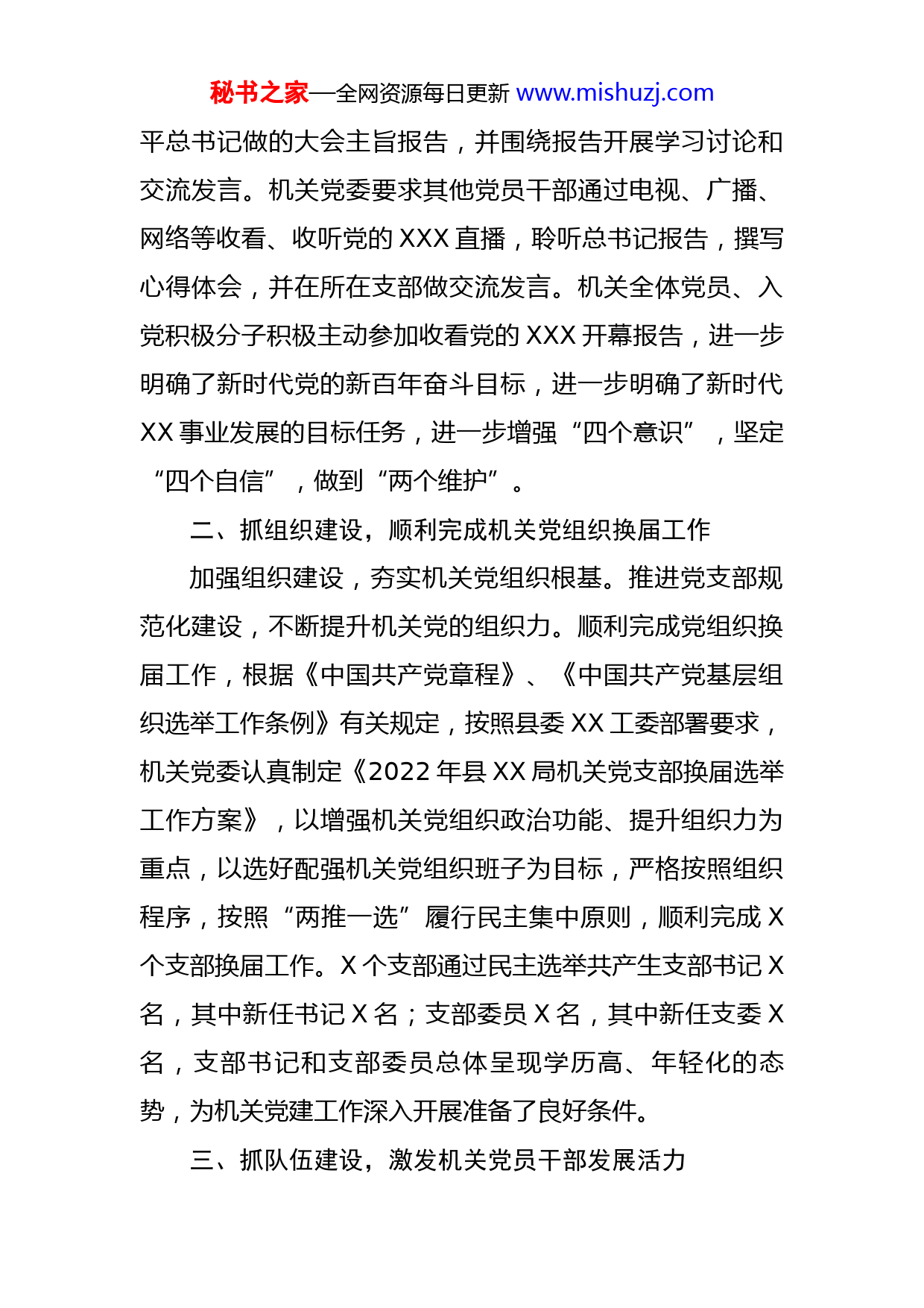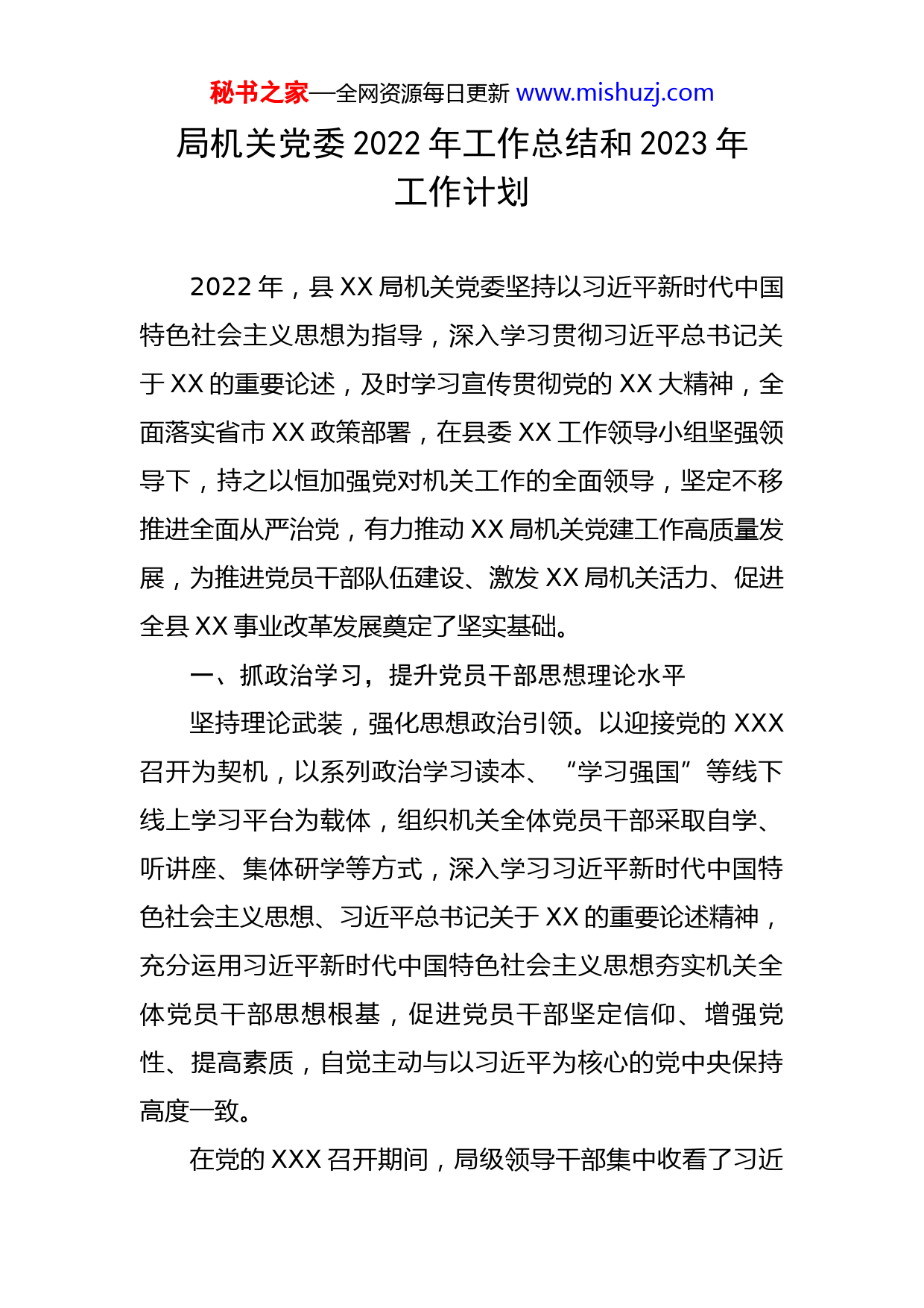 秘书之家—全网资源每日更新www.mishuzj.com局机关党委2022年工作总结和2023年工作计划2022年,县XX局机关党委坚持以习近平新时代中国特色社会主义思想为指导,深入学习贯彻习近平总书记关于XX的重要论述,及时学习宣传贯彻党的XX大精神,全面落实省市XX政策部署,在县委XX工作领导小组坚强领导下,持之以恒加强党对机关工作的全面领导,坚定不移推进全面从严治党,有力推动XX局机关党建工作高质量发展,为推进党员干部队伍建设、激发XX局机关活力、促进全县XX事业改革发展奠定了坚实基础。一、抓政治学习,提升党员干部思想理论水平坚持理论武装,强化思想政治引领。以迎接党的XXX召开为契机,以系列政治学习读本、“学习强国”等线下线上学习平台为载体,组织机关全体党员干部采取自学、听讲座、集体研学等方式,深入学习习近平新时代中国特色社会主义思想、习近平总书记关于XX的重要论述精神,充分运用习近平新时代中国特色社会主义思想夯实机关全体党员干部思想根基,促进党员干部坚定信仰、增强党性、提高素质,自觉主动与以习近平为核心的党中央保持高度一致。在党的XXX召开期间,局级领导干部集中收看了习近秘书之家—全网资源每日更新www.mishuzj.com平总书记做的大会主旨报告,并围绕报告开展学习讨论和交流发言。机关党委要求其他党员干部通过电视、广播、网络等收看、收听党的XXX直播,聆听总书记报告,撰写心得体会,并在所在支部做交流发言。机关全体党员、入党积极分子积极主动参加收看党的XXX开幕报告,进一步明确了新时代党的新百年奋斗目标,进一步明确了新时代XX事业发展的目标任务,进一步增强“四个意识”,坚定“四个自信”,做到“两个维护”。二、抓组织建设,顺利完成机关党组织换届工作加强组织建设,夯实机关党组织根基。推进党支部规范化建设,不断提升机关党的组织力。顺利完成党组织换届工作,根据《中国共产党章程》、《中国共产党基层组织选举工作条例》有关规定,按照县委XX工委部署要求,机关党委认真制定《2022年县XX局机关党支部换届选举工作方案》,以增强机关党组织政治功能、提升组织力为重点,以选好配强机关党组织班子为目标,严格按照组织程序,按照“两推一选”履行民主集中原则,顺利完成X个支部换届工作。X个支部通过民主选举共产生支部书记X名,其中新任书记X名;支部委员X名,其中新任支委X名,支部书记和支部委员总体呈现学历高、年轻化的态势,为机关党建工作深入开展准备了良好条件。三、抓队伍建设,激发机关党员干部发展活力秘书之家—全网资源每日更新www.mishuzj.com坚持把政治过硬摆在首位,加大机关干部队伍建设力度。协助干部管理部门完成X名科级领导、X名股级干部的考察工作;推动机关干部轮岗,X名干部在X个股室(部门)内实现交流,X名机关干部到直属单位或学校任职。完善培训机制,做好公务员干部在线学习、内部培训和选送培养等组织工作,助力提升公务员队伍整体素质,积极打造一支担当有为、争先实干、作风扎实的机关干部队伍。严格机关纪律和管理,按照县委组织部关于股级及以下公务员的加强平时考核新要求,严格考勤、进一步规范平时考核相关工作,每季度对干部出勤情况、考核优秀情况等进行公示,并与绩效奖励挂钩。四、抓廉政教育,坚定不移推进全面从严治党制定机关党委及成员履行全面从严治党主体责任清单,强化主体责任落实。组织党员干部学习廉政知识、廉政纪律,分两批组织机关公务员和挂职干部到县XX监狱接受警示教育,以案为鉴、以案促改,持续进行党风廉政建设和反腐倡廉教育,深入推进机关纪律建设。严格日常监督,运用“四种形态”,利用集中学习、节前短信提醒、重点工作部署等时机,强化作风纪律,重点加强对政府采购、招生管理、干部选用、教师招聘、职称评选等领域监督和专项监察,为机关营造风清气正良好政治生态。开展2022年度机关党组织生活会、民主评议党员,规秘书之家—全网资源每日更新www.mishuzj.com范党委委员述职工作。根据中央、省市和县委关于做好全面从严治党工作要求,X名科处级领导干部以普通党员身份分别在X个支部参加了X次支部活动。五、抓双城联创,切实坚持围绕中心服务大局扎实推进XX局机关爱国卫生运动,落实创建国家卫生城市、全国健康促进区建设工作部署,组织机关党员干部从自身、从办公室做起、从机关环境营造做起,积极参加垃圾分类、光盘行动。积极响应XX街道党建协调委员会倡议,与XXX社区开展共建共创,组织机关党员干部赴社区开展卫生打扫、垃圾清理和绿化活动,积极为区域环境净化美化贡献力量。落实创建全国文明城区、全国森林城市实施方案,动员机关党员干部充分发挥先锋模范作用,强化精神文明建设和文明行为养成,以身作则促进文明城区创建;养成爱绿、护绿习惯,推动人与自然和谐共生,共建美好家园。六、抓疫情防控,全力维护XX局机关安全稳定负责做好XX局机关疫情防控工作,落实疫情防控预案,加强机关干部外出管理、健康检测工作,严格落实佩戴口罩、健康监测、环境消杀检测等要求,建立健全常态长效疫情防控机制,确保了机关没有出现疫情情况。做好疫情防控支援工作,协调机关、基层单位党员干部X批次X余人次下沉到XXX社区、XXX村等3个社区(村)的秘书之家
