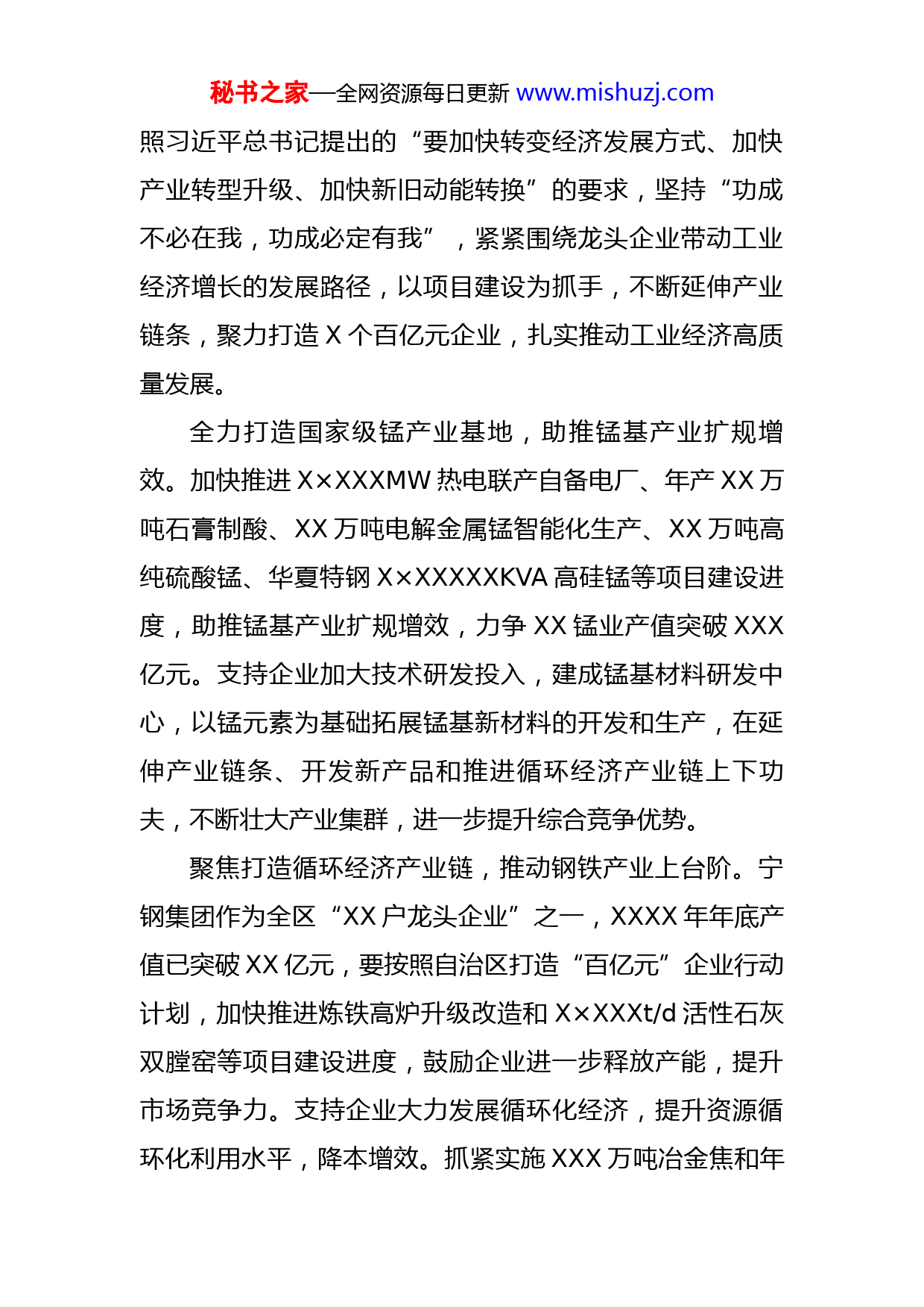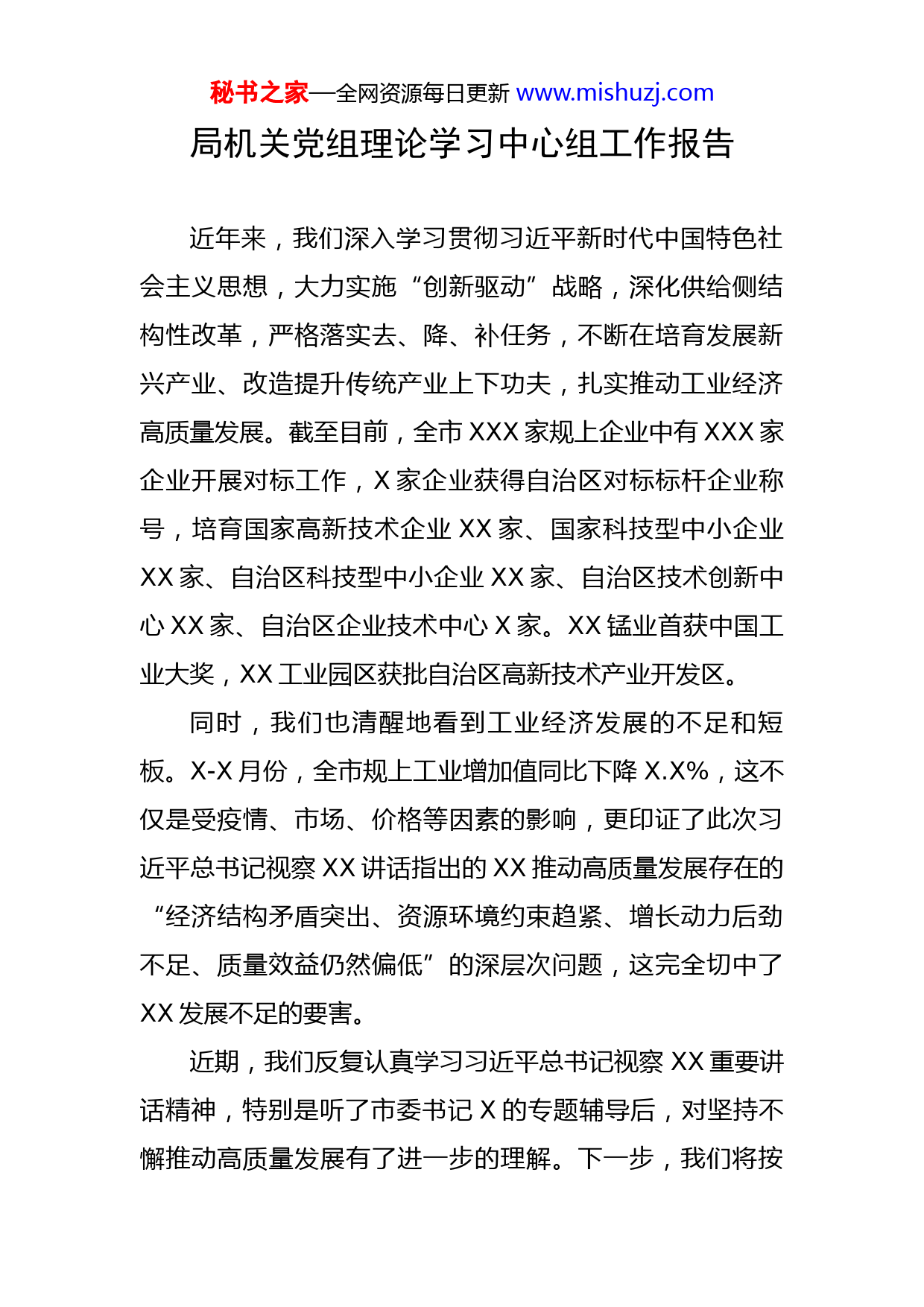秘书之家—全网资源每日更新www.mishuzj.com局机关党组理论学习中心组工作报告近年来,我们深入学习贯彻习近平新时代中国特色社会主义思想,大力实施“创新驱动”战略,深化供给侧结构性改革,严格落实去、降、补任务,不断在培育发展新兴产业、改造提升传统产业上下功夫,扎实推动工业经济高质量发展。截至目前,全市XXX家规上企业中有XXX家企业开展对标工作,X家企业获得自治区对标标杆企业称号,培育国家高新技术企业XX家、国家科技型中小企业XX家、自治区科技型中小企业XX家、自治区技术创新中心XX家、自治区企业技术中心X家。XX锰业首获中国工业大奖,XX工业园区获批自治区高新技术产业开发区。同时,我们也清醒地看到工业经济发展的不足和短板。X-X月份,全市规上工业增加值同比下降X.X%,这不仅是受疫情、市场、价格等因素的影响,更印证了此次习近平总书记视察XX讲话指出的XX推动高质量发展存在的“经济结构矛盾突出、资源环境约束趋紧、增长动力后劲不足、质量效益仍然偏低”的深层次问题,这完全切中了XX发展不足的要害。近期,我们反复认真学习习近平总书记视察XX重要讲话精神,特别是听了市委书记X的专题辅导后,对坚持不懈推动高质量发展有了进一步的理解。下一步,我们将按秘书之家—全网资源每日更新www.mishuzj.com照习近平总书记提出的“要加快转变经济发展方式、加快产业转型升级、加快新旧动能转换”的要求,坚持“功成不必在我,功成必定有我”,紧紧围绕龙头企业带动工业经济增长的发展路径,以项目建设为抓手,不断延伸产业链条,聚力打造X个百亿元企业,扎实推动工业经济高质量发展。全力打造国家级锰产业基地,助推锰基产业扩规增效。加快推进X×XXXMW热电联产自备电厂、年产XX万吨石膏制酸、XX万吨电解金属锰智能化生产、XX万吨高纯硫酸锰、华夏特钢X×XXXXXKVA高硅锰等项目建设进度,助推锰基产业扩规增效,力争XX锰业产值突破XXX亿元。支持企业加大技术研发投入,建成锰基材料研发中心,以锰元素为基础拓展锰基新材料的开发和生产,在延伸产业链条、开发新产品和推进循环经济产业链上下功夫,不断壮大产业集群,进一步提升综合竞争优势。聚焦打造循环经济产业链,推动钢铁产业上台阶。宁钢集团作为全区“XX户龙头企业”之一,XXXX年年底产值已突破XX亿元,要按照自治区打造“百亿元”企业行动计划,加快推进炼铁高炉升级改造和X×XXXt/d活性石灰双膛窑等项目建设进度,鼓励企业进一步释放产能,提升市场竞争力。支持企业大力发展循环化经济,提升资源循环化利用水平,降本增效。抓紧实施XXX万吨冶金焦和年秘书之家—全网资源每日更新www.mishuzj.com产XXX万吨抗震高强成型钢筋智能制造等填平补齐项目,助力企业稳步向前发展,力争XXXX年企业产值突破百亿元。同时,鼓励企业持续开发适应市场需求的新产品,打响企业品牌,增强市场话语权。依托央企资源优势,倾力打造中化XX循环经济产业园。借助与中化集团合作优势,围绕新材料产业发展布局和打造中化XX循环经济产业园建设目标,经过几年的努力,力争将建成全国第一的年产XX万吨高性能尼龙和年产X.XX万吨芳纶项目及全国前三的年产X万吨高镍三元正极材料、年产X万吨高镍三元前驱体、年产X万吨磷酸铁锂正极材料项目和精细化学品及关键中间体生产基地落户XX,助推投资XXX亿元的中化XX循环经济产业园早日落地建成。突出扩大规模,不断延伸铝基产业链条。坚持扩大增量与优化存量并重,在确保现有铝基产业产能不减的基础上,协助宁创新材料公司尽快将甘肃XX万吨电解铝产能转移至XX,在扩大产能的同时,进一步拓展生产铝合金线缆等下游产品,助推企业转型升级,力争XXXX年年底企业产值突破百亿元。同时加大招商引资力度,引进一批“高精尖”下游铝制品制造企业落户XX,不断壮大产业链条。多措并举强基础,进一步提升发展保障力。按照抓上游、保中间、促下游的思路,在保产业链、供应链上下功秘书之家—全网资源每日更新www.mishuzj.com夫,助推在产企业达产达效、停产企业尽早复工复产,努力稳住经济发展基本盘。全面加快项目建设步伐,充分发挥项目带动经济发展作用。全面落实各项政策措施,确保企业应享尽享,助力企业渡过难关。进一步加快推进企业加大技术改造,提升传统产业发展层次。鼓励和支持铁合金等行业兼并重组,抱团发展,不断增强市场竞争力。大力引导企业发展“互联网+先进制造业”,提升自动化、网络化、智能化生产水平,切实帮助企业提质增效。坚持绿色化、融合化发展方向,持续淘汰落后产能,严把项目准入关。深入开展“争要素、解难题、促发展”行动,不断优化营商环境,为工业经济高质量发展提供保证。