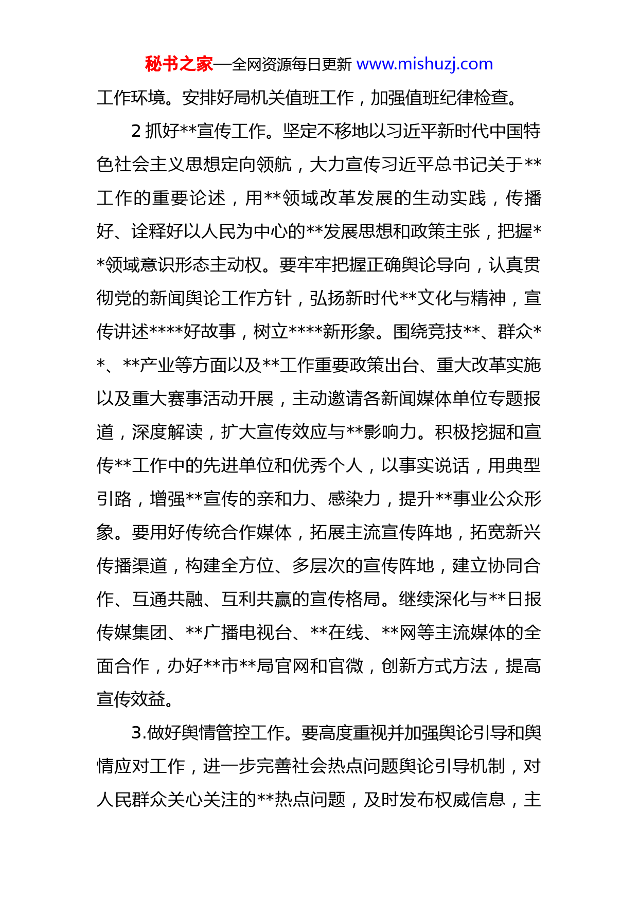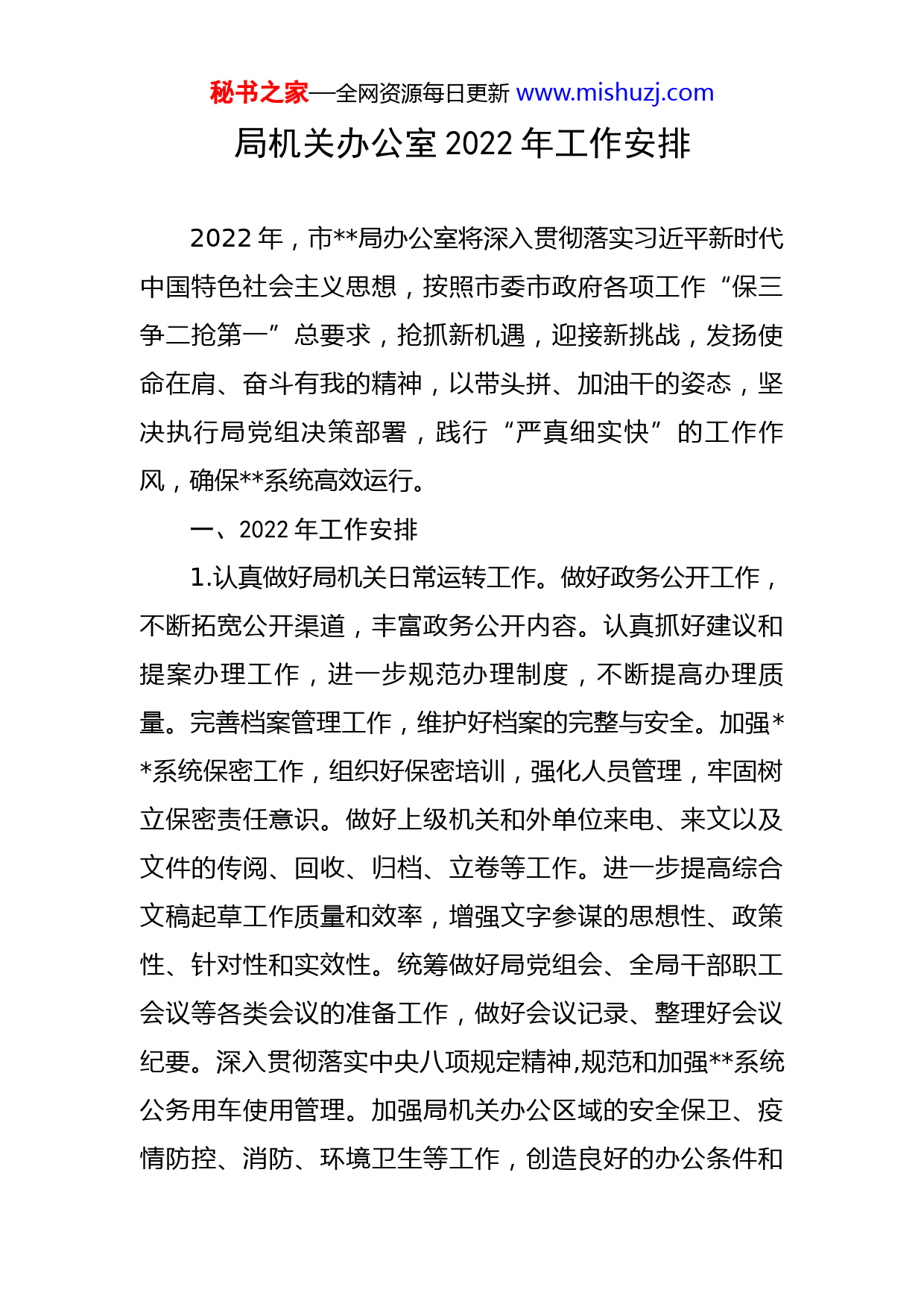 秘书之家—全网资源每日更新www.mishuzj.com局机关办公室2022年工作安排2022年,市局办公室将深入贯彻落实习近平新时代中国特色社会主义思想,按照市委市政府各项工作“保三争二抢第一”总要求,抢抓新机遇,迎接新挑战,发扬使命在肩、奋斗有我的精神,以带头拼、加油干的姿态,坚决执行局党组决策部署,践行“严真细实快”的工作作风,确保系统高效运行。一、2022年工作安排1.认真做好局机关日常运转工作。做好政务公开工作,不断拓宽公开渠道,丰富政务公开内容。认真抓好建议和提案办理工作,进一步规范办理制度,不断提高办理质量。完善档案管理工作,维护好档案的完整与安全。加强系统保密工作,组织好保密培训,强化人员管理,牢固树立保密责任意识。做好上级机关和外单位来电、来文以及文件的传阅、回收、归档、立卷等工作。进一步提高综合文稿起草工作质量和效率,增强文字参谋的思想性、政策性、针对性和实效性。统筹做好局党组会、全局干部职工会议等各类会议的准备工作,做好会议记录、整理好会议纪要。深入贯彻落实中央八项规定精神,规范和加强系统公务用车使用管理。加强局机关办公区域的安全保卫、疫情防控、消防、环境卫生等工作,创造良好的办公条件和秘书之家—全网资源每日更新www.mishuzj.com工作环境。安排好局机关值班工作,加强值班纪律检查。2抓好宣传工作。坚定不移地以习近平新时代中国特色社会主义思想定向领航,大力宣传习近平总书记关于工作的重要论述,用领域改革发展的生动实践,传播好、诠释好以人民为中心的发展思想和政策主张,把握领域意识形态主动权。要牢牢把握正确舆论导向,认真贯彻党的新闻舆论工作方针,弘扬新时代文化与精神,宣传讲述好故事,树立新形象。围绕竞技、群众、产业等方面以及工作重要政策出台、重大改革实施以及重大赛事活动开展,主动邀请各新闻媒体单位专题报道,深度解读,扩大宣传效应与影响力。积极挖掘和宣传工作中的先进单位和优秀个人,以事实说话,用典型引路,增强宣传的亲和力、感染力,提升事业公众形象。要用好传统合作媒体,拓展主流宣传阵地,拓宽新兴传播渠道,构建全方位、多层次的宣传阵地,建立协同合作、互通共融、互利共赢的宣传格局。继续深化与日报传媒集团、广播电视台、在线、网等主流媒体的全面合作,办好市局官网和官微,创新方式方法,提高宣传效益。3.做好舆情管控工作。要高度重视并加强舆论引导和舆情应对工作,进一步完善社会热点问题舆论引导机制,对人民群众关心关注的热点问题,及时发布权威信息,主秘书之家—全网资源每日更新www.mishuzj.com动引导社会舆论。扎实做好12345政务热线、网上民生、民意通等热线平台上群众留言的办理工作,及时答复群众反映的问题,确保服务质量和工作效率。进一步健全重大舆情和突发事件舆论引导机制,加强舆情监测研判和预警工作,及时掌握“苗头性”问题。建立健全重大舆情联动处置机制,发现重大舆情要第一时间报告,按照正面引导化解矛盾的原则,第一时间协同有关部门快速应对,做好舆情管控。4.推进系统职能转变和行政审批制度改革工作。积极做好“互联网+政务服务”工作,严格按照“放管服”改革的要求,在做好“接放管”上下功夫。对承接保留的事项,进一步优化事项办理流程,压缩审批时限,减少群众跑动次数,全面实行“容缺受理”;对应取消的事项坚决取消;对确需下放的事项一律下放。同步做好权责清单调整工作,确保权责清单的合法性和实效性,确保权责清单监管更加有力,做到“接得住”、“放到位”、“管得好”。5.严格执行各项财会制度。编制市局年度经费预算,按照预算编制要求进行审核和汇总,保证年度预算编制真实、完整和准确;加强预算执行监控,确保预算执行到位,监督深入有效;做好财务日常核算和收支管理,严格审核各类凭证和票据,确保会计信息的真实、合法、准确秘书之家—全网资源每日更新www.mishuzj.com和完整;做好财务各类账簿的记账登记和会计报表及年终决算的编报工作,认真分析财务状况,保障财务工作良好运行;加强资产管理,保证资产清晰完整,防止国有资产流失;按照财政部门统一要求,向社会公开市局部门年度预算和决算,财务信息更加公开透明;加强彩票公益金的核算分配,保证体彩公益金及时缴入国库;制定出台《市局内部审计制度》,加强市局及直属单位财务工作的监督检查,提高管理水平,防范风险隐患。二、存在的问题一是办公管理制度不够健全。许多管理措施基本上是延续上一年的工作措施,管理方式基本上也是按照岗位职责规定的主要事项而进行,没有及时的根据工作要求、机构调整等变化而进行完善,缺少提出新颖的创新举措。二是工作制度执行不到位。对相关管理制度没有严格执行,工作水准上存在“将就”、“凑合”等心理。三、保障措施1.加强统筹协调。以“上情下达,下情上传”为枢纽,以承上启下、内外联系为纽带,以信息传递、沟通交流为桥梁,积极与各科室沟通、协调、联系,确保局党组工作部署落实到位。2.加强督导检查。围绕系统中心工作,切实抓好局党组交办的各项任务,把握好工作动态,增强工作预见性,秘书之家—全网资源每日更新www.mishuzj.com加强督查和催办,确保事事有回音、件件有落实。3.加强制