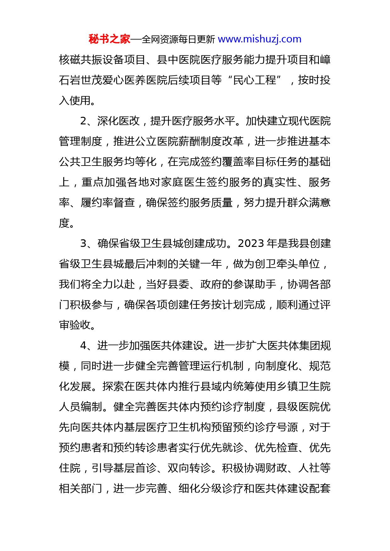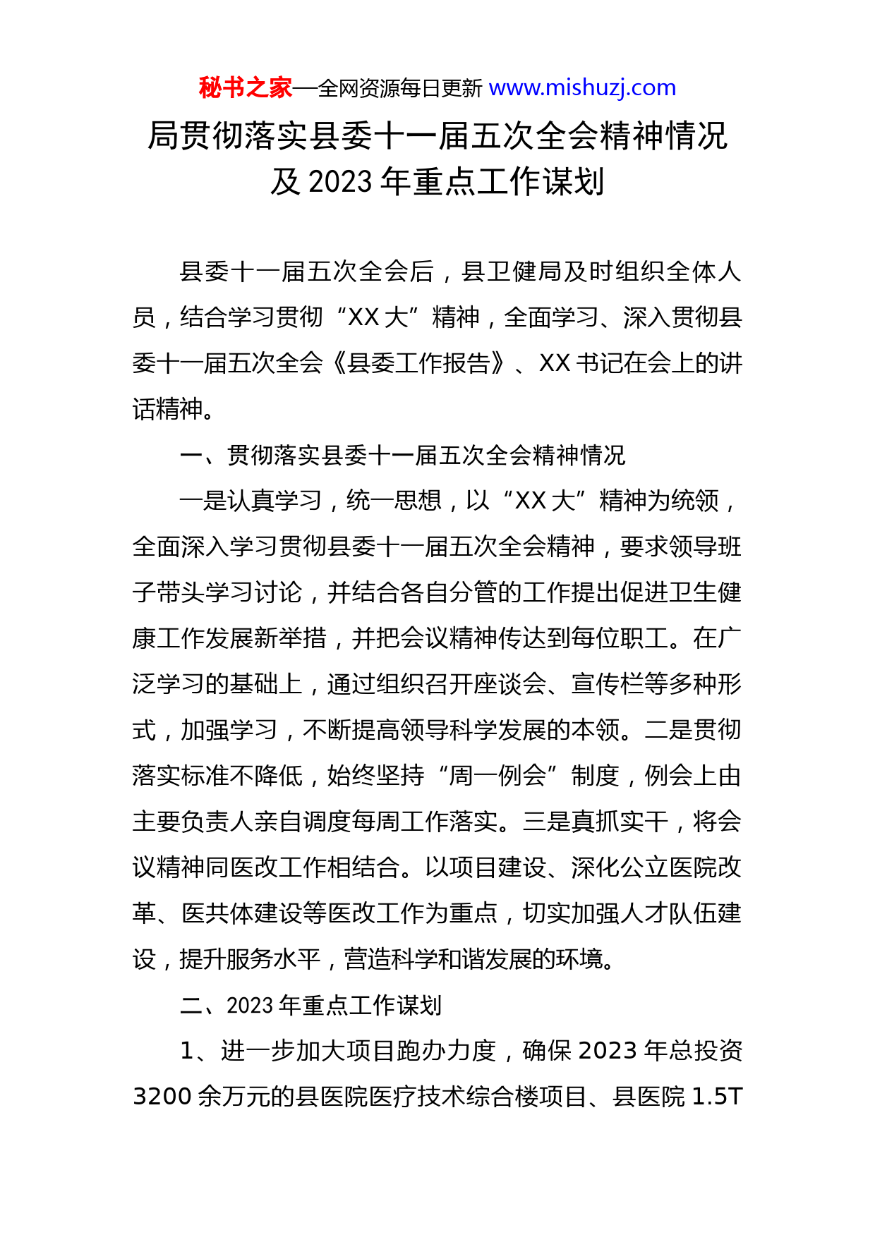 秘书之家—全网资源每日更新www.mishuzj.com局贯彻落实县委十一届五次全会精神情况及2023年重点工作谋划县委十一届五次全会后,县卫健局及时组织全体人员,结合学习贯彻“XX大”精神,全面学习、深入贯彻县委十一届五次全会《县委工作报告》、XX书记在会上的讲话精神。一、贯彻落实县委十一届五次全会精神情况一是认真学习,统一思想,以“XX大”精神为统领,全面深入学习贯彻县委十一届五次全会精神,要求领导班子带头学习讨论,并结合各自分管的工作提出促进卫生健康工作发展新举措,并把会议精神传达到每位职工。在广泛学习的基础上,通过组织召开座谈会、宣传栏等多种形式,加强学习,不断提高领导科学发展的本领。二是贯彻落实标准不降低,始终坚持“周一例会”制度,例会上由主要负责人亲自调度每周工作落实。三是真抓实干,将会议精神同医改工作相结合。以项目建设、深化公立医院改革、医共体建设等医改工作为重点,切实加强人才队伍建设,提升服务水平,营造科学和谐发展的环境。二、2023年重点工作谋划1、进一步加大项目跑办力度,确保2023年总投资3200余万元的县医院医疗技术综合楼项目、县医院1.5T秘书之家—全网资源每日更新www.mishuzj.com核磁共振设备项目、县中医院医疗服务能力提升项目和嶂石岩世茂爱心医养医院后续项目等“民心工程”,按时投入使用。2、深化医改,提升医疗服务水平。加快建立现代医院管理制度,推进公立医院薪酬制度改革,进一步推进基本公共卫生服务均等化,在完成签约覆盖率目标任务的基础上,重点加强各地对家庭医生签约服务的真实性、服务率、履约率督查,确保签约服务质量,努力提升群众满意度。3、确保省级卫生县城创建成功。2023年是我县创建省级卫生县城最后冲刺的关键一年,做为创卫牵头单位,我们将全力以赴,当好县委、政府的参谋助手,协调各部门积极参与,确保各项创建任务按计划完成,顺利通过评审验收。4、进一步加强医共体建设。进一步扩大医共体集团规模,同时进一步健全完善管理运行机制,向制度化、规范化发展。探索在医共体内推行县域内统筹使用乡镇卫生院人员编制。健全完善医共体内预约诊疗制度,县级医院优先向医共体内基层医疗卫生机构预留预约诊疗号源,对于预约患者和预约转诊患者实行优先就诊、优先检查、优先住院,引导基层首诊、双向转诊。积极协调财政、人社等相关部门,进一步完善、细化分级诊疗和医共体建设配套秘书之家—全网资源每日更新www.mishuzj.com政策,增强政策的操作性。5、巩固健康扶贫工作成果。全面落实农村贫困人口免费健康体检和建档立卡工作,为农村贫困人口提供家庭医生签约服务。对无村医的贫困村,切实落实邻村托管或卫生院巡诊、定期义诊等工作,同时严格控制医疗费用自付比例。做实做细家庭医生签约服务,落实大病救治和分类管理。进一步加大健康扶贫政策宣传和培训力度,提高群众的知晓率和政策的执行力。6、强化医疗行为监管,加强执法能力建设。督促医疗机构建立完善常态化的巡查、点评、约谈制度,推动医疗机构落实核心制度、规范医疗行为。巩固“双随机、一公开”工作机制,有效实现事中事后监管。严格依法行政,做好各项监督工作,重点查处医疗市场、公共卫生安全、计生“两非”等领域的违法行为。7、抓好疾病防控,建全卫生应急体系。继续落实重大重点传染病防控工作。加强重大传染病疫情的监测、报告、风险评估和预警,做好突发公共卫生事件的防范和应对工作。8、加强计划生育服务能力提升。大力推行诚信计生,做好村级宣传服务,加强卫计信息系统互联互通,提高统计质量。进一步抓好母婴室建设工作,在搞好已建的母婴室规范管理、改善服务、提档升级的基础上,新建3-5个秘书之家—全网资源每日更新www.mishuzj.com母婴室。积极开展工作创新,提升计生服务满意度。深化流动人口区域协作,落实流动人口服务均等化服务。积极提升计生家庭发展能力,严格兑现奖励扶助政策。9、认真实施妇幼健康三个项目,全面提升妇幼健康服务水平。按照省市要求,通过切实加强项目组织领导,严格项目资金管理,强化项目质量控制,完善项目信息管理,加大项目宣传力度,认真实施贫困地区农村妇女“两癌”检查、儿童营养改善、新生儿疾病筛查三个项目,全面提升妇幼健康服务水平和群众满意度。