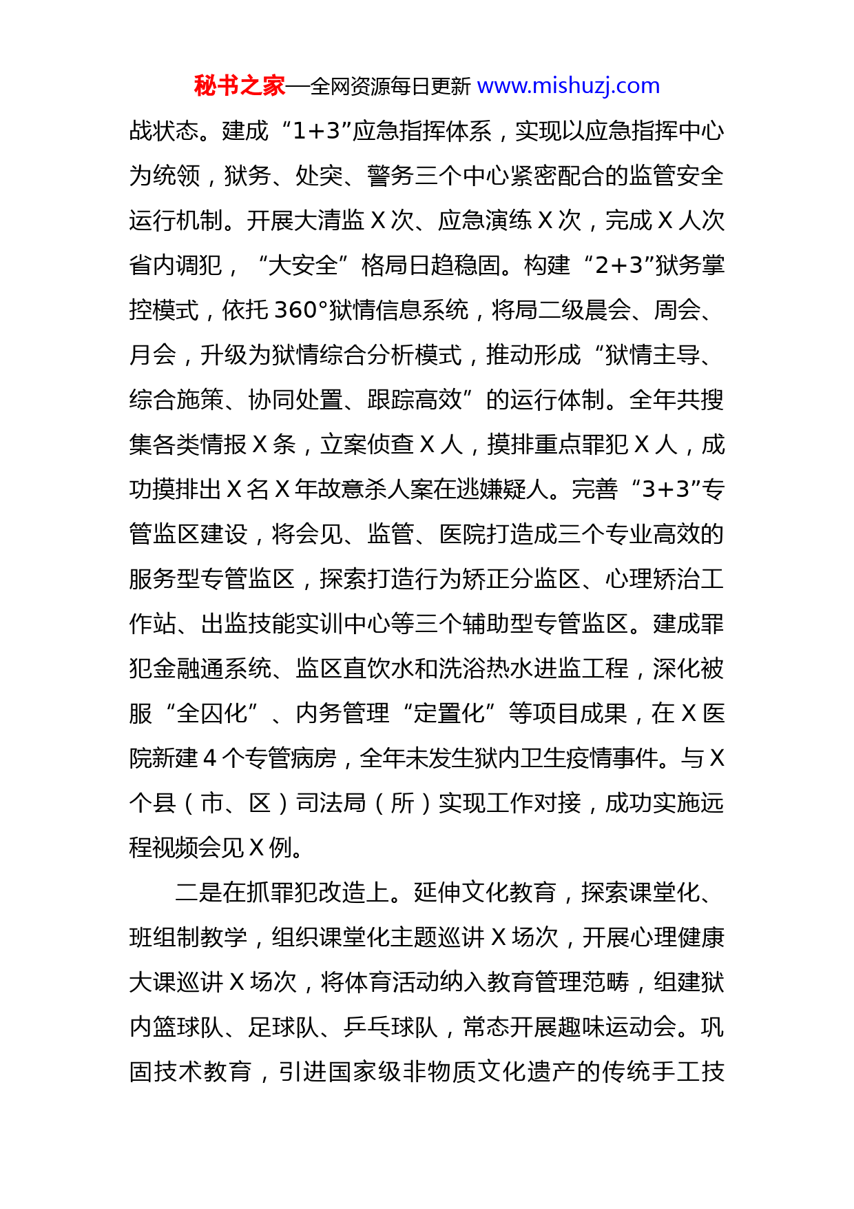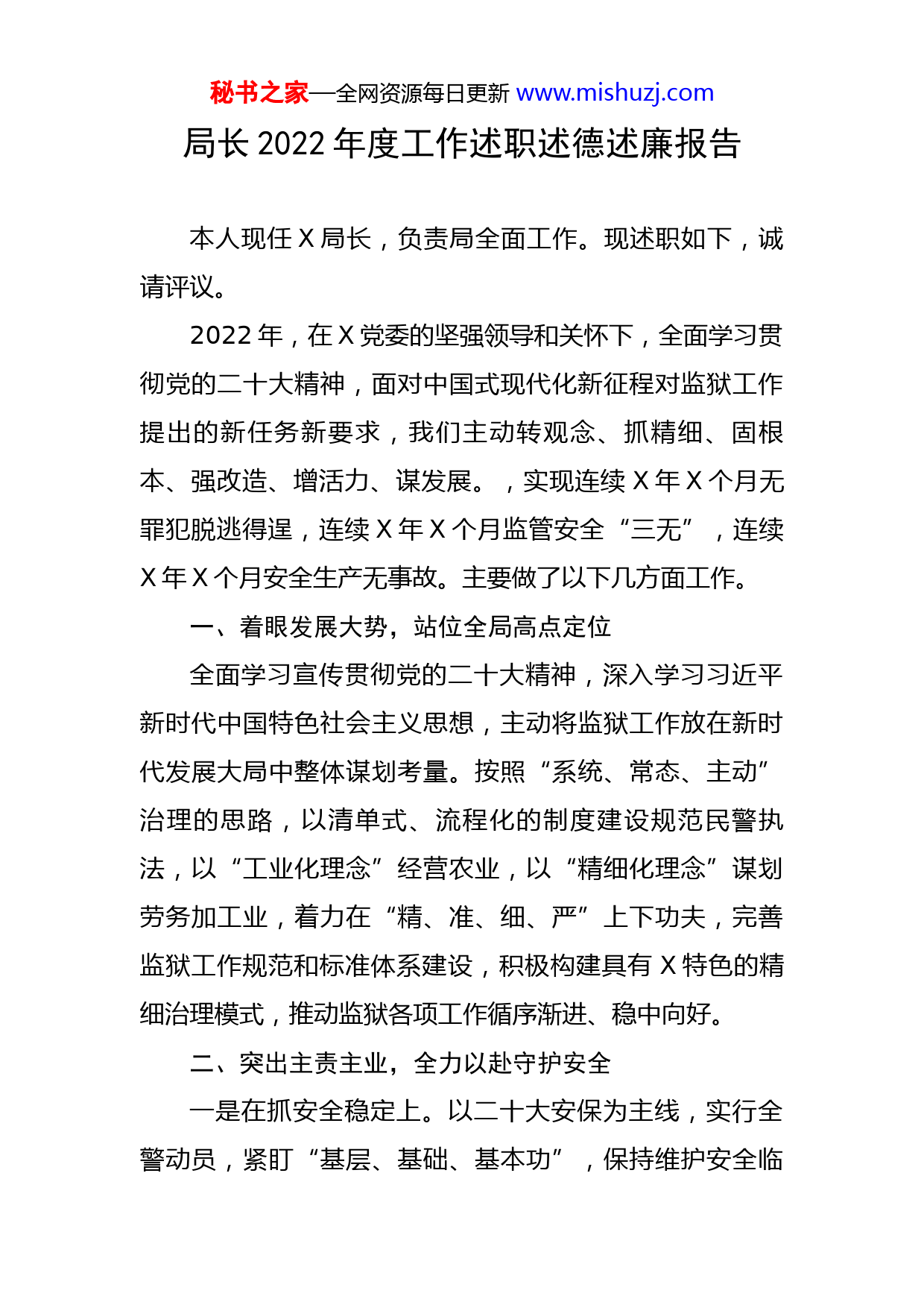 秘书之家—全网资源每日更新www.mishuzj.com局长2022年度工作述职述德述廉报告本人现任X局长,负责局全面工作。现述职如下,诚请评议。2022年,在X党委的坚强领导和关怀下,全面学习贯彻党的二十大精神,面对中国式现代化新征程对监狱工作提出的新任务新要求,我们主动转观念、抓精细、固根本、强改造、增活力、谋发展。,实现连续X年X个月无罪犯脱逃得逞,连续X年X个月监管安全“三无”,连续X年X个月安全生产无事故。主要做了以下几方面工作。一、着眼发展大势,站位全局高点定位全面学习宣传贯彻党的二十大精神,深入学习习近平新时代中国特色社会主义思想,主动将监狱工作放在新时代发展大局中整体谋划考量。按照“系统、常态、主动”治理的思路,以清单式、流程化的制度建设规范民警执法,以“工业化理念”经营农业,以“精细化理念”谋划劳务加工业,着力在“精、准、细、严”上下功夫,完善监狱工作规范和标准体系建设,积极构建具有X特色的精细治理模式,推动监狱各项工作循序渐进、稳中向好。二、突出主责主业,全力以赴守护安全一是在抓安全稳定上。以二十大安保为主线,实行全警动员,紧盯“基层、基础、基本功”,保持维护安全临秘书之家—全网资源每日更新www.mishuzj.com战状态。建成“1+3”应急指挥体系,实现以应急指挥中心为统领,狱务、处突、警务三个中心紧密配合的监管安全运行机制。开展大清监X次、应急演练X次,完成X人次省内调犯,“大安全”格局日趋稳固。构建“2+3”狱务掌控模式,依托360°狱情信息系统,将局二级晨会、周会、月会,升级为狱情综合分析模式,推动形成“狱情主导、综合施策、协同处置、跟踪高效”的运行体制。全年共搜集各类情报X条,立案侦查X人,摸排重点罪犯X人,成功摸排出X名X年故意杀人案在逃嫌疑人。完善“3+3”专管监区建设,将会见、监管、医院打造成三个专业高效的服务型专管监区,探索打造行为矫正分监区、心理矫治工作站、出监技能实训中心等三个辅助型专管监区。建成罪犯金融通系统、监区直饮水和洗浴热水进监工程,深化被服“全囚化”、内务管理“定置化”等项目成果,在X医院新建4个专管病房,全年未发生狱内卫生疫情事件。与X个县(市、区)司法局(所)实现工作对接,成功实施远程视频会见X例。二是在抓罪犯改造上。延伸文化教育,探索课堂化、班组制教学,组织课堂化主题巡讲X场次,开展心理健康大课巡讲X场次,将体育活动纳入教育管理范畴,组建狱内篮球队、足球队、乒乓球队,常态开展趣味运动会。巩固技术教育,引进国家级非物质文化遗产的传统手工技秘书之家—全网资源每日更新www.mishuzj.com艺,开办X挑花培训班,试点开办现代农业技术教学班。拓展社会帮教,与地方司法局联合开展进监帮教,成功开展送法、送戏、送文艺进监、罪犯亲属进监等活动,开展融冰行动、特别阳光行动等,走访慰问并协调解决罪犯家庭困难,促进罪犯安心改造。深化心理健康教育,实行顽危犯项目化矫治班制度,深入摸排和攻坚矛盾调处,全年成功调处狱内矛盾X起,调处成功率达X%。三是在抓经济发展上。坚持稳中求进,把提高绿色优质农产品供给放在突出位置,积极打造“富硒米”、“虾稻米”、“优质黑猪”等高附加值品牌,建成虾稻混合种养基地、有机蔬菜和体验农业基地,推广绿肥作物种植和植树造林,实现农业经济效益、生态效益和社会效益全面提升。立足正确处理好生产与改造的关系,坚持劳务加工“有所为、有所不为”,投入X万元加快装备升级和“机器换人”,建成公司技术中心和劳务加工信息管理系统,探索建立符合改革方向、适应政策要求的企业考核激励机制,劳务加工月人均创收水平位居X第2,资金回笼率X﹪,努力由延时增效向管理创新和技术创新增效转变。投入X万元实施危房改造,启用X中心,建成X馆、X公园、X馆和X条主干道路,民生焦点问题逐步得到妥善解决,监狱经济在服务监狱安全稳定和区域和谐稳定中的作用充分显现。秘书之家—全网资源每日更新www.mishuzj.com三、紧抓第一责任,从严从实抓好党建有力有序有效推进基层党组织标准化建设工作,建成X个标准化党员活动室,完成首批X个党委和X个党支部基层党组织标准化建设,理顺了X名党员的组织关系,完成X个直属党组织和X个下设党支部的换届选举工作。按照党的二十大要求,把党的政治建设纳入基层党建总体布局,严格政治纪律和政治规矩,召开警示教育专题会,推进党史学习教育常态化制度化。严格抓好X巡察反馈意见的整改落实,联合驻监检察院开展刑罚执行、招投标及大宗物资采购等领域的专项检查,实施内部首轮巡察,完成对局属X个基层党组织巡察工作。坚持教育和惩处并重,抓早抓小、防微杜渐,全年立案查处并给予纪律处分X人。四、带头做好表率,着力锻造过硬队伍带头讲学习讲政治,认真贯彻厅局党委各项决策部署,组织召开局党委中心组理论学习扩大会X次,带头学习宣讲党的二十大精神和习近平新时代中国特色社会主义思想。带头讲民主讲团结,坚持贯彻民主集中制,正确处理集体领导和党委分工负责、自身与班子成员之间的关系,对事关监狱改革发展稳定的重大问题、重要事项坚持集体讨论决定,及时指导和推动工作中各类问题和困难的解决,切实发挥好党委把方向、谋大局、定政策、促改革秘书