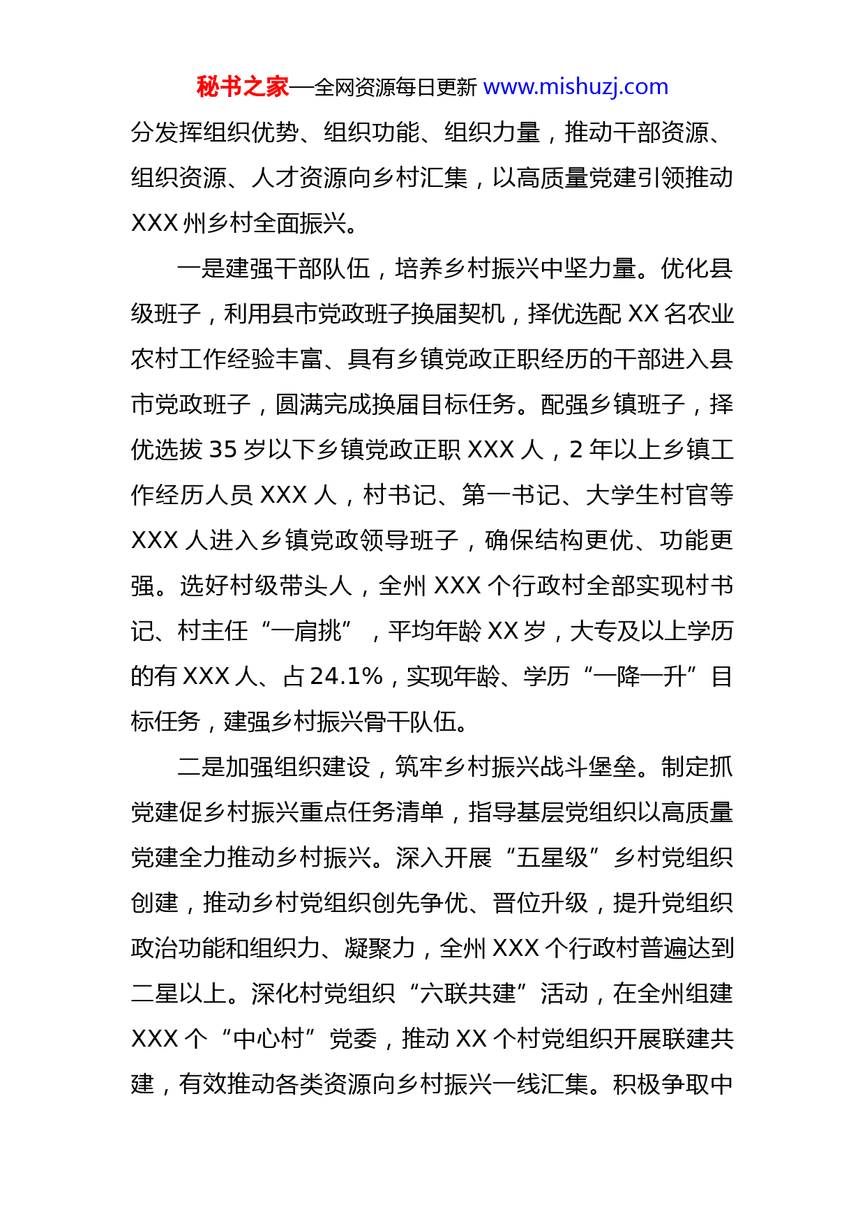 秘书之家—全网资源每日更新www.mishuzj.com州2022年党建工作报告作为边疆民族地区,XX州(以下简称“XXX州”)是对外开发开放的桥头堡,也是守边固防的第一线。2022年,XXX州突出党建引领,聚焦鲜明的地域特点和民族特色,在XXX实行军民共建、联守联防的工作模式,成为全国军民联防的典型。随着国内外形势的变化和XXX州稳定发展的需要,州委不断丰富品牌内涵,积极探索开展军警地“同心筑堡垒”“国门党建一体化”“局企军(警)林村”党建共建和“边境党建示范带”等系列载体活动,逐步形成具有XXX特色的“边陲党旗红”党建品牌。2022年,XXX州着力构建抓党建促乡村振兴、促基层治理、促兴边富民、促两新组织发展、促民族团结、促疫情防控等“一抓六促”党建工作格局,按照“一年夯实基础、两年深化提升、2022年整体见效”3个阶段持续推进,让老品牌焕发新活力,进一步筑牢党在边疆民族地区的执政根基,为边境地区经济发展、民族团结、社会和谐、边疆稳定提供坚强的组织保障,以实际行动迎接建州XX周年大庆和党的二十大胜利召开。一、党旗映红乡村振兴路民族要复兴,乡村必振兴。XXX州组织系统大力弘扬脱贫攻坚精神,坚决扛起抓党建促乡村振兴政治责任,充秘书之家—全网资源每日更新www.mishuzj.com分发挥组织优势、组织功能、组织力量,推动干部资源、组织资源、人才资源向乡村汇集,以高质量党建引领推动XXX州乡村全面振兴。一是建强干部队伍,培养乡村振兴中坚力量。优化县级班子,利用县市党政班子换届契机,择优选配XX名农业农村工作经验丰富、具有乡镇党政正职经历的干部进入县市党政班子,圆满完成换届目标任务。配强乡镇班子,择优选拔35岁以下乡镇党政正职XXX人,2年以上乡镇工作经历人员XXX人,村书记、第一书记、大学生村官等XXX人进入乡镇党政领导班子,确保结构更优、功能更强。选好村级带头人,全州XXX个行政村全部实现村书记、村主任“一肩挑”,平均年龄XX岁,大专及以上学历的有XXX人、占24.1%,实现年龄、学历“一降一升”目标任务,建强乡村振兴骨干队伍。二是加强组织建设,筑牢乡村振兴战斗堡垒。制定抓党建促乡村振兴重点任务清单,指导基层党组织以高质量党建全力推动乡村振兴。深入开展“五星级”乡村党组织创建,推动乡村党组织创先争优、晋位升级,提升党组织政治功能和组织力、凝聚力,全州XXX个行政村普遍达到二星以上。深化村党组织“六联共建”活动,在全州组建XXX个“中心村”党委,推动XX个村党组织开展联建共建,有效推动各类资源向乡村振兴一线汇集。积极争取中秘书之家—全网资源每日更新www.mishuzj.com央扶持资金XX亿元,重点支持XXX个党支部领办合作社村和联建共建村发展集体经济项目,推荐XXX个行政村作为2022年党支部领办合作社省级示范村,推动村级集体经济提质增效。三是下沉工作力量,充实乡村振兴一线队伍。州级领导以上率下,带头深入联系点调研指导,示范带动各级干部落实乡村振兴工作责任。协调XX个中省直部门、XXX个州直部门、XXX个县市直部门,共选派XXX名驻村干部,实现XXX个脱贫村、乡村振兴重点村、重点边境村等实行“全覆盖”包保帮扶,“XXX州创新党建引领驻村工作”被省考核评估组评为2022年度典型经验做法,省办公厅发文全国推广。研究制定乡村振兴包保帮扶工作成效考评办法,抽调XX名业务骨干组建乡村振兴调研指导组,指导县(市)充分发挥驻村干部党委功能作用,督促驻村干部认真履职尽责。四是强化人才集聚,加强乡村振兴智力支撑。大力开展“引进优秀大学毕业生计划”,持续实施“招才引智”工程,创新实施“千名大学生进千村行动”,以人才服务乡村振兴为重点,利用5年时间实现全州行政村大学生“全覆盖”。实施乡村振兴人才孵化基地建设,在全州XX个乡镇建立乡村振兴人才孵化中心,建立村级乡村振兴人才孵化站,将人才孵化与发展党员、培养村级后备力量统秘书之家—全网资源每日更新www.mishuzj.com筹推进。实施农科生“订单式”培养和“基层学历提升计划”,利用政策倾斜优势,从源头上留住本乡本土大学生,积极推荐优秀本土人才赴省内高校开展学历教育。二、党旗飘扬战疫最前沿新冠肺炎疫情发生以来,XXX州组织系统坚持人民至上、生命至上,将常态化疫情防控作为重要课题,探索建立“平战结合、一键转换”工作机制,将党的组织优势转化为源源不断的制胜力量,为打赢全州疫情防控人民战争、总体战、阻击战提供了坚强组织保障,让党旗在疫情防控一线高高飘扬。一是平时构建防控责任体系,战时包保领导迅速转换为“战场指挥”。制定《全州组织系统疫情防控工作应急预案》,分区分类明确属地责任和相应管控措施。逐级建立领导干部包保责任制,将常态化疫情防控作为各级领导班子考核和干部考察的重要内容,强化守土有责、守土尽责的政治自觉和行动自觉。今年3月疫情发生后,州委组织部第一时间启动应急预案,主动选派X位副部长分别担任社区管控、核酸检测、隔离管控、环境消杀、督导检查X个州级工作专班副组长,承上启下做好社区管控、核酸检测、重点人群隔离转运接收和环境消杀综合协调等工作。XXX名州、县、乡三级领导干部层层落实包保责任,深入一线靠前指挥,全秘书之家—全网资源每日更新www.mishuzj.com力遏制疫情扩散蔓延。