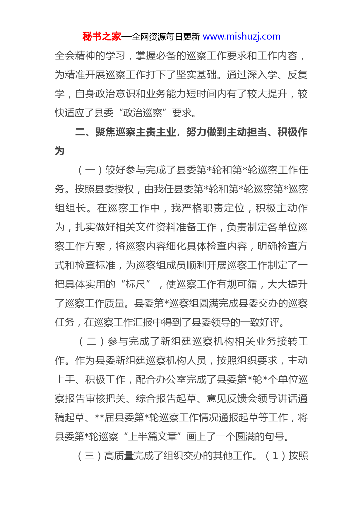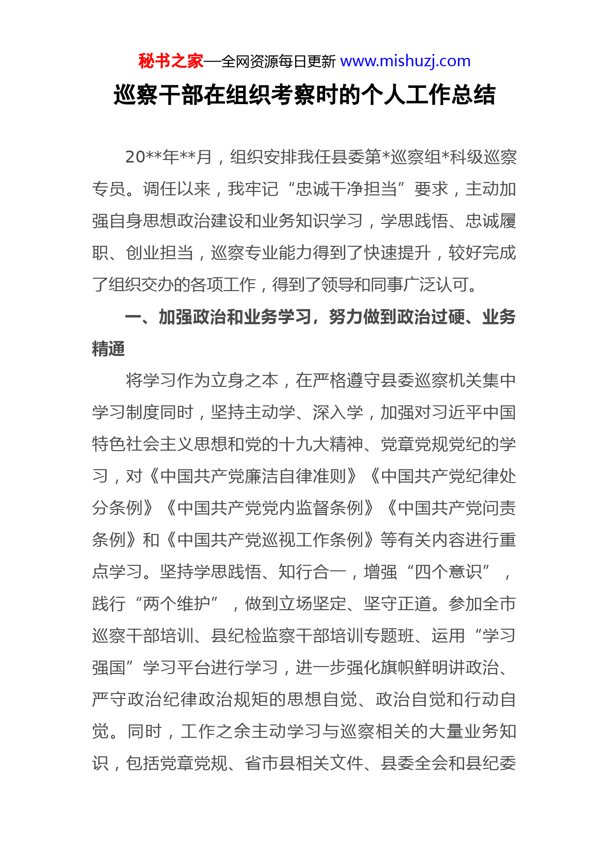 秘书之家—全网资源每日更新www.mishuzj.com巡察干部在组织考察时的个人工作总结20年月,组织安排我任县委第巡察组科级巡察专员。调任以来,我牢记“忠诚干净担当”要求,主动加强自身思想政治建设和业务知识学习,学思践悟、忠诚履职、创业担当,巡察专业能力得到了快速提升,较好完成了组织交办的各项工作,得到了领导和同事广泛认可。一、加强政治和业务学习,努力做到政治过硬、业务精通将学习作为立身之本,在严格遵守县委巡察机关集中学习制度同时,坚持主动学、深入学,加强对习近平中国特色社会主义思想和党的十九大精神、党章党规党纪的学习,对《中国共产党廉洁自律准则》《中国共产党纪律处分条例》《中国共产党党内监督条例》《中国共产党问责条例》和《中国共产党巡视工作条例》等有关内容进行重点学习。坚持学思践悟、知行合一,增强“四个意识”,践行“两个维护”,做到立场坚定、坚守正道。参加全市巡察干部培训、县纪检监察干部培训专题班、运用“学习强国”学习平台进行学习,进一步强化旗帜鲜明讲政治、严守政治纪律政治规矩的思想自觉、政治自觉和行动自觉。同时,工作之余主动学习与巡察相关的大量业务知识,包括党章党规、省市县相关文件、县委全会和县纪委秘书之家—全网资源每日更新www.mishuzj.com全会精神的学习,掌握必备的巡察工作要求和工作内容,为精准开展巡察工作打下了坚实基础。通过深入学、反复学,自身政治意识和业务能力短时间内有了较大提升,较快适应了县委“政治巡察”要求。二、聚焦巡察主责主业,努力做到主动担当、积极作为(一)较好参与完成了县委第轮和第轮巡察工作任务。按照县委授权,由我任县委第轮和第轮巡察第巡察组组长。在巡察工作中,我严格职责定位,积极主动作为,扎实做好相关文件资料准备工作,负责制定各单位巡察工作方案,将巡察内容细化具体检查内容,明确检查方式和检查标准,为巡察组成员顺利开展巡察工作制定了一把具体实用的“标尺”,使巡察工作有规可循,大大提升了巡察工作质量。县委第巡察组圆满完成县委交办的巡察任务,在巡察工作汇报中得到了县委领导的一致好评。(二)参与完成了新组建巡察机构相关业务接转工作。作为县委新组建巡察机构人员,按照组织要求,主动上手、积极工作,配合办公室完成了县委第轮个单位巡察报告审核把关、综合报告起草、意见反馈会领导讲话通稿起草、届县委第轮巡察工作情况通报起草等工作,将县委第轮巡察“上半篇文章”画上了一个圆满的句号。(三)高质量完成了组织交办的其他工作。(1)按照秘书之家—全网资源每日更新www.mishuzj.com履行全面从严治党主体责任要求,完成了县委巡察办党支部《关于履行全面从严治党主体责任和意识形态工作开展情况的汇报》。协助办公室对上半年工作情况进行了梳理汇总,完成了向县委的《关于巡察工作开展情况的汇报》。(2)按照县纪委统一安排,作为第检查组成员,严格履职、主动担当,较好完成了为期个月的“关于贯彻中央八项规定精神及纠正四风问题”专项检查工作。三、不断加强自身廉政建设,努力做到干净干事、不辱落实“打铁还需自身硬”要求,坚持把纪律挺在前面,深化对纪律和作风建设各项制度的学习,观看全市、全县政治性警示教育宣传片,加强对纪律和规矩的敬畏之心。在开展“”行动中,主动将自身摆进去,通过参加专题民主生活会,进行“一句话承诺”等,进一步强化了作为巡察干部的政治担当、坚守党性原则、敢于较真碰硬意识,增强了履行好县委赋予的职责的信心和决心。此外,在工作中,牢固树立程序意识、标准意识,严格按程序、按制度、按标准办事;牢固树立底线思维,保持定力、守牢底线,清清白白做人、干干净净做事,忠诚坚定、担当尽责、遵规守纪、清正廉洁,努力做让党放心的县委巡察干部。在总结成绩的同时,认真反思了自身存在的不足,主秘书之家—全网资源每日更新www.mishuzj.com要是:一是从事巡察工作较短,缺乏实践工作的历练;二是需要学习的业务知识还很多,需要合理把握工学关系,更好的适应组织需要。