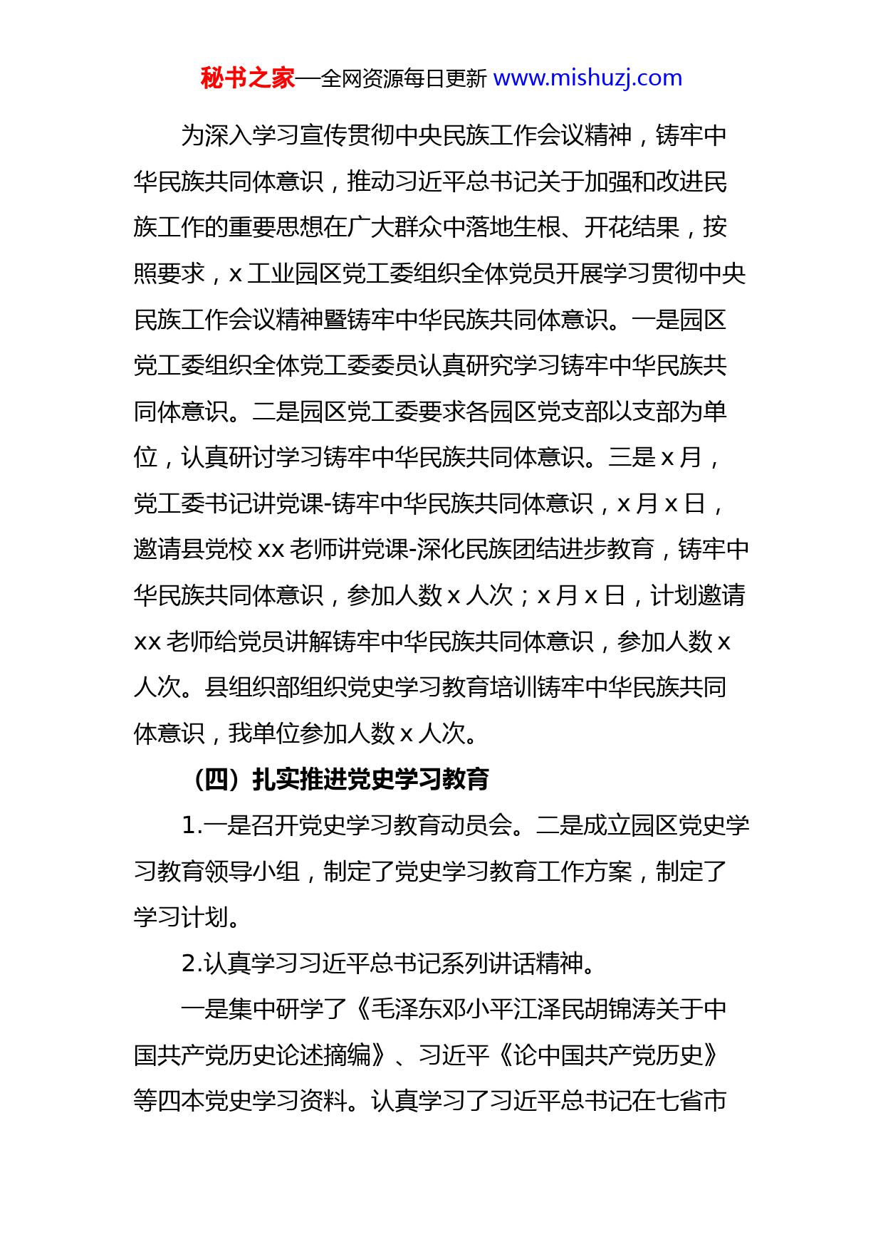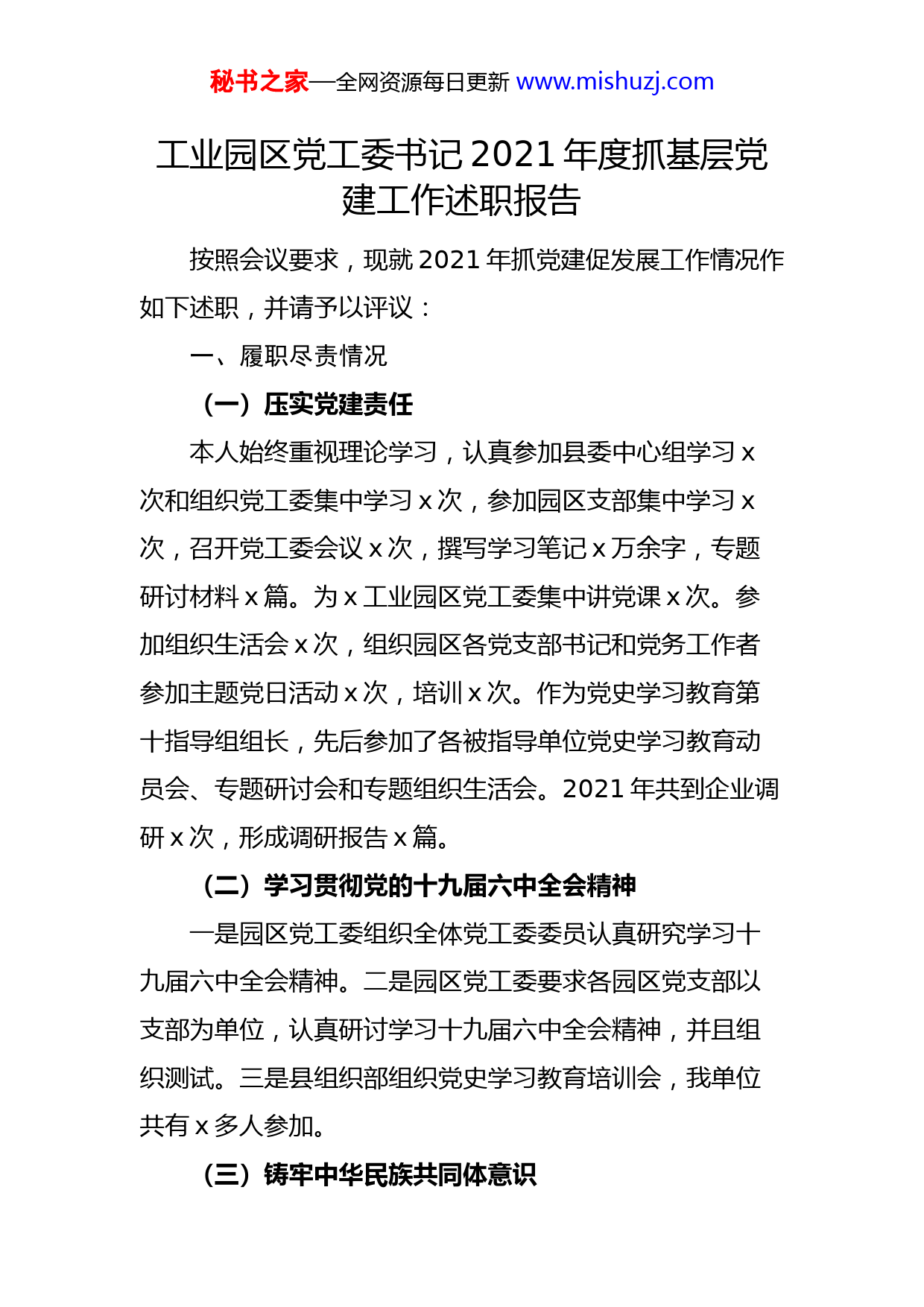 秘书之家—全网资源每日更新www.mishuzj.com工业园区党工委书记2021年度抓基层党建工作述职报告按照会议要求,现就2021年抓党建促发展工作情况作如下述职,并请予以评议:一、履职尽责情况(一)压实党建责任本人始终重视理论学习,认真参加县委中心组学习x次和组织党工委集中学习x次,参加园区支部集中学习x次,召开党工委会议x次,撰写学习笔记x万余字,专题研讨材料x篇。为x工业园区党工委集中讲党课x次。参加组织生活会x次,组织园区各党支部书记和党务工作者参加主题党日活动x次,培训x次。作为党史学习教育第十指导组组长,先后参加了各被指导单位党史学习教育动员会、专题研讨会和专题组织生活会。2021年共到企业调研x次,形成调研报告x篇。(二)学习贯彻党的十九届六中全会精神一是园区党工委组织全体党工委委员认真研究学习十九届六中全会精神。二是园区党工委要求各园区党支部以支部为单位,认真研讨学习十九届六中全会精神,并且组织测试。三是县组织部组织党史学习教育培训会,我单位共有x多人参加。(三)铸牢中华民族共同体意识秘书之家—全网资源每日更新www.mishuzj.com为深入学习宣传贯彻中央民族工作会议精神,铸牢中华民族共同体意识,推动习近平总书记关于加强和改进民族工作的重要思想在广大群众中落地生根、开花结果,按照要求,x工业园区党工委组织全体党员开展学习贯彻中央民族工作会议精神暨铸牢中华民族共同体意识。一是园区党工委组织全体党工委委员认真研究学习铸牢中华民族共同体意识。二是园区党工委要求各园区党支部以支部为单位,认真研讨学习铸牢中华民族共同体意识。三是x月,党工委书记讲党课-铸牢中华民族共同体意识,x月x日,邀请县党校xx老师讲党课-深化民族团结进步教育,铸牢中华民族共同体意识,参加人数x人次;x月x日,计划邀请xx老师给党员讲解铸牢中华民族共同体意识,参加人数x人次。县组织部组织党史学习教育培训铸牢中华民族共同体意识,我单位参加人数x人次。(四)扎实推进党史学习教育1.一是召开党史学习教育动员会。二是成立园区党史学习教育领导小组,制定了党史学习教育工作方案,制定了学习计划。2.认真学习习近平总书记系列讲话精神。一是集中研学了《毛泽东邓小平江泽民胡锦涛关于中国共产党历史论述摘编》、习近平《论中国共产党历史》等四本党史学习资料。认真学习了习近平总书记在七省市秘书之家—全网资源每日更新www.mishuzj.com考察时的重要讲话精神,认真落实习近平总书记关于内蒙古工作的重要讲话重要批示指示;认真学习和落实了《中国共产党组织工作条例》和《中国共产党统一战线工作条例》3.结合党的发展历史和园区发展实际,组织园区机关党员干部参加集中讲授党课x次。其中园区党工委书记讲党课x次,支部书记讲党课x次,邀请县党校高级教师讲党课x次。召开了x次专题研讨会,x月末,工业园区党工委组织x多名党员就近参观了“黄河水利文化博物馆”、“河套文化博物院”等爱国主义教育基地,感受革命先辈的崇高理想信念,接受传统教育的深刻洗礼。园区党工委先后组织党员观看了《长津湖》和《悬崖之上》两部爱国电影。举办了“学党史、知党恩、跟党走”党史知识竞赛,x个企业基层党组织和单位代表队、x名党员、入党积极分子参加了竞赛。4.践行教育成果,主动为民服务。“党旗在基层一线高高飘扬”,为了切实开展“我为群众办实事”实践活动,工业园区党工委结合实际及时制定“我为群众办实事”实践活动方案,制定“四个计划”、“四个清单”,确保活动有效开展。二是通过开门纳谏深入基层调研查找问题,通过“三服务、三提升”活动为泰顺兴业食品公司完成技改搬迁,投资x万元;协助完成华润电厂铁路专用线建设,秘书之家—全网资源每日更新www.mishuzj.com扩大了电厂用煤采购范围,降低了发电成本,投资x万元,年用储量x万吨;帮助圣牧乳业投资x多万元,解决技改生产线电力供给线路建设,华润金牛电厂热网接入专线。三是立足岗位作贡献,工业园区班子成员根据分管工作,每人完成了x篇高质量的调研报告,积极为园区发展献言献策。四是开展为民分忧解难题活动,投资x多元清理陈年垃圾一处;投资x元为和平社区改造了自来水设备。五是访贫慰问献爱心。园区党支部会同党工委慰问园区企业贫困党员x名,每人给予慰问金x元。园区党员干部职工自愿集资x多元,慰问单位一名患病老党员,让贫困党员切身感受到党组织的关心关怀。集资x多元慰问贫困群众;六是促进“党建”带“关建”工作成效,园区党支部与圣牧控股公司联合开展了“微心愿”活动,为县三完小x名贫困学生赠送了x元的学习用品。为包尔盖农场x名中小学生送名著,激励孩子们好好学习,爱党爱国。5.园区各企业党支部都召开了党史学习教育启动会,认真组织广大党员庆祝中国共产党成立100年活动,通过观看观看直播,就近参观红色经典和给每个党员过政治生日,以及帮助广大员工和居民解决实际问题,积极开展党史学习教育。圣牧奶业公司党支部通过“困难员工帮扶慰问”、开展“礼赞百周年,巾帼绽芳华”、“生日礼金、婚礼祝贺”、“员工成长关爱”等活动解决员工在工作、生活以秘书之家—全网资源每日更新www.mishuzj.com及成长上存在的问题;中涵水务公司党支部