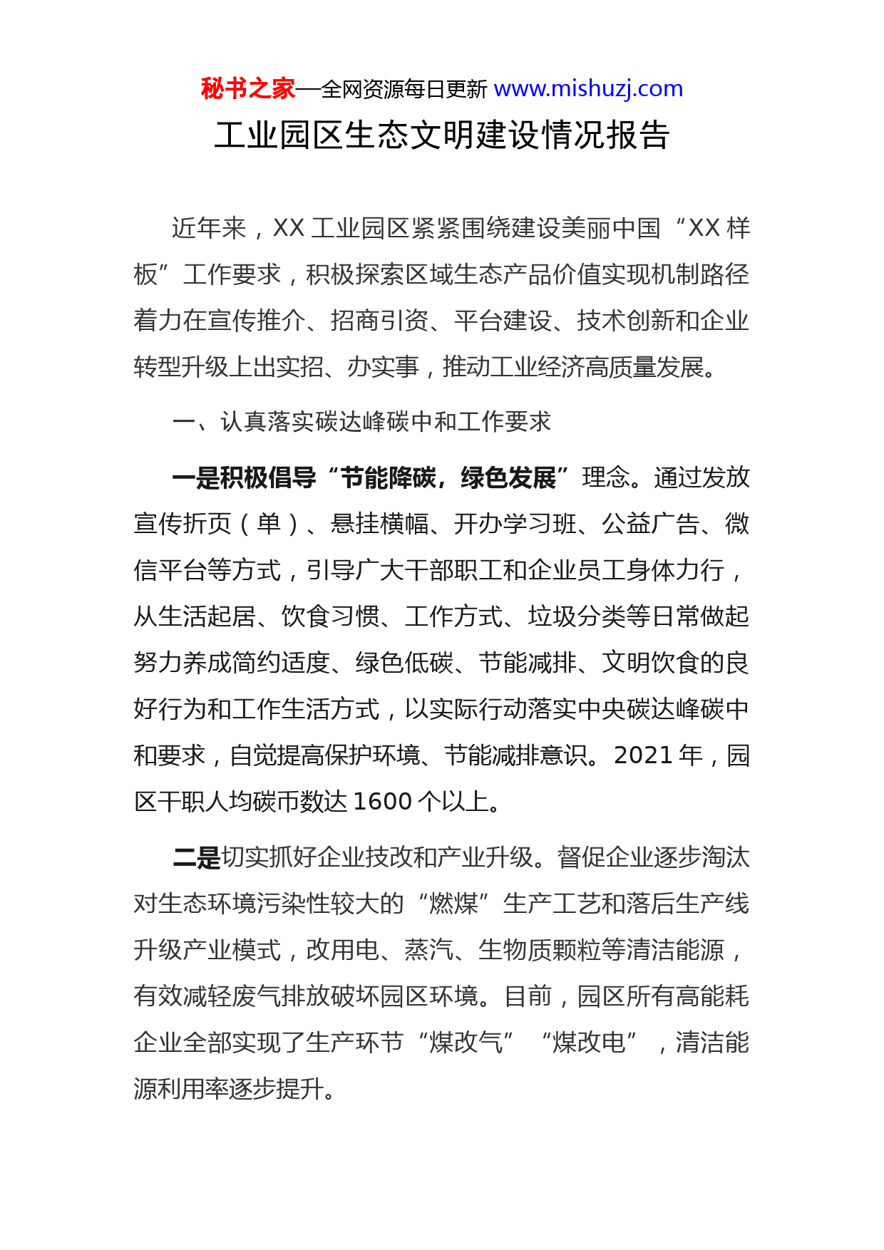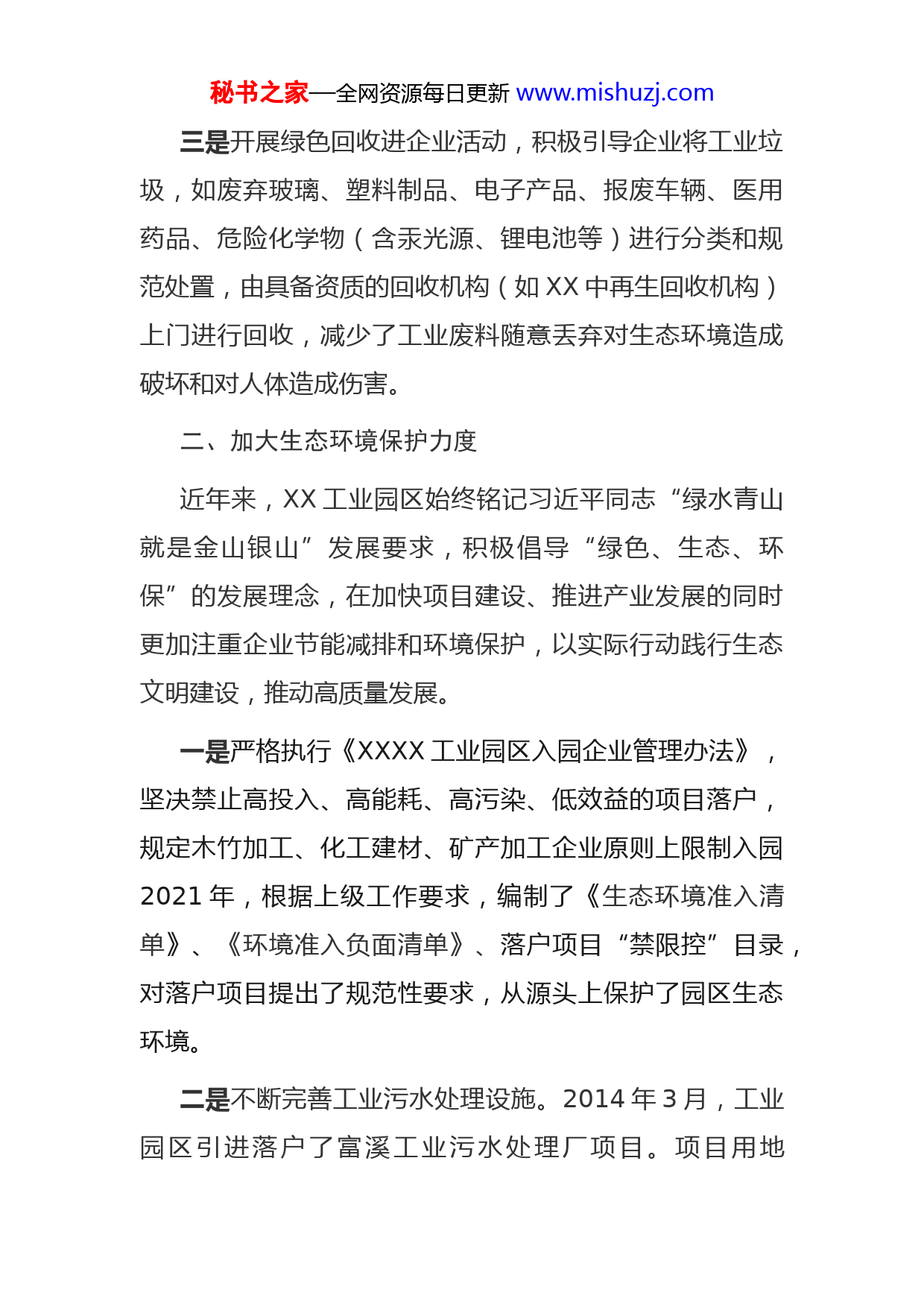 秘书之家—全网资源每日更新www.mishuzj.com工业园区生态文明建设情况报告近年来,XX工业园区紧紧围绕建设美丽中国“XX样板”工作要求,积极探索区域生态产品价值实现机制路径着力在宣传推介、招商引资、平台建设、技术创新和企业转型升级上出实招、办实事,推动工业经济高质量发展。一、认真落实碳达峰碳中和工作要求一是积极倡导“节能降碳,绿色发展”理念。通过发放宣传折页(单)、悬挂横幅、开办学习班、公益广告、微信平台等方式,引导广大干部职工和企业员工身体力行,从生活起居、饮食习惯、工作方式、垃圾分类等日常做起努力养成简约适度、绿色低碳、节能减排、文明饮食的良好行为和工作生活方式,以实际行动落实中央碳达峰碳中和要求,自觉提高保护环境、节能减排意识。2021年,园区干职人均碳币数达1600个以上。二是切实抓好企业技改和产业升级。督促企业逐步淘汰对生态环境污染性较大的“燃煤”生产工艺和落后生产线升级产业模式,改用电、蒸汽、生物质颗粒等清洁能源,有效减轻废气排放破坏园区环境。目前,园区所有高能耗企业全部实现了生产环节“煤改气”“煤改电”,清洁能源利用率逐步提升。秘书之家—全网资源每日更新www.mishuzj.com三是开展绿色回收进企业活动,积极引导企业将工业垃圾,如废弃玻璃、塑料制品、电子产品、报废车辆、医用药品、危险化学物(含汞光源、锂电池等)进行分类和规范处置,由具备资质的回收机构(如XX中再生回收机构)上门进行回收,减少了工业废料随意丢弃对生态环境造成破坏和对人体造成伤害。二、加大生态环境保护力度近年来,XX工业园区始终铭记习近平同志“绿水青山就是金山银山”发展要求,积极倡导“绿色、生态、环保”的发展理念,在加快项目建设、推进产业发展的同时更加注重企业节能减排和环境保护,以实际行动践行生态文明建设,推动高质量发展。一是严格执行《XXXX工业园区入园企业管理办法》,坚决禁止高投入、高能耗、高污染、低效益的项目落户,规定木竹加工、化工建材、矿产加工企业原则上限制入园2021年,根据上级工作要求,编制了《生态环境准入清单》、《环境准入负面清单》、落户项目“禁限控”目录,对落户项目提出了规范性要求,从源头上保护了园区生态环境。二是不断完善工业污水处理设施。2014年3月,工业园区引进落户了富溪工业污水处理厂项目。项目用地秘书之家—全网资源每日更新www.mishuzj.com20000平方米,总投资4680万元,由中节能环保投资发展(XX)有限公司按BOT模式投资建设于2014年10月开工建设,2015年12月全面建成,主要收集富溪工业园和黄金工业园企业排放的工业污水和生活污水。经污水处理厂收集处理后,水质标准达到了《城镇污水处理厂污染物排放标准》(GB18918-2002)中一级B标准。2021年7月,按照现行污水处理规范和排放要求,富溪工业污水处理厂对污水处理设施进行了提标改造,进一步提升了污水处理能力。同时,工业园区不断完善污水管网(管道)建设,建成了四纵四横的雨污管网(管道)。2021年,新建雨污管网(管道)1000余米,累计建成雨污管网(管道)总长57200米,增强了雨污收集能力,减少了工业污水对园区环境的污染,改善了园区营商环境,提升了园区品位。三是强化企业雨污分流、纳管排污。为实现园区企业污水统一、集中、安全排放,工业园区在完成主管网建设的同时,指导符合接管条件的90余家企业进行管道工艺处理,全部进行纳管(企业出厂管道与园区主体管网连接)。企业产生的污水,经过企业预处理后,统一纳入污水管网进入污水处理厂进行集中处理,达标排放。秘书之家—全网资源每日更新www.mishuzj.com四是加强日常监管。为有效遏制企业偷排漏排,园区督促几家用水量较大的企业在污水处理厂建设的同期,安装了在线监控。为有效遏制企业乱堆乱放和偷排漏排,园区认真落实企业“门前三包”,督促企业强化自身管理,定期整治厂区周边环境卫生。同时,聘请了环保管家进行日常巡查,强化对企业排污情况的监督。这些有力的举措,从根本上减少了企业污染物排放,保护了园区生态环境。五是强化问题导向,认真做好环保问题整改落实。针对群众反映强烈污染环境问题以及中巡、省巡环保督查检查发现的环保问题,切实担负起整改落实主体责任,对反馈的意见逐条列出了问题清单、整改措施、完成时间和具体负责人,逐个问题加以解决。今年以来,先后完成了对石界村小溪边雨水排水口COD浓度超标及异味问题、铭安铝业工业废气未处理排放问题、水泥预制品厂企业生产无环评手续等问题的整改落实。三、不断发展绿色生态产业近年来,XX工业园区在推进工业化进程中,坚持以绿色发展为引领,把生态建园、环境立园摆在首要位置,不断优化产业结构,充分利用县域丰厚的XX蜜桔等生态资源优势,大力发展绿色产业,制定了《以蜜桔深加工为主的食品产业发展规划(2018-2025年)》,并将食品产业确秘书之家—全网资源每日更新www.mishuzj.com定为我县主导产业,在招商引资中实行择优选商和产业链招商,着力引进符合我县产业发展规划的食品精深加工项目。先后引进落户了华夏五千年生态酒庄、桔都酒业、桔花香食品、聚福堂(樱桃李加工)、逸春风健康产业园、吉品饮料、桔娃食品、全家福食品、九爱食品、鼓山老酒莱檬生物、纳佐觅等