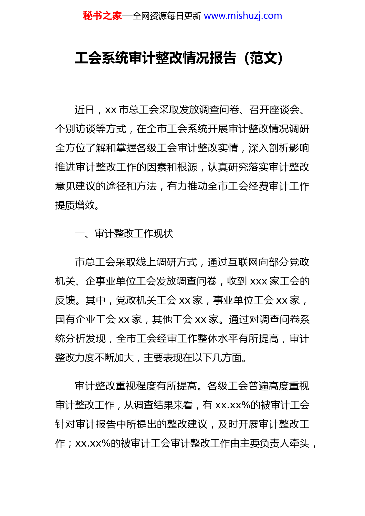 秘书之家—全网资源每日更新www.mishuzj.com工会系统审计整改情况报告(范文)近日,xx市总工会采取发放调查问卷、召开座谈会、个别访谈等方式,在全市工会系统开展审计整改情况调研全方位了解和掌握各级工会审计整改实情,深入剖析影响推进审计整改工作的因素和根源,认真研究落实审计整改意见建议的途径和方法,有力推动全市工会经费审计工作提质增效。一、审计整改工作现状市总工会采取线上调研方式,通过互联网向部分党政机关、企事业单位工会发放调查问卷,收到xxx家工会的反馈。其中,党政机关工会xx家,事业单位工会xx家,国有企业工会xx家,其他工会xx家。通过对调查问卷系统分析发现,全市工会经审工作整体水平有所提高,审计整改力度不断加大,主要表现在以下几方面。审计整改重视程度有所提高。各级工会普遍高度重视审计整改工作,从调查结果来看,有xx.xx%的被审计工会针对审计报告中所提出的整改建议,及时开展审计整改工作;xx.xx%的被审计工会审计整改工作由主要负责人牵头,秘书之家—全网资源每日更新www.mishuzj.com统筹协调各部门开展疑难问题整改;xx.xx%的工会经审部门坚持将审计报告和整改报告在上报上级主管部门的同时报送本单位同级党组或主要负责人制度。审计整改执行力有所加强。调研发现,有xx.xx%的工会能够定期开展同级审计,并自觉接受上级工会或国家审计机关监督,审计报告质量和提出的审计整改意见建议得到xx.xx%的工会认同。xx.xx%的工会了解审计整改相关制度规定,相关人员知晓自己在单位内部审计整改工作中的职责。xx.xx%的工会针对审计报告中提出的问题,照单全收,建立审计整改台账,实行清单化管理,按照审计部门提出的意见建议及时进行整改,并有清晰、完整、真实的审计整改记录。大多数工会都能够做到按要求及时向上级工会书面报告本单位的审计整改情况。审计整改实效性有所增强。在参与调查的基层工会中,有xx.xx%的工会提交的审计整改报告信息完整、准确、清晰,证明性材料具体、充分,能够与审计整改成果一一对应。其中,xx.xx%的工会以完善内控制度来验证整改成效,xx.xx%的工会以纠正违规行为来验证整改成果。对于一些因外部因素或历史原因造成不能按期整改的问题,xx.xx%的工会建立了问题清单、跟踪督办和整改销号机制,确保审计查出的问题改到位、改彻底。秘书之家—全网资源每日更新www.mishuzj.com二、审计整改工作中存在的问题虽然xx市各级工会在推动审计整改工作中取得了喜人成效,但调研发现,审计整改仍是工会经审工作中的薄弱环节,在推进审计意见落实和审计整改中还存在亟待解决的问题,主要有以下几方面。审计主体责任落实不到位,职责不清。有的被审计工会领导对落实审计整改主体责任和第一责任人责任的意识不强,没有充分认识到内部审计在促进单位规范管理、完善内控机制、防范风险和提质增效等方面的重要作用,片面地认为审计整改主要责任在财务或经审部门,对审计整改工作推诿扯皮,不能及时安排部署审计整改工作,导致审计查出问题不能有效解决、审计成效不高。调研发现,有xx.xx%的工会审计整改主体责任压得不紧不实,审计整改工作没有由主要负责人牵头,有xx.x%的受访职工所在单位主要由经审或财务部门牵头负责审计整改工作。审计发现问题整改不彻底,屡审屡犯。从调研情况看,虽然有xx.xx%的工会建立了审计整改台账,有明确整改台账记录,并督促按时完成了整改工作,但xxxx年《xx市总工会对各区、局、产业工会审计整改情况汇总表》统计数据显示,被抽查工会审计查出问题整改率仅为xx%。市秘书之家—全网资源每日更新www.mishuzj.com总工会通过系统分析发现,有的被审计工会领导认为审计查出的问题大多是由客观因素造成的,整改起来有难度,不愿花时间、精力去协调解决。有的被审计工会虽然虚心接受审计发现的问题,但在整改时却避重就轻,简单的问题整改,复杂的问题不改;上级督办的问题改,压黄线、打“擦边球”的问题不改。个别工会审计整改只是走过场做样子,整改工作只停留在问题表面,应付上级检查,或是找客观原因,推卸责任、拖延整改,导致有些问题屡审屡犯,使审计整改成效大打折扣。管理制度不健全,协作不到位,单打独斗。有的主管工会没有按照xx市政府下发的《关于进一步加强审计整改工作的意见》要求,建立健全审计整改工作制度,没有把审计发现问题的整改情况与被审计单位综合绩效和领导干部工作业绩考核挂钩。有的被审计工会表面上建立了由主要领导牵头,纪检监察、组织、审计、财务等部门共同参与的审计整改协同模式,但实际操作中仅简单地由有关部门内部讨论或主要负责人制定整改措施,审计或财务部门独立开展整改工作。有的被审计工会不注重发挥审计实效没有将是否追究责任作为验证整改成效的方式之一,对审计发现的工会资金使用不规范、内部管理控制存在漏洞、责任追究机制不完善等问题没有制定出切实可行的约谈、秘书之家—全网资源每日更新www.mishuzj.com问责追责等具体制度措施,使审计整改缺乏硬性约束力,造成审计整改工作雷声大、雨点小。三、完善工会审计整改工作的建议和对策对审计发现的问题进行认真整改,着力做好工会经审的“后半篇”文章,是充分发挥审计工作“保驾护航”作用的有效