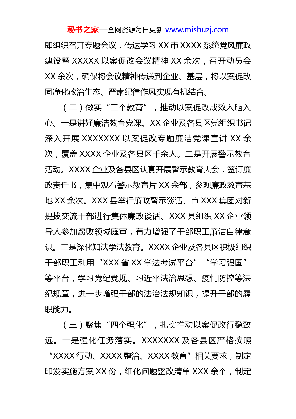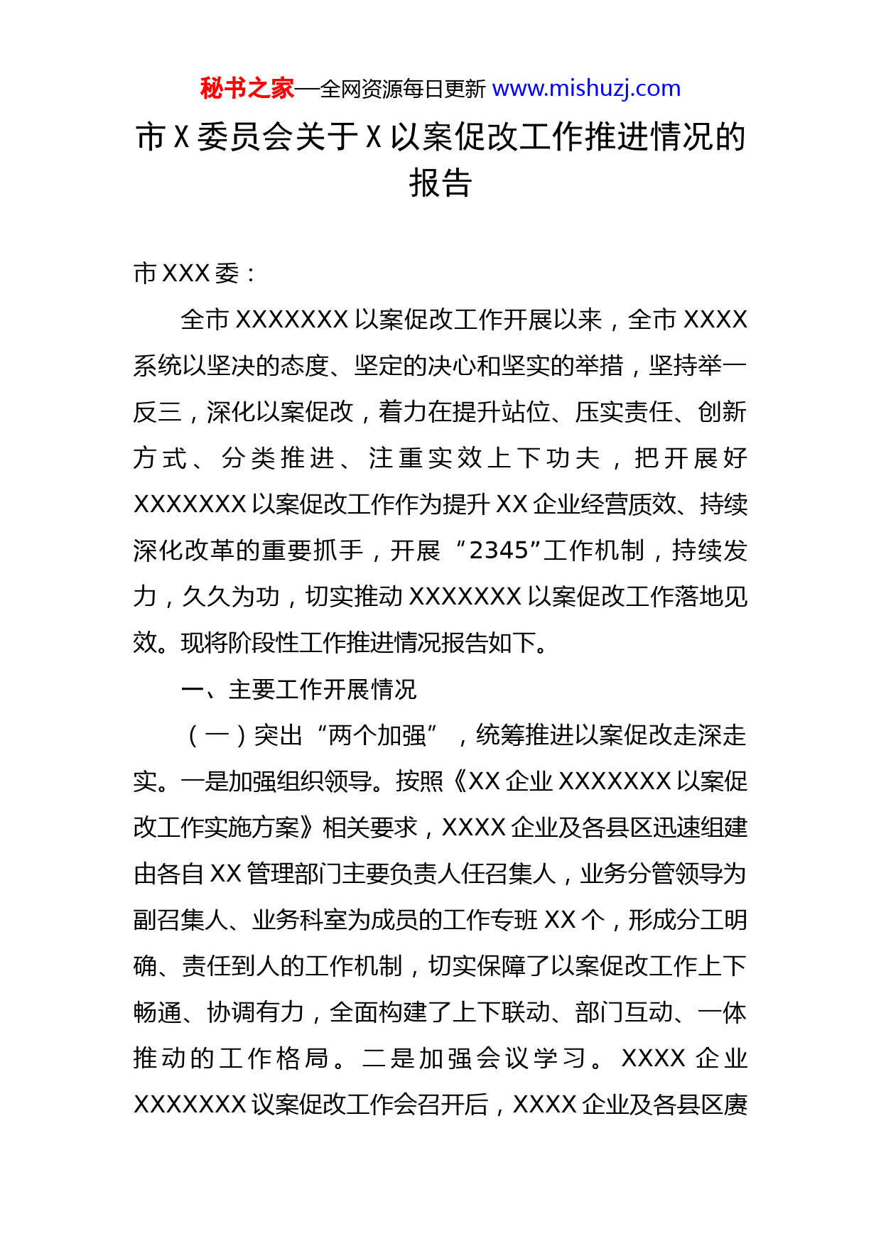秘书之家—全网资源每日更新www.mishuzj.com市X委员会关于X以案促改工作推进情况的报告市XXX委:全市XXXXXXX以案促改工作开展以来,全市XXXX系统以坚决的态度、坚定的决心和坚实的举措,坚持举一反三,深化以案促改,着力在提升站位、压实责任、创新方式、分类推进、注重实效上下功夫,把开展好XXXXXXX以案促改工作作为提升XX企业经营质效、持续深化改革的重要抓手,开展“2345”工作机制,持续发力,久久为功,切实推动XXXXXXX以案促改工作落地见效。现将阶段性工作推进情况报告如下。一、主要工作开展情况(一)突出“两个加强”,统筹推进以案促改走深走实。一是加强组织领导。按照《XX企业XXXXXXX以案促改工作实施方案》相关要求,XXXX企业及各县区迅速组建由各自XX管理部门主要负责人任召集人,业务分管领导为副召集人、业务科室为成员的工作专班XX个,形成分工明确、责任到人的工作机制,切实保障了以案促改工作上下畅通、协调有力,全面构建了上下联动、部门互动、一体推动的工作格局。二是加强会议学习。XXXX企业XXXXXXX议案促改工作会召开后,XXXX企业及各县区赓秘书之家—全网资源每日更新www.mishuzj.com即组织召开专题会议,传达学习XX市XXXX系统党风廉政建设暨XXXXX以案促改会议精神XX余次,召开动员会XX余次,确保将会议精神传递到企业、基层,将以案促改同净化政治生态、严肃纪律作风实现有机结合。(二)做实“三个教育”,推动以案促改成效入脑入心。一是讲好廉洁教育党课。XX企业及各县区党组织书记深入开展XXXXXXX以案促改专题廉洁党课宣讲XX余次,覆盖XXXX企业及各县区千余人。二是开展警示教育活动。XXXX企业及各县区认真开展警示教育大会,签订廉政责任书,集中观看警示教育片XX余部,参观廉政教育基地XX余次。XXX县举行廉政警示谈话、市XXX集团对新提拔交流干部进行集体廉政谈话、XXX县组织XX企业领导人参加腐败领域庭审,有力增强了干部职工廉洁自律意识。三是深化知法学法教育。XXXX企业及各县区积极组织干部职工利用“XXX省XX学法考试平台”“学习强国”等平台,学习党纪党规、习近平法治思想、疫情防控等法纪规章,进一步增强干部的法治法规知识,提升干部的履职能力。(三)聚焦“四个强化”,扎实推动以案促改行稳致远。一是强化任务落实。XXXXXXX及各县区严格按照“XXXX行动、XXXX整治、XXXX教育”相关要求,制定印发实施方案XX份,细化问题整改清单XXX余个,制定秘书之家—全网资源每日更新www.mishuzj.com整改措施XXX余条,压实整改责任,明确整改时限,确保以案促改全面推进。XXX县结合实际新增XX项整改任务,市XXX等XXX家单位对照工作方案,积极建立任务清单与整改措施台账,切实推进以案促改改出成效。二是强化制度建设。坚持按照“清、废、改、立”原则,修订完善《市XXXX融资担保管理办法》《区属XX企业内设机构、人员编制及人力资源管理暂行办法》《区属XX企业管理人业员XXXX处分薪资管理实施办法》《XXX县属XX企制管理办法》《县属XX企业受党纪政务XXXX工作指引》等制度XXX余个,形成靠制度管权、管事、管人的长效机制,确保以案促改、促建、促治达到时效。三是强化专项整治。对照“XXXX”相关要求,市XXX、市XXX等XXX家单位积极开展以案促改专项整治及自查自纠工作XX次,全面摸清、理顺存在的问题关键;XXX县开展XX企业问题线索XX筛查和XX企业领导人XXX自查清理,对发现问题及时处理;XXX县开展XXX兼职、XX取酬等重点清查整治与“回头看”,杜绝清查问题整治“死灰复燃”。市XXXX开展近三年子公司负责人薪酬制度执行情况、财经纪律突出问题清查,发现一起查处一起。四是强化监督检查。积极构建高效监督检查机制,不断增强监督合力,推动形成系统集成、协同高效的监督机制。XXX区建立“XXXX”同级监督模式,出台《XXX区公职人员XXX秘书之家—全网资源每日更新www.mishuzj.com负面清单》,进一步强化监督效能;XXXX县率先建立XX资产信息监管平台,有效推动XXX管理规范化、信息化;XXXX建立工作周报和“阳光问效”机制,用亮成绩、晒效果的方式,倒逼相关单位抓好工作落地落实。(四)健全“五个机制”,全面推进以案促改落地见效。一是健全信息联络机制。XXXXXX及各县区积极建立信息联络机制,确保以案促改信息传递及时、有效。XXX县建立“1+3+N”的信息联络体系,负责日常信息的沟通和报送,确保信息第一时间传达收集。二是建立调度会商机制。XXXX企业及各县区积极探索以案促改工作协调机制,确保以案促改各项工作逐步落实。XXXX县建立“半月一会商、一月一调度”制度,听取工作开展情况汇报,集中研究解决具体问题,形成了内外衔接、上下联动的工作格局。三是健全监督检查综合测评机制。积极探索监督检查和整改成果测评机制,市XXXX积极统筹整合各职能部门,由工作专班定期开展监督检查和综合测评,对以案促改形式化、务虚化等问题进行严肃查处。四是建立债务风险预警机制。为确保债务风险可管可控,市XXXX着力化解债务风险,积极探索建立债务风险预警机制,拟定《XXX担保管理办法》,确保债务风险可管可控。XXXX是建立约谈通报机制。积极探索以案促改责任落实机制,XXXX区、XXXX县会同纪检监察部门建立约谈通报机秘书之家—全网资源每日更新www.mishuzj.com制,对推进以案促改工作重视不够、推进缓慢、力度不深的