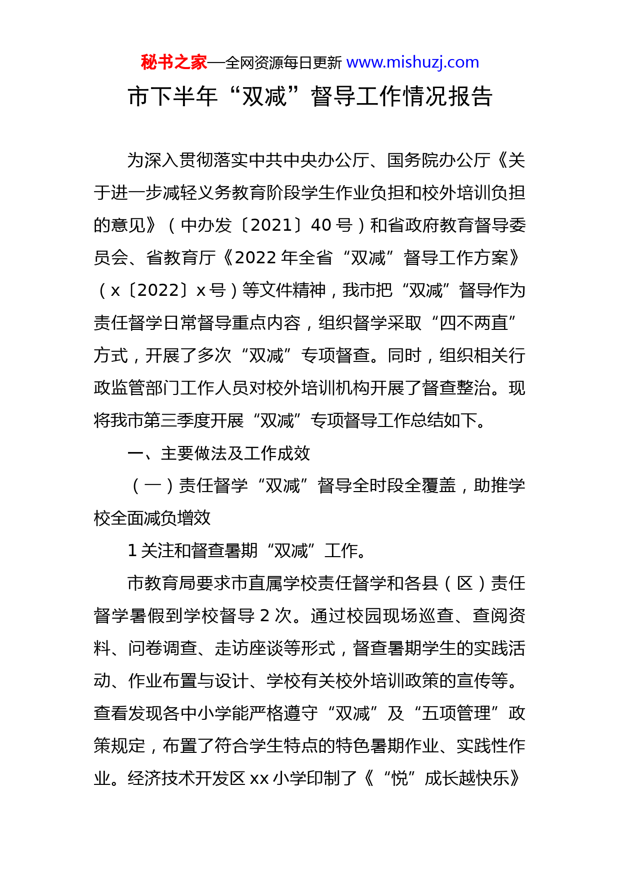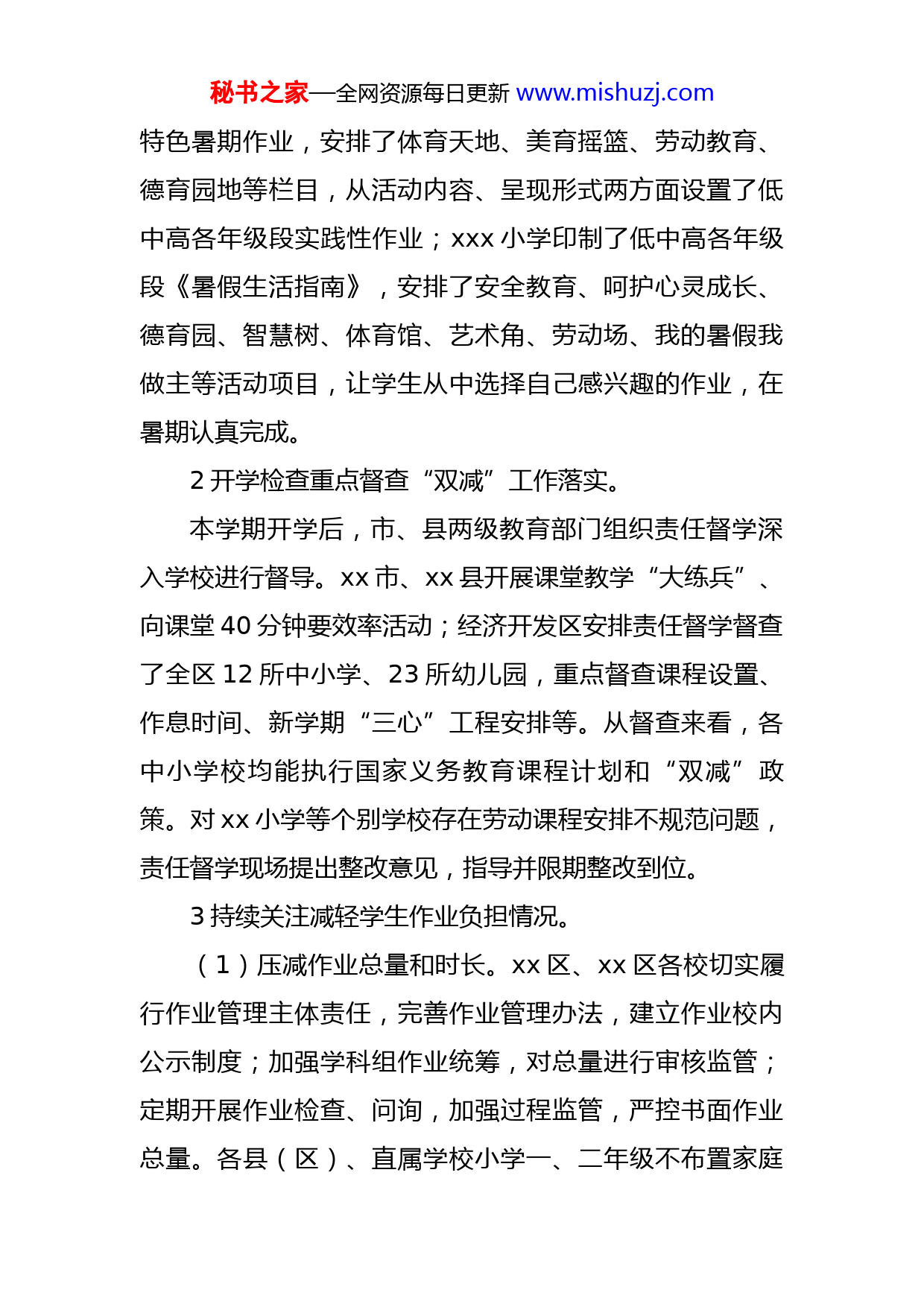 秘书之家—全网资源每日更新www.mishuzj.com市下半年“双减”督导工作情况报告为深入贯彻落实中共中央办公厅、国务院办公厅《关于进一步减轻义务教育阶段学生作业负担和校外培训负担的意见》(中办发〔2021〕40号)和省政府教育督导委员会、省教育厅《2022年全省“双减”督导工作方案》(x〔2022〕x号)等文件精神,我市把“双减”督导作为责任督学日常督导重点内容,组织督学采取“四不两直”方式,开展了多次“双减”专项督查。同时,组织相关行政监管部门工作人员对校外培训机构开展了督查整治。现将我市第三季度开展“双减”专项督导工作总结如下。一、主要做法及工作成效(一)责任督学“双减”督导全时段全覆盖,助推学校全面减负增效1关注和督查暑期“双减”工作。市教育局要求市直属学校责任督学和各县(区)责任督学暑假到学校督导2次。通过校园现场巡查、查阅资料、问卷调查、走访座谈等形式,督查暑期学生的实践活动、作业布置与设计、学校有关校外培训政策的宣传等。查看发现各中小学能严格遵守“双减”及“五项管理”政策规定,布置了符合学生特点的特色暑期作业、实践性作业。经济技术开发区xx小学印制了《“悦”成长越快乐》秘书之家—全网资源每日更新www.mishuzj.com特色暑期作业,安排了体育天地、美育摇篮、劳动教育、德育园地等栏目,从活动内容、呈现形式两方面设置了低中高各年级段实践性作业;xxx小学印制了低中高各年级段《暑假生活指南》,安排了安全教育、呵护心灵成长、德育园、智慧树、体育馆、艺术角、劳动场、我的暑假我做主等活动项目,让学生从中选择自己感兴趣的作业,在暑期认真完成。2开学检查重点督查“双减”工作落实。本学期开学后,市、县两级教育部门组织责任督学深入学校进行督导。xx市、xx县开展课堂教学“大练兵”、向课堂40分钟要效率活动;经济开发区安排责任督学督查了全区12所中小学、23所幼儿园,重点督查课程设置、作息时间、新学期“三心”工程安排等。从督查来看,各中小学校均能执行国家义务教育课程计划和“双减”政策。对xx小学等个别学校存在劳动课程安排不规范问题,责任督学现场提出整改意见,指导并限期整改到位。3持续关注减轻学生作业负担情况。(1)压减作业总量和时长。xx区、xx区各校切实履行作业管理主体责任,完善作业管理办法,建立作业校内公示制度;加强学科组作业统筹,对总量进行审核监管;定期开展作业检查、问询,加强过程监管,严控书面作业总量。各县(区)、直属学校小学一、二年级不布置家庭秘书之家—全网资源每日更新www.mishuzj.com书面作业,小学三至六年级书面作业平均完成时间不超过60分钟;初中书面作业平均完成时间不超过90分钟。国家法定节假日、休息日及寒暑假期也严格控制书面作业时间总量。(2)提高作业设计质量。市教科所组织开展作业设计大赛,注重发挥作业诊断、巩固、学情分析等功能,探索符合学生成长特点和学习规律、指向素质教育的基础性作业。xx区、xx经济开发区各校加强作业研究,鼓励布置分层、弹性和个性化作业,坚决克服机械、无效作业,杜绝重复性、惩罚性作业。(3)加强作业完成指导。xx区、xx区各校充分利用课堂教学时间和课后服务时间加强学生作业指导,培养学生自主学习和时间管理能力,确保小学生基本在校内完成作业,初中生在校内完成大部分书面作业。(4)认真批改反馈作业。xx区要求学校教师对布置给学生的作业全批全改,对学习有困难学生尽量面批;各校均建立了作业校内公示制度,作业时间控制基本达标。4全时段关注学生规范考试情况。各县(区)要求学校从严控制考试次数,不得提前结课备考、违规统考,考试内容要符合课程标准、联系学生生活实际,不公布学生成绩和排名,坚决克服唯分数的倾向。秘书之家—全网资源每日更新www.mishuzj.com(1)大幅压减考试次数。各中学每学期从不同学科、不同年段的实际出发,安排一次期中考试。七、八年级考查语文、数学、外语,九年级考查中考相应的全部学科。小学不组织期中考试或变相组织考试,一、二年级不进行纸笔考试。(2)规范考试命题管理。xx区、经济技术开发区等学校合理控制考试难度,不超越国家课程标准和学校教学进度,切实提高命题质量,注重考查基础知识、基本技能和教学目标达成情况,体现素质教育导向。(3)合理运用考试结果。各校考试结果不排名、不公布,以适当方式告知学生和家长,不将考试结果在家长群传播;不按考试结果给学生调整分班、排座位、“贴标签”;广大教师运用考试结果精准分析学情教情,有针对性地对学生进行帮扶辅导,切实改进课堂教学,不断提高课堂教学质量。5深入开展课后服务工作督查。各校正常持续开展“5+2”课后服务,课后托管开设课程形式多样,建立台账资料,与家长签订委托服务协议;对有特殊需要的学生,提供延时托管服务。经济开发区积极探索课后服务新模式,精心设计课后服务个性化“菜单”,努力提升课后服务质量,促进民生工作落到实处。目前全区课后服务工作学校覆盖率100%,满足有需求学秘书之家—全网资源每日更新www.mishuzj.com生覆盖率100%,全区共12885人参与课后服务工作,学生参与率达911%。xx区中小学课后服务学生参与率100%,其中每周五天都参加的学生参与率达到85%以上。