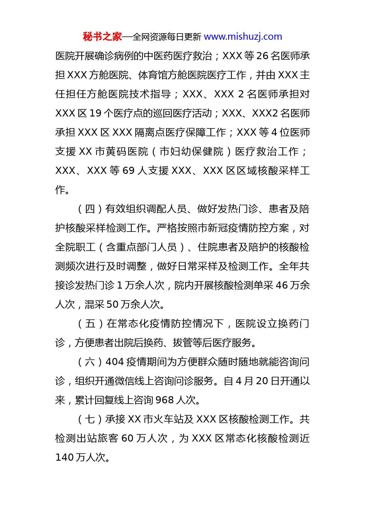 秘书之家—全网资源每日更新www.mishuzj.com市中医院医务部2022年工作总结2022年,医务科在院部的领导下,在各职能科室的支持配合下,在全科人员的共同努力下,一手抓新冠疫情防控,一手抓医疗业务发展及医疗质量与安全,专科建设工作成效明显,中医药服务能力进一步提升,日常工作扎实有序推进,现总结如下:一、新冠疫情防控工作(一)根据国家、省、市相关疫情防控政策及时调整我院疫情防控规定,制定我院疫情防控方案,指导全院疫情防控工作。(二)承接管理、运行XX市体育馆方舱医院,并形成管理运行长效机制,成立了XX市体育馆方舱医院工作领导组,出台了《XX市体育馆方舱医院备用及启用管理办法》等,确保方舱医院能在第一时间迅速启用,运行管理稳妥有效,关舱时安全有序,为我市疫情防控工作做出突出贡献。(三)两轮疫情期间,在保证主力医疗力量不受影响的前提下,抽调多批医疗人员外出支援。抽调XXX等3名医师支援XXX方舱医院;XXX等6名检验人员支援XXX核酸检测;13名轮转医师、技师反复、多次支援XXX、XXX核酸采样工作;XXX、XXX2位医师在市定点秘书之家—全网资源每日更新www.mishuzj.com医院开展确诊病例的中医药医疗救治;XXX等26名医师承担XXX方舱医院、体育馆方舱医院医疗工作,并由XXX主任担任方舱医院技术指导;XXX、XXX2名医师承担对XXX区19个医疗点的巡回医疗活动;XXX、XXX2名医师承担XXX区XXX隔离点医疗保障工作;XXX等4位医师支援XX市黄码医院(市妇幼保健院)医疗救治工作;XXX、XXX等69人支援XXX、XXX区区域核酸采样工作。(四)有效组织调配人员、做好发热门诊、患者及陪护核酸采样检测工作。严格按照市新冠疫情防控方案,对全院职工(含重点部门人员)、住院患者及陪护的核酸检测频次进行及时调整,做好日常采样及检测工作。全年共接诊发热门诊1万余人次,院内开展核酸检测单采46万余人次,混采50万余人次。(五)在常态化疫情防控情况下,医院设立换药门诊,方便患者出院后换药、拔管等后医疗服务。(六)404疫情期间为方便群众随时随地就能咨询问诊,组织开通微信线上咨询问诊服务。自4月20日开通以来,累计回复线上咨询968人次。(七)承接XX市火车站及XXX区核酸检测工作。共检测出站旅客60万人次,为XXX区常态化核酸检测近140万人次。秘书之家—全网资源每日更新www.mishuzj.com(八)每日完成新冠病毒核酸检测信息平台信息上报和医院重点部门核酸检测条码打印,对全院不按要求核酸检测的医生进行通报督促。二、医疗质量与医疗安全(一)过程管理1.医疗费用管理。召开2022年的高值耗材论证会,对2021年度各科室高值耗材的使用情况进行了总结。同时依托新OA上线,进一步完善超2万耗材审批流程,以DRG为抓手,合理控费。配合医保办对市医保局对我院2022年的飞检情况,进行梳理,查找存在的问题,进行立行立改,规范医疗行为。2.“日间手术”管理。除XX市医保规定范围内的病种外,从国家推荐的第二批日间手术目录中遴选合适我院开展的病种纳入日间手术管理,逐步推动我院日间手术工作的开展。3.全年组织召开两次手术目录专题研讨会,经医疗技术管理委员会讨论,修改制定了一套较为规范、合规、合理的电子病历手术目录及医疗技术目录。4.开展2022年住院总(科秘书)换届工作并进行岗前培训,不定时检查2022年度住院总(科秘书)在岗在位情况。5.改进电子病历质控系统,同时向院部申请配置病案专秘书之家—全网资源每日更新www.mishuzj.com用质控系统,实现病案质控智能化、信息化。6.调整临床用血、病案管理委员会,召开病案管理委员会2022年度首次工作会议。7.针对医院内静脉血栓栓塞症(VTE)防治过程中的医疗质量持续改进和安全风险防范的具体要求成立静脉血栓栓塞症防治管理委员会,启动了我院静脉血栓栓塞症(VTE)防治项目管理。8.继续保持各专科与北京、长三江角、合六经济圈等建立合作关系。及时抓住国家医疗卫生资源战略发展布局,引进优质医疗资源下沉,与XXX人民医院、XXX医院、XXX医院等开展免费云助诊活动,免费受益患者25例。与XXX医院签订血液病医疗联合体合作框架协议,血液科定期开展远程门诊,受益患者57人,同时加大对血液科远程门诊的宣传工作,扩大影响力。全年与北京肿瘤医院成功开展远程会诊12例,与北京胸科医院开展远程会诊6例,与中国科学院肿瘤医院开展远程会诊10例,与XXX市临床病理读片会开展病理会诊62例。9.完成2021年度三基理论考核与补考,2021年度麻醉、第一类精神药品使用知识培训及考核工作。10.病历质控(1)以18项医疗质量安全核心制度为基础,结合大型医院巡查要求,修订我院临床科室《基础医疗质量评价秘书之家—全网资源每日更新www.mishuzj.com标准》(2022年1月版),开展全院范围内的基础医疗质量检查(2021年度、2022年1月1日-9月1日)。(2)以《住院病历质量评分细则》(2018版)为标准,开展归档病案检查,目前已完成2021年5-12月、2022年1-4月归档病案质控工作,共质控病案1629份,甲级率为92.88%。(3)根据《中医病案评分细则》,开展中医病历专项质控,完成2021年第三季度、第四季度,2022年第一季度、第二季度中医病案质控共1200份,其中理法方药一致率为77.22%。2022年第二季度中医病案质控共300份,目前正在汇总数据。(4)在HIS系统中,对在架病历书写及时性及内涵(院级环节质控)进行质控,全年共质控在架病历4717份,每份问题病