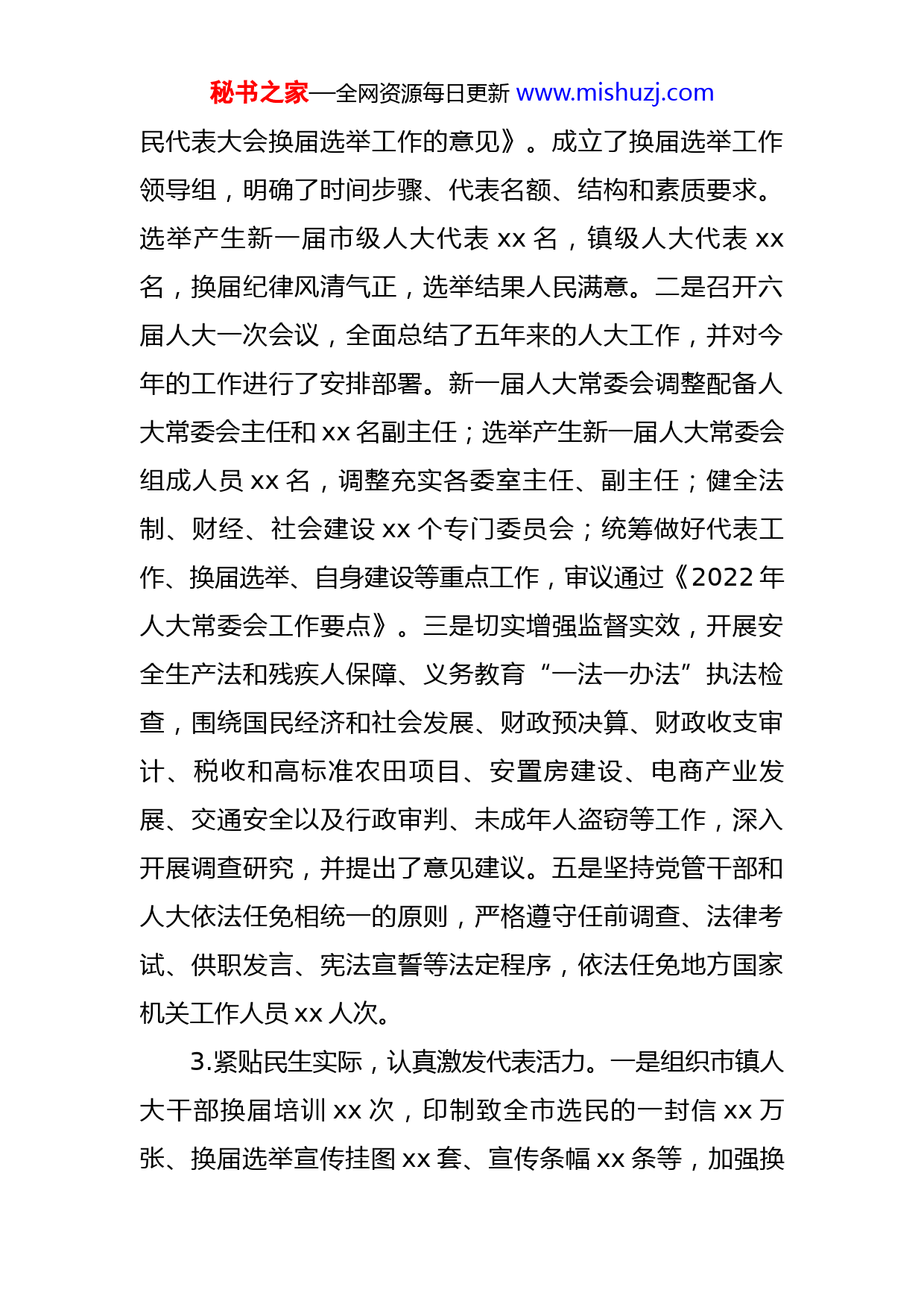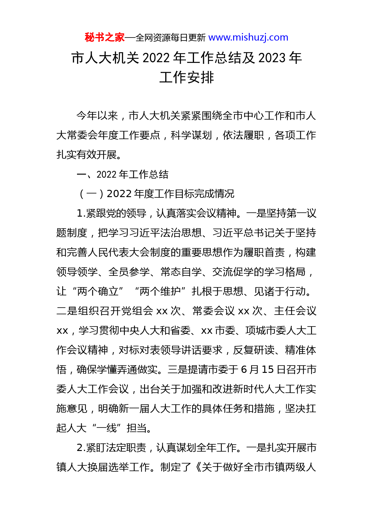 秘书之家—全网资源每日更新www.mishuzj.com市人大机关2022年工作总结及2023年工作安排今年以来,市人大机关紧紧围绕全市中心工作和市人大常委会年度工作要点,科学谋划,依法履职,各项工作扎实有效开展。一、2022年工作总结(一)2022年度工作目标完成情况1.紧跟党的领导,认真落实会议精神。一是坚持第一议题制度,把学习习近平法治思想、习近平总书记关于坚持和完善人民代表大会制度的重要思想作为履职首责,构建领导领学、全员参学、常态自学、交流促学的学习格局,让“两个确立”“两个维护”扎根于思想、见诸于行动。二是组织召开党组会xx次、常委会议xx次、主任会议xx,学习贯彻中央人大和省委、xx市委、项城市委人大工作会议精神,对标对表领导讲话要求,反复研读、精准体悟,确保学懂弄通做实。三是提请市委于6月15日召开市委人大工作会议,出台关于加强和改进新时代人大工作实施意见,明确新一届人大工作的具体任务和措施,坚决扛起人大“一线”担当。2.紧盯法定职责,认真谋划全年工作。一是扎实开展市镇人大换届选举工作。制定了《关于做好全市市镇两级人秘书之家—全网资源每日更新www.mishuzj.com民代表大会换届选举工作的意见》。成立了换届选举工作领导组,明确了时间步骤、代表名额、结构和素质要求。选举产生新一届市级人大代表xx名,镇级人大代表xx名,换届纪律风清气正,选举结果人民满意。二是召开六届人大一次会议,全面总结了五年来的人大工作,并对今年的工作进行了安排部署。新一届人大常委会调整配备人大常委会主任和xx名副主任;选举产生新一届人大常委会组成人员xx名,调整充实各委室主任、副主任;健全法制、财经、社会建设xx个专门委员会;统筹做好代表工作、换届选举、自身建设等重点工作,审议通过《2022年人大常委会工作要点》。三是切实增强监督实效,开展安全生产法和残疾人保障、义务教育“一法一办法”执法检查,围绕国民经济和社会发展、财政预决算、财政收支审计、税收和高标准农田项目、安置房建设、电商产业发展、交通安全以及行政审判、未成年人盗窃等工作,深入开展调查研究,并提出了意见建议。五是坚持党管干部和人大依法任免相统一的原则,严格遵守任前调查、法律考试、供职发言、宪法宣誓等法定程序,依法任免地方国家机关工作人员xx人次。3.紧贴民生实际,认真激发代表活力。一是组织市镇人大干部换届培训xx次,印制致全市选民的一封信xx万张、换届选举宣传挂图xx套、宣传条幅xx条等,加强换秘书之家—全网资源每日更新www.mishuzj.com届指导和风气监督,为做好人大换届工作奠定坚实的基础。坚持线上线下结合、掌上掌下结合,运用代表履职平台系统、官微等新媒体开展网上常态化培训,编印《人大大记事》《人大代表工作手册》等,将代表初任学习、履职学习、专题学习培训贯穿代表任期全过程,不断提高代表履职能力。二是充分发挥代表作用,密切代表与群众的联系,依托xx个代表联络站点,广泛听民声、汇民智、纾民困,主动接受选民监督。如,向全市各级人大代表发出倡议书,号召广大代表积极投身疫情防控工作,全市各级人大代表积极响应、迅速作为,累计折合捐款xx多万元。三是提高建议办理质效,采取提、交、办、评四步工作法抓好建议,做到有序无缝对接,提升建言献策的质量。召开代表意见建议交办会议,对今年人代会上代表提出的xx件建议,选择xx件事关全局和群众切身利益的代表建议进行重点督办,政府分管负责人领办,切实提高办理质效,推进建议落地落实。4.紧抓作风转变,认真提升履职水平。一是巩固省级文明单位创建成果。瞄准四个机关定位,深入开展作风建设年活动,通过开展国家传统节日志愿者服务、红旗精神专题培训班和迎接党的二十大书画展等活动,抓好机关干部能力素质提升和精神文明创建。二是坚持靠制度管人、以制度理事。按照新修订的地方组织法,全面梳理人大各项秘书之家—全网资源每日更新www.mishuzj.com会议制度和工作程序,按照简洁务实管用的原则,实施合并修改,以全面完善的2022版制度办法,推动全过程人民民主实践在项城更加成熟、更加定型。如,健全常委会会议审议办法、主任会议议事规则、重大事项决定制度等,健全务实高效、充满活力的人大工作运行机制。三是讲好人大故事。组建人大宣传信息员队伍,出台改进和加强人大新闻宣传工作的意见,表彰先进单位和个人。坚持正确舆论导向,准确把握宣传规律,通过“报刊网微端屏”全面发力、积极发声,累计报道各类工作简报、信息xx多条次,把严肃的会议、常规活动、代表风采写深写实写活,凝聚奋进力量。(二)重点项目推进情况今年,市人大机关积极谋划招商项目,引进了总投资xx亿元功能纳米涂层新材料研发及产业化项目入驻产业集聚区。目前,该项目已经投产。(三)取得的市级以上荣誉项城市人大常委会被xx市人大常委会表彰为“2021年度xx市人大系统优秀调研成果组织奖”。二、2023年工作安排2023年,将坚持以党的二十大精神为指引,全面落实中央人大工作会议精神,围绕全市中心工作和发展大局,认真履行宪法和法律赋予的各项职责,深入践行全过程人秘书之家—全网资源每日更新www.mishuzj.com民民主理念,切实发挥制度优势,积极担当作为,确保落实到基层人大工作各