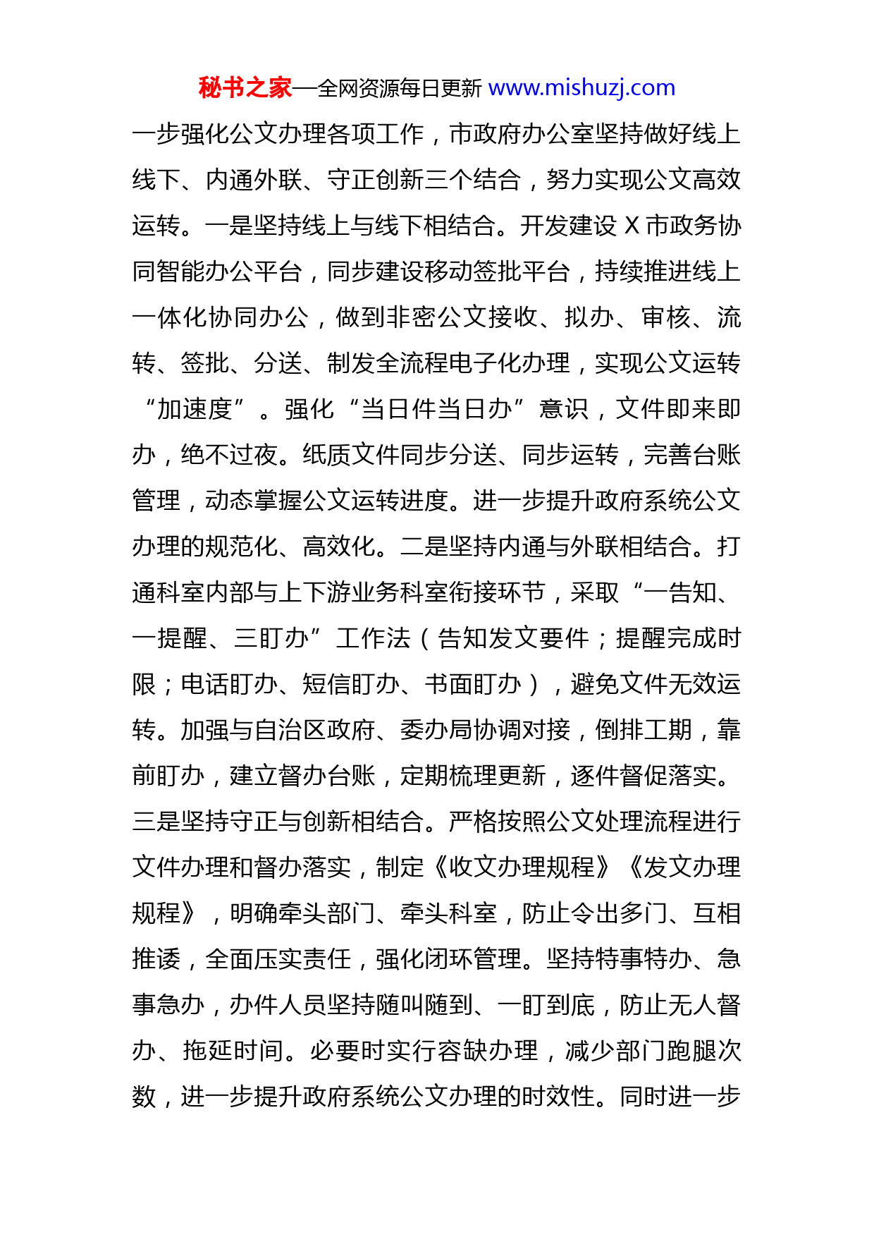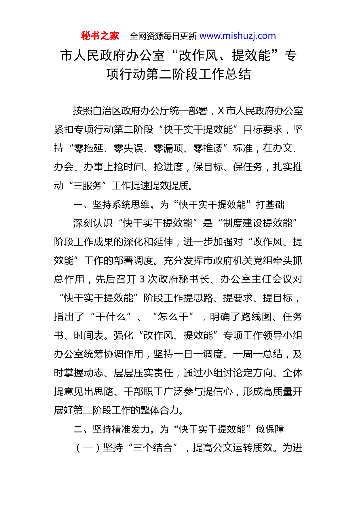 秘书之家—全网资源每日更新www.mishuzj.com市人民政府办公室“改作风、提效能”专项行动第二阶段工作总结按照自治区政府办公厅统一部署,X市人民政府办公室紧扣专项行动第二阶段“快干实干提效能”目标要求,坚持“零拖延、零失误、零漏项、零推诿”标准,在办文、办会、办事上抢时间、抢进度,保目标、保任务,扎实推动“三服务”工作提速提效提质。一、坚持系统思维,为“快干实干提效能”打基础深刻认识“快干实干提效能”是“制度建设提效能”阶段工作成果的深化和延伸,进一步加强对“改作风、提效能”工作的部署调度。充分发挥市政府机关党组牵头抓总作用,先后召开3次政府秘书长、办公室主任会议对“快干实干提效能”阶段工作提思路、提要求、提目标,指出了“干什么”、“怎么干”,明确了路线图、任务书、时间表。强化“改作风、提效能”专项工作领导小组办公室统筹协调作用,坚持一日一调度、一周一总结,及时掌握动态、层层压实责任,通过小组讨论定方向、全体提意见出思路、干部职工广泛参与提信心,形成高质量开展好第二阶段工作的整体合力。二、坚持精准发力,为“快干实干提效能”做保障(一)坚持“三个结合”,提高公文运转质效。为进秘书之家—全网资源每日更新www.mishuzj.com一步强化公文办理各项工作,市政府办公室坚持做好线上线下、内通外联、守正创新三个结合,努力实现公文高效运转。一是坚持线上与线下相结合。开发建设X市政务协同智能办公平台,同步建设移动签批平台,持续推进线上一体化协同办公,做到非密公文接收、拟办、审核、流转、签批、分送、制发全流程电子化办理,实现公文运转“加速度”。强化“当日件当日办”意识,文件即来即办,绝不过夜。纸质文件同步分送、同步运转,完善台账管理,动态掌握公文运转进度。进一步提升政府系统公文办理的规范化、高效化。二是坚持内通与外联相结合。打通科室内部与上下游业务科室衔接环节,采取“一告知、一提醒、三盯办”工作法(告知发文要件;提醒完成时限;电话盯办、短信盯办、书面盯办),避免文件无效运转。加强与自治区政府、委办局协调对接,倒排工期,靠前盯办,建立督办台账,定期梳理更新,逐件督促落实。三是坚持守正与创新相结合。严格按照公文处理流程进行文件办理和督办落实,制定《收文办理规程》《发文办理规程》,明确牵头部门、牵头科室,防止令出多门、互相推诿,全面压实责任,强化闭环管理。坚持特事特办、急事急办,办件人员坚持随叫随到、一盯到底,防止无人督办、拖延时间。必要时实行容缺办理,减少部门跑腿次数,进一步提升政府系统公文办理的时效性。同时进一步秘书之家—全网资源每日更新www.mishuzj.com加大对市政府合同协议的管理,坚持抓源头、抗风险、促规范,严把合同协议合法性审查关口,为政府依法规范合同协议签订提供高质量的法治保障服务,增强政府公信力和执行力,推动实现高效能治理。(二)严把会议“三关”,推动会风转变。市政府办公室围绕中心、服务大局,不断完善会务工作各项流程,严把“会前、会中、会后”关口,以强化会议质量推动机关作风转变。一是把好会前“审核关”。加强会议统筹协调,坚持少开会,开管用的会,能不开的坚决不开,可合并的坚决合并。结合会议要求和工作实际,制定市政府常务会议、市长办公会议议题清单,强化部门、分管副秘书长和分管副市长三级审核职责,对拟上会议题征求意见、合法性审查等各环节予以明确,对不符合上会条件的议题一票否决,避免议题“带病”上会。二是把好会中“服务关”。根据会议质量和效果及时优化调整软硬件,对市政府办公室管理的会议室进行升级改造,优化网络宽带、调试音响话筒、购置专业设备,切实提高会议服务保障能力,满足电视电话会议和各类专业会议需求。针对不同会议注意事项制定个性化服务清单,如常务会侧重议题衔接、参会人员到会候会等环节,电视电话会侧重设备调试、会场纪律等事项,实现一目了然,做到心中有数。三是把好会后“督办关”。明确市政府督查室对市政府常务秘书之家—全网资源每日更新www.mishuzj.com会议、市长办公会议的议定事项进行督办,并定期通报。文电科负责对会议研究通过文件盯办印发,避免文件上会后部门当“甩手掌柜”,影响文件印发效率。各科室协作配合,对自治区党委、政府,市委、市政府明确的重点事项、重大任务、重要文件,紧抓快办、即抓即办,推动督办工作提质提速提效,助力各项工作有序开展。(三)发挥参谋助手作用,提升政务信息质量。围绕市委、市政府工作重点,突出信息的时效性、真实性、完整性、严肃性,切实提高报送上级信息质量,同时创刊本级刊物,为市政府领导提供决策参考依据。一是建章立制强保障。为进一步搭建市政府领导班子成员之间、市区之间、职能部门之间有效沟通渠道,市政府办公室牵头制定《政府系统信息工作考评细则》,实行信息报送及采用情况赋分排名、年度考核机制,形成同频共振研信息、群策群力报信息的工作格局。二是提升质量树精品。拓宽信息收集渠道,延伸信息收集范围,建立信息工作微信群,定期对接各秘书科室和各相关部门收集信息素材。树立精品意识,常态化开展重点选题调研和专题约稿,挖掘信息资源