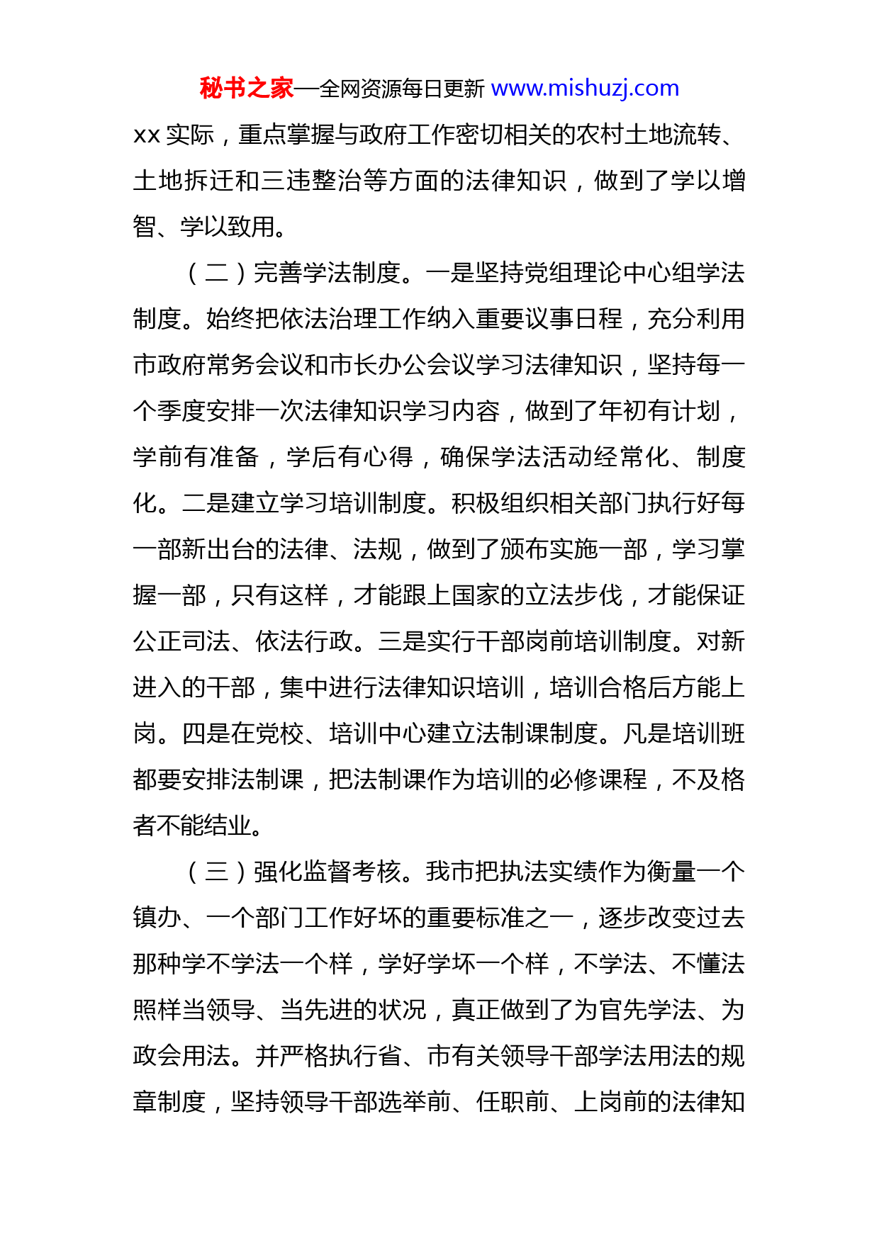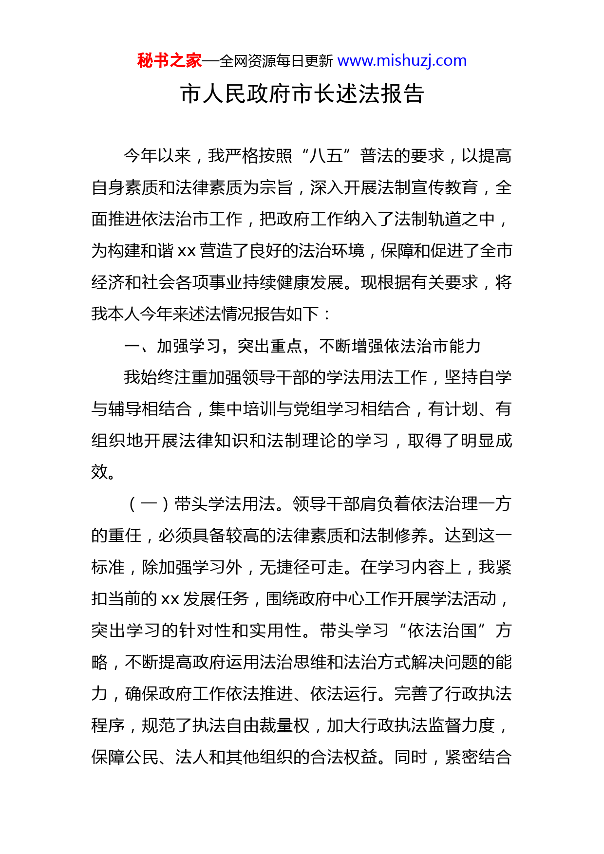 秘书之家—全网资源每日更新www.mishuzj.com市人民政府市长述法报告今年以来,我严格按照“八五”普法的要求,以提高自身素质和法律素质为宗旨,深入开展法制宣传教育,全面推进依法治市工作,把政府工作纳入了法制轨道之中,为构建和谐xx营造了良好的法治环境,保障和促进了全市经济和社会各项事业持续健康发展。现根据有关要求,将我本人今年来述法情况报告如下:一、加强学习,突出重点,不断增强依法治市能力我始终注重加强领导干部的学法用法工作,坚持自学与辅导相结合,集中培训与党组学习相结合,有计划、有组织地开展法律知识和法制理论的学习,取得了明显成效。(一)带头学法用法。领导干部肩负着依法治理一方的重任,必须具备较高的法律素质和法制修养。达到这一标准,除加强学习外,无捷径可走。在学习内容上,我紧扣当前的xx发展任务,围绕政府中心工作开展学法活动,突出学习的针对性和实用性。带头学习“依法治国”方略,不断提高政府运用法治思维和法治方式解决问题的能力,确保政府工作依法推进、依法运行。完善了行政执法程序,规范了执法自由裁量权,加大行政执法监督力度,保障公民、法人和其他组织的合法权益。同时,紧密结合秘书之家—全网资源每日更新www.mishuzj.comxx实际,重点掌握与政府工作密切相关的农村土地流转、土地拆迁和三违整治等方面的法律知识,做到了学以增智、学以致用。(二)完善学法制度。一是坚持党组理论中心组学法制度。始终把依法治理工作纳入重要议事日程,充分利用市政府常务会议和市长办公会议学习法律知识,坚持每一个季度安排一次法律知识学习内容,做到了年初有计划,学前有准备,学后有心得,确保学法活动经常化、制度化。二是建立学习培训制度。积极组织相关部门执行好每一部新出台的法律、法规,做到了颁布实施一部,学习掌握一部,只有这样,才能跟上国家的立法步伐,才能保证公正司法、依法行政。三是实行干部岗前培训制度。对新进入的干部,集中进行法律知识培训,培训合格后方能上岗。四是在党校、培训中心建立法制课制度。凡是培训班都要安排法制课,把法制课作为培训的必修课程,不及格者不能结业。(三)强化监督考核。我市把执法实绩作为衡量一个镇办、一个部门工作好坏的重要标准之一,逐步改变过去那种学不学法一个样,学好学坏一个样,不学法、不懂法照样当领导、当先进的状况,真正做到了为官先学法、为政会用法。并严格执行省、市有关领导干部学法用法的规章制度,坚持领导干部选举前、任职前、上岗前的法律知秘书之家—全网资源每日更新www.mishuzj.com识考试,切实提高领导干部依法执政的能力。同时,政府部门密切配合,制订出台了相应的制度,把普法和依法治理成果作为评先选优的重要内容和条件。并对后备干部加强法律素质的培养,造就了一批讲政治、通经济、懂法律的综合型人才。二、高度重视,强化保障,推动各项任务落到实处按照“八五”普法的要求,我市制定出台了相关规章制度,为依法治市工作的顺利开展提供了坚强保障。(一)完善组织领导。我们及时调整依法治理工作领导机构,充实了成员单位,明确了依法治市办公室工作职责,完善了“党委领导、人大监督、政府实施、政协支持、部门协作配合、全社会共同参与”的工作机制。至目前,全市现有各类普法依法治理机构个,配有兼职工作人员名。(二)加强队伍建设。我市法制建设领导小组在全市各部门以及法律服务机构,挑选了一批政治素质好、专业水平高、热心于法制宣传教育工作的法学专家和法律实务工作者,组建一支人的专兼职普法宣传队伍,培训依法治理骨干人次。(三)落实工作经费。市财政把普法经费按全市总人口元列入财政预算。各镇办、各部门也结合经济社会发展和单位实际,落实了一定的普法依法治理经费,保障了依秘书之家—全网资源每日更新www.mishuzj.com法治市工作的顺利开展。三、履职尽责,服务大局,扎实推进法治政府建设在深入实施“八五”普法规划的基础上,大力开展法制宣传教育,进一步深化依法治市工作,不断提高全民法律素质,为我市经济持续健康发展营造了浓厚的法治氛围。(一)推进法治政府建设。制定《xx市人民政府工作规则》,完善群众参与、专家咨询和集体决策相结合的决策机制,建立健全决策信息反馈机制、决策后评估机制、决策监督机制和责任追究制度。实行社会公示、听证和重大行政决策法律评估制度,市、镇办两级政府常年聘请法律顾问参与重大事项决策和评估。全市各级行政机关自觉接受人大、政协和社会各界的监督,人大代表、政协委员建议和意见办复率达100%、办复满意率达100%。(二)严格议事办事程序。每次召开政府全会、市政府常务会议和市长办公会议,我都要求部门、镇办养成按规则、按程序办事的习惯,严格遵守重大问题、重要事项的请示报告制度,特别是各部门项目建设资金的拨付使用、合同的签订等等,都要依法依规进行,不准擅自作主。凡政府投资项目招标、项目工程变更投资额和工程量、追加预算、大宗商品采购、国有资产出租、出售、变更,一定要严格程序、依法依规,必须报市政府常务会议秘书之家—全网资源每日更新www.mishuzj.com研究确定,否则,发改委一律不予立项,审计局不予审计,财政局不予拨付资金,