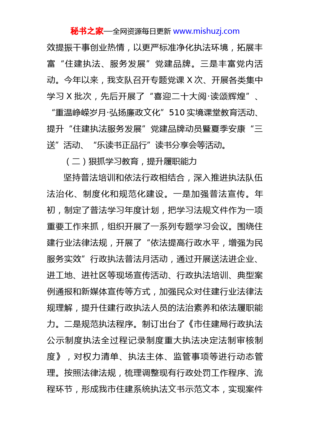 秘书之家—全网资源每日更新www.mishuzj.com市住建执法支队2022年工作情况和2023年工作安排2022年,我支队在局党委的坚强领导下,紧紧围绕住建行业执法主业主责,坚持政治建队、执法兴队、业务强队、创新优队、从严管队,统筹推进执法精细化、党建规范化、案审信息化、流程标准化、裁量精准化“五大提升战略”,着力打造一支高素质住建执法队伍,为全市住建事业高质量发展提供执法保障。现将有关情况报告如下:一、2022年工作情况(一)压实党建责任,强化队伍建设坚持从严治党和政治建队相结合,始终把党建工作纳入执法工作的总体布局,与业务工作同部署、同落实、同考核。一是注重党建引领。年初,细化制订了《2022年度支队党建工作要点》《支队党风廉政建设工作要点》《支队基层党建工作规范年实施方案》《支队全面从严治党主体责任清单》《“作风建设提升月”问题清单》等相关文件,结合支队执法工作特点,细化分解党建及党风廉政工作任务,确保责任层层到位、工作层层落实。二是突出建章立制。结合全市机关作风建设问题通报会精神和局党委“作风建设提升月”活动要求,制订出台了《关于进一步加强和改进执法工作的若干措施》,突出以作风建设新成秘书之家—全网资源每日更新www.mishuzj.com效提振干事创业热情,以更严标准净化执法环境,拓展丰富“住建执法、服务发展”党建品牌。三是丰富党内活动。今年以来,我支队召开专题党课X次、开展各类集中学习X批次,先后开展了“喜迎二十大阅·读颂辉煌”、“重温峥嵘岁月·弘扬廉政文化”510实境课堂教育活动、提升“住建执法服务发展”党建品牌动员暨夏季安康“三送”活动、“乐读书正品行”读书分享会等活动。(二)狠抓学习教育,提升履职能力坚持普法培训和依法行政相结合,深入推进执法队伍法治化、制度化和规范化建设。一是加强普法宣传。年初,制定了普法学习年度计划,把学习法规文件作为一项重要工作来抓,组织开展了一系列专题学习会议。围绕住建行业法律法规,开展了“依法提高行政水平,增强为民服务实效”行政执法普法月活动,通过开展送法进企业、进工地、进社区等现场宣传活动、行政执法培训、典型案例通报和新媒体宣传等方式,加强民众对住建行业法律法规理解,提升住建行政执法人员的法治素养和依法履职能力。二是规范执法程序。制订出台了《市住建局行政执法公示制度执法全过程记录制度重大执法决定法制审核制度》,对权力清单、执法主体、监管事项等进行动态管理。按照法律法规,梳理调整现有行政处罚工作程序、流程环节,形成我市住建系统执法文书示范文本,实现案件秘书之家—全网资源每日更新www.mishuzj.com办理全过程标准化。三是深入分析研判。印发首份《全市住房城乡建设行政执法年报》,对上年度行政执法工作进行总结通报,全面增强对行政处罚案件的大数据分析能力。扎实做好巡查整改,紧盯关键环节和潜在风险,定期组织廉情分析,重点排查廉政风险源,梳理修订了各项规章制度。(三)聚焦主责主业,保障执法实效坚持专项执法和监管联动相结合,全力构筑综合执法与业务检查常态化协作新模式。一是普及智慧执法。推广应用省住建执法平台并实现全市域全流程全覆盖,通过互联网+、执法大数据和信息赋能,助推“智慧执法”新模式,实现登记、初审受理、查办转办、催办督办、结案归档“全链条、一体化”办理,确保“办件都留痕、全程可回溯”。二是增强监管联动。先后牵头或协助局相关处室、单位开展各类执法检查7次,随机抽查在建工程XXX余个,出动执法人员XXX人次,排查安全隐患X处。共计处理上级部门交办、市12345平台转办、监管部门移转的投诉举报事项XX件,移转区级处理X件,累计立案查处违法案件XX件,收缴罚没款XXX余万元。三是提升工作效能。积极履职尽责,发挥执法“利剑”作用,围绕住建部门执法监督职责,联动全市住建行业安全生产百日攻坚行动,制订下发了《XX市住房城乡建设系统百日执法专项行秘书之家—全网资源每日更新www.mishuzj.com动方案》,重点围绕工程质量安全、消防设计审查验收等六方面工作内容持续加大专项执法力度,规范住建行业秩序。二、工作创新情况坚持系统思维和创新引领相结合,不断探索新形势下住建行政执法工作的新出路。一是深化课题研究。在全省住建系统率先启动《证据格式清单》课题研究,按照案件类型、性质、专业等特点分类梳理归集证据材料目录;报送的《行政执法机构和人员管理》项目入选省厅执法研究专项课题;巩固深化“执法主办人”制度成果,已申报省依法行政示范项目。二是转变执法理念。起草出台了《XX市住房和城乡建设局不予行政处罚事项清单》(第一批)和(第二批),对初创型企业和部分非主观过错导致的违法行为审慎监管、柔性执法,持续依法优化营商环境。推行行政处罚事前提醒、事中指导、事后回访制度,努力实现管理型执法向服务型执法转变。三、存在问题一年来,我支队工作取得了一些成绩,但与上级要求和群众期盼相比仍有一定差距。一是执法能力亟需提升。部分人员熟悉和掌握执法业务不够全面;对查处的复杂疑难案件研究不深,方法、措施不到位。二是平台应用亟需深化。执法平台虽然普及率比较高,但是活跃度较低,部秘书之家