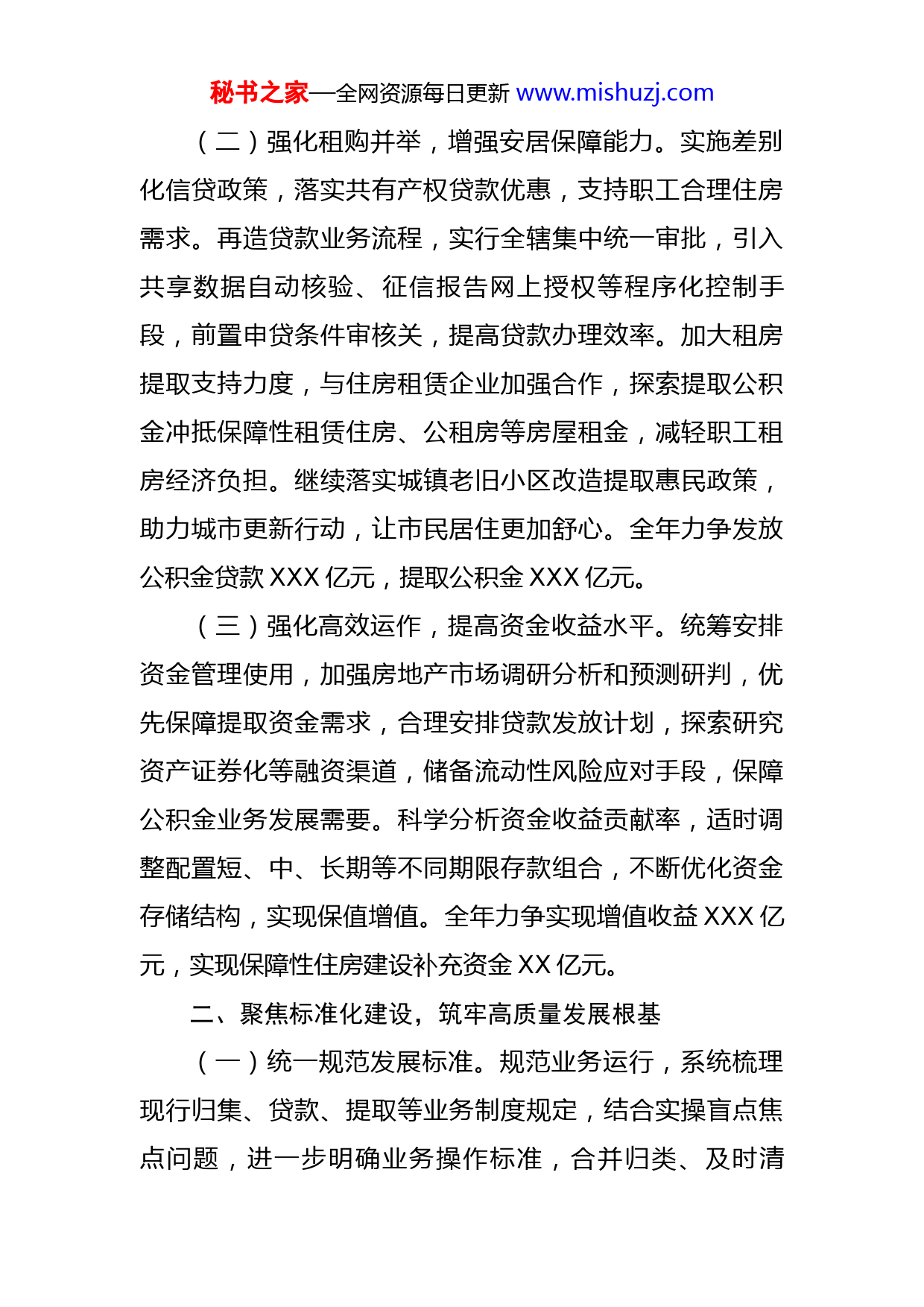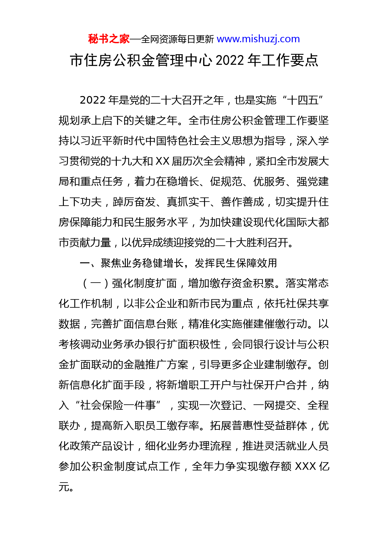 秘书之家—全网资源每日更新www.mishuzj.com市住房公积金管理中心2022年工作要点2022年是党的二十大召开之年,也是实施“十四五”规划承上启下的关键之年。全市住房公积金管理工作要坚持以习近平新时代中国特色社会主义思想为指导,深入学习贯彻党的十九大和XX届历次全会精神,紧扣全市发展大局和重点任务,着力在稳增长、促规范、优服务、强党建上下功夫,踔厉奋发、真抓实干、善作善成,切实提升住房保障能力和民生服务水平,为加快建设现代化国际大都市贡献力量,以优异成绩迎接党的二十大胜利召开。一、聚焦业务稳健增长,发挥民生保障效用(一)强化制度扩面,增加缴存资金积累。落实常态化工作机制,以非公企业和新市民为重点,依托社保共享数据,完善扩面信息台账,精准化实施催建催缴行动。以考核调动业务承办银行扩面积极性,会同银行设计与公积金扩面联动的金融推广方案,引导更多企业建制缴存。创新信息化扩面手段,将新增职工开户与社保开户合并,纳入“社会保险一件事”,实现一次登记、一网提交、全程联办,提高新入职员工缴存率。拓展普惠性受益群体,优化政策产品设计,细化业务办理流程,推进灵活就业人员参加公积金制度试点工作,全年力争实现缴存额XXX亿元。秘书之家—全网资源每日更新www.mishuzj.com(二)强化租购并举,增强安居保障能力。实施差别化信贷政策,落实共有产权贷款优惠,支持职工合理住房需求。再造贷款业务流程,实行全辖集中统一审批,引入共享数据自动核验、征信报告网上授权等程序化控制手段,前置申贷条件审核关,提高贷款办理效率。加大租房提取支持力度,与住房租赁企业加强合作,探索提取公积金冲抵保障性租赁住房、公租房等房屋租金,减轻职工租房经济负担。继续落实城镇老旧小区改造提取惠民政策,助力城市更新行动,让市民居住更加舒心。全年力争发放公积金贷款XXX亿元,提取公积金XXX亿元。(三)强化高效运作,提高资金收益水平。统筹安排资金管理使用,加强房地产市场调研分析和预测研判,优先保障提取资金需求,合理安排贷款发放计划,探索研究资产证券化等融资渠道,储备流动性风险应对手段,保障公积金业务发展需要。科学分析资金收益贡献率,适时调整配置短、中、长期等不同期限存款组合,不断优化资金存储结构,实现保值增值。全年力争实现增值收益XXX亿元,实现保障性住房建设补充资金XX亿元。二、聚焦标准化建设,筑牢高质量发展根基(一)统一规范发展标准。规范业务运行,系统梳理现行归集、贷款、提取等业务制度规定,结合实操盲点焦点问题,进一步明确业务操作标准,合并归类、及时清秘书之家—全网资源每日更新www.mishuzj.com理、实时更新制度文件汇编,持续扩增“零咨询”白话版办事指南覆盖事项,为业务运行、群众办事提供明晰化、标准化的规范指引。积极建章立制,加强政策储备,补齐政策短板,制定个贷贷后管理办法等制度文件,形成完整全面的业务制度体系。规范窗口服务,推进柜面服务标准化建设,对服务场所、服务人员、服务制度、服务监督等标准予以细化明确,推广综合柜员制,用好“好差评”反馈整改机制,加大第三方服务监督检查,持续提升群众临柜办事体验。(二)加固安全发展底线。加强提取审核,开展季度提取类型专项稽查,对预申请提取业务实行交叉复核,及时通报稽查、互查结果,防范资金骗提风险。加强楼盘监督,密切关注签约楼盘项目情况,随机开展现场检查,防范项目交付风险。加强信贷管控,建立贷款逾期管理制度,强化涉诉督办,防范贷款回收风险。加强内审稽查,持续拓宽审计覆盖范围,按月进行电子化稽查和风险隐患排查,借助大数据平台加强业务监控和风险预警,织密风控防护网。加强系统支撑,健全网络安全管理制度,完善一体化运维平台建设,搭建应用程序监控系统,快速定位及时处置故障隐患,保障业务系统平稳运行。(三)坚定法治发展轨道。坚持依法决策,深入学习贯彻习近平法治思想,建立重大决策社会稳定风险评估管秘书之家—全网资源每日更新www.mishuzj.com理制度,做到办事依法、遇事找法、解决问题用法、化解矛盾靠法。加强执法维权,与法院建立违法线索互联、信息共享机制,实行案件集中办理、集中联审,推进行政负责人出庭出声出解出治,申请法院将拒不履行缴存义务的单位法定代表人限制高消费或列入失信被执行人名单,切实维护职工权益。强化诉源治理,探索建立多元化纠纷解决机制,加强执法立案前调解沟通,实质性化解矛盾争议。规范执法行为,接入全市行政处罚网络运行平台,将立案、处罚、公示等程序纳入平台管理,做到严格规范公正文明执法。落实普法责任,以XX公积金建制30周年为契机,加大宣传力度,提高社会影响力,营造良好舆论氛围。三、聚焦服务能效提升,打造高效政务环境(一)主动服务全市大局。围绕发展长租房市场,支持合作银行使用公积金数据开展租赁住房信用贷款业务,纳入业务承办银行考核体系,探索提取公积金冲抵房租与租赁住房信用贷款相衔接,形成资金支持组合拳,保障租房群体住房需求。围绕服务人才安居,建立公积金增值收益支持租赁型人才住房运营监督机制,督促运营机构为入住人才提供优质服务,助力人才强市战略。围绕区域协调发展,深化胶东经济圈公积金一体化建设,搭建一体化业