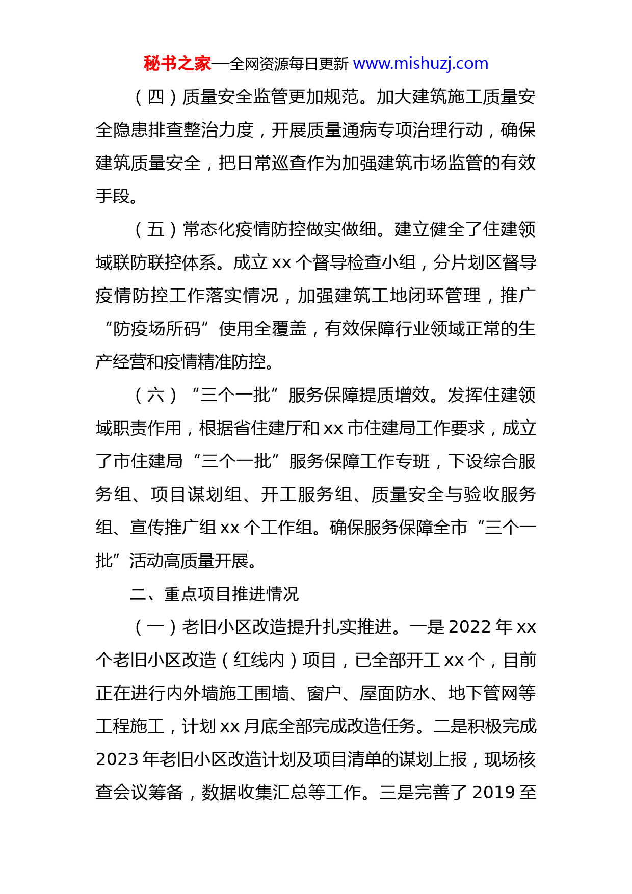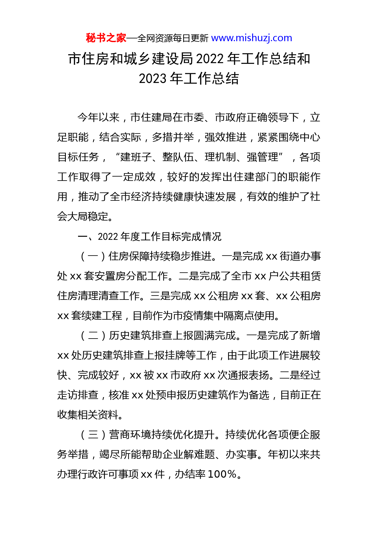 秘书之家—全网资源每日更新www.mishuzj.com市住房和城乡建设局2022年工作总结和2023年工作总结今年以来,市住建局在市委、市政府正确领导下,立足职能,结合实际,多措并举,强效推进,紧紧围绕中心目标任务,“建班子、整队伍、理机制、强管理”,各项工作取得了一定成效,较好的发挥出住建部门的职能作用,推动了全市经济持续健康快速发展,有效的维护了社会大局稳定。一、2022年度工作目标完成情况(一)住房保障持续稳步推进。一是完成xx街道办事处xx套安置房分配工作。二是完成了全市xx户公共租赁住房清理清查工作。三是完成xx公租房xx套、xx公租房xx套续建工程,目前作为市疫情集中隔离点使用。(二)历史建筑排查上报圆满完成。一是完成了新增xx处历史建筑排查上报挂牌等工作,由于此项工作进展较快、完成较好,xx被xx市政府xx次通报表扬。二是经过走访排查,核准xx处预申报历史建筑作为备选,目前正在收集相关资料。(三)营商环境持续优化提升。持续优化各项便企服务举措,竭尽所能帮助企业解难题、办实事。年初以来共办理行政许可事项xx件,办结率100%。秘书之家—全网资源每日更新www.mishuzj.com(四)质量安全监管更加规范。加大建筑施工质量安全隐患排查整治力度,开展质量通病专项治理行动,确保建筑质量安全,把日常巡查作为加强建筑市场监管的有效手段。(五)常态化疫情防控做实做细。建立健全了住建领域联防联控体系。成立xx个督导检查小组,分片划区督导疫情防控工作落实情况,加强建筑工地闭环管理,推广“防疫场所码”使用全覆盖,有效保障行业领域正常的生产经营和疫情精准防控。(六)“三个一批”服务保障提质增效。发挥住建领域职责作用,根据省住建厅和xx市住建局工作要求,成立了市住建局“三个一批”服务保障工作专班,下设综合服务组、项目谋划组、开工服务组、质量安全与验收服务组、宣传推广组xx个工作组。确保服务保障全市“三个一批”活动高质量开展。二、重点项目推进情况(一)老旧小区改造提升扎实推进。一是2022年xx个老旧小区改造(红线内)项目,已全部开工xx个,目前正在进行内外墙施工围墙、窗户、屋面防水、地下管网等工程施工,计划xx月底全部完成改造任务。二是积极完成2023年老旧小区改造计划及项目清单的谋划上报,现场核查会议筹备,数据收集汇总等工作。三是完善了2019至秘书之家—全网资源每日更新www.mishuzj.com2022年老旧小区一区一档资料库及PPT电子档案归整,定期更新老旧小区改造网上直报平台数据,数据及时性、准确性进一步提高。(二)农村危房改造成效不断巩固。围绕住房安全有保障,建立了农村危房改造动态清零长效工作机制,2022年新增危房改造户xx户,已全部完成改造。(三)信访积案突出问题有效化解。扎实开展了问题楼盘、重复信访积案处置化解工作。省交办不动产办证类问题楼盘xx个已成功化解销号;停工烂尾类问题楼盘xx个,目前均已完成建设,并向业主交房,已经上报化解。目前省市交办的xx件城乡建设和自然资源领域重复信访积案,已于9月底全部化解完毕。5月25日,xx市工作专班重点督导时对xx市短期化解成效表示了肯定。(四)房屋建筑安全隐患排查整治快速推进。本着“宁早勿晚、压茬推进”的原则,通过加强宣传引导、部门协调联动、健全工作台账、强化督查指导等措施,排查整治工作取得阶段性成效。一是我市现有房屋总量xx栋(户),已排查系统录入xx栋(户),其中“三类”房屋xx栋(户),排查出存在安全隐患的房屋xx栋,目前已全部整改完毕。排查工作现已全面完成。二是全市经营性自建房安全评估鉴定工作已全面展开,目前正在有序推进。秘书之家—全网资源每日更新www.mishuzj.com(五)防水总部经济成果显著。截至2022年9月底,我市新注册防水企业(含回迁)xx家。根据市税务局最新统计数据,1至9月份我市防水企业已完成纳税xx亿元。(六)招商引资工作进展迅速。一是xx中建泓源防水材料有限公司投资1亿元,目前落户xx防水产业园,设备已安装完毕,已于9月21日正式开始生产。二是xx渗科技有限公司固定资产投资xx亿元,已落户先进制造业开发区,目前正在进行环评工作,今年底可投产。三是xx胶业集团有限公司已于今年5月份在xx市注册分公司,主营销售业务,目前已正式开始运营。四是北新建材投资项目正在洽谈中,拟于近期邀请北新建材有关领导到xx参观考察。共同探讨合作模式,尽快推动合作项目的实质性落地,实现互利共赢。五是xx庆霖防水公司目前正在抓紧办理回迁手续。三、取得的市级以上荣誉2022年,市住建局被xx市委市政府表彰为“2021年度信访工作先进单位”。取得xx市住建局“建设工程质量安全暨扬尘防控工作先进单位”。获得xx市“关心支持国防建设先进单位”“信息宣传工作先进单位”“提案办理先进单位”。2023年工作安排秘书之家—全网资源每日更新www.mishuzj.com一、谋划和推进的重点项目(一)积极启动人防指挥所建设。按照2021年3月xx省委巡视我市人防工程建设管理工作及反馈整改文件通知,要求县级人防指挥所项目尽快建设。2005年至今,我市人防共征收易地建设费xx亿元。近年来,随着基础设施建设的增加,每年可征收人防易地建设费xx多万元,根据自然资源和规划局初步设计概算该工程为xx万元。利用每年新收缴人防易地建设费,也可足额保证人防指挥
