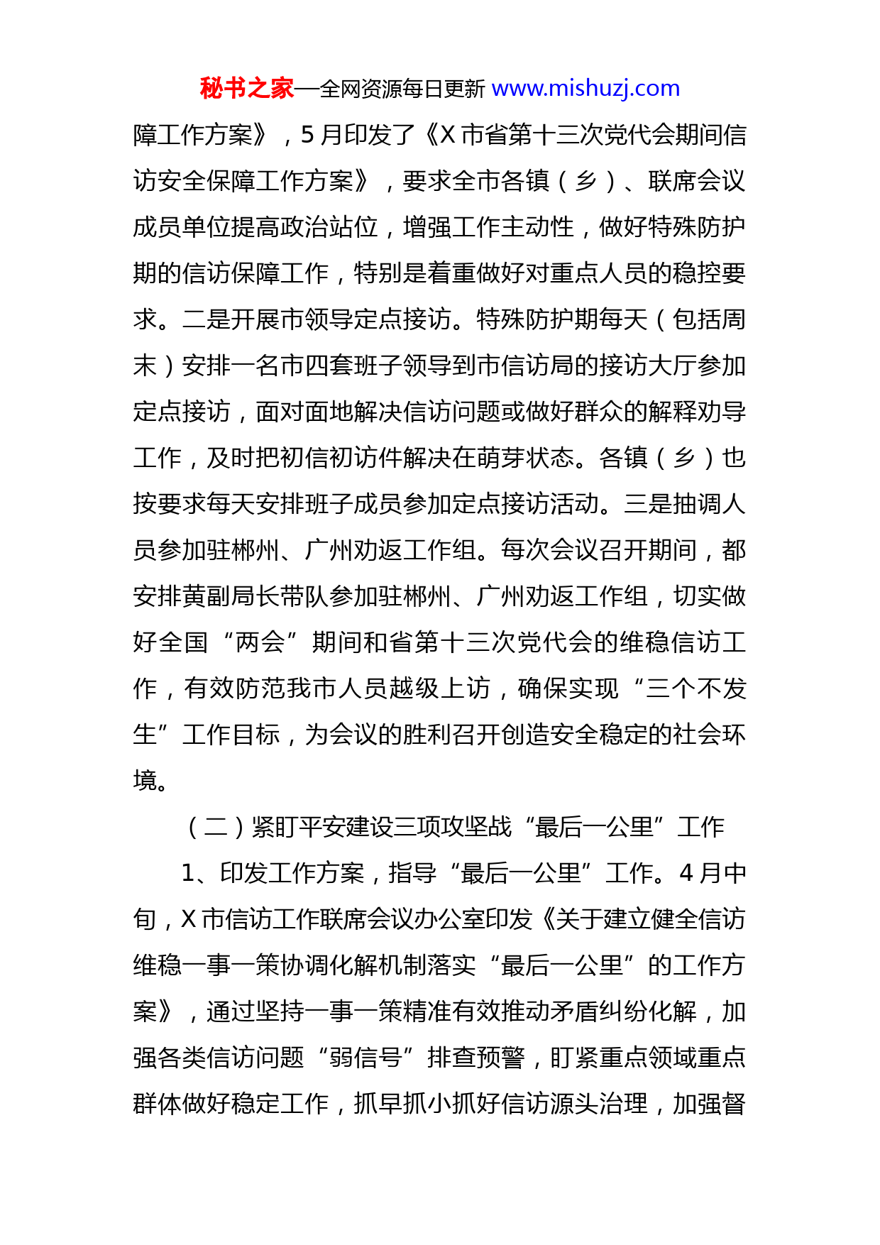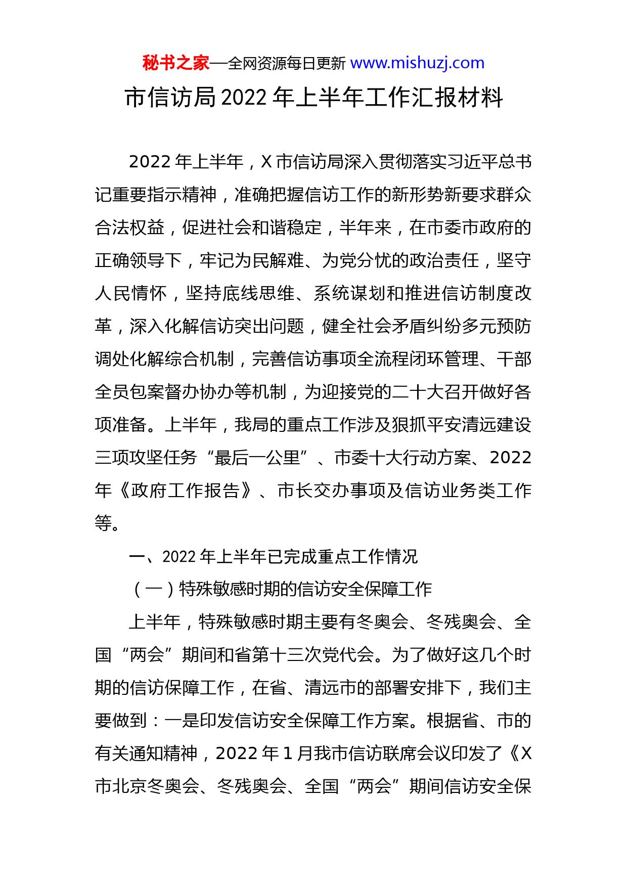 秘书之家—全网资源每日更新www.mishuzj.com市信访局2022年上半年工作汇报材料2022年上半年,X市信访局深入贯彻落实习近平总书记重要指示精神,准确把握信访工作的新形势新要求群众合法权益,促进社会和谐稳定,半年来,在市委市政府的正确领导下,牢记为民解难、为党分忧的政治责任,坚守人民情怀,坚持底线思维、系统谋划和推进信访制度改革,深入化解信访突出问题,健全社会矛盾纠纷多元预防调处化解综合机制,完善信访事项全流程闭环管理、干部全员包案督办协办等机制,为迎接党的二十大召开做好各项准备。上半年,我局的重点工作涉及狠抓平安清远建设三项攻坚任务“最后一公里”、市委十大行动方案、2022年《政府工作报告》、市长交办事项及信访业务类工作等。一、2022年上半年已完成重点工作情况(一)特殊敏感时期的信访安全保障工作上半年,特殊敏感时期主要有冬奥会、冬残奥会、全国“两会”期间和省第十三次党代会。为了做好这几个时期的信访保障工作,在省、清远市的部署安排下,我们主要做到:一是印发信访安全保障工作方案。根据省、市的有关通知精神,2022年1月我市信访联席会议印发了《X市北京冬奥会、冬残奥会、全国“两会”期间信访安全保秘书之家—全网资源每日更新www.mishuzj.com障工作方案》,5月印发了《X市省第十三次党代会期间信访安全保障工作方案》,要求全市各镇(乡)、联席会议成员单位提高政治站位,增强工作主动性,做好特殊防护期的信访保障工作,特别是着重做好对重点人员的稳控要求。二是开展市领导定点接访。特殊防护期每天(包括周末)安排一名市四套班子领导到市信访局的接访大厅参加定点接访,面对面地解决信访问题或做好群众的解释劝导工作,及时把初信初访件解决在萌芽状态。各镇(乡)也按要求每天安排班子成员参加定点接访活动。三是抽调人员参加驻郴州、广州劝返工作组。每次会议召开期间,都安排黄副局长带队参加驻郴州、广州劝返工作组,切实做好全国“两会”期间和省第十三次党代会的维稳信访工作,有效防范我市人员越级上访,确保实现“三个不发生”工作目标,为会议的胜利召开创造安全稳定的社会环境。(二)紧盯平安建设三项攻坚战“最后一公里”工作1、印发工作方案,指导“最后一公里”工作。4月中旬,X市信访工作联席会议办公室印发《关于建立健全信访维稳一事一策协调化解机制落实“最后一公里”的工作方案》,通过坚持一事一策精准有效推动矛盾纠纷化解,加强各类信访问题“弱信号”排查预警,盯紧重点领域重点群体做好稳定工作,抓早抓小抓好信访源头治理,加强督秘书之家—全网资源每日更新www.mishuzj.com查问效确保各项工作落地落实。另外,为加强对进京上访工作的落实,印发《关于X市开展2022年进京上访专项治理行动工作方案》,做好我市群众进京上访治理工作,确保我市群众进京上访零增量、减存量,一是通过实施挂牌督办,有效治理化解;二是深化闭环管理,提升化解效能;三是落实提级包案,压实包案责任等措施进行推进。提出了4点工作要求,一是加强基层治理,把解决问题化解矛盾作为工作落脚点;二是规范业务办理,高度重视初信初访工作;三是控制数量指标,严防发生进京上访;四是强化督查督办,严肃倒查问责。为做好此项工作,我局蔡晓君副局长和网信办信组组长杨欣共同负责此项工作,做到及时报送进展情况、整改存在问题,随时接受清远市督查组的督查。2、对清远市督查组的反馈问题进行整改。4月11日,清远市平安建设“最后一公里”督查组到我市督查相关工作,并召开会议专题研究第二批重复信访事项进展情况,指出化解的难点,并提出相关工作要求。4月22日止,九陂镇完成了整改工作:完善镇级信访服务中心相关标识指引,落实工作人员日常坐班接访制度,方便群众来访。X市信访局在全市举一反三抓好同样问题的落实,全面压实镇级信访工作联席会议办公室责任,坚决扛起政治责任。秘书之家—全网资源每日更新www.mishuzj.com(三)领导重视,亲自部署信访工作1、市委、市政府领导开展调研督导工作。2月25日,X副书记、X副市长和X副市长到市信访局对近期重点信访工作等进行调研督导,并召开座谈会。会上,由X局长汇报存量满意度件、重复信访治理等工作情况。会议强调,要认真分析当前全市信访工作形势,对全市信访不稳定因素及早全面排查,加强分析研判,层层压实责任,工作落实到单位及个人,落实领导包案,切实把信访矛盾解决在各镇(乡)各部门,工作排名靠后的镇(乡)、部门要表态或被联席办约谈,将信访工作作为考核的重要指标。在5月的《信访工作条例》宣传启动活动仪式上,X副书记、綦鸿伟常委、X副市长和X副市长都参加启动仪式,并强调“各镇(乡)、各部门要把学习宣传贯彻《条例》作为一项重要政治任务,在全社会营造办事依法、遇事找法、解决问题用法、化解矛盾靠法的良好环境”,确保《条例》宣传取得实效;要紧扣宣传月活动主题,守正创新,认真总结推广好经验好做法,发掘信访好故事,传播信访好声音,凝聚形成了解民情、集中民智、维护民利、凝聚民心工作的正能量。2、每月召开信访维稳工作研判会。3月2日,市信访工作联席会议办公室印发《关于深入开展社会矛盾和信访问题排查化解工作的通知》给联席会议办公室成员单位