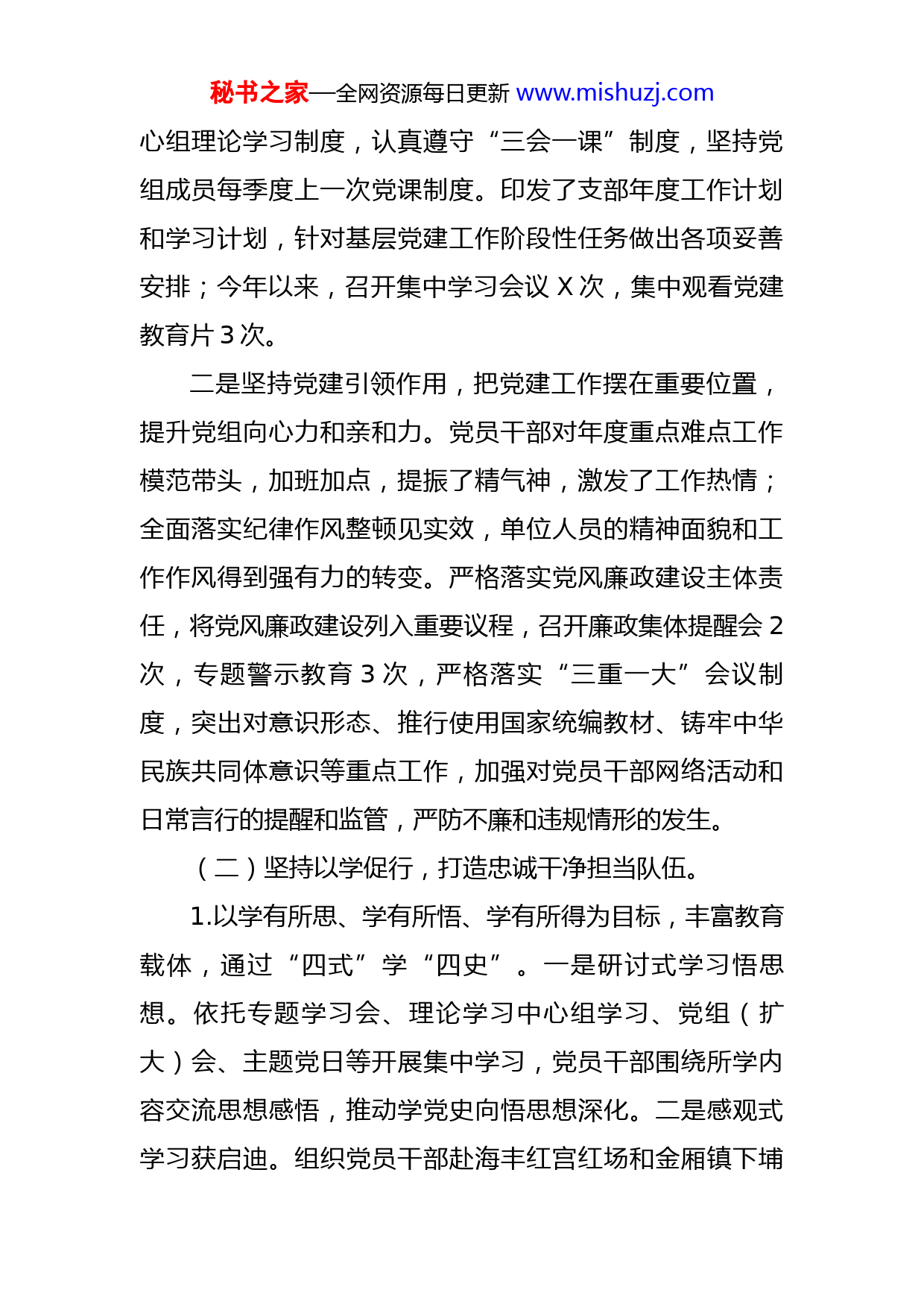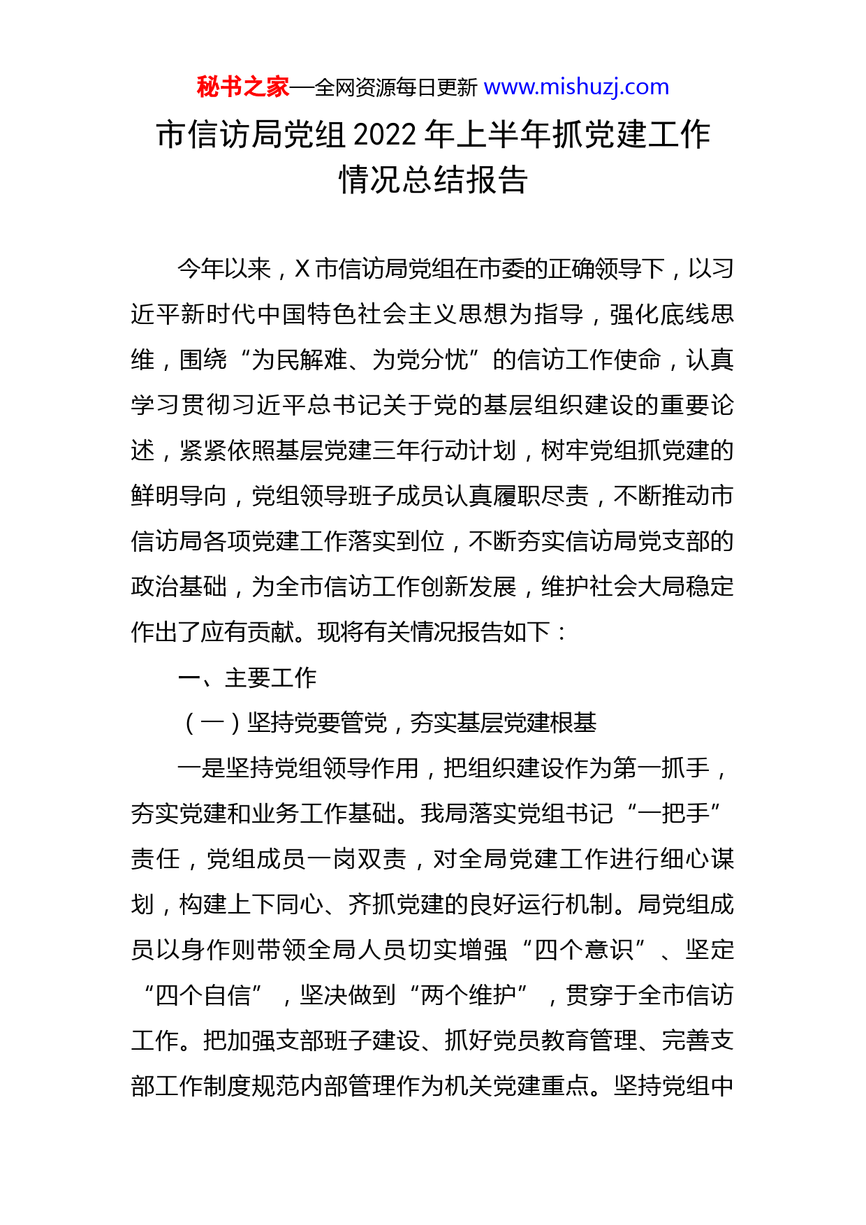 秘书之家—全网资源每日更新www.mishuzj.com市信访局党组2022年上半年抓党建工作情况总结报告今年以来,X市信访局党组在市委的正确领导下,以习近平新时代中国特色社会主义思想为指导,强化底线思维,围绕“为民解难、为党分忧”的信访工作使命,认真学习贯彻习近平总书记关于党的基层组织建设的重要论述,紧紧依照基层党建三年行动计划,树牢党组抓党建的鲜明导向,党组领导班子成员认真履职尽责,不断推动市信访局各项党建工作落实到位,不断夯实信访局党支部的政治基础,为全市信访工作创新发展,维护社会大局稳定作出了应有贡献。现将有关情况报告如下:一、主要工作(一)坚持党要管党,夯实基层党建根基一是坚持党组领导作用,把组织建设作为第一抓手,夯实党建和业务工作基础。我局落实党组书记“一把手”责任,党组成员一岗双责,对全局党建工作进行细心谋划,构建上下同心、齐抓党建的良好运行机制。局党组成员以身作则带领全局人员切实增强“四个意识”、坚定“四个自信”,坚决做到“两个维护”,贯穿于全市信访工作。把加强支部班子建设、抓好党员教育管理、完善支部工作制度规范内部管理作为机关党建重点。坚持党组中秘书之家—全网资源每日更新www.mishuzj.com心组理论学习制度,认真遵守“三会一课”制度,坚持党组成员每季度上一次党课制度。印发了支部年度工作计划和学习计划,针对基层党建工作阶段性任务做出各项妥善安排;今年以来,召开集中学习会议X次,集中观看党建教育片3次。二是坚持党建引领作用,把党建工作摆在重要位置,提升党组向心力和亲和力。党员干部对年度重点难点工作模范带头,加班加点,提振了精气神,激发了工作热情;全面落实纪律作风整顿见实效,单位人员的精神面貌和工作作风得到强有力的转变。严格落实党风廉政建设主体责任,将党风廉政建设列入重要议程,召开廉政集体提醒会2次,专题警示教育3次,严格落实“三重一大”会议制度,突出对意识形态、推行使用国家统编教材、铸牢中华民族共同体意识等重点工作,加强对党员干部网络活动和日常言行的提醒和监管,严防不廉和违规情形的发生。(二)坚持以学促行,打造忠诚干净担当队伍。1.以学有所思、学有所悟、学有所得为目标,丰富教育载体,通过“四式”学“四史”。一是研讨式学习悟思想。依托专题学习会、理论学习中心组学习、党组(扩大)会、主题党日等开展集中学习,党员干部围绕所学内容交流思想感悟,推动学党史向悟思想深化。二是感观式学习获启迪。组织党员干部赴海丰红宫红场和金厢镇下埔秘书之家—全网资源每日更新www.mishuzj.com村、陆河谢非故居等地参观学习,以重温入党誓词、聆听革命故事、廉政警示教育等方式感悟党的历史,汲取奋进力量。三是共享式学习入人心。开办身边的“党史学堂”,将“党史天天学”载入信访大厅多媒体屏幕,和信访群众一起学党史;四是沉浸式学习提实效。引导干部职工及其家人积极参加线上、线下党史知识竞赛,共学党史,让红色基因、革命薪火代代传承。2.将“我为群众办实事”实践活动与了解民情、集中民智、维护民利、凝聚民心各项工作有机结合,全力化解信访矛盾纠纷、维护群众合法权益。一是信访事项办理保持“加速度”。健全完善信、访、网、电、视频“五位一体”诉求平台,持续提高信访事项流转、受理、办理、办结效率。信访事项受理率、办结率达到100%,群众满意度逐步提高。二是信访积案化解按下“快进键”。深入推进重复信访治理、化解信访积案专项行动,加快国家交办的第一批X宗、第二批X宗信访积案攻坚化解,切实维护群众合法权益。三是组织开展信访法律法规宣传活动,采取包括网络媒体、户外广告、发放宣传资料和送法上门等多种方式进行宣传,切实提高群众依法信访观念和理性维权意识,引导群众依法逐级信访维护信访秩序,推进信访工作规范化、法治化建设。四是推动局党员干部积极参与“返乡走亲”、“双报到双服务”、卫生网格化管理等活秘书之家—全网资源每日更新www.mishuzj.com动。“学党史办实事”学习教育活动开展以来,市信访局累计收到群众送来锦旗X面,感谢信X封。(三)坚持服务意识,提升信访矛盾化解效能局全体党员干部坚持以维护社会稳定为己任,发挥党组和党员的先锋模范作用。认真贯彻落实上级信访部门“大督查、大接访、大调解”工作要求,拟定了市领导常态化接访下访制度,建立了信访部门巡回接访制度,定期下基层接访,推动“精准务实”的走访接访,搭起了新时期亲近党群干群关系的连心桥,不断丰富党的群众工作实质内涵。今年以来,我市信访形势平稳可控,持续向好;各重要节点信访特殊防护期实现“三个不发生”。二、存在的问题我局党建工作有序开展,各项党建业务逐步规范化、制度化、常态化,取得了一定成效,但由于一些客观缘由,党建工作还存在一些短板和薄弱环节。一是抓党建仍存在时松时紧的情况。偶尔有“说起来重要、做起来次要、忙起来不要”的现象,主要表现在信访特殊防护期间和上级督查考核期间,未能充分克服各种工作因素影响,对党建工作抓得不够实不够紧。二是党内政治生活的严肃程度有待提升。具体表现在专题民主生活会和组织生活会批评和自我批评对问题触及不深,火药味不
