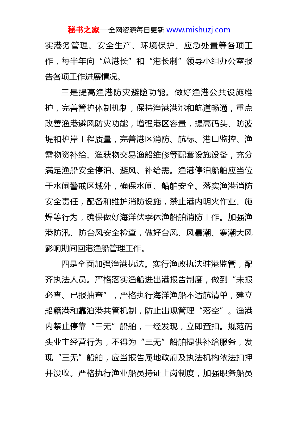 秘书之家—全网资源每日更新www.mishuzj.com市全面推行渔港“港长制”工作汇报材料2022年以来,X市以习近平新时代中国特色社会主义思想为指导,牢固树立新发展理念,创新渔港综合管理体制机制,加快构建“布局一体、管理标准、信息共享、全域覆盖”的渔港管理新模式,实现“依港管船、依港管人、依港管渔”的目标,逐步形成绿色高效、安全规范、融合开放、资源节约、环境友好的现代渔业发展新格局。一是建立联席会议制度。领导小组定期听取“港长制”工作推进情况,研究解决工作中遇到的重点难点问题,督促成员单位履行相关职责。领导小组办公室负责协调组织各方力量实施联管联控,制定年度工作计划和考核办法,推动落实各项任务。二是统筹渔港规划建设和管理。市级总港长负责统筹渔港规划建设,落实好《全国沿海渔港建设规划(2018-2025年)》相关任务求,科学规划渔港布局、规模和功能,实现渔港建设与渔船数量相匹配,推动渔港集约发展、渔船集中停靠;协调渔港综合管理,明确渔港所有权、使用权、经营权和监督管理权,组织制定颁布渔港港章,明确渔港范围及港界,根据需设立界碑(标);理顺渔港建设管理体制,落实主体责任,督促乡镇“港长”履职,推进渔港振兴发展。设立渔港港务管理机构,组织落秘书之家—全网资源每日更新www.mishuzj.com实港务管理、安全生产、环境保护、应急处置等各项工作,每半年向“总港长”和“港长制”领导小组办公室报告各项工作进展情况。三是提高渔港防灾避险功能。做好渔港公共设施维护,完善管护体制机制,保持渔港港池和航道畅通,重点改善渔港避风防灾功能,增强港区容量,提高码头、防波堤和护岸工程质量,完善港区消防、航标、港口监控、渔需物资补给、渔获物交易渔船维修等配套设施设备,充分满足渔船安全停泊、避风、补给需。渔港停泊船舶应当位于水闸警戒区域外,确保水闸、船舶安全。落实渔港消防安全责任,配备和维护消防设施,禁止港内明火作业、施焊等行为,确保做好海洋伏季休渔船舶消防工作。加强渔港防汛、防台风安全检查,做好台风、风暴潮、寒潮大风影响期间回港渔船管理工作。四是全面加强渔港执法。实行渔政执法驻港监管,配齐执法人员。严格落实渔船进出港报告制度,做到“未报必查、已报抽查”,严格执行海洋渔船不适航清单,建立船籍港和靠泊港共管机制,防止出现管理“落空”。渔港内禁止停靠“三无”船舶,一经发现,立即查扣。规范码头业主经营行为,不得为“三无”船舶提供补给服务,发现“三无”船舶,应当报告属地政府及执法机构依法扣押并没收。严格执行渔业船员持证上岗制度,加强职务船员秘书之家—全网资源每日更新www.mishuzj.com和普通船员配备情况检查,全面落实《海洋渔船船东落实安全生产主体责任重点事项清单》《海洋渔船船长落实安全生产直接责任重点事项清单》《海洋职务船员岗位职责》。对渔船恶劣天气出海生产、单船作业生产、海上关闭北斗定位装置的行为,责令渔船回港停航,船长予以强制学习培训,并依法予以从重处罚。五是加强渔港污染防治。统筹推进渔港经济发展和环境保护,合理规划渔港区域内产业布局,加大渔港环境综合整治力度,加强渔船油污水、生活污水、垃圾等收集或处理设施的配备,强化正常使用,严禁直接排放。提高含油污水、化学品洗舱水等接收处置能力及污染事故应急能力,完善区域污水管网、垃圾转运服务体系,将渔港环卫工作纳入当地城乡环卫体系。下一步,X市将充分发挥渔港在渔业资源管理、安全监管和渔区振兴中的枢纽作用,探索构建以“港长制”为统领的渔船渔港管理体制,全面推行“港长制”,实现管理力量协同驻港监管,探索建立渔获物总量管理和定港上岸可追溯制度,构建布局合理、产权清晰、功能完备、管理先进、生态良好的现代渔港体系。