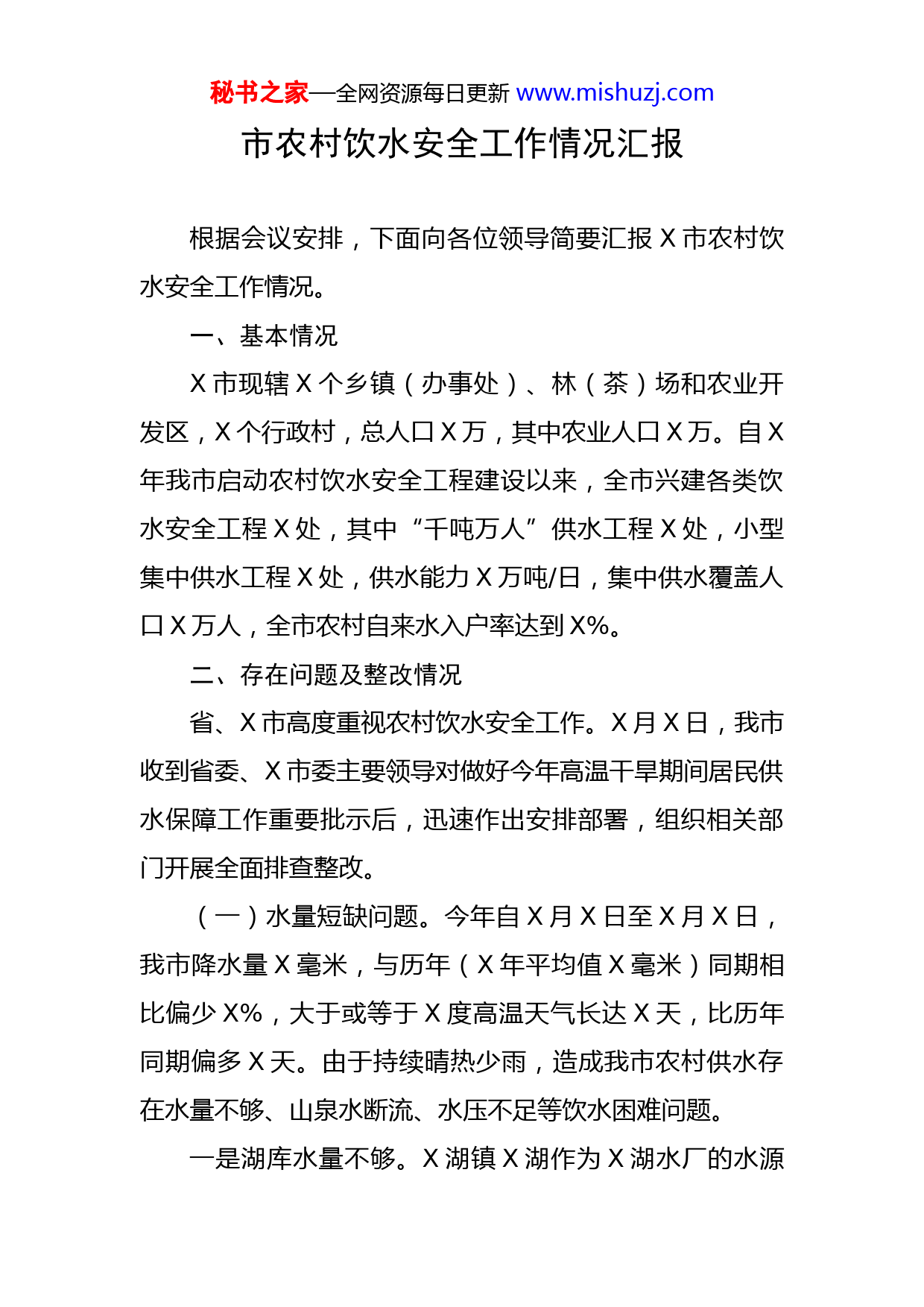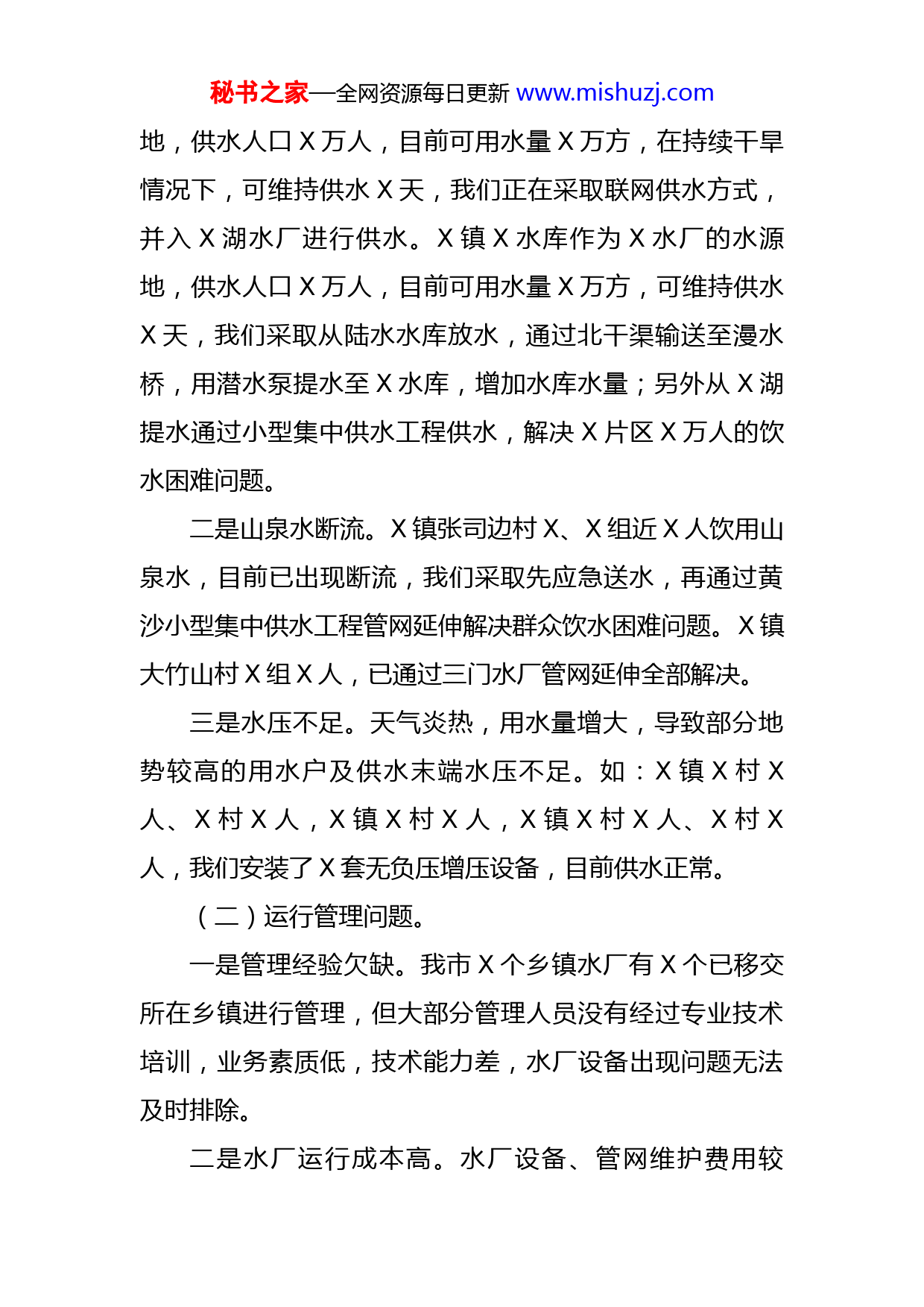 秘书之家—全网资源每日更新www.mishuzj.com市农村饮水安全工作情况汇报根据会议安排,下面向各位领导简要汇报X市农村饮水安全工作情况。一、基本情况X市现辖X个乡镇(办事处)、林(茶)场和农业开发区,X个行政村,总人口X万,其中农业人口X万。自X年我市启动农村饮水安全工程建设以来,全市兴建各类饮水安全工程X处,其中“千吨万人”供水工程X处,小型集中供水工程X处,供水能力X万吨/日,集中供水覆盖人口X万人,全市农村自来水入户率达到X%。二、存在问题及整改情况省、X市高度重视农村饮水安全工作。X月X日,我市收到省委、X市委主要领导对做好今年高温干旱期间居民供水保障工作重要批示后,迅速作出安排部署,组织相关部门开展全面排查整改。(一)水量短缺问题。今年自X月X日至X月X日,我市降水量X毫米,与历年(X年平均值X毫米)同期相比偏少X%,大于或等于X度高温天气长达X天,比历年同期偏多X天。由于持续晴热少雨,造成我市农村供水存在水量不够、山泉水断流、水压不足等饮水困难问题。一是湖库水量不够。X湖镇X湖作为X湖水厂的水源秘书之家—全网资源每日更新www.mishuzj.com地,供水人口X万人,目前可用水量X万方,在持续干旱情况下,可维持供水X天,我们正在采取联网供水方式,并入X湖水厂进行供水。X镇X水库作为X水厂的水源地,供水人口X万人,目前可用水量X万方,可维持供水X天,我们采取从陆水水库放水,通过北干渠输送至漫水桥,用潜水泵提水至X水库,增加水库水量;另外从X湖提水通过小型集中供水工程供水,解决X片区X万人的饮水困难问题。二是山泉水断流。X镇张司边村X、X组近X人饮用山泉水,目前已出现断流,我们采取先应急送水,再通过黄沙小型集中供水工程管网延伸解决群众饮水困难问题。X镇大竹山村X组X人,已通过三门水厂管网延伸全部解决。三是水压不足。天气炎热,用水量增大,导致部分地势较高的用水户及供水末端水压不足。如:X镇X村X人、X村X人,X镇X村X人,X镇X村X人、X村X人,我们安装了X套无负压增压设备,目前供水正常。(二)运行管理问题。一是管理经验欠缺。我市X个乡镇水厂有X个已移交所在乡镇进行管理,但大部分管理人员没有经过专业技术培训,业务素质低,技术能力差,水厂设备出现问题无法及时排除。二是水厂运行成本高。水厂设备、管网维护费用较秘书之家—全网资源每日更新www.mishuzj.com高,人员工资支出较多,而目前收取的水费难以保障正常的经营运转,大多数水厂盈利困难,甚至出现亏损经营。三是维修养护不到位。农村供水工程已运行X多年,部分管道损坏或破裂,出现跑、冒、滴、漏现象,加上维修不到位,水损偏高,水费回收率低,难以保证工程持续良性运行。我市已成立水务集团,整合资源和技术优势,将乡镇水厂纳入统一经营管理,实行城乡供水一体化,使农村饮水安全工程走上一条管理专业化、经营企业化、服务社会化的良性运行轨道。(三)群众信访问题。X月X日,有群众向省饮水办反映X桥镇供水水质差的问题。我们得到信息后,安排市饮水办与X桥镇到现场进行调查处理。主要原因:一是镇区正在进行管网改造,施工过程中发生损坏水管现象,造成供水二次污染;二是X桥水厂还尚未实施巩固提升工程建设。迅速组织水厂技术人员对镇区供水管道进行了排污处理,水质恢复正常。我市计划在X年对X桥水厂实施巩固提升工程建设。今后,再接到群众反映饮水问题,我们将即知即改、立行立改,让群众喝上安全的放心水。三、下步工作打算一是在目前我市无有效降雨,旱情得不到缓解,饮水水源地水量偏少的情况下,我们将按照“先生活、后生秘书之家—全网资源每日更新www.mishuzj.com产”的原则,科学分析预测,密切跟踪水量变化,做好精准调度,确保饮水安全。对饮水特别困难的地区,采用车辆送水,保障每家每户每一位群众都有水喝。二是加强农村供水工程日常监管,定期组织技术力量,对水源、水质、管网等关键环节进行巡查,及时解决处理好群众的饮水问题。三是加快巩固提升工程建设,加大资金投入,组织实施《X市农村饮水安全巩固提升工程三年行动计划》,确保按时按质按量完成任务,进一步提升供水安全保障水平。