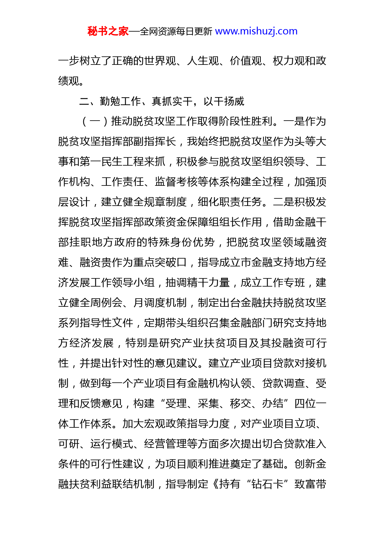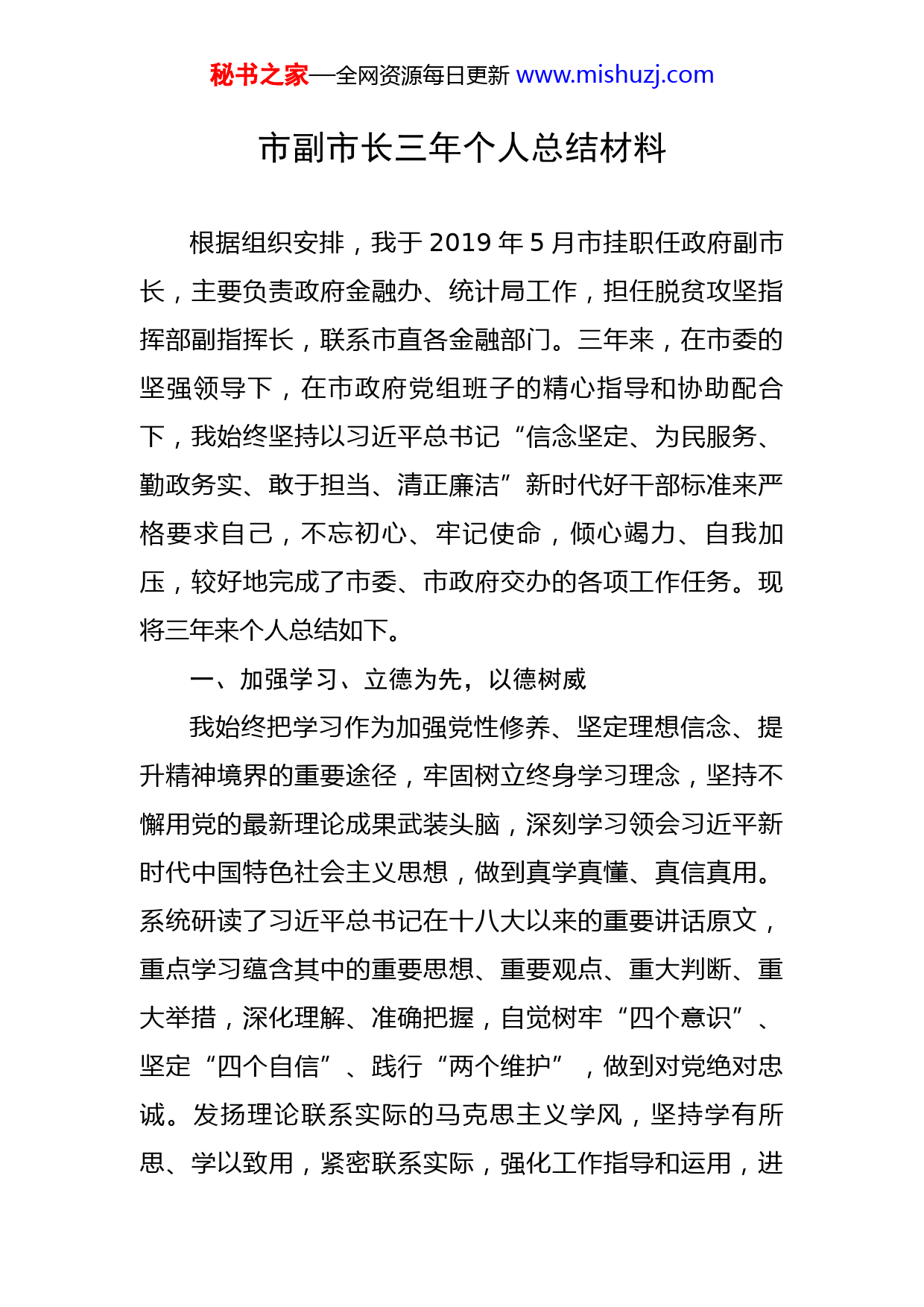 秘书之家—全网资源每日更新www.mishuzj.com市副市长三年个人总结材料根据组织安排,我于2019年5月市挂职任政府副市长,主要负责政府金融办、统计局工作,担任脱贫攻坚指挥部副指挥长,联系市直各金融部门。三年来,在市委的坚强领导下,在市政府党组班子的精心指导和协助配合下,我始终坚持以习近平总书记“信念坚定、为民服务、勤政务实、敢于担当、清正廉洁”新时代好干部标准来严格要求自己,不忘初心、牢记使命,倾心竭力、自我加压,较好地完成了市委、市政府交办的各项工作任务。现将三年来个人总结如下。一、加强学习、立德为先,以德树威我始终把学习作为加强党性修养、坚定理想信念、提升精神境界的重要途径,牢固树立终身学习理念,坚持不懈用党的最新理论成果武装头脑,深刻学习领会习近平新时代中国特色社会主义思想,做到真学真懂、真信真用。系统研读了习近平总书记在十八大以来的重要讲话原文,重点学习蕴含其中的重要思想、重要观点、重大判断、重大举措,深化理解、准确把握,自觉树牢“四个意识”、坚定“四个自信”、践行“两个维护”,做到对党绝对忠诚。发扬理论联系实际的马克思主义学风,坚持学有所思、学以致用,紧密联系实际,强化工作指导和运用,进秘书之家—全网资源每日更新www.mishuzj.com一步树立了正确的世界观、人生观、价值观、权力观和政绩观。二、勤勉工作、真抓实干,以干扬威(一)推动脱贫攻坚工作取得阶段性胜利。一是作为脱贫攻坚指挥部副指挥长,我始终把脱贫攻坚作为头等大事和第一民生工程来抓,积极参与脱贫攻坚组织领导、工作机构、工作责任、监督考核等体系构建全过程,加强顶层设计,建立健全规章制度,细化职责任务。二是积极发挥脱贫攻坚指挥部政策资金保障组组长作用,借助金融干部挂职地方政府的特殊身份优势,把脱贫攻坚领域融资难、融资贵作为重点突破口,指导成立市金融支持地方经济发展工作领导小组,抽调精干力量,成立工作专班,建立健全周例会、月调度机制,制定出台金融扶持脱贫攻坚系列指导性文件,定期带头组织召集金融部门研究支持地方经济发展,特别是研究产业扶贫项目及其投融资可行性,并提出针对性的意见建议。建立产业项目贷款对接机制,做到每一个产业项目有金融机构认领、贷款调查、受理和反馈意见,构建“受理、采集、移交、办结”四位一体工作体系。加大宏观政策指导力度,对产业项目立项、可研、运行模式、经营管理等方面多次提出切合贷款准入条件的可行性建议,为项目顺利推进奠定了基础。创新金融扶贫利益联结机制,指导制定《持有“钻石卡”致富带秘书之家—全网资源每日更新www.mishuzj.com头人精准带动建档立卡贫困户的实施意见》,建立钻石卡户与建档立卡贫困户利益联结机制。牵头制定《“三农”信贷风险补偿基金管理指导意见》,建立“风险补偿基金+产业扶贫项目+信贷”融资模式。组织召开非公企业与银行对接会。积极推进涉农贷款保证保险业务,扩大保险保障范围,拓展重大疾病保险、残疾保险、因病因伤死亡保险等保险业务,将建档立卡贫困人口纳入商业保险范围,切实防止脱贫群众因病因灾返贫。三是加大扶贫资金统筹整合、使用、绩效和监管力度,先后指导制定《统筹整合财政涉农资金使用方案》等系列规范文件,严格落实资金使用绩效主体责任,确保扶贫资金落到实处。(二)推动金融工作再上新台阶。一是坚持底线思维,出台金融监管系列政策举措,督促指导金融部门继续落实打好防范化解重大风险攻坚战行动方案及配套政策,完善金融风险监测、评估、预警和处置体系,加强金融风险研判及重点领域风险防控,强化宏观审慎管理,加大对融资2亿元以上企业的风险监测,加强互联网金融等薄弱环节监管,目前全市银行资产质量良好,地方法人金融机构稳健经营,近年来未发生一起金融风险事件,金融风险总体可控。稳妥处理地方政府债务风险,组织开展地方政府债务自查自纠,进一步梳理核实政府隐性债务,加强全口径债务统计监测,做到坚定、可控、有序、适度。二是秘书之家—全网资源每日更新www.mishuzj.com规范反洗钱反假币工作联席会议制度,组织召开联席会、表彰会、协商会,全力推动反洗钱各项工作。精心组织开展打击地下钱庄专项行动、逃税专项行动、跨境非法转移资金行动。加大反洗钱监管力度,建立银警联动假币监测站点,有效打击假币违法犯罪活动。三是建立健全市防范和处置非法集资工作领导小组,强化非法集资风险排查,严厉打击违法违规行为。规范社会信用体系建设联席会议制度,充实调整了领导小组并自己担任组长,加快推进社会诚信体系建设。四是深入推进金融供给侧结构性改革,加大金融对“三农”、扶贫等薄弱环节的支持力度,“三农”金融综合服务站挂牌运营,填补了金融服务的空白。加快推进支付环境建设,实现“乡乡有网点、村村有金融服务、户户有银行卡”的目标。(三)推动统计工作开启新征程。一是紧贴市委、市政府中心工作,指导统计部门针对当前经济社会发展的重点难点亮点,加强统计综合分析,深入揭示经济新常态下的新问题、新特征、新规律,科学研判全市经济社会发展的形势、走势和趋势,发挥好出主意、当参谋的职能作用,做到精准服务。二是扎实开展农业
