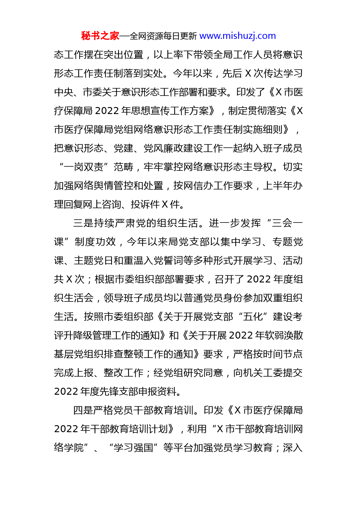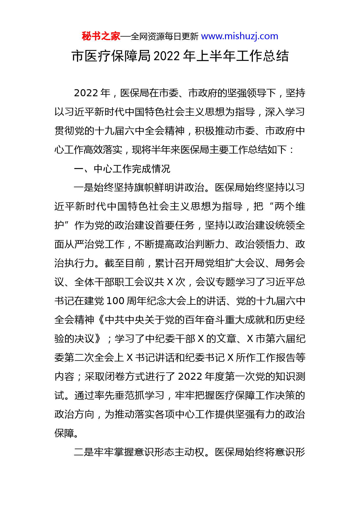 秘书之家—全网资源每日更新www.mishuzj.com市医疗保障局2022年上半年工作总结2022年,医保局在市委、市政府的坚强领导下,坚持以习近平新时代中国特色社会主义思想为指导,深入学习贯彻党的十九届六中全会精神,积极推动市委、市政府中心工作高效落实,现将半年来医保局主要工作总结如下:一、中心工作完成情况一是始终坚持旗帜鲜明讲政治。医保局始终坚持以习近平新时代中国特色社会主义思想为指导,把“两个维护”作为党的政治建设首要任务,坚持以政治建设统领全面从严治党工作,不断提高政治判断力、政治领悟力、政治执行力。截至目前,累计召开局党组扩大会议、局务会议、全体干部职工会议共X次,会议专题学习了习近平总书记在建党100周年纪念大会上的讲话、党的十九届六中全会精神《中共中央关于党的百年奋斗重大成就和历史经验的决议》;学习了中纪委干部X的文章、X市第六届纪委第二次全会上X书记讲话和纪委书记X所作工作报告等内容;采取闭卷方式进行了2022年度第一次党的知识测试。通过率先垂范抓学习,牢牢把握医疗保障工作决策的政治方向,为推动落实各项中心工作提供坚强有力的政治保障。二是牢牢掌握意识形态主动权。医保局始终将意识形秘书之家—全网资源每日更新www.mishuzj.com态工作摆在突出位置,以上率下带领全局工作人员将意识形态工作责任制落到实处。今年以来,先后X次传达学习中央、市委关于意识形态工作部署和要求。印发了《X市医疗保障局2022年思想宣传工作方案》,制定贯彻落实《X市医疗保障局党组网络意识形态工作责任制实施细则》,把意识形态、党建、党风廉政建设工作一起纳入班子成员“一岗双责”范畴,牢牢掌控网络意识形态主导权。切实加强网络舆情管控和处置,按网信办工作要求,上半年办理回复网上咨询、投诉件X件。三是持续严肃党的组织生活。进一步发挥“三会一课”制度功效,今年以来局党支部以集中学习、专题党课、主题党日和重温入党誓词等多种形式开展学习、活动共X次;根据市委组织部部署要求,召开了2022年度组织生活会,领导班子成员均以普通党员身份参加双重组织生活。按照市委组织部《关于开展党支部“五化”建设考评升降级管理工作的通知》和《关于开展2022年软弱涣散基层党组织排查整顿工作的通知》要求,严格按时间节点完成上报、整改工作;经党组研究同意,向机关工委提交2022年度先锋支部申报资料。四是严格党员干部教育培训。印发《X市医疗保障局2022年干部教育培训计划》,利用“X市干部教育培训网络学院”、“学习强国”等平台加强党员学习教育;深入秘书之家—全网资源每日更新www.mishuzj.com推进法治宣传教育,开展《医疗保障基金使用监督管理条例》集中学习,开展打击欺诈骗保宣传月活动,不断提升干部理论素质和业务水平,着力打造一支忠诚干净担当的医疗保障干部队伍。五是加强党风廉政建设。加强组织领导。出台《X市医疗保障局2022年党风廉政建设和反腐败工作要点》,制定领导班子、领导班子成员党风廉政建设责任清单,明确党风廉政建设责任和重点任务目标,上半年无违反政治纪律和政治规矩行为发生。抓实党风廉政建设。印发了《创建“清廉机关”实施方案》,上半年专题研究部署党风廉政建设X次,开展干部职工廉政谈话X人次,开展公职人员违规借贷谋利问题专项治理、深化整治领导干部违规收送礼金问题,并签订承诺书。抓实纪律作风建设。局班子带头落实中央八项规定及实施细则有关精神,狠抓干部作风建设,印发了《2022年深入开展X市清廉医保“三创建”实施方案》,不断优化医保经办服务,上半年未发生“吃拿卡要”等违反作风纪律问题。六是抓实人大政协工作。切实加强理论学习。医保局将人民代表大会制度、习近平总书记关于加强和改进人民政协工作的重要论述纳入党组中心组学习内容,提升干部职工理论水平。认真办理意见提案。2022年,我局共收到人大代表建议X条、政协委员提案X条,目前正按照规范秘书之家—全网资源每日更新www.mishuzj.com程序进行办理回复。主动接受人大评议监督。按照人大工作安排,我局主动配合支持人大常委会对医保工作的评议,认真落实人大常委会审议意见。认真办理群众信访工作。X月份开通与X热线合并的医保服务专线,密切关注群众对医疗保障工作的需求和提出的建议意见。共收到便民服务热线咨询、投诉案件X件,均按照政策规定和程序进行办理。二、主体业务工作完成情况一是完成2022年度基本医疗全覆盖任务。2022年度,我市城乡居民参保人数X人,城镇职工参保人数X人,总参保率X%。其中特定人群中纳入乡村振兴监测对象X人、稳定脱贫人口X人、特困供养人员X人、低保对象X人、重度残疾人X人参保全覆盖。资助参保人数X人,资助金额X万元,资助政策落实到位。全年城乡居民医保基金总收入约X万元,城镇职工统筹基金收入约X万元。二是持续推进医保支付方式改革。根据国家、省、市医疗保障局《DIP支付方式改革三年行动计划》,在我市推进区域点数法总额预算和按病种分值付费方式(DIP)改革。现已完成我市符合要求的X家定点医疗机构(二级医院及X万元以上一级医院)医保住院历史数据进行摸底,确定X市人民医院、X市第一中医医院为改革试点医院,做好了DIP支付方式改革前