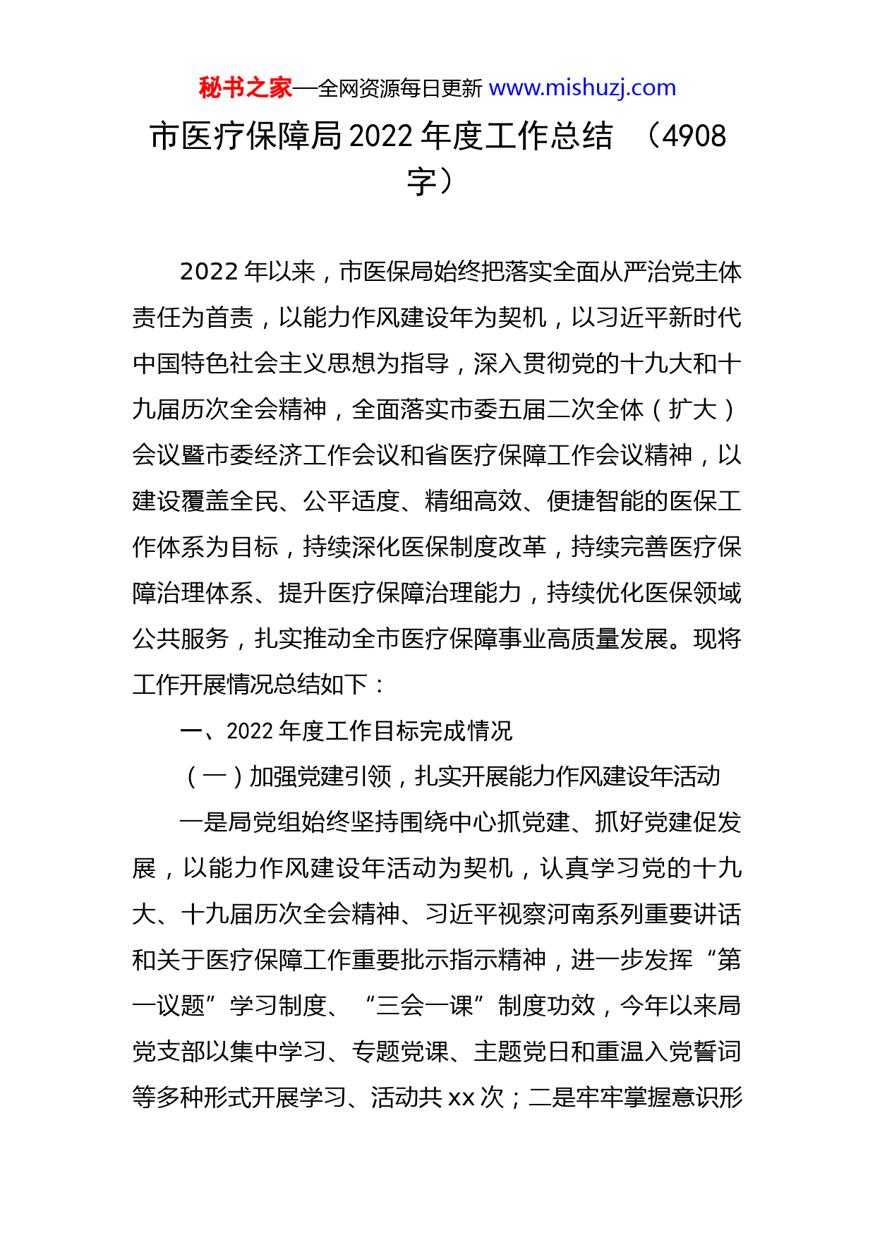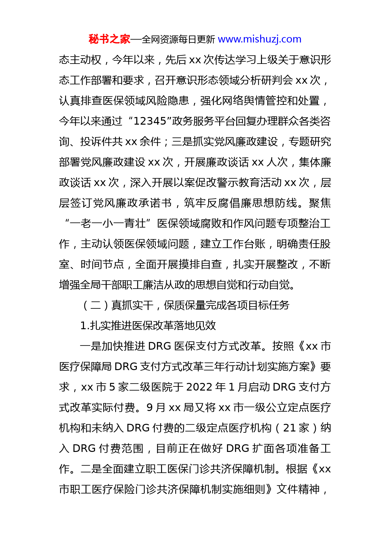 秘书之家—全网资源每日更新www.mishuzj.com市医疗保障局2022年度工作总结(4908字)2022年以来,市医保局始终把落实全面从严治党主体责任为首责,以能力作风建设年为契机,以习近平新时代中国特色社会主义思想为指导,深入贯彻党的十九大和十九届历次全会精神,全面落实市委五届二次全体(扩大)会议暨市委经济工作会议和省医疗保障工作会议精神,以建设覆盖全民、公平适度、精细高效、便捷智能的医保工作体系为目标,持续深化医保制度改革,持续完善医疗保障治理体系、提升医疗保障治理能力,持续优化医保领域公共服务,扎实推动全市医疗保障事业高质量发展。现将工作开展情况总结如下:一、2022年度工作目标完成情况(一)加强党建引领,扎实开展能力作风建设年活动一是局党组始终坚持围绕中心抓党建、抓好党建促发展,以能力作风建设年活动为契机,认真学习党的十九大、十九届历次全会精神、习近平视察河南系列重要讲话和关于医疗保障工作重要批示指示精神,进一步发挥“第一议题”学习制度、“三会一课”制度功效,今年以来局党支部以集中学习、专题党课、主题党日和重温入党誓词等多种形式开展学习、活动共xx次;二是牢牢掌握意识形秘书之家—全网资源每日更新www.mishuzj.com态主动权,今年以来,先后xx次传达学习上级关于意识形态工作部署和要求,召开意识形态领域分析研判会xx次,认真排查医保领域风险隐患,强化网络舆情管控和处置,今年以来通过“12345”政务服务平台回复办理群众各类咨询、投诉件共xx余件;三是抓实党风廉政建设,专题研究部署党风廉政建设xx次,开展廉政谈话xx人次,集体廉政谈话xx次,深入开展以案促改警示教育活动xx次,层层签订党风廉政承诺书,筑牢反腐倡廉思想防线。聚焦“一老一小一青壮”医保领域腐败和作风问题专项整治工作,主动认领医保领域问题,建立工作台账,明确责任股室、时间节点,全面开展摸排自查,扎实开展整改,不断增强全局干部职工廉洁从政的思想自觉和行动自觉。(二)真抓实干,保质保量完成各项目标任务1.扎实推进医保改革落地见效一是加快推进DRG医保支付方式改革。按照《xx市医疗保障局DRG支付方式改革三年行动计划实施方案》要求,xx市5家二级医院于2022年1月启动DRG支付方式改革实际付费。9月xx局又将xx市一级公立定点医疗机构和未纳入DRG付费的二级定点医疗机构(21家)纳入DRG付费范围,目前正在做好DRG扩面各项准备工作。二是全面建立职工医保门诊共济保障机制。根据《xx市职工医疗保险门诊共济保障机制实施细则》文件精神,秘书之家—全网资源每日更新www.mishuzj.com调整职工医保统筹基金和个人账户结构,将门诊费用纳入职工医保统筹基金支付范围,提高医保基金使用效率,逐步减轻参保人员门诊医疗费用负担。截止目前,我市已开通职工医保门诊共济定点医院xx个。三是继续做好药品耗材招采工作。今年我市共组织xx家定点医疗机构先后参加了国家组织药品以及耗材采购。一是药品方面。截止目前,共采购中选药品xx万片,平均降幅超过xx%,节约采购资金xx万元。二是医用耗材方面。认真落实国家和省际联盟医用耗材集中采购工作,涉及xx个批次xx类医用耗材。今年年初,我市有xx家连锁分店纳入药品集中采购范围,进一步扩大了药品集中采购的销售范围。目前,我市已开展集中带量采购药品xx个品种(xx个品规),医用耗材xx种,自国家集中采购药品和医用耗材在我市落地实施后节约药品和医用耗材费用xx亿左右,大幅减轻了群众就医和医保基金负担。四是健全和完善医疗保障待遇制度。严格落实国家医疗保障待遇清单制度,按照省市统一安排部署,清理了一批超出国家清单范围的政策,医疗保障制度设置、政策标准、基金支付范围等全部执行全市统一的规范标准。2.持续做好城乡居民基本医疗保险征缴工作一是统筹推进全民参加基本医疗保险,努力实现人人享有基本医疗保障权益。2022年全市城乡居民参保人数秘书之家—全网资源每日更新www.mishuzj.comxx万人,基金总量xx万元。城镇职工参保人数xx万人,职工医保基金累计征收xx万元,全市参保率xx%以上。二是落实各项待遇政策。截至2022年我市受益人次为xx万人,其中:门诊为xx万人次,住院为xx人次,基金支出xx万元。3.扎实开展“走流程办业务解难题”活动通过组织局班子成员、业务股室负责人亲身办、陪同办、进行线上、线下体验流程等方式开展“走流程办业务”活动,制定走流程事项xx项,对所有经办业务流程进行全面体检,找准“症结”,加以整改,切实解决群众服务痛点、堵点、难点问题。截至目前,已开展“走流程”活动xx次,发现问题xx个,立行立改xx个,制定有针对性的整改措施xx条。4.着力推动经办服务下沉专项工作根据我市实际,制定了《xx市医疗保障经办服务下沉工作方案》,市医保局着力推进医保经办服务下沉,构建全市统一的基层医保经办服务管理体系,在全市率先开展镇村两级医保服务机构建设,截至目前,全市xx个乡镇xx办事处已全部建成。共计成立镇级医保经办服务站xx个,村级医保服务室xx个,开展医保经办服务业务xx项,实现基层医保经办服务全覆盖目标。5.加快推进医保信息化和标准化工作。秘书之家—全网资源每日更新www.mishuzj.com一是按照省市医保局的安排,我局成立领导小组带领业务人员,完成了对辖区内医保骨