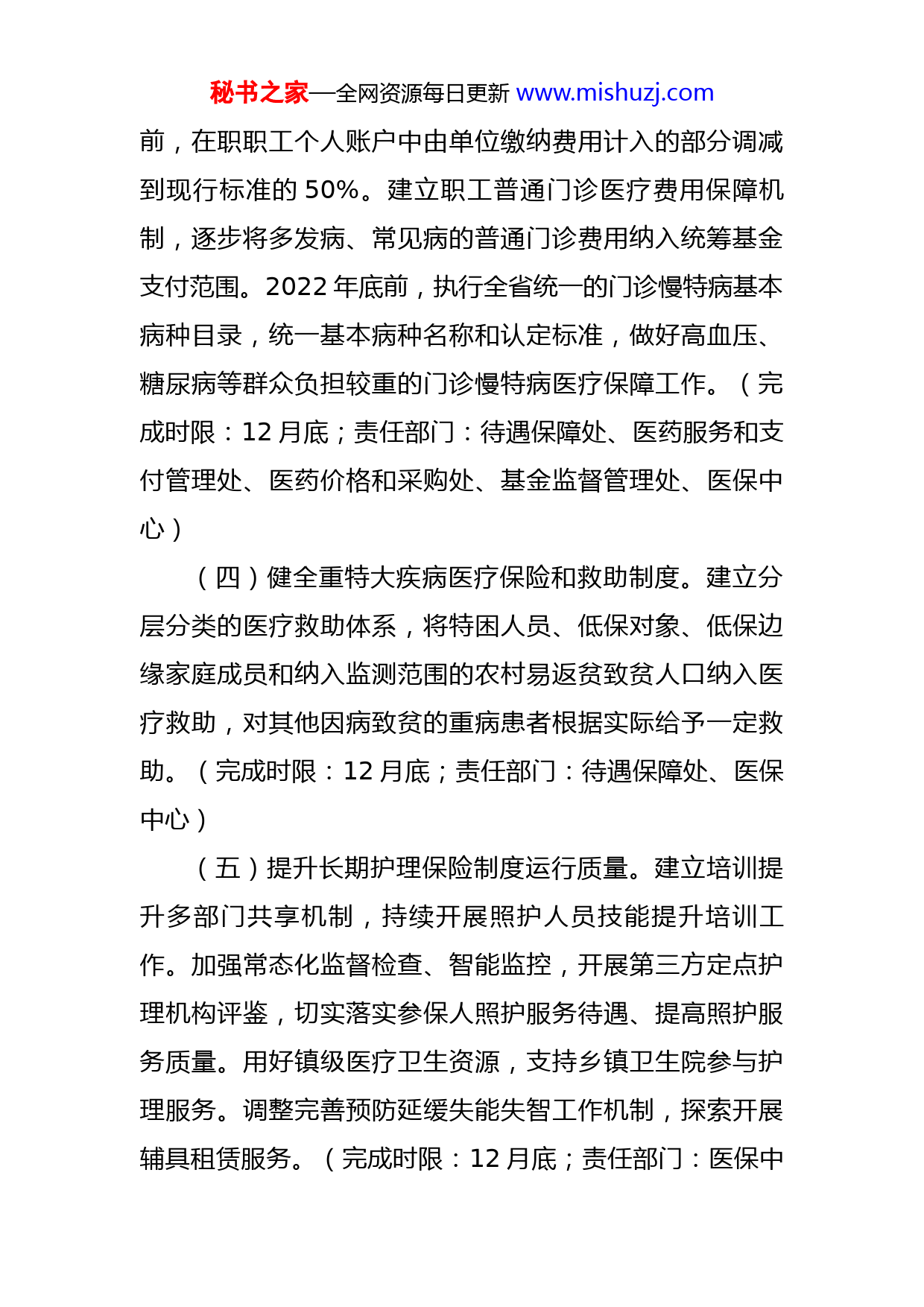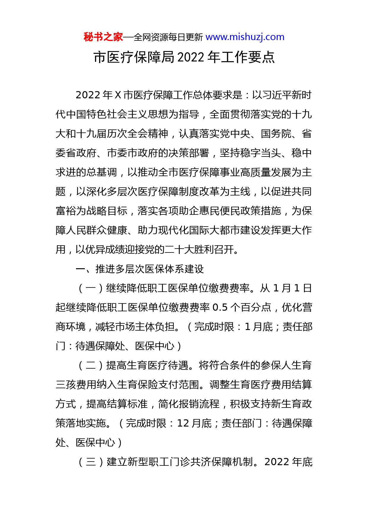秘书之家—全网资源每日更新www.mishuzj.com市医疗保障局2022年工作要点2022年X市医疗保障工作总体要求是:以习近平新时代中国特色社会主义思想为指导,全面贯彻落实党的十九大和十九届历次全会精神,认真落实党中央、国务院、省委省政府、市委市政府的决策部署,坚持稳字当头、稳中求进的总基调,以推动全市医疗保障事业高质量发展为主题,以深化多层次医疗保障制度改革为主线,以促进共同富裕为战略目标,落实各项助企惠民便民政策措施,为保障人民群众健康、助力现代化国际大都市建设发挥更大作用,以优异成绩迎接党的二十大胜利召开。一、推进多层次医保体系建设(一)继续降低职工医保单位缴费费率。从1月1日起继续降低职工医保单位缴费费率0.5个百分点,优化营商环境,减轻市场主体负担。(完成时限:1月底;责任部门:待遇保障处、医保中心)(二)提高生育医疗待遇。将符合条件的参保人生育三孩费用纳入生育保险支付范围。调整生育医疗费用结算方式,提高结算标准,简化报销流程,积极支持新生育政策落地实施。(完成时限:12月底;责任部门:待遇保障处、医保中心)(三)建立新型职工门诊共济保障机制。2022年底秘书之家—全网资源每日更新www.mishuzj.com前,在职职工个人账户中由单位缴纳费用计入的部分调减到现行标准的50%。建立职工普通门诊医疗费用保障机制,逐步将多发病、常见病的普通门诊费用纳入统筹基金支付范围。2022年底前,执行全省统一的门诊慢特病基本病种目录,统一基本病种名称和认定标准,做好高血压、糖尿病等群众负担较重的门诊慢特病医疗保障工作。(完成时限:12月底;责任部门:待遇保障处、医药服务和支付管理处、医药价格和采购处、基金监督管理处、医保中心)(四)健全重特大疾病医疗保险和救助制度。建立分层分类的医疗救助体系,将特困人员、低保对象、低保边缘家庭成员和纳入监测范围的农村易返贫致贫人口纳入医疗救助,对其他因病致贫的重病患者根据实际给予一定救助。(完成时限:12月底;责任部门:待遇保障处、医保中心)(五)提升长期护理保险制度运行质量。建立培训提升多部门共享机制,持续开展照护人员技能提升培训工作。加强常态化监督检查、智能监控,开展第三方定点护理机构评鉴,切实落实参保人照护服务待遇、提高照护服务质量。用好镇级医疗卫生资源,支持乡镇卫生院参与护理服务。调整完善预防延缓失能失智工作机制,探索开展辅具租赁服务。(完成时限:12月底;责任部门:医保中秘书之家—全网资源每日更新www.mishuzj.com心、待遇保障处)(六)完善提升城市定制型商业医疗保险。跟踪分析“琴岛e保”覆盖范围、理赔情况和受益情况,指导承保公司做好第二年度参保工作,进一步扩大理赔责任,把投保人临床急需、负担较重的高值药品和耗材补充到“琴岛e保”的保障范围中,进一步减轻群众重特大疾病医疗费用负担。(完成时限:12月底;责任部门:待遇保障处、医药价格和采购处;责任人:纪恩卿)(七)落实国家和省待遇清单制度。重点做好全民补充医保制度的改造和衔接,积极发挥商业补充保险的补充保障作用,妥善处理困难人员待遇衔接,确保与国家三重保障制度平稳并轨。按照要求调整完成其他与待遇清单不相符的保障政策。(完成时限:12月底;责任部门:待遇保障处、医药服务和支付管理处、医药价格和采购处、医保中心)二、深化医保支付方式改革(八)全面实行按疾病诊断相关分组(DRG)付费。在抓好18家试点医院平稳运行的基础上,重点推进全市二级以上公立综合医院全覆盖,并进一步扩大覆盖范围,实现符合条件的住院医疗机构覆盖率不低于50%,增强医保对医疗资源配置的引导支持作用。建立健全DRG付费模式下的审核、稽核监管制度,完善付费制度和经办规程。秘书之家—全网资源每日更新www.mishuzj.com(完成时限:12月底;责任部门:医药服务和支付管理处、基金监督管理处、医保中心)(九)推进落实紧密型医共体按人头总额打包付费。跟进指导西海岸新区人民医院医共体运行,发挥试点的示范效应。按照每个区、市至少一个的原则,联合卫健部门扎实推进紧密型医共体打包付费工作。制定对医共体的考核办法,建立以健康管理结果和医保基金使用效率为导向的考核指标体系,完善“结余留用、合理超支分担”激励约束机制,促进医共体从“疾病保障”向“健康保障”转变,实现医防融合发展,提高参保人疾病和健康保障水平。(完成时限:12月底;责任部门:医药服务和支付管理处、医保中心)(十)扩大中医药医保支付政策供给。中医优势病种日间病房试点范围扩大到全市二级及以上公立中医医院。鼓励中医诊疗技术传承创新,开辟中医特色项目审核绿色通道。适当提高中医医疗服务项目价格和医保支付标准。(完成时限:12月底;责任部门:医药服务和支付管理处、医药价格和采购处、医保中心)(十一)深化按床日付费改革。完善医疗康复、精神疾病等长期住院患者按床日付费制度,探索建立更为科学高效的支付管理工具,提高医保支付精细化水平。(完成时限:12月底;责任部门:医药服务和支付管理处、医保秘书之家—全网资源每日更新www.mishuzj.com中心)(十二)完善门诊保障控费管理。统筹定点社区、定点医院、“双渠道”定点零售药店门诊慢特病控费管理,建立健全按病种、按人头相结合的付费机
