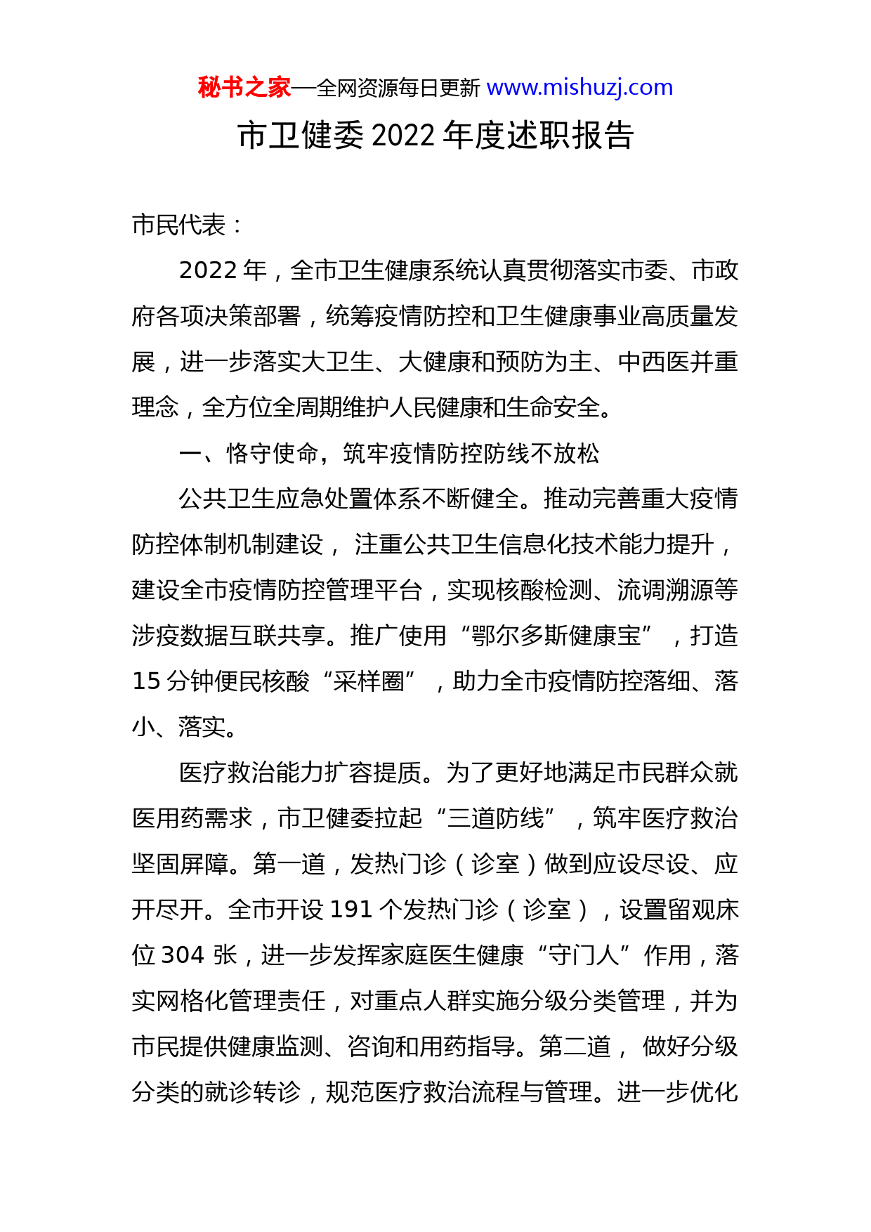 秘书之家—全网资源每日更新www.mishuzj.com市卫健委2022年度述职报告市民代表:2022年,全市卫生健康系统认真贯彻落实市委、市政府各项决策部署,统筹疫情防控和卫生健康事业高质量发展,进一步落实大卫生、大健康和预防为主、中西医并重理念,全方位全周期维护人民健康和生命安全。一、恪守使命,筑牢疫情防控防线不放松公共卫生应急处置体系不断健全。推动完善重大疫情防控体制机制建设,注重公共卫生信息化技术能力提升,建设全市疫情防控管理平台,实现核酸检测、流调溯源等涉疫数据互联共享。推广使用“鄂尔多斯健康宝”,打造15分钟便民核酸“采样圈”,助力全市疫情防控落细、落小、落实。医疗救治能力扩容提质。为了更好地满足市民群众就医用药需求,市卫健委拉起“三道防线”,筑牢医疗救治坚固屏障。第一道,发热门诊(诊室)做到应设尽设、应开尽开。全市开设191个发热门诊(诊室),设置留观床位304张,进一步发挥家庭医生健康“守门人”作用,落实网格化管理责任,对重点人群实施分级分类管理,并为市民提供健康监测、咨询和用药指导。第二道,做好分级分类的就诊转诊,规范医疗救治流程与管理。进一步优化秘书之家—全网资源每日更新www.mishuzj.com门急诊、发热门诊就医流程,采取分级分层分流方式对患者进行收治,全面做好各类防疫物资储备,尽最大努力满足人民群众就医用药需求。第三道,做好定点医院建设,加强重症收治能力。累计确定定点医院10家,设置床位3052张,二级及以上医院设置重症床位295张、配备重症医务人员640人,能够确保危重症患者应收尽收、应治尽治。升级改造亚准定点医院8家,设置床位2766张,进一步加强医疗资源储备。新冠病毒疫苗免疫屏障基本建立。设置接种点139个,接种台198个,医务人员2500余人,日接种能力达8.1万人次。全市累计接种新冠病毒疫苗546.16万剂,全程接种率97.08%,60岁以上老年人全程接种29.02万剂,全程接种率87.73%,接种率位居全区前列。二、综合施力,医疗服务能力稳步提升医药卫生体制改革持续深化。扎实推进医联体、医共体建设,组建2个城市医疗集团、4个专科联盟;遴选准格尔旗、达拉特旗、乌审旗为紧密型县域医共体试点旗,推动优质医疗资源下沉,为基层群众提供便捷、优质、可及的医疗服务。医疗服务水平不断提升。4个市级卫生健康领域重点投资项目进展迅速,年内完成投资1.7亿元。基本公共卫生秘书之家—全网资源每日更新www.mishuzj.com人均补助经费由79元提高到84元,常住人口家庭医生签约覆盖率达65%,重点人群签约覆盖率达90%,电子健康档案建档率达90%以上。巩固拓展健康扶贫成果同乡村振兴有效衔接机制,实行“三个一批”分类救治,大病患者救治率和慢病患者规范管理率均达100%。中医药(蒙医药)振兴发展。推动中医药(蒙医药)特色人才培养,遴选自治区和市级第四批老中(蒙)医药专家学术经验继承指导老师43名、继承人86名。全市10个中医(蒙医)临床科室被确定为第三批自治区中医(蒙医)特色优势重点专科。三、精准施策,全生命周期健康服务提质增效公共卫生服务体系不断完善。大力实施疾控机构标准化建设和分级管理评审,市疾控中心、乌审旗疾控中心分别被自治区评为甲、乙级A等。推动医防协同融合,实施结核病、艾滋病、布病三位一体管理模式,实现疾控—定点医院—社区乡镇医疗机构的融合。“一老一小”照护服务获得新提升。积极推进三孩生育配套政策落地见效。全面推进3岁以下婴幼儿照护服务,每千人口托位数达3.34个,被推荐为全国首批婴幼儿照护示范候选城市。推进医养结合发展,医疗卫生机构与养老机构签约率达85%以上。全市二级以上医疗机构均开通老秘书之家—全网资源每日更新www.mishuzj.com年人就医“绿色通道”,免收普通挂号费,受益人群16.4万人。“两癌”防治工作受到国家表扬。启动实施无创产前基因筛查等三项民生实事,减少新生儿出生缺陷。“数智卫生”健康服务全面加速。开展“掌上超声赋能”工程、“互联网医疗公众服务”和“影像云平台”建设,统筹建设覆盖市、旗、乡三级医疗机构的远程医疗系统和基层医疗机构慢病管理系统,实现医疗信息全面互联互通互认,医疗服务信息便民惠民水平大幅提升。开展乡村医生综合赋能行动项目试点,我市被确定为全国5个试点城市之一。四、优化服务,群众诉求得到及时有效回应我们始终坚持以人民为中心的发展思想,紧紧抓牢群众最关心、最直接、最现实的问题,坚持“开门听民声、开方解民忧”,全年共处置网络舆情信息203条,网站主任信箱回应群众来信59件,转办“自治区12320热线”154件、自治区卫生健康委舆情周报20条,问政互动及信访投诉21条,受理接诉即办、医疗投诉纠纷2160件,均第一时间办结,办结率100%。深化“放管服”改革优化营商环境,我委行政审批事项由87项精简为69项,依申请政务服务事项“一次办好”率、“零跑腿”率和全程网办率均达100%。在全区率先实现新生儿出生6项服务“一件事”全流程、全链条网上办理,办理材料从秘书之家—全网资源每日更新www.mishuzj.com12份简化为2份。承办市人大代表建议17件、政协提案37件,所有建议和提案均高效落实,答复率和满意率均达100%。深入开展全市医疗卫健系统腐败和作风问题专项整治,完善制度5919项,推出高质量发展举措199条