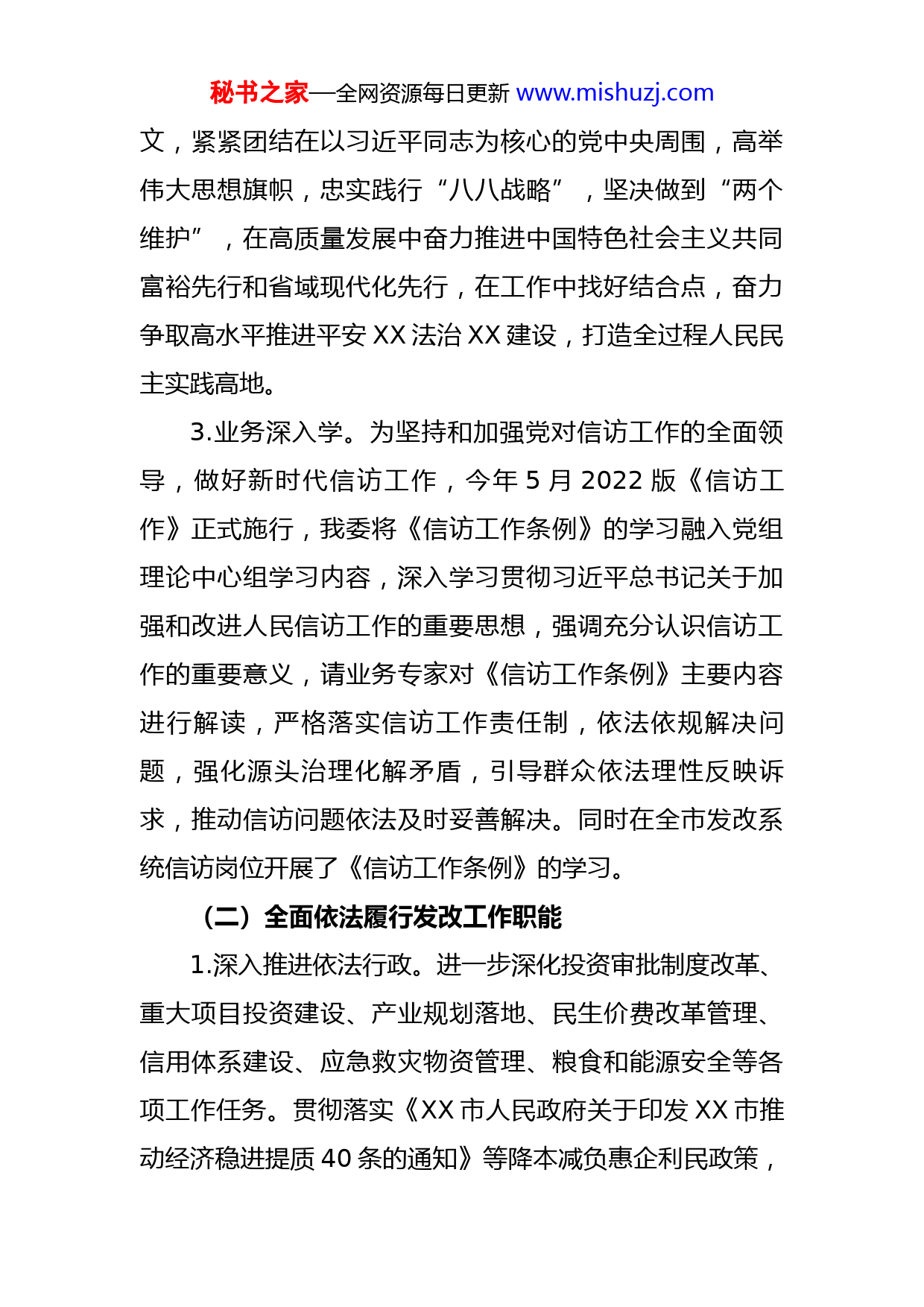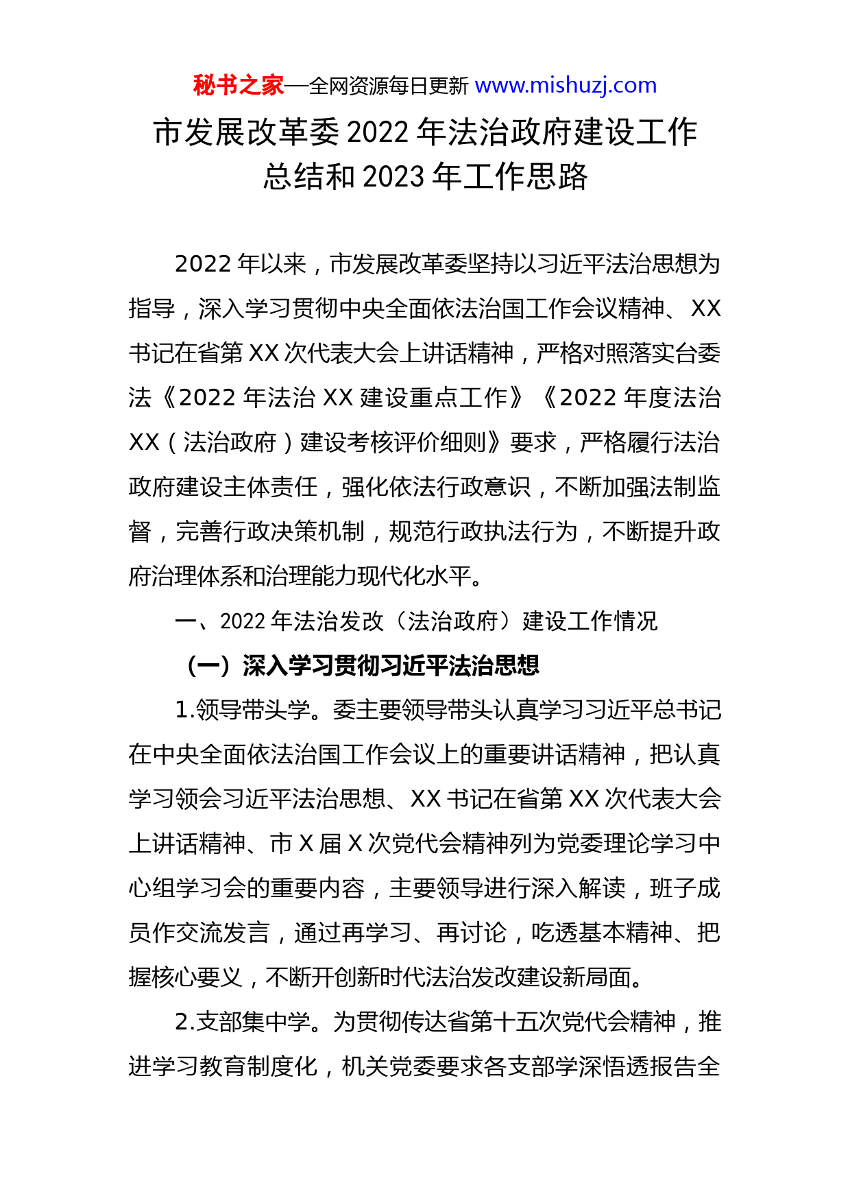 秘书之家—全网资源每日更新www.mishuzj.com市发展改革委2022年法治政府建设工作总结和2023年工作思路2022年以来,市发展改革委坚持以习近平法治思想为指导,深入学习贯彻中央全面依法治国工作会议精神、XX书记在省第XX次代表大会上讲话精神,严格对照落实台委法《2022年法治XX建设重点工作》《2022年度法治XX(法治政府)建设考核评价细则》要求,严格履行法治政府建设主体责任,强化依法行政意识,不断加强法制监督,完善行政决策机制,规范行政执法行为,不断提升政府治理体系和治理能力现代化水平。一、2022年法治发改(法治政府)建设工作情况(一)深入学习贯彻习近平法治思想1.领导带头学。委主要领导带头认真学习习近平总书记在中央全面依法治国工作会议上的重要讲话精神,把认真学习领会习近平法治思想、XX书记在省第XX次代表大会上讲话精神、市X届X次党代会精神列为党委理论学习中心组学习会的重要内容,主要领导进行深入解读,班子成员作交流发言,通过再学习、再讨论,吃透基本精神、把握核心要义,不断开创新时代法治发改建设新局面。2.支部集中学。为贯彻传达省第十五次党代会精神,推进学习教育制度化,机关党委要求各支部学深悟透报告全秘书之家—全网资源每日更新www.mishuzj.com文,紧紧团结在以习近平同志为核心的党中央周围,高举伟大思想旗帜,忠实践行“八八战略”,坚决做到“两个维护”,在高质量发展中奋力推进中国特色社会主义共同富裕先行和省域现代化先行,在工作中找好结合点,奋力争取高水平推进平安XX法治XX建设,打造全过程人民民主实践高地。3.业务深入学。为坚持和加强党对信访工作的全面领导,做好新时代信访工作,今年5月2022版《信访工作》正式施行,我委将《信访工作条例》的学习融入党组理论中心组学习内容,深入学习贯彻习近平总书记关于加强和改进人民信访工作的重要思想,强调充分认识信访工作的重要意义,请业务专家对《信访工作条例》主要内容进行解读,严格落实信访工作责任制,依法依规解决问题,强化源头治理化解矛盾,引导群众依法理性反映诉求,推动信访问题依法及时妥善解决。同时在全市发改系统信访岗位开展了《信访工作条例》的学习。(二)全面依法履行发改工作职能1.深入推进依法行政。进一步深化投资审批制度改革、重大项目投资建设、产业规划落地、民生价费改革管理、信用体系建设、应急救灾物资管理、粮食和能源安全等各项工作任务。贯彻落实《XX市人民政府关于印发XX市推动经济稳进提质40条的通知》等降本减负惠企利民政策,秘书之家—全网资源每日更新www.mishuzj.com抓好各项民生实事,做好减税降费惠民工作,加快推进水、电、气等民生价费改革;加快推进《XX市市场价格异常上涨事件应急预案》、《XX市发展改革委防汛防台抗旱应急预案》等突发时期应急处置制度建设,保障市场价格、社会生产平稳有序。2.健全民主决策制度。一是建立健全内部决策制度。严格执行民主集中制,重大问题一律提交委党组会议集体研究讨论决定,驻委纪检监察组组长参会。做到会前充分沟通酝酿,会上每位成员明确表态、主要领导末位发言。二是按法定职责和程序开展重大行政决策、规范性文件制定工作。严格按照公众参与、专家论证、风险评估、合法性审查、集体讨论决定的法定程序开展重大行政决策。根据《公平竞争审查制度实施细则》,全面落实公平竞争审查制度,针对制定市场准入和退出、产业发展、招商引资、招标投标、政府采购、经营行为规范、资质标准等涉及市场主体经济活动的规章、规范性文件等开展公平竞争审查,严格落实重大行政决策程序。上半年根据省市场监管局检查组要求,梳理我委2018年至今有效公平竞争政策措施共XX条,并附上佐证材料,检查组抽查部分处室档案,查无问题。三是清理规范性文件。对对市政府(含市政府办公室)2021年12月31日之前制发的行政规范性文件组织开展了清理工作。共清理废止、失效文件X件。秘书之家—全网资源每日更新www.mishuzj.com3.公正文明规范行政执法行为。一是清理我委行政执法事项。梳理并认领对从事节能咨询、设计、评估、检测、审计、认证等服务的机构提供虚假信息的行政处罚在内的XX项综合行政执法事项。梳理并认领包括固定资产投资项目核准、固定资产投资项目节能审查在内的X项行政许可事项。二是对行政执法案卷开展评查。我委积极贯彻落实《XX省人民政府关于贯彻落实〈中华人民共和国行政处罚法〉推进法治政府升级版建设的若干意见》(X〔2022〕X号)文件要求,切实做好违反上位法规定设定行政处罚等问题的自查自纠工作,全面推进法治政府升级版建设。根据开展行政执法问题自查自纠工作要求,我委对2022年度以来行政处罚事项进行自查自纠,未发现违反上位法规定设定行政处罚以及乱收费、乱罚款等违反国家“两稳一保”政策落地的问题。对全市发改系统行政执法案卷开展评查并报市司法局。三是积极响应XX市“大综合一体化”行政执法改革。我委积极贯彻落实省、市数字化改革部署,进一步规范我委行政执法行为,提高行政执法效能,提升行政执法数字化应用水平。召开对行政执法人员的培训会议,传达“大综合一体化”改革精神,就系统操作方法进行模拟演练;及时采购配套的数字化执