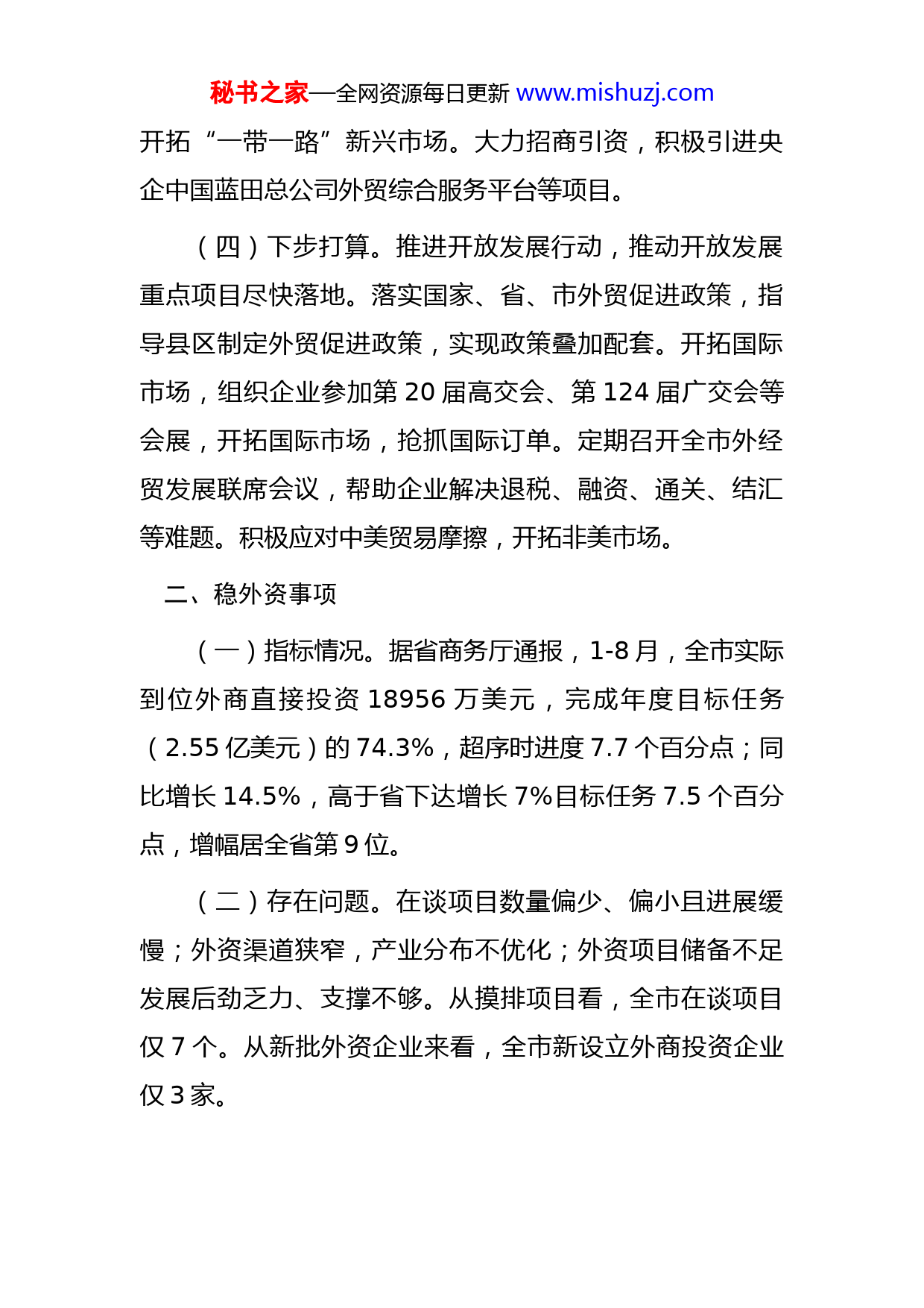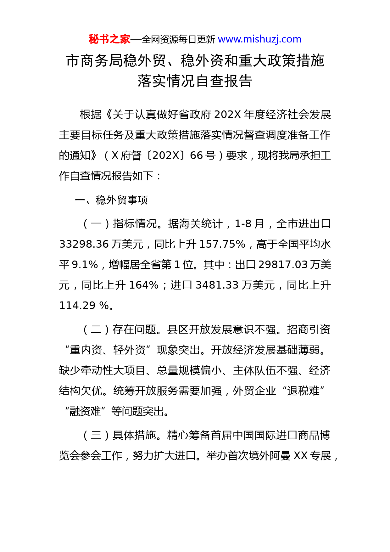 秘书之家—全网资源每日更新www.mishuzj.com市商务局稳外贸、稳外资和重大政策措施落实情况自查报告根据《关于认真做好省政府202X年度经济社会发展主要目标任务及重大政策措施落实情况督查调度准备工作的通知》(X府督〔202X〕66号)要求,现将我局承担工作自查情况报告如下:一、稳外贸事项(一)指标情况。据海关统计,1-8月,全市进出口33298.36万美元,同比上升157.75%,高于全国平均水平9.1%,增幅居全省第1位。其中:出口29817.03万美元,同比上升164%;进口3481.33万美元,同比上升114.29%。(二)存在问题。县区开放发展意识不强。招商引资“重内资、轻外资”现象突出。开放经济发展基础薄弱。缺少牵动性大项目、总量规模偏小、主体队伍不强、经济结构欠优。统筹开放服务需要加强,外贸企业“退税难”“融资难”等问题突出。(三)具体措施。精心筹备首届中国国际进口商品博览会参会工作,努力扩大进口。举办首次境外阿曼XX专展,秘书之家—全网资源每日更新www.mishuzj.com开拓“一带一路”新兴市场。大力招商引资,积极引进央企中国蓝田总公司外贸综合服务平台等项目。(四)下步打算。推进开放发展行动,推动开放发展重点项目尽快落地。落实国家、省、市外贸促进政策,指导县区制定外贸促进政策,实现政策叠加配套。开拓国际市场,组织企业参加第20届高交会、第124届广交会等会展,开拓国际市场,抢抓国际订单。定期召开全市外经贸发展联席会议,帮助企业解决退税、融资、通关、结汇等难题。积极应对中美贸易摩擦,开拓非美市场。二、稳外资事项(一)指标情况。据省商务厅通报,1-8月,全市实际到位外商直接投资18956万美元,完成年度目标任务(2.55亿美元)的74.3%,超序时进度7.7个百分点;同比增长14.5%,高于省下达增长7%目标任务7.5个百分点,增幅居全省第9位。(二)存在问题。在谈项目数量偏少、偏小且进展缓慢;外资渠道狭窄,产业分布不优化;外资项目储备不足发展后劲乏力、支撑不够。从摸排项目看,全市在谈项目仅7个。从新批外资企业来看,全市新设立外商投资企业仅3家。秘书之家—全网资源每日更新www.mishuzj.com(三)具体措施。贯彻落实《外商投资准入特别管理措施(负面清单)、《外商投资企业设立及变更备案管理暂行办法》,打造良好外资营商环境。加快推进202X徽商大会我市签约外资项目,推动尽快落地达效。强化项目落地,跟踪推进田家庵区新康医院、高新区和凤台县商业综合体等签约项目,督促经开区润滑油生产及铜管生产项目、广州富力五星级酒店综合体项目落地,力促立中昆物资有限公司、安徽富辰木业有限公司、凤台中电生物质发电有限公司尽快到位,扩大外资增量。(四)下步打算。一是加强利用外资工作调度和指导。紧盯省政府确定的“实际利用外商直接投资额增长7%”目标任务,加强对目标任务的调度,强化推进,继续实施按月通报、调度工作机制;加强指导,加强对各县区、园区利用外资统计培训,提高外资统计人员的业务水平和统计质量,促进外资统计工作制度化和规范化。及时、全面、准备的分析我市利用外资情况,为市委、市政府决策服务二是强化政策保障支撑。认真落实国家、省出台促进外资稳增长政策,有力有效落实我市出台的《XX市人民政府办公室关于促进外资增长的实施意见》(淮府办〔202X〕33号)和《贯彻落实〈XX市人民政府办公室关于鼓励促进外资增长的实施意见〉实施细则》(淮商〔202X〕181号),秘书之家—全网资源每日更新www.mishuzj.com充分发挥政策激励效应,不断增强外资企业发展信心,不断提升全市外资利用效益和质量。三是借力会展打造投资促进平台。以202X投洽会和专题投资促进活动为契机,用好展会平台,促进活动招商。借助“一带一路”高峰论坛等重大活动,对接重要客商资源,提高邀请层次和水平重点围绕我市三大主导产业、五大高成长性产业和重点项目,结合活动和项目,精准务实邀商,争取引进一批科技含量高、经济效益好、产业带动力强的招商项目落户XX。三、省委省政府有关政策文件明确需要落实事项(一)有关工作完成情况按照民生工程有关任务目标,市商务部门会同市财政局联合出台了《202X年XX市电商振兴乡村提升工程实施办法的通知》,将具体站点建设等任务分解到各个县区,市商务局与各个县区商务主管部门签订了目标责任书。《安徽省农村电商全覆盖巩固提升行动方案》印发后,市政府高度重视,市商务部门牵头制定我市相关贯彻落实方案。7月16日,《XX市农村电商全覆盖巩固提升行动实施方案》正式印发。《方案》明确了我市全覆盖巩固提升的总体目标,将具体任务目标量化,规定了各项工作完成的时间节点。7月18日,市政府在寿县将召开全市农村电商全覆盖巩固提升暨电商振兴乡村工作现场会。李朝晖副秘书之家—全网资源每日更新www.mishuzj.com市长出席会议,现场与各个县区签订了目标责任书,进一步明确任务,交流工作经验,压实工作责任,层层传递压力,确保全年各项目标任务完成。为了保证各项工作落到实处,市商务局定期召开巩固提升及电商振兴乡村工作调度会,并深入各县区进行督察截至9月底,全市农产品网销额达到2.89亿元,其中农产品网销额1.86亿元,同比增长超过50%;新增农村电子商务经营主体289个;培育网络销售额超1000万元的企业9个、网络销售额超100万元的名优品牌9