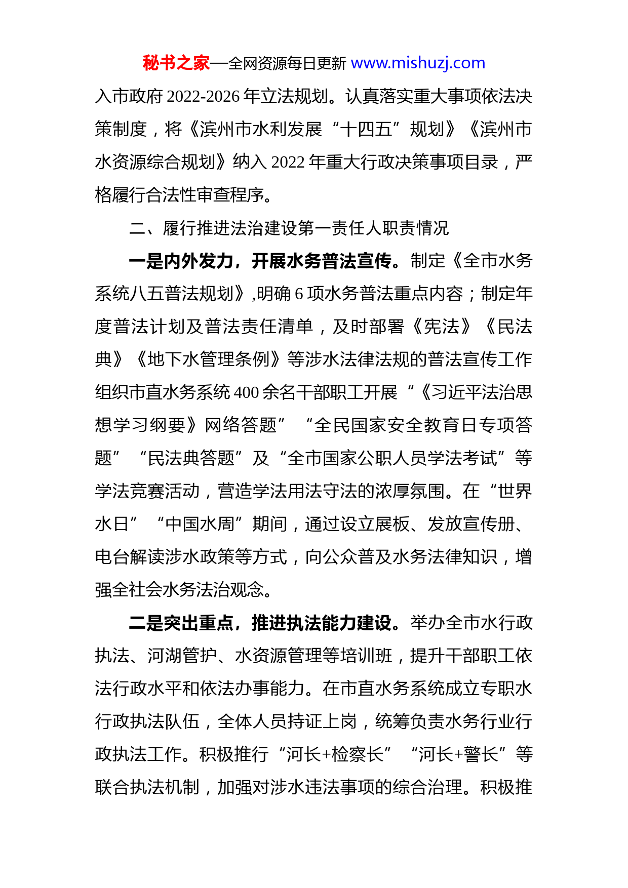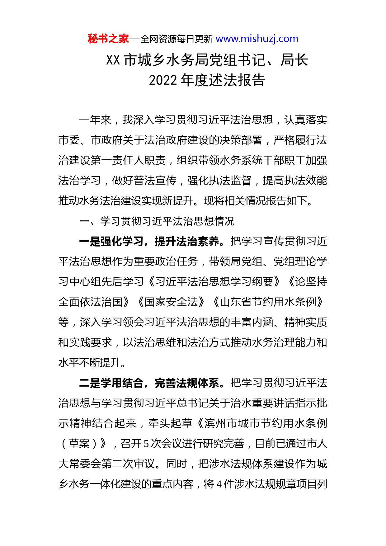 秘书之家—全网资源每日更新www.mishuzj.comXX市城乡水务局党组书记、局长2022年度述法报告一年来,我深入学习贯彻习近平法治思想,认真落实市委、市政府关于法治政府建设的决策部署,严格履行法治建设第一责任人职责,组织带领水务系统干部职工加强法治学习,做好普法宣传,强化执法监督,提高执法效能推动水务法治建设实现新提升。现将相关情况报告如下。一、学习贯彻习近平法治思想情况一是强化学习,提升法治素养。把学习宣传贯彻习近平法治思想作为重要政治任务,带领局党组、党组理论学习中心组先后学习《习近平法治思想学习纲要》《论坚持全面依法治国》《国家安全法》《山东省节约用水条例》等,深入学习领会习近平法治思想的丰富内涵、精神实质和实践要求,以法治思维和法治方式推动水务治理能力和水平不断提升。二是学用结合,完善法规体系。把学习贯彻习近平法治思想与学习贯彻习近平总书记关于治水重要讲话指示批示精神结合起来,牵头起草《滨州市城市节约用水条例(草案)》,召开5次会议进行研究完善,目前已通过市人大常委会第二次审议。同时,把涉水法规体系建设作为城乡水务一体化建设的重点内容,将4件涉水法规规章项目列秘书之家—全网资源每日更新www.mishuzj.com入市政府2022-2026年立法规划。认真落实重大事项依法决策制度,将《滨州市水利发展“十四五”规划》《滨州市水资源综合规划》纳入2022年重大行政决策事项目录,严格履行合法性审查程序。二、履行推进法治建设第一责任人职责情况一是内外发力,开展水务普法宣传。制定《全市水务系统八五普法规划》,明确6项水务普法重点内容;制定年度普法计划及普法责任清单,及时部署《宪法》《民法典》《地下水管理条例》等涉水法律法规的普法宣传工作组织市直水务系统400余名干部职工开展“《习近平法治思想学习纲要》网络答题”“全民国家安全教育日专项答题”“民法典答题”及“全市国家公职人员学法考试”等学法竞赛活动,营造学法用法守法的浓厚氛围。在“世界水日”“中国水周”期间,通过设立展板、发放宣传册、电台解读涉水政策等方式,向公众普及水务法律知识,增强全社会水务法治观念。二是突出重点,推进执法能力建设。举办全市水行政执法、河湖管护、水资源管理等培训班,提升干部职工依法行政水平和依法办事能力。在市直水务系统成立专职水行政执法队伍,全体人员持证上岗,统筹负责水务行业行政执法工作。积极推行“河长+检察长”“河长+警长”等联合执法机制,加强对涉水违法事项的综合治理。积极推秘书之家—全网资源每日更新www.mishuzj.com进公职律师、法律顾问制度建设,聘任公职律师1名,邀请法律顾问参与2项重大行政决策审查工作,着力提升法律服务水平。三是周密部署,严格执法监督检查。制定年度监督检查计划,明确检查任务、时间节点,推动水务执法检查常态化、规范化。积极开展“双随机、一公开”抽查活动,抽查供水、用水、排水、污水处理等企业88家次,发现问题督办整改、立行立改。全面推行水行政执法“三项制度”,加大涉水重点领域执法力度,累计查处涉水违法案件41个。组织开展取水口整治、节约用水监管、水土保持监管及河湖清违等专项行动,检查整改取水项目1800余个,对非居民超计划用水户征收累进加价水费50多万元,清理整治河湖“四乱”问题204处,对市级93个生产建设项目开展事中事后现场监管,实现监管全覆盖。三、存在的问题回顾近一年的工作,虽然取得了一定成绩,但水务法治建设工作仍存在一些问题和不足,主要表现在:一是市县两级水行政执法力量薄弱,执法能力有待加强。二是个别县区水行政主管部门和综合执法部门沟通协作机制尚未健全,未形成齐抓共管的局面;三是监督机制不完善,涉水违法案件查处不到位,导致涉水违法问题时有发生。四、下步打算秘书之家—全网资源每日更新www.mishuzj.com一是加强法律法规学习。组织干部职工继续深入学习习近平法治思想,真正用习近平法治思想指导水务事业发展。围绕黄河流域生态保护和高质量发展国家战略,以“四水四定强引领、五水并举谋发展”解放思想大讨论活动开展为契机,全面推动水务法治学习做深做实,着重做好《黄河保护法》等法律法规的学习宣传和贯彻落实,切实提高依法履职能力。二是完善涉水法规体系。立足滨州实际,坚持问题导向,开展好河湖管护、农村供水、城区水系等领域调研,有序推进涉水法规规章立法工作的开展。2023年,积极推动《滨州市河湖长制工作管理办法》出台。三是加强执法能力建设。加大水行政执法力度,对河湖清违、违规取水等典型违法水事案件重点查处,形成震慑作用。加强对执法人员的培训教育,提升执法能力水平努力打造一支业务精、力量强、执法严的执法队伍。