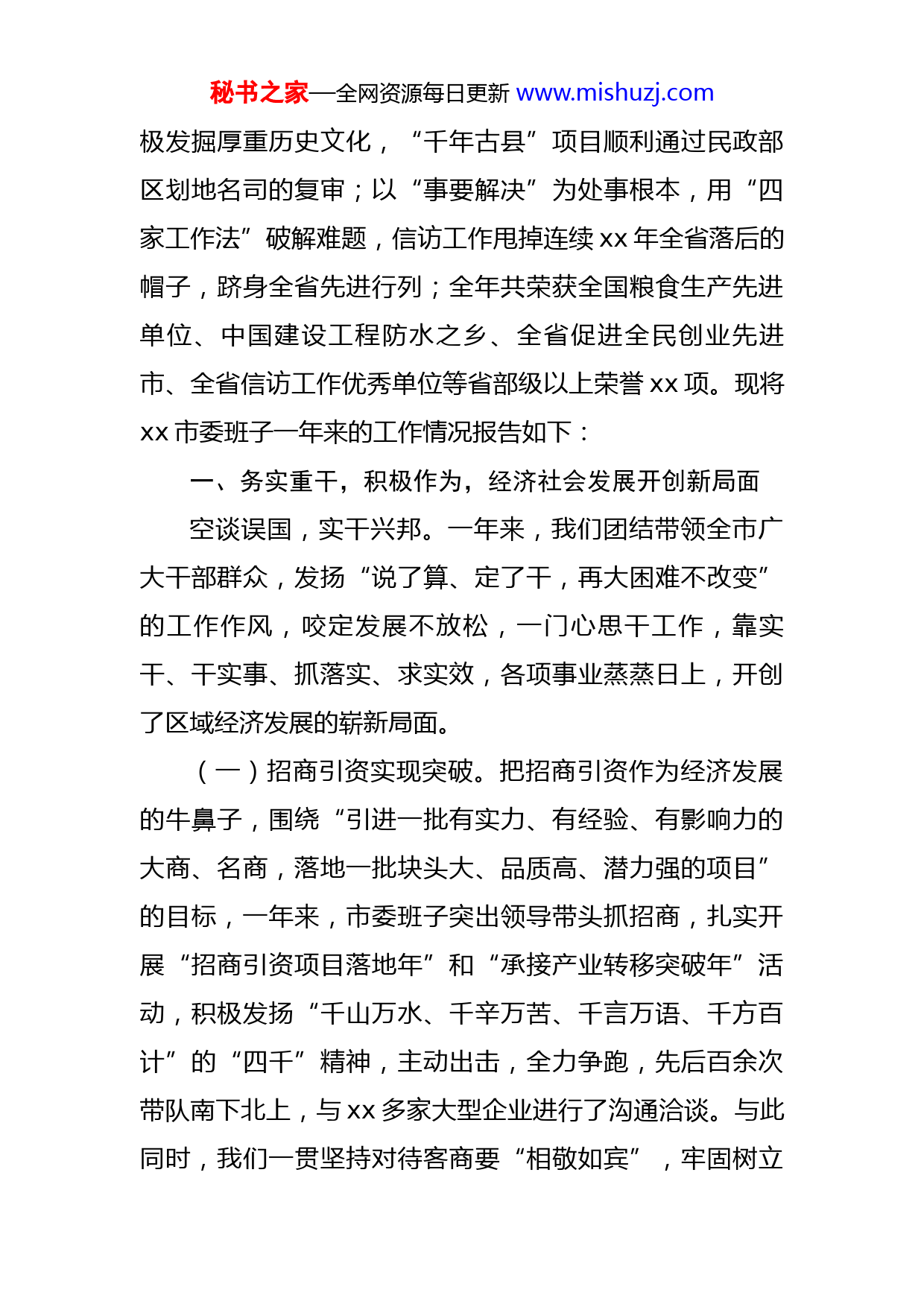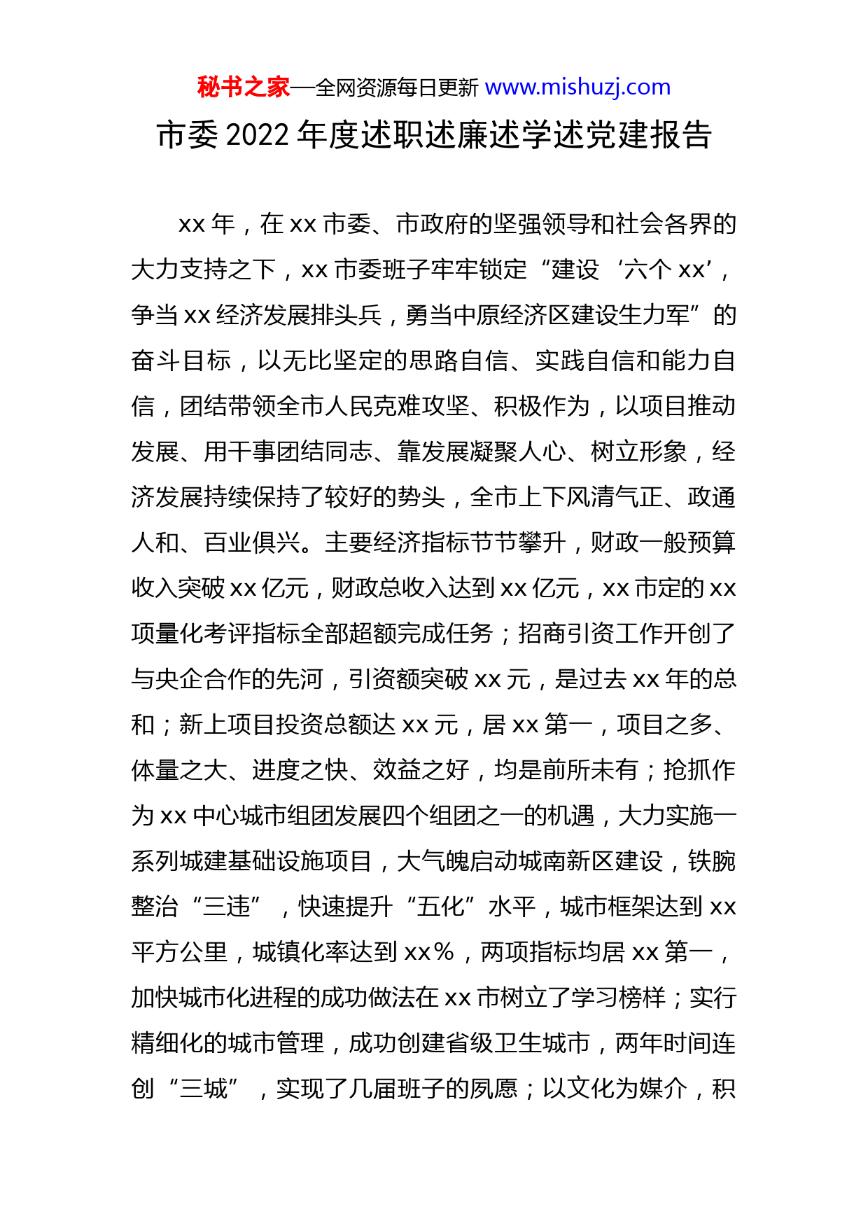 秘书之家—全网资源每日更新www.mishuzj.com市委2022年度述职述廉述学述党建报告xx年,在xx市委、市政府的坚强领导和社会各界的大力支持之下,xx市委班子牢牢锁定“建设‘六个xx’,争当xx经济发展排头兵,勇当中原经济区建设生力军”的奋斗目标,以无比坚定的思路自信、实践自信和能力自信,团结带领全市人民克难攻坚、积极作为,以项目推动发展、用干事团结同志、靠发展凝聚人心、树立形象,经济发展持续保持了较好的势头,全市上下风清气正、政通人和、百业俱兴。主要经济指标节节攀升,财政一般预算收入突破xx亿元,财政总收入达到xx亿元,xx市定的xx项量化考评指标全部超额完成任务;招商引资工作开创了与央企合作的先河,引资额突破xx元,是过去xx年的总和;新上项目投资总额达xx元,居xx第一,项目之多、体量之大、进度之快、效益之好,均是前所未有;抢抓作为xx中心城市组团发展四个组团之一的机遇,大力实施一系列城建基础设施项目,大气魄启动城南新区建设,铁腕整治“三违”,快速提升“五化”水平,城市框架达到xx平方公里,城镇化率达到xx%,两项指标均居xx第一,加快城市化进程的成功做法在xx市树立了学习榜样;实行精细化的城市管理,成功创建省级卫生城市,两年时间连创“三城”,实现了几届班子的夙愿;以文化为媒介,积秘书之家—全网资源每日更新www.mishuzj.com极发掘厚重历史文化,“千年古县”项目顺利通过民政部区划地名司的复审;以“事要解决”为处事根本,用“四家工作法”破解难题,信访工作甩掉连续xx年全省落后的帽子,跻身全省先进行列;全年共荣获全国粮食生产先进单位、中国建设工程防水之乡、全省促进全民创业先进市、全省信访工作优秀单位等省部级以上荣誉xx项。现将xx市委班子一年来的工作情况报告如下:一、务实重干,积极作为,经济社会发展开创新局面空谈误国,实干兴邦。一年来,我们团结带领全市广大干部群众,发扬“说了算、定了干,再大困难不改变”的工作作风,咬定发展不放松,一门心思干工作,靠实干、干实事、抓落实、求实效,各项事业蒸蒸日上,开创了区域经济发展的崭新局面。(一)招商引资实现突破。把招商引资作为经济发展的牛鼻子,围绕“引进一批有实力、有经验、有影响力的大商、名商,落地一批块头大、品质高、潜力强的项目”的目标,一年来,市委班子突出领导带头抓招商,扎实开展“招商引资项目落地年”和“承接产业转移突破年”活动,积极发扬“千山万水、千辛万苦、千言万语、千方百计”的“四千”精神,主动出击,全力争跑,先后百余次带队南下北上,与xx多家大型企业进行了沟通洽谈。与此同时,我们一贯坚持对待客商要“相敬如宾”,牢固树立秘书之家—全网资源每日更新www.mishuzj.com“吃大亏让大利,才能求得大发展”的开放理念,叫响“只要客商确定干,剩下事情我们办”的服务口号,形成了较为浓厚的亲商、留商、安商、富商的氛围,吸引了中电投、中石油、江苏康宝医药、北京悦康医药等一批国内知名企业落户我市。全年引进项目xx个,总投资xx亿元,实际到位资金xx亿元,一举夺得“省政府xx年承接产业转移优秀成果单位”;实际利用外资xx万美元、省外资金xx亿元,出口创汇总额xx万美元,均超额完成全年目标任务。(二)项目建设成效突出。牢固树立“抓项目就是抓发展,抓发展必须抓项目”的理念,持之以恒地按照“四制”工作法实施项目带动战略,围着目标转,盯着项目干,项目建设高潮迭起,经济发展生机盎然。全年共实施重点项目xx个,总投资达xx亿元,亿元以上项目xx个,是xx年的两倍,其中,列入省重点的项目完成投资计划的xx%,列入xx市重点的完成计划的xx%,列入我市“xx”重点的完成计划的xx%。在项目建设过程中,我们发扬说算定干、只争朝夕的工作作风和说到做到、雷厉风行的“雷锋”精神,建立了五个一(一个项目、一名分包领导、一个领导单位、一套推进措施、一抓到底)、三个一(一个指挥部、一张床、一把手)、白加黑、五加二、雨加晴等推进机制,并把项目建设作为锤炼干部、选拔干部秘书之家—全网资源每日更新www.mishuzj.com的火线领域,采取三天一督查、一周一通报、半月一观摩、在项目工地安装监控探头、编发手机报、电视问效、三停(停经费、停工资、停职务)等多种形式,历练了干部,转变了作风,有效加快了项目建设进度,创造了社会各界公认的“xx速度”,形成了特色鲜明的项目建设模式,在xx市作出了示范。(三)工业经济生机勃发。牢固树立“工业强市”的龙头地位不动摇,一方面,不断加大对食品、医药、纺织、皮革四大特色主导产业的扶持力度,拿出xx亿多元用来解决企业结构不优、产业层次低、支撑力下降等问题,帮助企业转型升级,重振雄风。xx股份债务化解和生态工业园建设同步顺利推进,重振辉煌为时不远xx药业有望xx年上市,纺织公司已成为国内纺织行业领军企业,防水防潮、农机配件、皮革等板块经济如今突出重围,异军突起。这些骨干企业和板块经济正做大做强,激活了工业战线的一池春水。另一方面,我们把产业集聚区作为招商引资的主阵地和工业经济新的增长极,围绕调增的xx平方公里,抓规划、夯基础、促提升,增强了吸纳集聚和承载能力,尤其是抢抓去年年底有利时机征收xx多亩土地,为今年工业项目进驻创造了先决条件。一年来,产业集聚区在