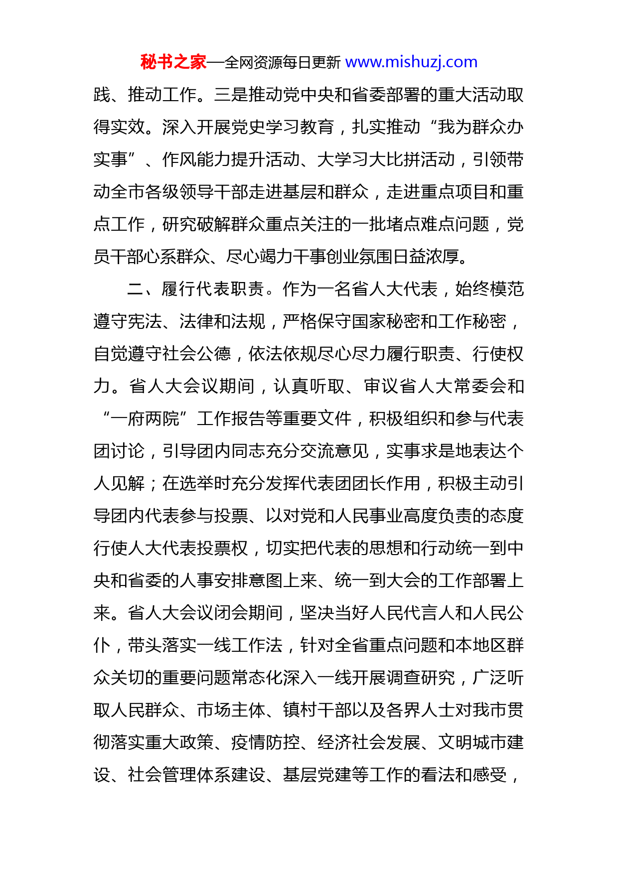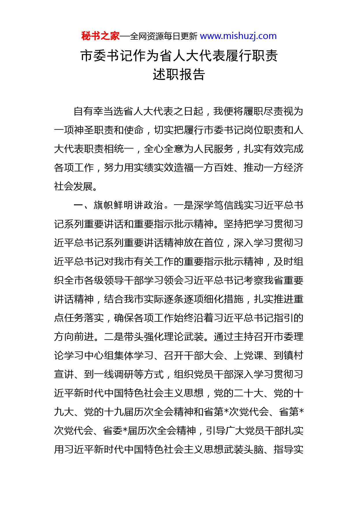秘书之家—全网资源每日更新www.mishuzj.com市委书记作为省人大代表履行职责述职报告自有幸当选省人大代表之日起,我便将履职尽责视为一项神圣职责和使命,切实把履行市委书记岗位职责和人大代表职责相统一,全心全意为人民服务,扎实有效完成各项工作,努力用实绩实效造福一方百姓、推动一方经济社会发展。一、旗帜鲜明讲政治。一是深学笃信践实习近平总书记系列重要讲话和重要指示批示精神。坚持把学习贯彻习近平总书记系列重要讲话精神放在首位,深入学习贯彻习近平总书记对我市有关工作的重要指示批示精神,及时组织全市各级领导干部学习领会习近平总书记考察我省重要讲话精神,结合我市实际逐条逐项细化措施,扎实推进重点任务落实,确保各项工作始终沿着习近平总书记指引的方向前进。二是带头强化理论武装。通过主持召开市委理论学习中心组集体学习、召开干部大会、上党课、到镇村宣讲、到一线调研等方式,组织党员干部深入学习贯彻习近平新时代中国特色社会主义思想,党的二十大、党的十九大、党的十九届历次全会精神和省第次党代会、省第次党代会、省委届历次全会精神,引导广大党员干部扎实用习近平新时代中国特色社会主义思想武装头脑、指导实秘书之家—全网资源每日更新www.mishuzj.com践、推动工作。三是推动党中央和省委部署的重大活动取得实效。深入开展党史学习教育,扎实推动“我为群众办实事”、作风能力提升活动、大学习大比拼活动,引领带动全市各级领导干部走进基层和群众,走进重点项目和重点工作,研究破解群众重点关注的一批堵点难点问题,党员干部心系群众、尽心竭力干事创业氛围日益浓厚。二、履行代表职责。作为一名省人大代表,始终模范遵守宪法、法律和法规,严格保守国家秘密和工作秘密,自觉遵守社会公德,依法依规尽心尽力履行职责、行使权力。省人大会议期间,认真听取、审议省人大常委会和“一府两院”工作报告等重要文件,积极组织和参与代表团讨论,引导团内同志充分交流意见,实事求是地表达个人见解;在选举时充分发挥代表团团长作用,积极主动引导团内代表参与投票、以对党和人民事业高度负责的态度行使人大代表投票权,切实把代表的思想和行动统一到中央和省委的人事安排意图上来、统一到大会的工作部署上来。省人大会议闭会期间,坚决当好人民代言人和人民公仆,带头落实一线工作法,针对全省重点问题和本地区群众关切的重要问题常态化深入一线开展调查研究,广泛听取人民群众、市场主体、镇村干部以及各界人士对我市贯彻落实重大政策、疫情防控、经济社会发展、文明城市建设、社会管理体系建设、基层党建等工作的看法和感受,秘书之家—全网资源每日更新www.mishuzj.com虚心向老百姓请教,自觉接受老百姓监督,引导老百姓积极参与,切实将群众意见、群众智慧和群众力量引到工作中,不断增强履职能力和水平,提出有质量建议的提案。三、立足岗位职责。准确把握省人大代表和市委书记双重职责,科学分析形势、谋划全局,团结带领全市干部群众苦干实干、应对风险挑战,不断巩固提升地方经济社会发展质量。一是全力稳经济、促发展,有力扛住经济下行和疫情冲击的巨大压力,始终确保全市经济在合理区间平稳运行。2022年前三季度,我市生产总值同比增长%,固定资产投资同比增长%,社会消费品零售总额同比增长%,地方一般公共预算收入同口径增长%,城镇常住居民人均可支配收入同比增长%,农村常住居民人均可支配收入同比增长4.6%。二是聚焦打基础利长远谋划我市发展新路径,针对我市发展当前阶段特征以及产业结构不优、基础设施和民生领域欠账较多、社会治理管理能力不强等突出问题,锚定在全省经济社会发展中发挥独特功能性作用、建设全省区域中心城市的目标,系统谋划1348战略,布局启动两个产业片区建设,推动产业聚集发展,着力破解我市主城区“有城无产”问题,构建以医疗健康、会展为主轴心的现代产业体系;统筹规划建设嘉积城区、重点产业园区、滨海小镇,形成功能互补的主城区组团,推动城市框架向海拓展,全面提升中心城市功能品质和承秘书之家—全网资源每日更新www.mishuzj.com载力;将乡村振兴与美丽乡村、休闲渔业结合,谋划确定生态循环农业、观光农业发展,全力推动农村一二三产业融合发展和城乡协调发展。三是坚定不移深化改革开放。不断巩固深化“放管服”“一支队伍管执法”“一个机构管复议”“一枚印章管审批”改革。精益求精做好重大国际会议服务保障工作,圆满实现办会目标,受到省里肯定。四、坚守初心使命。坚持把人民利益摆在首位,把增强群众获得感、幸福感和安全感作为履职尽责的立足点和着力点,永葆清正廉洁本色,争做为民务实清廉的表率。一是全力打赢疫情防控攻坚战。全面落实“五级书记抓防控”要求,毫不放松抓常态化疫情防控,市域发现首例确诊病例后快速反应、果断处置,高质量高效率实现社会面清零,有力保障重大国际会议顺利召开,并且大力支援全省疫情防控大局,主动贡献人力物力、接收密接人员,为全省打赢疫情防控攻坚战作出重要贡献。二是加强生态环境保护。主动扛起生态环境保护责任担当,全力推动国家环保督察反馈问题整改落实,实现两轮中央环保督察交办信访