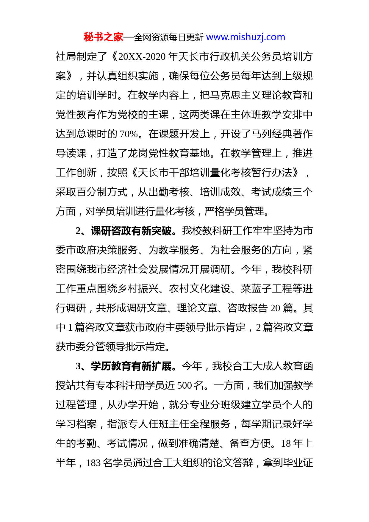 秘书之家—全网资源每日更新www.mishuzj.com天长市委党校(行政学校)20XX年工作总结及20XX年工作计划一、20XX年工作回顾20XX年,我校在市委、市政府的正确领导下,坚持习近平新时代社会主义思想为指导,深入贯彻落实党的十九大、十九届三全会精神,深入推进“两学一做”学习教育常态化制度化暨“讲严立”专题警示教育,强化干部教育培训,重视机关党组织建设,圆满完成了年初确定的各项工作任务。(一)履行核心职能,强化干部教育培训1、主业主课有新提升。20XX年,在市委组织部等相关部门的支持配合下,全年举办各类主体班、专题班培训轮训23期,其中科级领导干部进修班3期,公务员履职能力、市直党务干部、工会干部培训班各2期,综治干部素质能力提升、城市规划建设、妇女干部、乡村振兴、非公党建、团干、公务员任职、意识形态工作、统战干部、村(社区)书记主任、村(居)务监督委员会主任、农村党建指导员、中青年干部、组织业务培训班各1期,共培训1699人次。另外,还承办、接待社会培训和市外培训20期,培训约2435人次。在干部培训上,联合市委组织部、市人秘书之家—全网资源每日更新www.mishuzj.com社局制定了《20XX-2020年天长市行政机关公务员培训方案》,并认真组织实施,确保每位公务员每年达到上级规定的培训学时。在教学内容上,把马克思主义理论教育和党性教育作为党校的主课,这两类课在主体班教学安排中达到总课时的70%。在课题开发上,开设了马列经典著作导读课,打造了龙岗党性教育基地。在教学管理上,推进工作创新,按照《天长市干部培训量化考核暂行办法》,采取百分制方式,从出勤考核、培训成效、考试成绩三个方面,对学员培训进行量化考核,严格学员管理。2、课研咨政有新突破。我校教科研工作牢牢坚持为市委市政府决策服务、为教学服务、为社会服务的方向,紧密围绕我市经济社会发展情况开展调研。今年,我校科研工作重点围绕乡村振兴、农村文化建设、菜蓝子工程等进行调研,共形成调研文章、理论文章、咨政报告20篇。其中1篇咨政文章获市政府主要领导批示肯定,2篇咨政文章获市委分管领导批示肯定。3、学历教育有新扩展。今年,我校合工大成人教育函授站共有专本科注册学员近500名。一方面,我们加强教学过程管理,从办学开始,就分专业分班级建立学员个人的学习档案,指派专人任班主任全程服务,每学期记录好学生的考勤、考试情况,做到准确清楚、备查方便。18年上半年,183名学员通过合工大组织的论文答辩,拿到毕业证秘书之家—全网资源每日更新www.mishuzj.com书。另一方面通过媒体广告、网络宣传等方式,加强宣传努力扩大招生规模,促进函授站稳步发展。下半年,有199名学员到我校函授站报考。(二)狠抓机关党建,推动机关作风转变1、深入推进“两学一做”学习教育常态化制度化和“讲严立”专题警示教育。按照“两学一做”学习教育常态化制度化要求,认真学习习近平总书记关于全面从严治党系列重要讲话精神和有关讲忠诚、严纪律、立政德方面的重要论述;学习党的十九大精神和有关法律法规及新修订的纪律处分条例。开展了“不忘初心忘没忘?牢记使命牢不牢?”和“三问三查”集中研讨。组织全体党员观看警示教育片《权》,到天长看守所接受警示教育我市反腐倡廉警示教育。召开“讲严立”警示教育专题民主生活会会后对校委班子查摆出了16个突出问题、班子成员查出的28个问题都制定了整改清单,分清责任,研究落实了整改措施。2、扎实做好机关党建工作。一是夯实党校党组织基础党校总支及所属支部严格按照程完成换届。各支部按要求做好党费收缴,及时组织人员参加党务干部培训,规范入党积极分子的教育培。二是灵活多样开展主题教育活动。“七一”期间,组织全体在职党员赴淮海战役烈士纪念馆周恩来纪念馆开展祭奠、参观、重温入党誓词等活动;组秘书之家—全网资源每日更新www.mishuzj.com织党员集中观看一场《建党伟业》、《开天辟地》等红色影视片;参加市直工委开展的以“不忘初心、牢记使命”为主题的党建知识竞赛,并获总分第二。推进了基层党组织党建结对活动,支持秦栏镇新民村建设1.5万元,深入联合党委所在的千秋社区和结对共建村(社区),对生活困难党员开展慰问活动。三是认真落实党建工作责任制。定期召开党建会议,对党建工作进行安排部署,明确全年党建工作的目标和任务,真正把党建工作纳入重要议事日程认真落实党内政治生活,坚持民主生活会、组织生活会、“三课一会”制度,全年召开总支支委会4次、全体党员学习会40次、上党课4次,开展民主评议党员、党性分析活动。3、强化机关作风建设。出台了《中共天长市委党校作风建设“三治三提”活动行动方案》《中共天长市委党校专兼职教师教学科研工作量考核办法(试行)》《中共天长市委党校主体班班主任工作规定》等,着力解决不想担当、标准不高、作风散漫等问题。(三)加强队伍建设,提升履行职责能力1、加强教职工思想教育。坚持“党校姓党”原则,强化理论教育,引导全体党员牢固树立“四个意识”,时刻保持高度的政治觉悟、坚定的政治立场、严明的政治纪律敏锐的政治鉴别力和政治敏感性,在思想上政治上行动上秘书之家—全网资源每日更新www.mishuzj.com做到“两个维护”。选派
