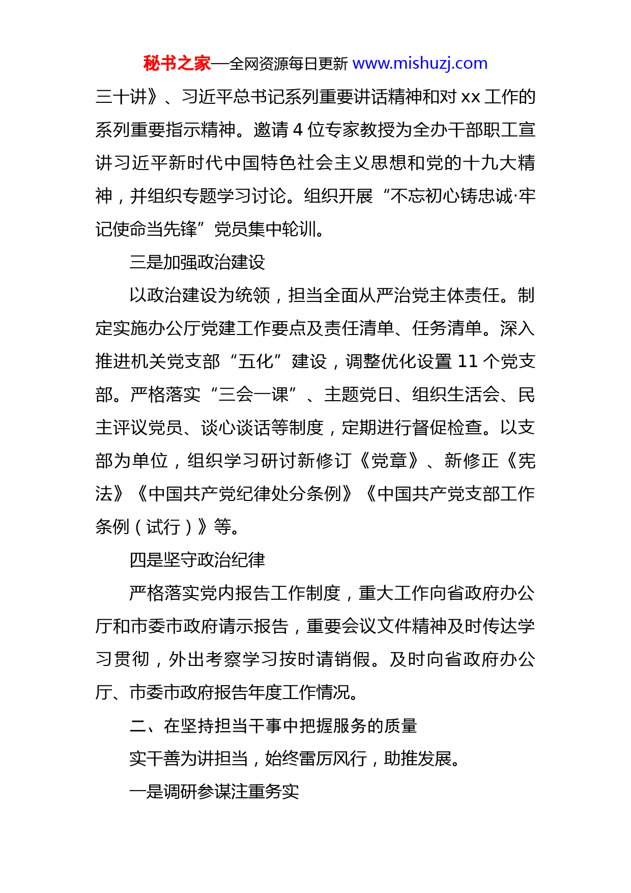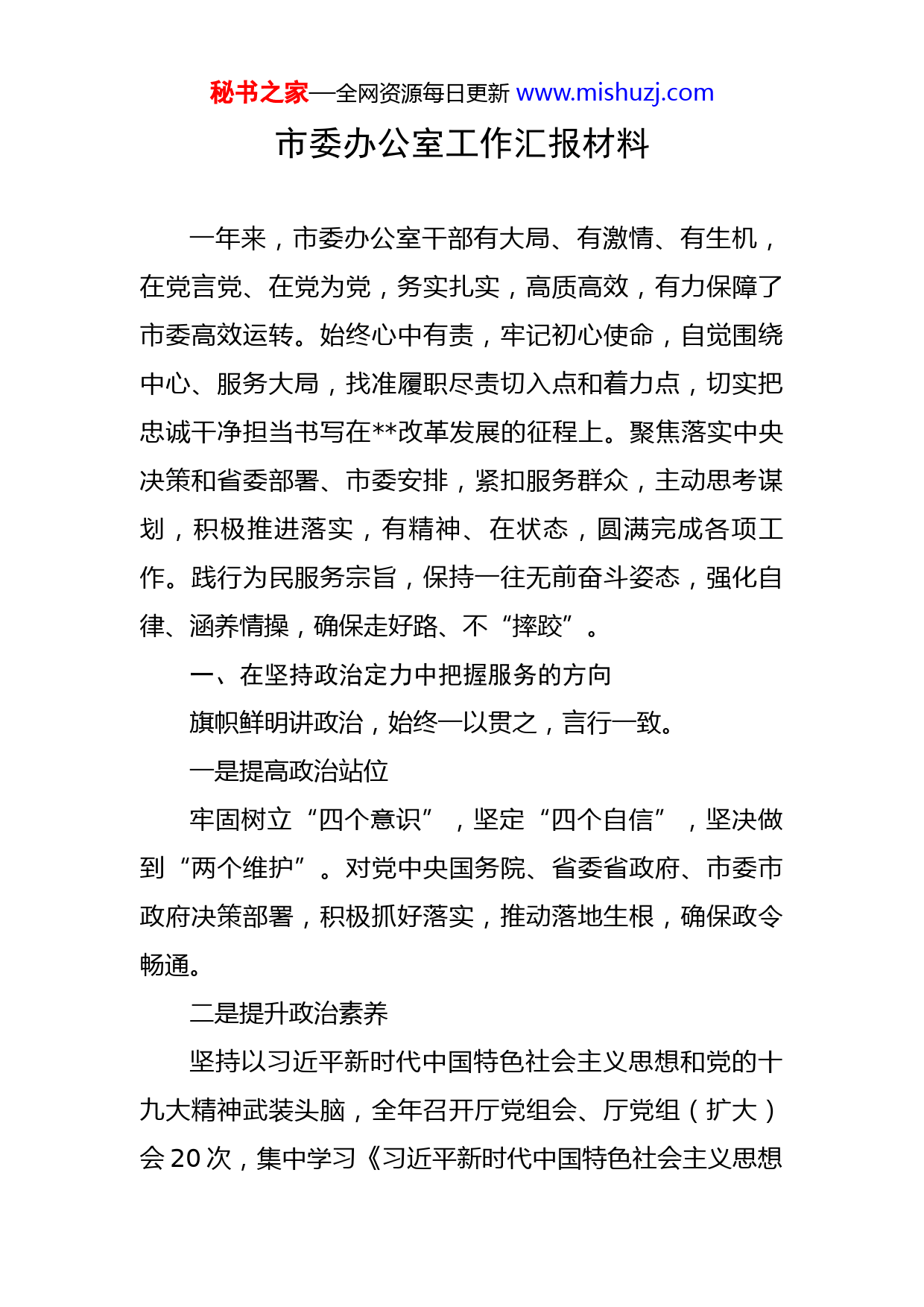 秘书之家—全网资源每日更新www.mishuzj.com市委办公室工作汇报材料一年来,市委办公室干部有大局、有激情、有生机,在党言党、在党为党,务实扎实,高质高效,有力保障了市委高效运转。始终心中有责,牢记初心使命,自觉围绕中心、服务大局,找准履职尽责切入点和着力点,切实把忠诚干净担当书写在改革发展的征程上。聚焦落实中央决策和省委部署、市委安排,紧扣服务群众,主动思考谋划,积极推进落实,有精神、在状态,圆满完成各项工作。践行为民服务宗旨,保持一往无前奋斗姿态,强化自律、涵养情操,确保走好路、不“摔跤”。一、在坚持政治定力中把握服务的方向旗帜鲜明讲政治,始终一以贯之,言行一致。一是提高政治站位牢固树立“四个意识”,坚定“四个自信”,坚决做到“两个维护”。对党中央国务院、省委省政府、市委市政府决策部署,积极抓好落实,推动落地生根,确保政令畅通。二是提升政治素养坚持以习近平新时代中国特色社会主义思想和党的十九大精神武装头脑,全年召开厅党组会、厅党组(扩大)会20次,集中学习《习近平新时代中国特色社会主义思想秘书之家—全网资源每日更新www.mishuzj.com三十讲》、习近平总书记系列重要讲话精神和对xx工作的系列重要指示精神。邀请4位专家教授为全办干部职工宣讲习近平新时代中国特色社会主义思想和党的十九大精神,并组织专题学习讨论。组织开展“不忘初心铸忠诚·牢记使命当先锋”党员集中轮训。三是加强政治建设以政治建设为统领,担当全面从严治党主体责任。制定实施办公厅党建工作要点及责任清单、任务清单。深入推进机关党支部“五化”建设,调整优化设置11个党支部。严格落实“三会一课”、主题党日、组织生活会、民主评议党员、谈心谈话等制度,定期进行督促检查。以支部为单位,组织学习研讨新修订《党章》、新修正《宪法》《中国共产党纪律处分条例》《中国共产党支部工作条例(试行)》等。四是坚守政治纪律严格落实党内报告工作制度,重大工作向省政府办公厅和市委市政府请示报告,重要会议文件精神及时传达学习贯彻,外出考察学习按时请销假。及时向省政府办公厅、市委市政府报告年度工作情况。二、在坚持担当干事中把握服务的质量实干善为讲担当,始终雷厉风行,助推发展。一是调研参谋注重务实秘书之家—全网资源每日更新www.mishuzj.com扎实开展“抓重点、补短板、强弱项”大调研活动。协调服务市政府领导深入区县(市)、园区调研,多次赴北京、上海、深圳、广市、东莞、珠海、杭市、昆山等地考察项目、招商引资,听取和研究88个市直单位、垂直管理单位工作。围绕“一圈两场三道”建设、房地产市场调控、产业项目建设、智慧城市建设、企业上市挂牌、现代农业发展、教育待遇保障等方面进行了重点研究,形成一批有份量的调研成果。二是工作协调注重效率积极争取省政府办公厅重视支持,对省政府办公厅交办的工作全力落实。及时根据省政府和市委的安排调整市政府的会议活动。协调服务市政府常务会议、市长办公会研究部署或现场调度打好打赢“三大攻坚战”和“反炒房”保卫战、中央、省级环保督察反馈问题整改和中央生态环保督察“回头看”交办信访件办理、x一体化发展、“五个100”项目建设、22条产业链建设、“放管服”改革等工作。纵深推进联系点x县x镇x村精准扶贫,协调铺排11个项目建设。三是办文办会注重精简对市政府全会、市政府常务会议、市长办公会等研究事项进行前置把关,注重会前协调,加强会中服务,突出会后跟办,会议的质量和效率进一步提升。加大整治“xx秘书之家—全网资源每日更新www.mishuzj.com会海”力度,制定实施进一步整治“xx会海”办会十条具体操作办法和办文十条具体操作办法,对发文审签程序进行修改完善,文件数量同比减少10.8%。四是信息服务注重优质全年国办、省办共采用信息124条,综合得分保持领先。编辑《政情参阅》36期。组织18场新闻发布会和21场在线访谈。围绕“一圈两场三道”建设和“最多跑一次”改革,协调组织8场市政府领导出席“市民问政直通车”和电视问政活动。《政府公报》及时在市政府门户网站发布。三、在坚持紧盯快办中把握服务的实效较真负责讲正义,始终一抓到底,跟紧问效。一是围绕中心,盯住大事对《政府工作报告》目标任务进行责任分解,持续跟进落实情况。定期对“三大攻坚战”、产业发展、项目建设、生态环保、民生实事、改革创新、城市管理、乡村振兴、社会治理等中心工作开展专项督查,提出切实可行的对策建议,推动决策部署落地落实。编发《督查通报》xx期。二是突出重点,办结要事对省委省政府主要领导、市委市政府主要领导批(指)示件强力督办、特事特办,定期进行“回头看”,秘书之家—全网资源每日更新www.mishuzj.com全年349件批示指示“落地有声”。定期对市政府常务会议议定的事项、市长办公会确定的问题、市长调研交办的重点事项和市领导批示的具体问题等跟踪问效,做到事事有回音,件件快落实。三是敢于碰硬,解决难事对中央环保督察“回头看”交办信访件牵头的事项,迅速进行调查核实,严格督办整改。注重“回头看”和再督查,协调督促解决了建设领域“治欠保支”、企业办社会职能分离移交等矛盾纠纷和问