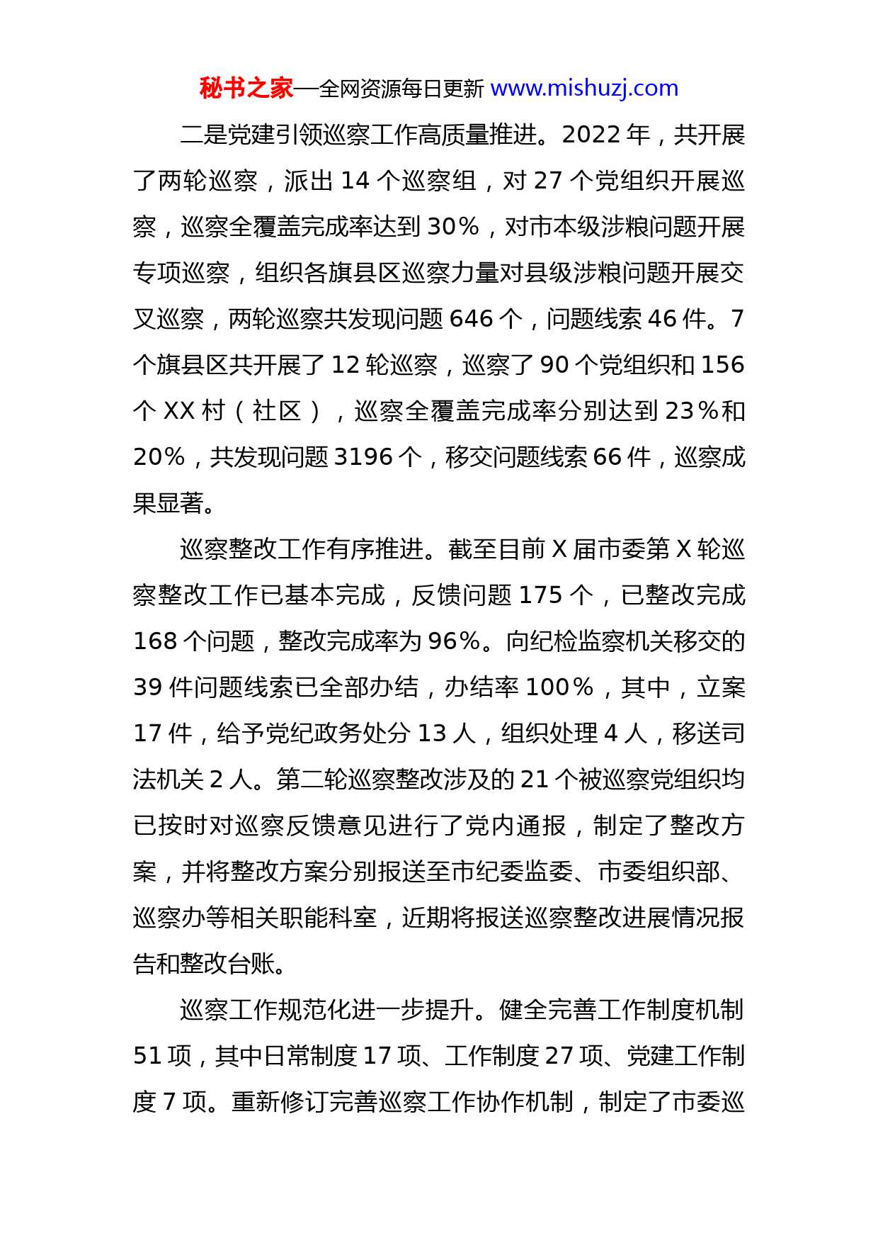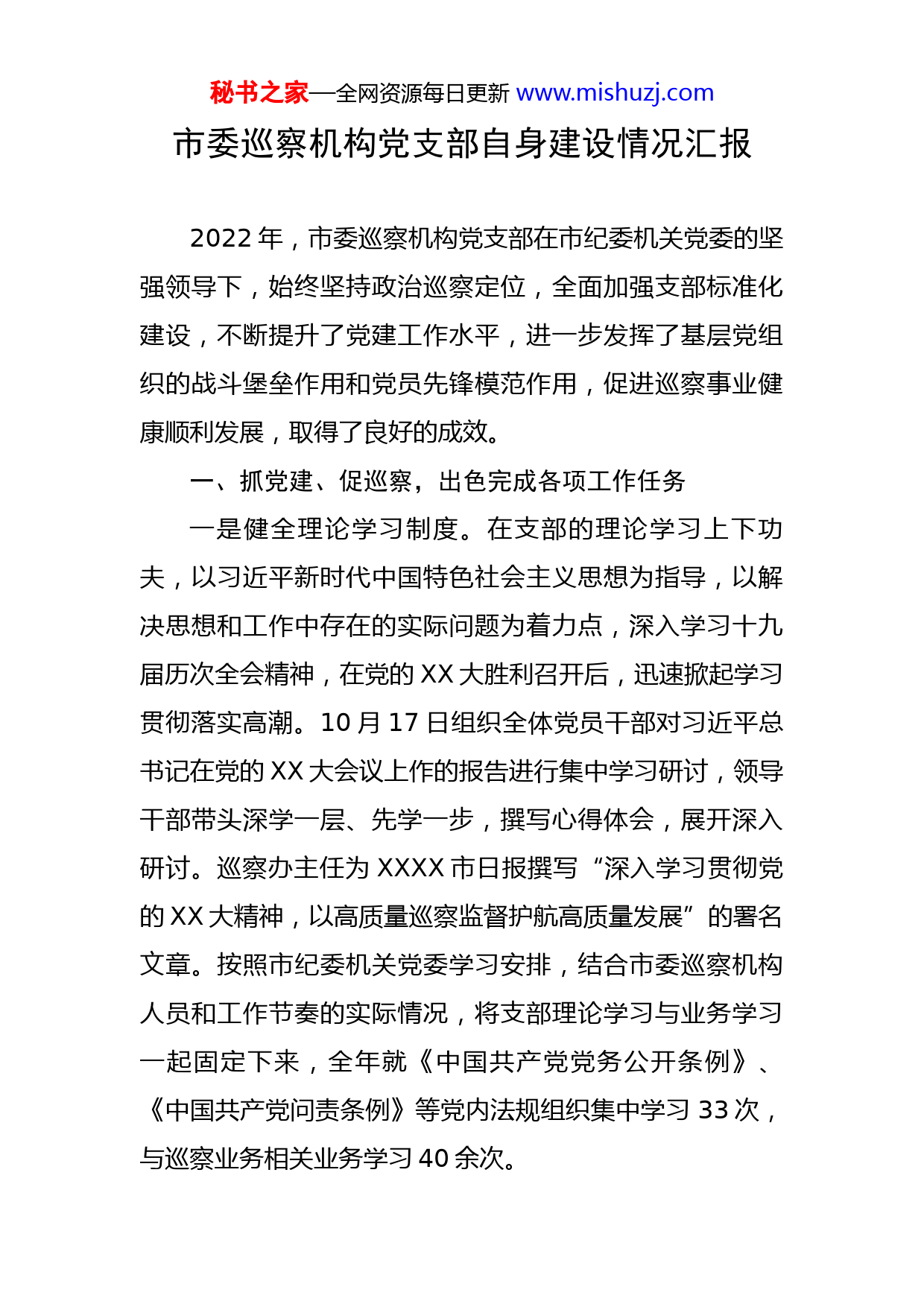 秘书之家—全网资源每日更新www.mishuzj.com市委巡察机构党支部自身建设情况汇报2022年,市委巡察机构党支部在市纪委机关党委的坚强领导下,始终坚持政治巡察定位,全面加强支部标准化建设,不断提升了党建工作水平,进一步发挥了基层党组织的战斗堡垒作用和党员先锋模范作用,促进巡察事业健康顺利发展,取得了良好的成效。一、抓党建、促巡察,出色完成各项工作任务一是健全理论学习制度。在支部的理论学习上下功夫,以习近平新时代中国特色社会主义思想为指导,以解决思想和工作中存在的实际问题为着力点,深入学习十九届历次全会精神,在党的XX大胜利召开后,迅速掀起学习贯彻落实高潮。10月17日组织全体党员干部对习近平总书记在党的XX大会议上作的报告进行集中学习研讨,领导干部带头深学一层、先学一步,撰写心得体会,展开深入研讨。巡察办主任为XXXX市日报撰写“深入学习贯彻党的XX大精神,以高质量巡察监督护航高质量发展”的署名文章。按照市纪委机关党委学习安排,结合市委巡察机构人员和工作节奏的实际情况,将支部理论学习与业务学习一起固定下来,全年就《中国共产党党务公开条例》、《中国共产党问责条例》等党内法规组织集中学习33次,与巡察业务相关业务学习40余次。秘书之家—全网资源每日更新www.mishuzj.com二是党建引领巡察工作高质量推进。2022年,共开展了两轮巡察,派出14个巡察组,对27个党组织开展巡察,巡察全覆盖完成率达到30%,对市本级涉粮问题开展专项巡察,组织各旗县区巡察力量对县级涉粮问题开展交叉巡察,两轮巡察共发现问题646个,问题线索46件。7个旗县区共开展了12轮巡察,巡察了90个党组织和156个XX村(社区),巡察全覆盖完成率分别达到23%和20%,共发现问题3196个,移交问题线索66件,巡察成果显著。巡察整改工作有序推进。截至目前X届市委第X轮巡察整改工作已基本完成,反馈问题175个,已整改完成168个问题,整改完成率为96%。向纪检监察机关移交的39件问题线索已全部办结,办结率100%,其中,立案17件,给予党纪政务处分13人,组织处理4人,移送司法机关2人。第二轮巡察整改涉及的21个被巡察党组织均已按时对巡察反馈意见进行了党内通报,制定了整改方案,并将整改方案分别报送至市纪委监委、市委组织部、巡察办等相关职能科室,近期将报送巡察整改进展情况报告和整改台账。巡察工作规范化进一步提升。健全完善工作制度机制51项,其中日常制度17项、工作制度27项、党建工作制度7项。重新修订完善巡察工作协作机制,制定了市委巡秘书之家—全网资源每日更新www.mishuzj.com察机构与市纪委监委、市委组织部、市委保密委员会办公室、市统计局、市财政局、市审计局等部门协作机制的意见。三是健全完善党建制度。重新修订完善了党支部各项规章制度,认真贯彻执行“三会一课”、民主评议党员、民主生活会、党费交纳等制度,有序推动党建各项工作的开展。四是健全规范支部对党员的日常教育管理。支部委员在工作中经常与党员同志交换思想,听取党员同志的意见,给党员同志压担子,在工作中调动党员同志的积极性,发挥共产党员的先锋模范作用,增强党员的先锋意识、责任意识。五是健全党务公开信息发布工作。按照市委党务公开办要求,我单位领导班子高度重视党务公开工作,指定专人负责党务公开信息发布工作;及时调整党务公开领导小组成员,建立了专人专报制度,严格审核把关,确保公开实效、质量,做到应公开尽公开。全年发布信息60余篇,圆满完成2022年目标任务。二、严格党内政治生活,党支部的凝聚力和战斗力进一步增强一是规范开展“三会一课”和组织生活会。坚持执行“三会一课”和认真落实《关于新形势下党内政治生活的秘书之家—全网资源每日更新www.mishuzj.com若干准则》精神,督促党员领导干部严格执行过“双重”组织生活会制度。2022年1月,按市委要求召开党史学习教育专题民主生活会,查摆梳理问题12条。3月召开了组织生活会暨民主评议党员大会,会前按照“四必谈”要求,将全体党员分成34个谈话“组合”,深刻从政治、思想、学习、工作、能力、纪律、作风等方面全面查找问题和不足,会上“咬耳扯袖、红脸出汗”,会后压实责任、真该实改,进一步提高了党内政治生活质量,营造风清气正的良好政治生态。2022年6月进行了支部书记以“集中治理全市党内政治生活庸俗化交易化问题”为题讲授专题党课,要求巡察干部旗帜鲜明讲政治,以实际行动忠诚拥护“两个确立”、忠实践行“两个维护”。二是“我为群众办实事”活动深入开展。自党史学习教育开展以来,市委巡察办以开展巡察工作为契机,落实好党史学习教育“我为群众办实事”实践活动的要求,立足职能职责,将学习党史同总结经验、观照现实、推动工作结合起来,梳理形成项目清单,面向社会公布并认真落实。做到了坚持将党史学习教育与巡察监督贯通融合,以解决群众烦心事、揪心事为着力点,围绕巡察发现问题,为民办事、化解难题,将“我为群众办实事”实践活动融入巡察日常、抓在经常,用巡察成效推动实践活动落地落实。持续关注对口联系的XX镇XX村在生产生活中存在的秘书之家—全网资源每日更新www.mishuzj.com困难,得知该村委会缺少办公设备时,当即将3台电脑送达村里,以解燃眉之急。组织党员干部深