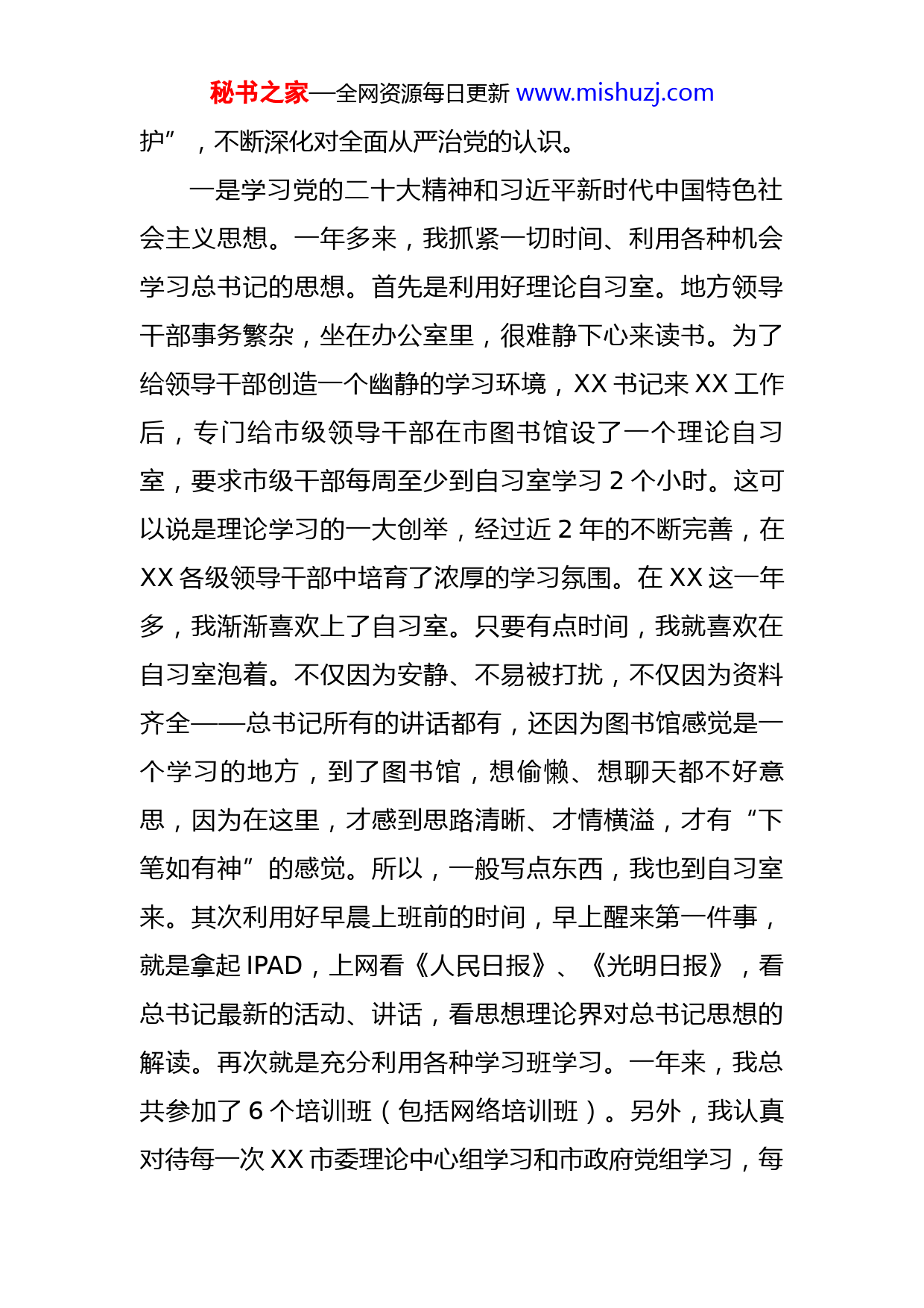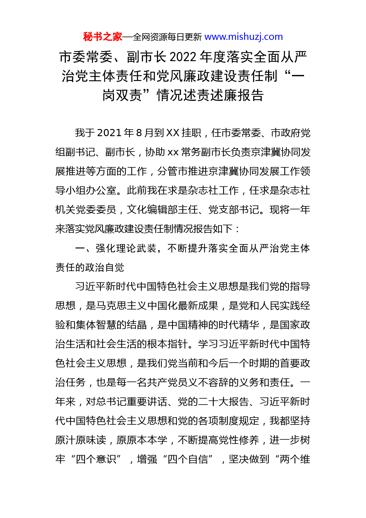 秘书之家—全网资源每日更新www.mishuzj.com市委常委、副市长2022年度落实全面从严治党主体责任和党风廉政建设责任制“一岗双责”情况述责述廉报告我于2021年8月到XX挂职,任市委常委、市政府党组副书记、副市长,协助xx常务副市长负责京津冀协同发展推进等方面的工作,分管市推进京津冀协同发展工作领导小组办公室。此前我在求是杂志社工作,任求是杂志社机关党委委员,文化编辑部主任、党支部书记。现将一年来落实党风廉政建设责任制情况报告如下:一、强化理论武装,不断提升落实全面从严治党主体责任的政治自觉习近平新时代中国特色社会主义思想是我们党的指导思想,是马克思主义中国化最新成果,是党和人民实践经验和集体智慧的结晶,是中国精神的时代精华,是国家政治生活和社会生活的根本指针。学习习近平新时代中国特色社会主义思想,是我们党当前和今后一个时期的首要政治任务,也是每一名共产党员义不容辞的义务和责任。一年来,对总书记重要讲话、党的二十大报告、习近平新时代中国特色社会主义思想和党的各项制度规定,我都坚持原汁原味读,原原本本学,不断提高党性修养,进一步树牢“四个意识”,增强“四个自信”,坚决做到“两个维秘书之家—全网资源每日更新www.mishuzj.com护”,不断深化对全面从严治党的认识。一是学习党的二十大精神和习近平新时代中国特色社会主义思想。一年多来,我抓紧一切时间、利用各种机会学习总书记的思想。首先是利用好理论自习室。地方领导干部事务繁杂,坐在办公室里,很难静下心来读书。为了给领导干部创造一个幽静的学习环境,XX书记来XX工作后,专门给市级领导干部在市图书馆设了一个理论自习室,要求市级干部每周至少到自习室学习2个小时。这可以说是理论学习的一大创举,经过近2年的不断完善,在XX各级领导干部中培育了浓厚的学习氛围。在XX这一年多,我渐渐喜欢上了自习室。只要有点时间,我就喜欢在自习室泡着。不仅因为安静、不易被打扰,不仅因为资料齐全——总书记所有的讲话都有,还因为图书馆感觉是一个学习的地方,到了图书馆,想偷懒、想聊天都不好意思,因为在这里,才感到思路清晰、才情横溢,才有“下笔如有神”的感觉。所以,一般写点东西,我也到自习室来。其次利用好早晨上班前的时间,早上醒来第一件事,就是拿起IPAD,上网看《人民日报》、《光明日报》,看总书记最新的活动、讲话,看思想理论界对总书记思想的解读。再次就是充分利用各种学习班学习。一年来,我总共参加了6个培训班(包括网络培训班)。另外,我认真对待每一次XX市委理论中心组学习和市政府党组学习,每秘书之家—全网资源每日更新www.mishuzj.com一次中心组学习都积极撰写学习体会,撰写了《活到老、学到老》、《改革开放与解放思想》等。二是学习党规党纪。认真学习了《中共中央政治局关于加强和维护党中央集中统一领导的若干规定》、《中共中央政治局贯彻落实中央八项规定的实施细则》和《中国共产党章程》、《关于新形势下党内政治生活的若干准则》和《中国共产党党内监督条例》,进一步强化了纪律意识和规矩意识,进一步提高了维护习近平总书记核心地位、维护党中央权威和集中统一领导、在思想上政治上行动上同以习近平同志为核心的党中央保持高度一致的自觉性。三是以学促知,学有所获。党的二十大召开后,我马上围绕二十大精神撰写了“全面准确理解二十大精神”、“深刻理解二十大精神的重大意义”、“习近平新时代中国特色社会主义思想的重大理论创新”等学习体会,共计20万余字;撰写了10余篇理论文章,分别在《人民日报》、《光明日报》、《学习时报》等报刊发表:《提升新时代文化自信,实现中华民族伟大复兴》(《哲学动态》);《改革开放历史进程中的马克思主义哲学》(《中国社会科学报》,《新华文摘》);《美好生活之维》(《光明日报》);《文化自信——反对历史虚无主义的有力武器》(党史网);《增强问题意识坚定文化自秘书之家—全网资源每日更新www.mishuzj.com信》(《人民日报》)、《改革开放与社会主义的命运》(《学习时报》,《红旗文摘》转载)等。这些文章分别被人民网、光明网、求是网、新华网、中国共产党新闻网、中国社会科学网、中国文明网、中国共产党新闻网宣讲家网、环球网等几十家网站转载。二、贯彻新发展理念,为推动XX高质量发展做贡献作为一名挂职干部,深知中组部把自己派到基层来任职,一方面是为了学习锻炼,了解基层实际情况,提升履职能力和水平,另一方面则是要充分发挥自身优势,为地方发展出谋划策,担当干事,服务地方经济社会发展。到XX工作一年多来,始终以时任中组部部长XX同志“要多学习思考、多做实事、多担当奉献、多扬长避短、多自省自律”的要求严格要求自己,摒弃临时观念和做客心理,坚持向基层同志学习、向工作实践学习,围绕XX绿色发展、高质量发展做了一些有益的工作,取得了一定成效。一是主动对接京津冀协同发展战略。深入推进京津冀协同发展战略既是党中央和省委赋予XX的重大政治任务,更是XX最大的发展机遇。一年来,联系熟悉的企业、学校和科研单位,与XX开展广泛合作,通过积极联系沟通,促成了首都师范大学与XX市政府的战略合作,首师大旅游文化研发基地在XX博物