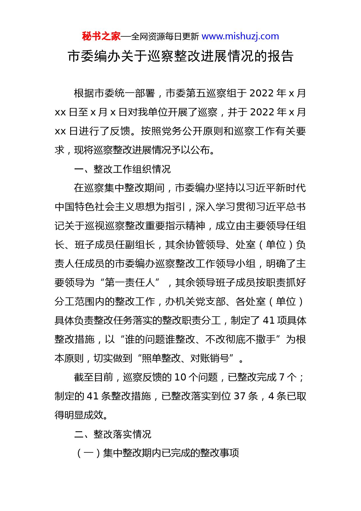 秘书之家—全网资源每日更新www.mishuzj.com市委编办关于巡察整改进展情况的报告根据市委统一部署,市委第五巡察组于2022年x月xx日至x月x日对我单位开展了巡察,并于2022年x月xx日进行了反馈。按照党务公开原则和巡察工作有关要求,现将巡察整改进展情况予以公布。一、整改工作组织情况在巡察集中整改期间,市委编办坚持以习近平新时代中国特色社会主义思想为指引,深入学习贯彻习近平总书记关于巡视巡察整改重要指示精神,成立由主要领导任组长、班子成员任副组长,其余协管领导、处室(单位)负责人任成员的市委编办巡察整改工作领导小组,明确了主要领导为“第一责任人”,其余领导班子成员按职责抓好分工范围内的整改工作,办机关党支部、各处室(单位)具体负责整改任务落实的整改职责分工,制定了41项具体整改措施,以“谁的问题谁整改、不改彻底不撒手”为根本原则,切实做到“照单整改、对账销号”。截至目前,巡察反馈的10个问题,已整改完成7个;制定的41条整改措施,已整改落实到位37条,4条已取得明显成效。二、整改落实情况(一)集中整改期内已完成的整改事项秘书之家—全网资源每日更新www.mishuzj.com1.关于“机构编制评估核查督查不全面”问题的整改。一是制定《xx市机构编制评估检查工作细则》,同时配套制定《机构编制评估民主测评表》《机构编制评估统计表》《机构编制执行情况和使用效益评分表》等适用评估指标,进一步增强了评估检查工作的可操作性。二是有效运用评估结果,建立评估结果与审批联动机制、评估问题清单机制、评估检查问效机制,加强对评估检查中发现的重难点问题和普遍性问题的研究分析,充分发挥机构编制评估检查的“正向激励、反向约束”作用。三是制定《xx市机构编制联动监督工作办法》,建立与纪检监察、巡察机构和组织人事、财政等部门的联动协调机制。2.关于“落实意识形态工作责任制有待加强”问题的整改。一是7月1日召开理论学习中心组集中学习(扩大)会议,学习习近平总书记关于意识形态工作的重要论述精神;同日,召开市委编办领导班子意识形态工作专题会议,研判全办意识形态领域情况、部署下阶段意识形态工作任务。二是制定《市委编办全面落实意识形态工作责任制度》,将意识形态工作责任制落实情况纳入领导班子及成员述责述廉述职述法报告、市委编办工作要点以及内部绩秘书之家—全网资源每日更新www.mishuzj.com效考核重点内容。三是对网络媒体阵地的信息发布、内容管理等进行规范,网络信息发布实行专人具体负责,业务处室(单位)、综合处室、分管领导“三重”签名审核、信息稿件归档留存的工作机制,确保网络意识形态领域安全,丰富宣传手段。五是邀请网络安防公司专家对全办党员干部开展网络安全工作专题培训,开展机构编制实名制管理系统网络安全三级等级保护测评工作,提升业务系统的安全防护能力。3.关于“主体责任落实有偏差”问题的整改。一是将从严治党工作相关要求列入市委编办《2022年工作要点》以及内部绩效考核重要内容;于8月3日召开理论学习中心组集中学习(扩大)会议,领导班子成员在会上就“抓好党建是最大政绩”交流学习体会、进行表态发言。二是于5月30日组织开展党风廉政主题教育活动,组织全办党员干部集中观看党风廉政警示教育视频;在干部选拔任用、内部绩效考核等制度文件中明确党风廉政建设“一票否决制”。三是制定《市委编办谈心谈话工作制度》,做到工作变动必谈、受到批评必谈、情绪反常必谈、不安心工作必秘书之家—全网资源每日更新www.mishuzj.com谈、发现问题必谈、群众有反映必谈,层层压紧压实管党治党主体责任。4.关于“监督责任履行不够到位”问题的整改。一是拓宽日常监督范围。坚持调研先行,详细了解驻在部门处室主要职责、工作流程、当前重点工作及队伍建设等情况,分析研判潜在的廉政风险点,找准监督的切入口和着力点,织密监督网。7月以来,对五家被监督单位所有处室调研全覆盖,主动约谈85人,提醒重要权力节点防控,抓早抓小、防微杜渐。二是把关会议决策事项执行关键环节。在年度工作要点、月度工作计划、科级以上干部信息以及干部调整提拔等信息备案的基础上,坚持关口前移,细化会议报备内容与程序,要求驻在部门在党委会等重要会议召开前将会议方案与上会材料提前报备,针对驻在部门可能存在的不够规范事项会上及时提出监督建议。截至目前派驻纪检监察组组长在参加市委编办室务会上提出意见建议4条,涉及编制使用、制度制定。三是提升发现问题能力。明确学习主题,每周召开组例会,加强业务学习。派员参与机关纪监工委案件审理工作、中央纪委国家监委“做好做实政治监督专题培训班(第1期)”。全员参与市纪委监委组织的各类培训。注重问题线索的关联性,善于从执纪审查中发现问题。截至秘书之家—全网资源每日更新www.mishuzj.com目前,已在2个问题线索初核中发现其它存在问题3个,拟运用第一种形态处理2人。5.关于“财政纪律执行不严”问题的整改。一是按照《关于明确市级行政事业单位工会经费管理使用有关政策的通知》(x〔2021〕x号)文件精神,设立工会经费账户,并由市财务核算中心代为管理。二是将《工会法》《中华全国总工会办公厅关于印发《